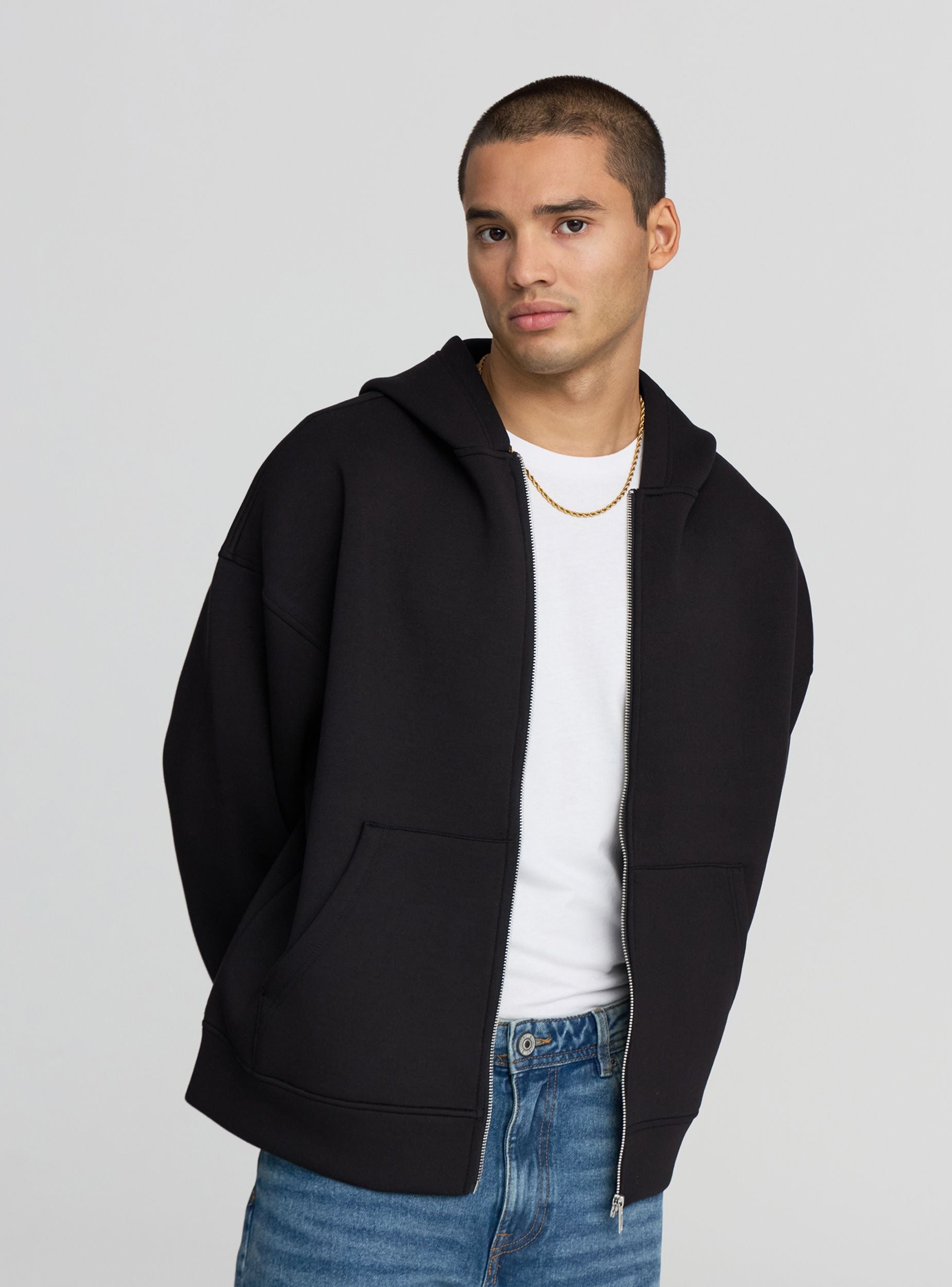 Pánska mikina z neoprénu v jednofarebnom prevedení, s kapucňou a zipsom, ideálna pre ležérny a pohodlný vzhľad. Vybavená prednými vreckami pre praktickosť a manžetami pre optimálne priliehanie. Perfektná na kombinovanie s džínsami alebo športovými nohavicami, táto mikina je vhodná na voľný čas alebo vonkajšie aktivity. Jednoduchý a univerzálny dizajn ju robí nevyhnutným kúskom v šatníku.