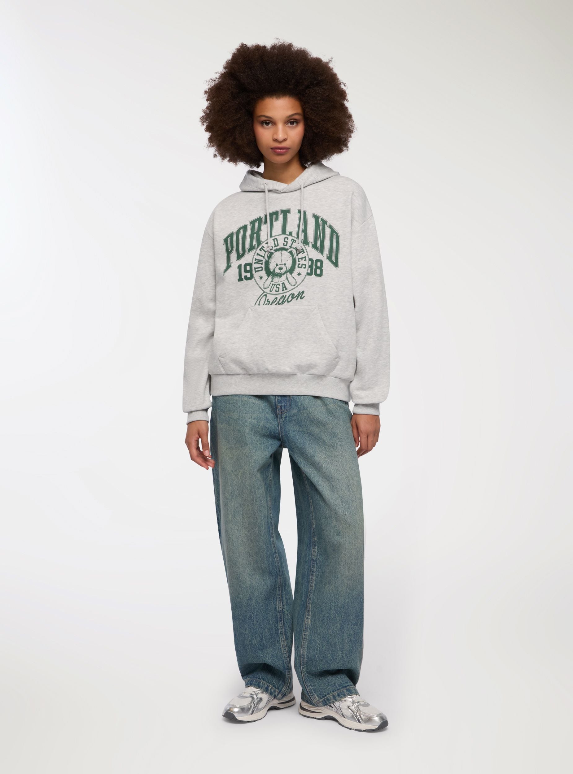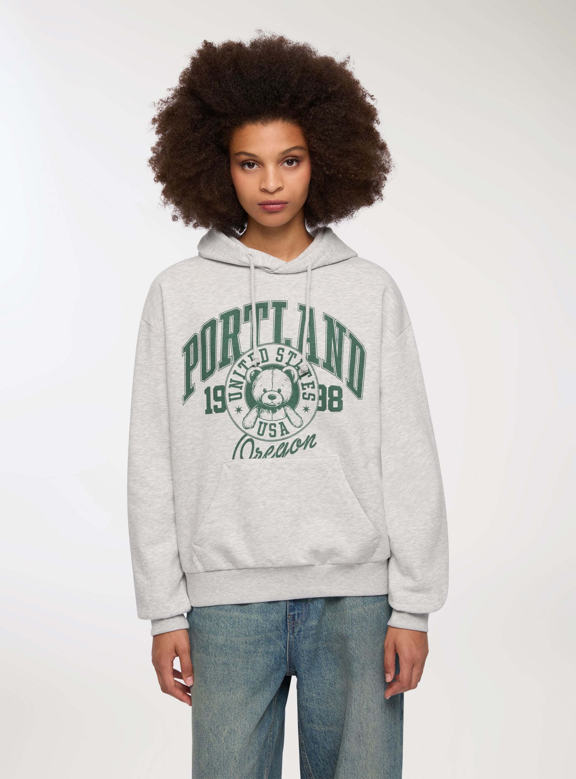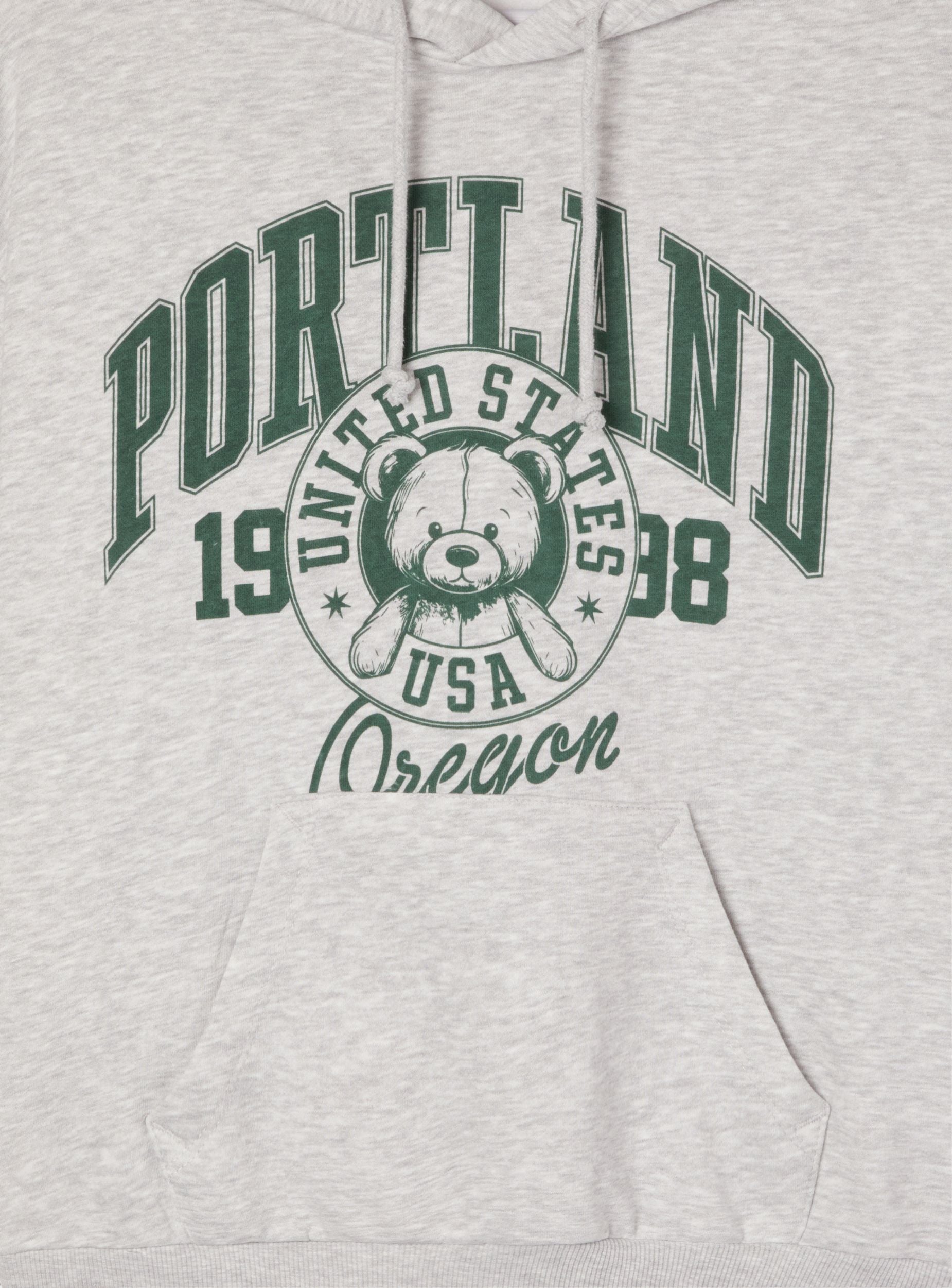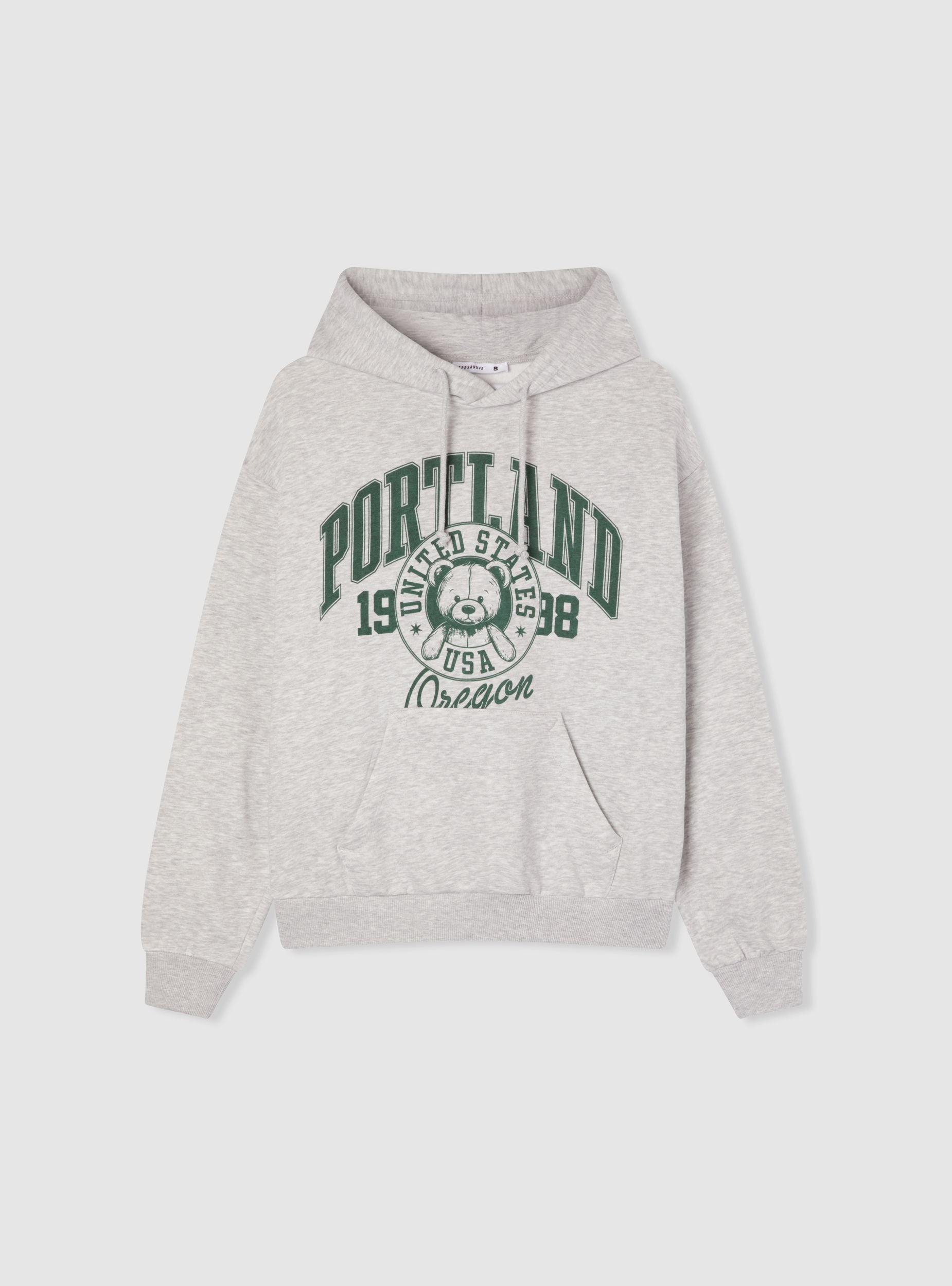 Dámska ťažká mikina ideálna na zimu, s kapucňou a nastaviteľnou šnúrkou pre prispôsobené pohodlie. Model bez zipsu je obohatený o prednú klokanie kapsu, ideálnu na zahriatie rúk. Maxi potlač "Portland Oregon" so študentským písmom a roztomilým medvedíkom v strede dodáva originálny a atraktívny nádych. Ideálna na každodenné nosenie v ležérnom, mestskom alebo športovom štýle.