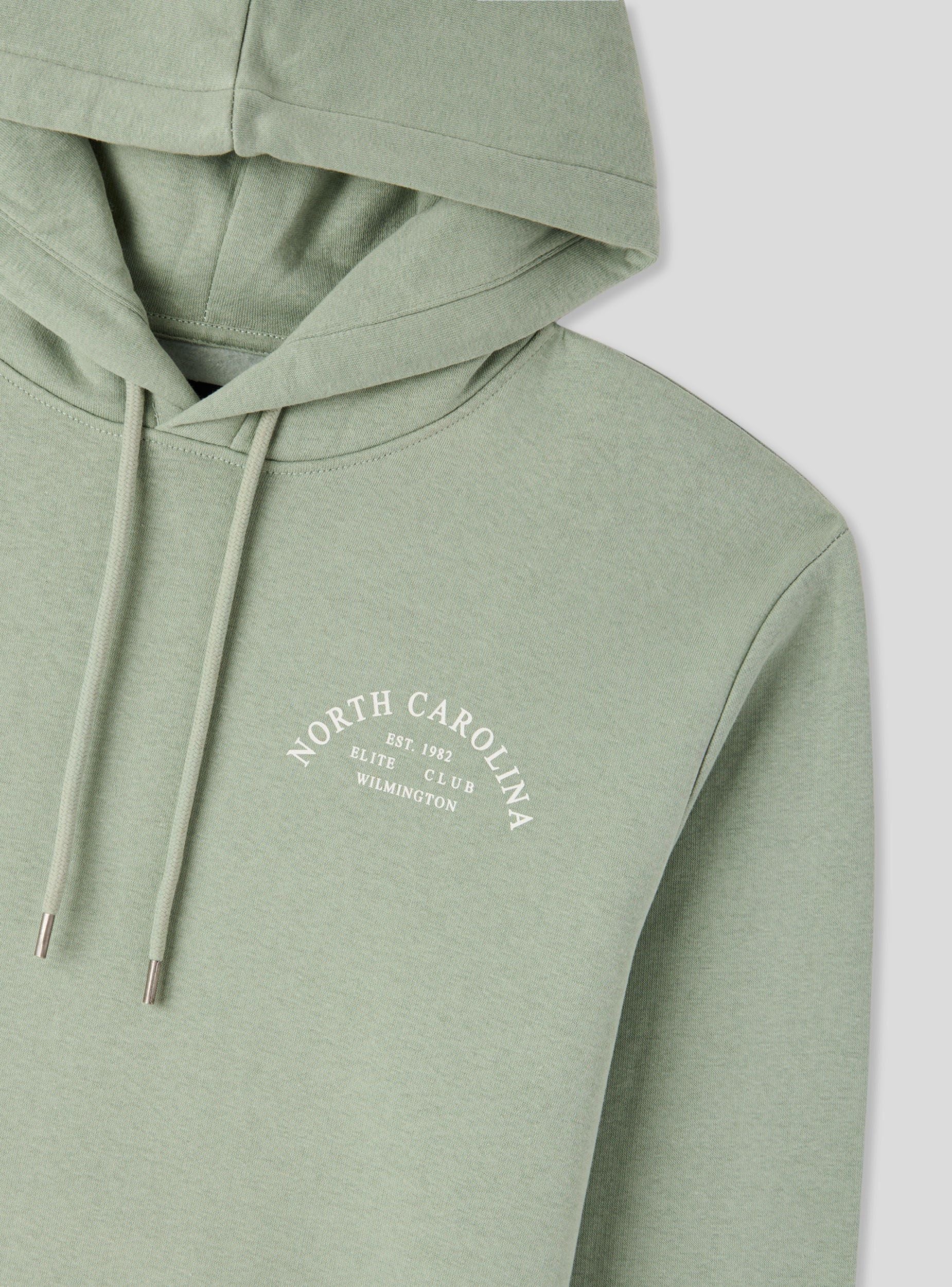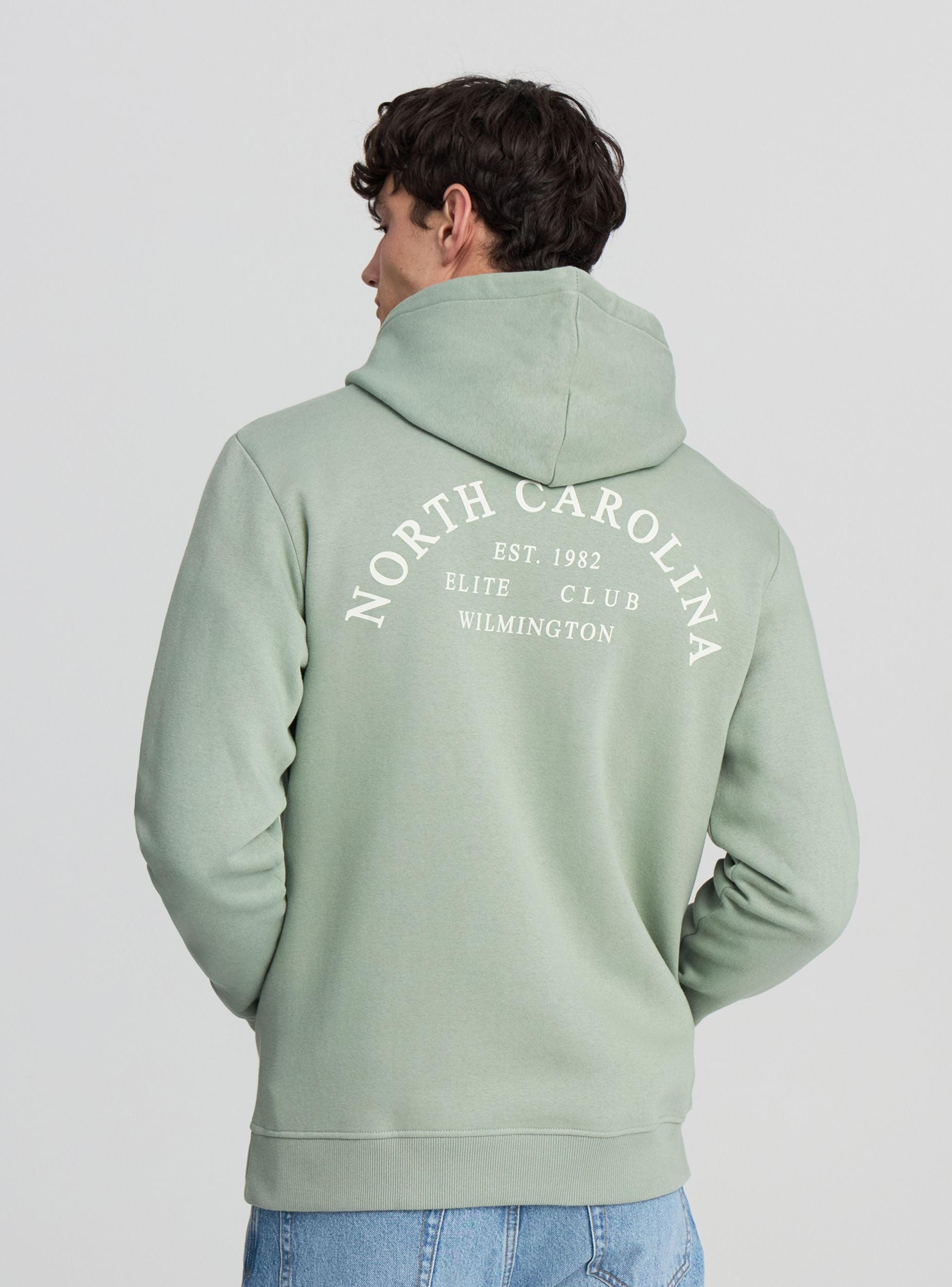 Pánska ťažká mikina, ideálna na chladné obdobie, s kapucňou a nastaviteľnou šnúrkou pre väčšiu ochranu. Dizajn obsahuje dlhé rukávy, pohodlnú klokankovú kapsu a predný a zadný potlač s nápismi v štýle vysokej školy, ktoré evokujú americký športový svet. Vyrobená z mäkkej tkaniny, spája pohodlie a ležérny štýl, aby ťa sprevádzala v tvojich každodenných outfitov.Detaily