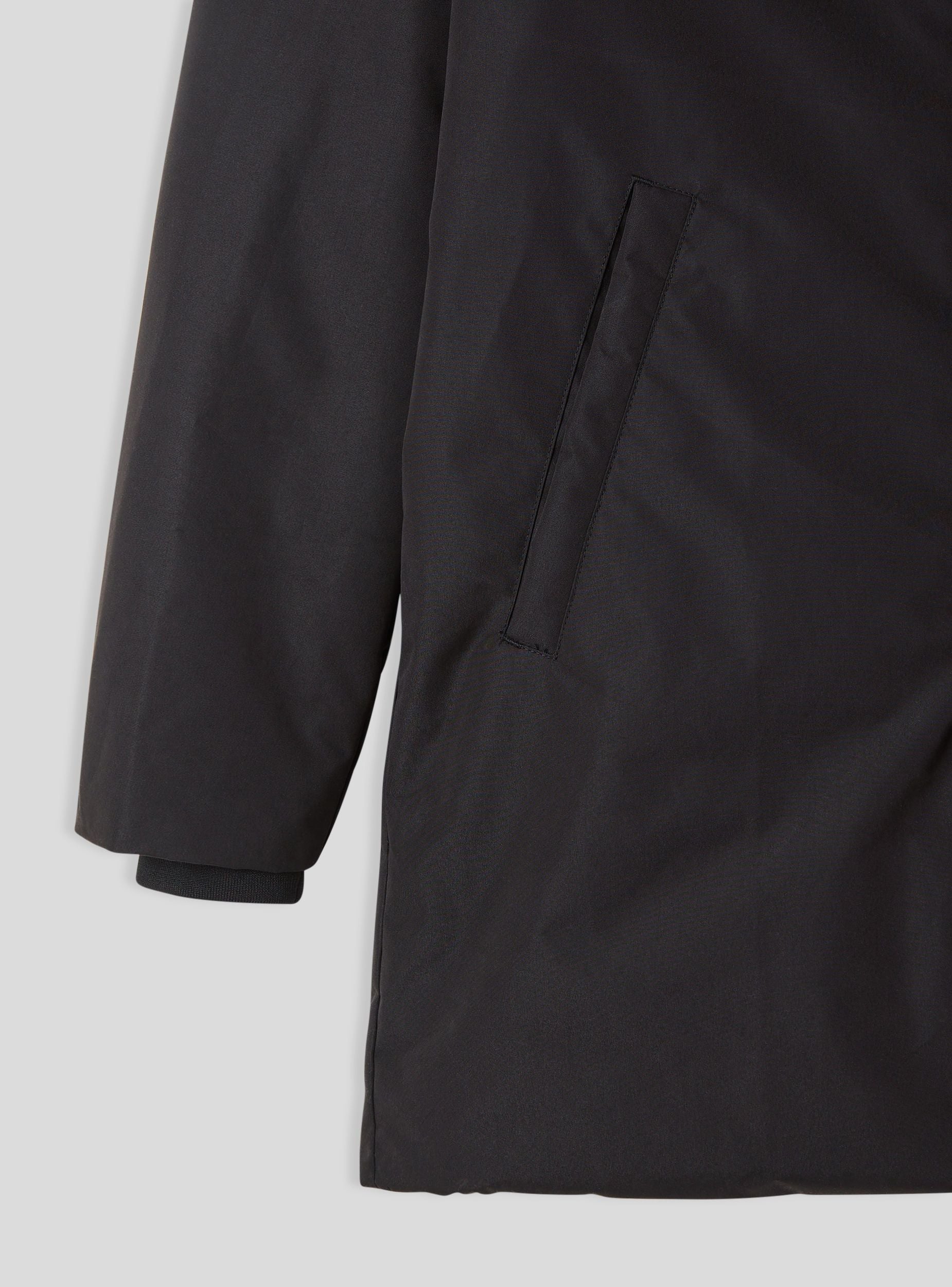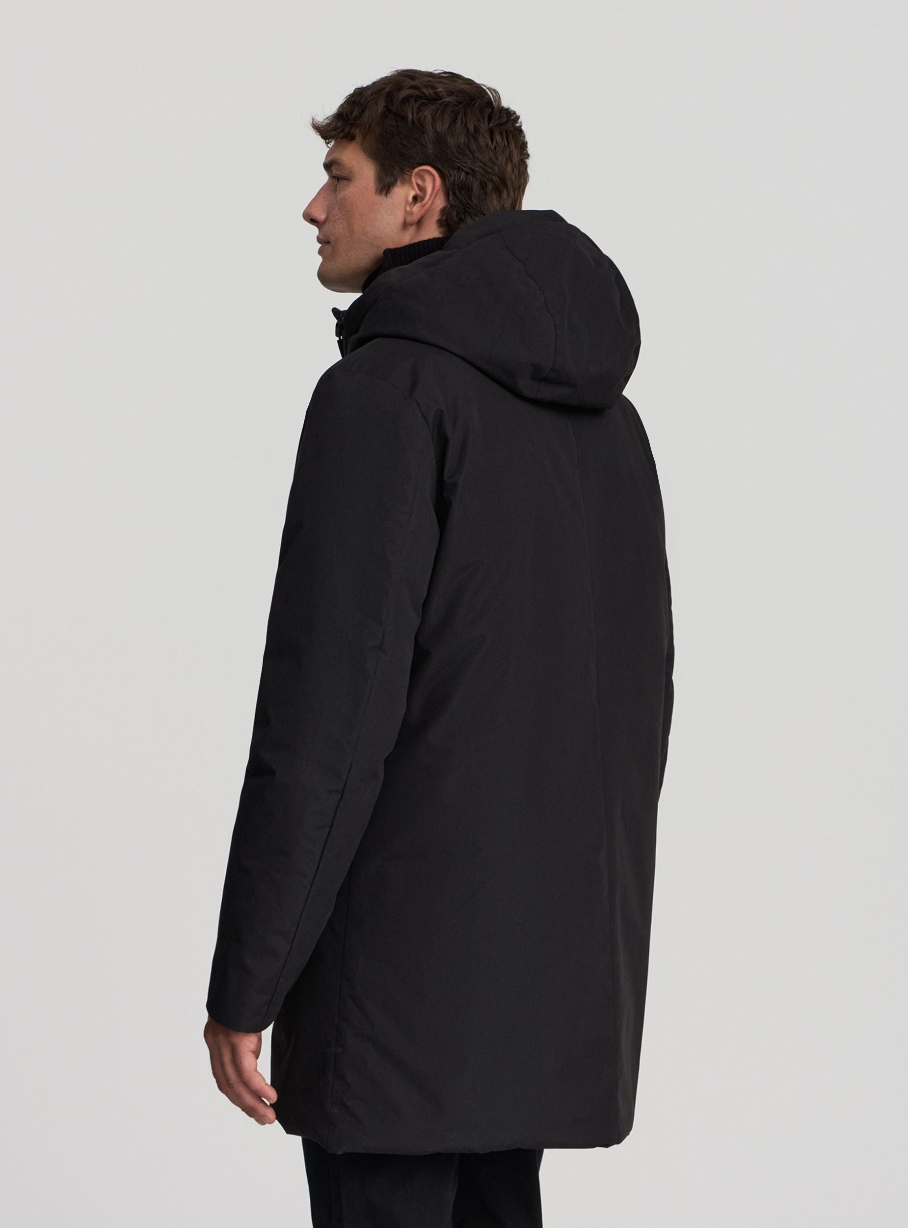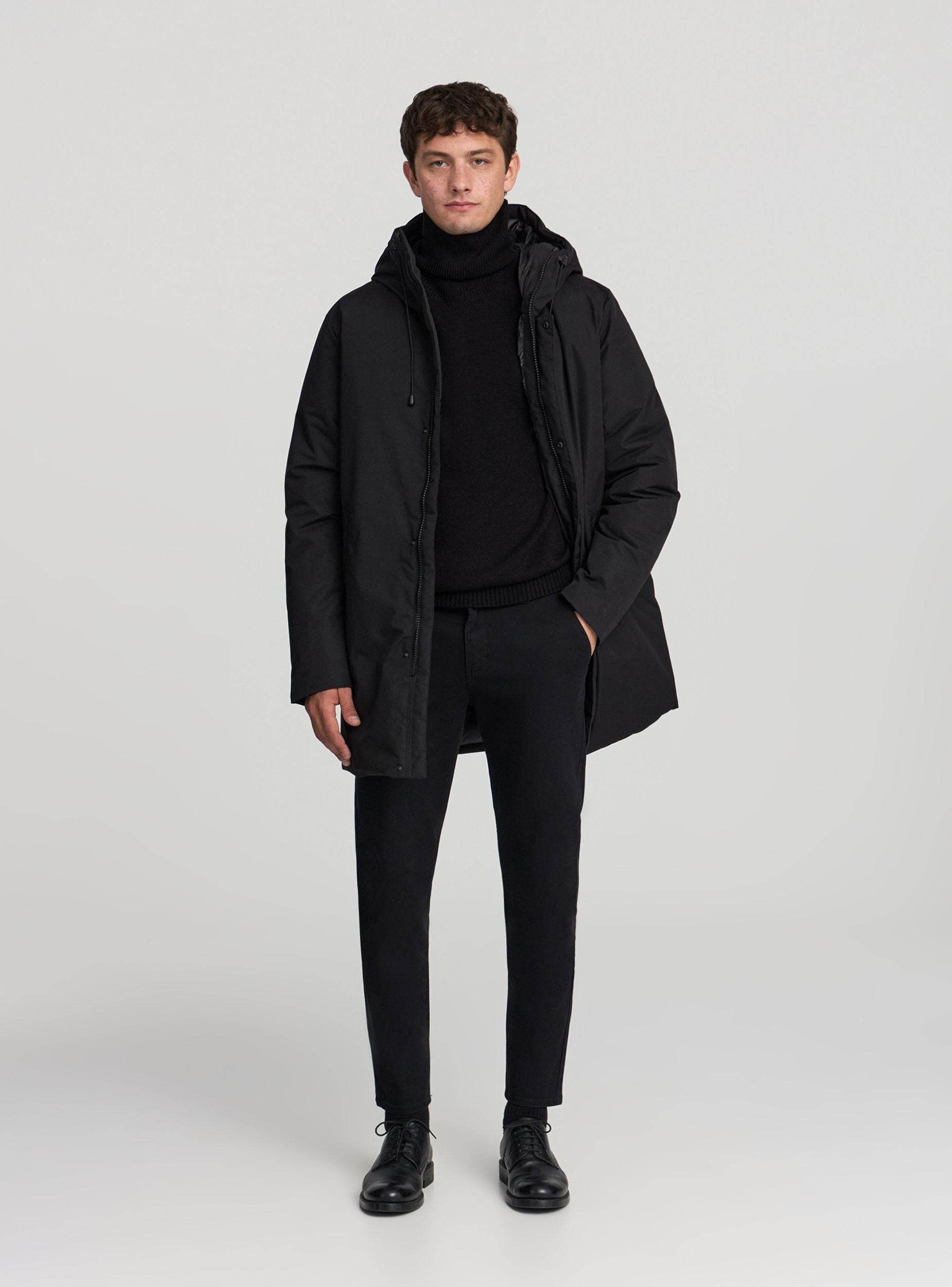 Pánsky zateplený parka, ideálny na zvládanie zimy s komfortom a štýlom. Vyrobený z odolnej vodeodolnej tkaniny, v jednofarebnom prevedení, je vybavený pevným nastaviteľným kapucňou s šnúrkou, zipsovým zapínaním a klopou so zapínaním na patentky. Má bočné vrecká s klopou, vnútorné manžety z rebrového úpletu a praktické vnútorné vrecko so suchým zipsom. Ideálny na ochranu pred dažďom a vetrom počas chladných dní, bez toho, aby ste sa museli vzdať mestského a funkčného vzhľadu.