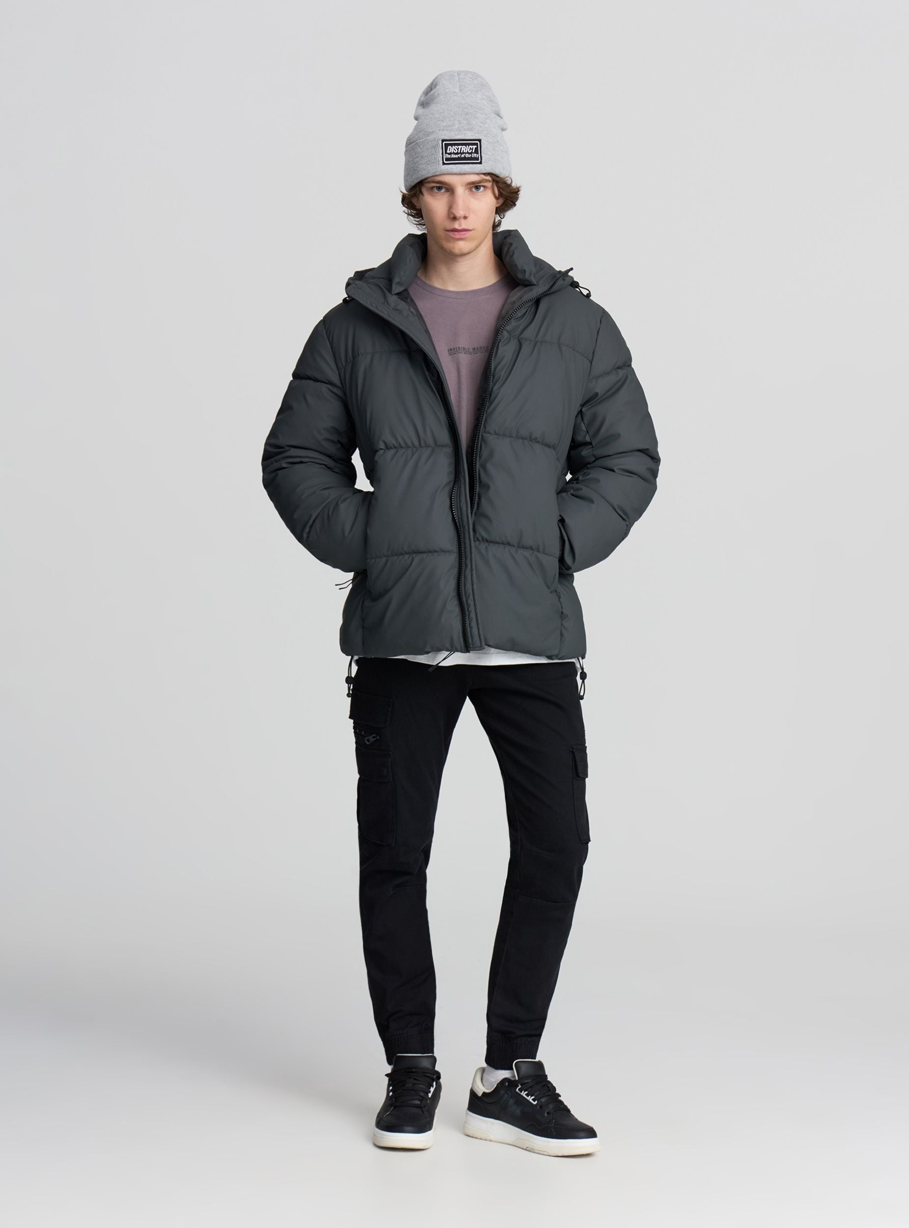 Pánsky prešívaný kabát ideálny na prekonanie najchladnejších dní v meste. Disponuje pevným kapucňou, predným zipsom a bočnými vreckami so zipsom, ponúka regulárny strih a optimálne pohodlie. Nastaviteľné manžety na suchý zips a spodný okraj so šnúrkou zabezpečujú extra ochranu pred vetrom. Perfektný na kombinovanie s ležérnymi alebo športovými outfitmi pre praktický a všestranný štýl. Jednofarebný dizajn.Detaily