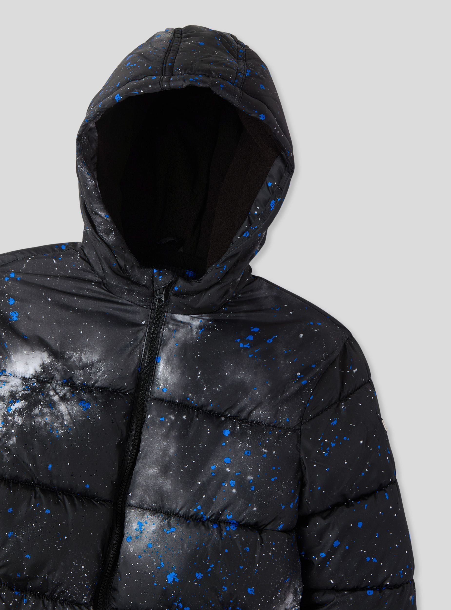 Prešívaná bunda s kapucňou a zipsom s potlačou