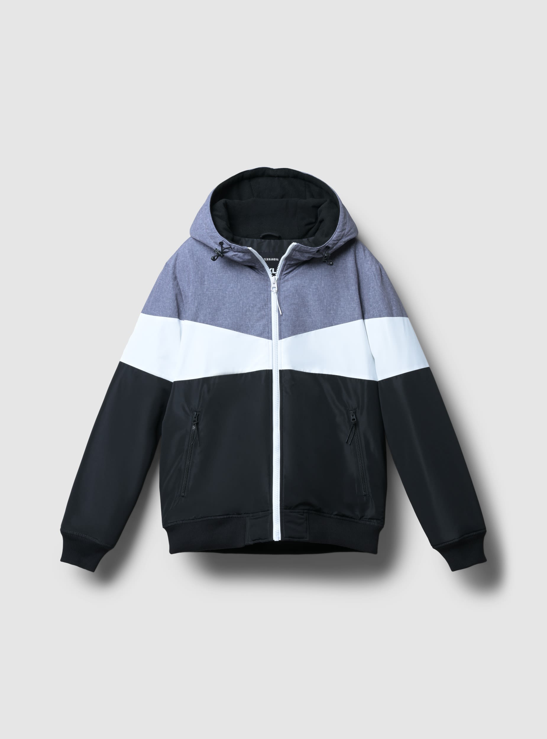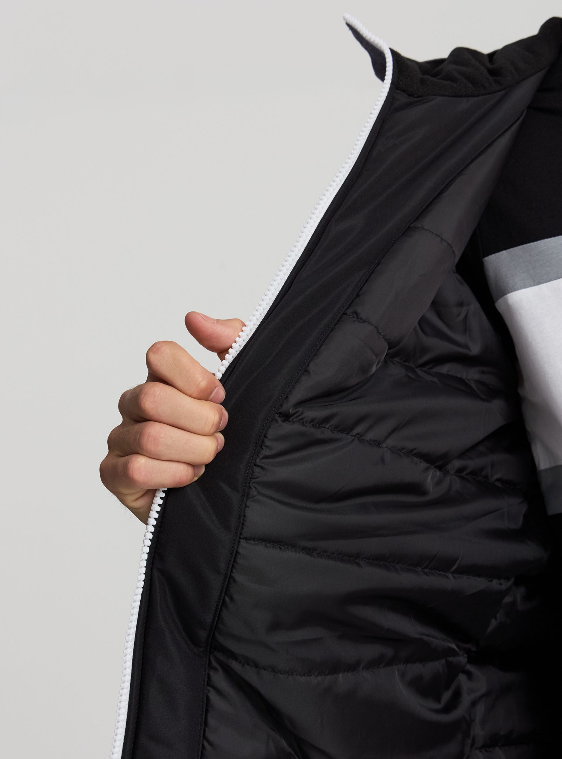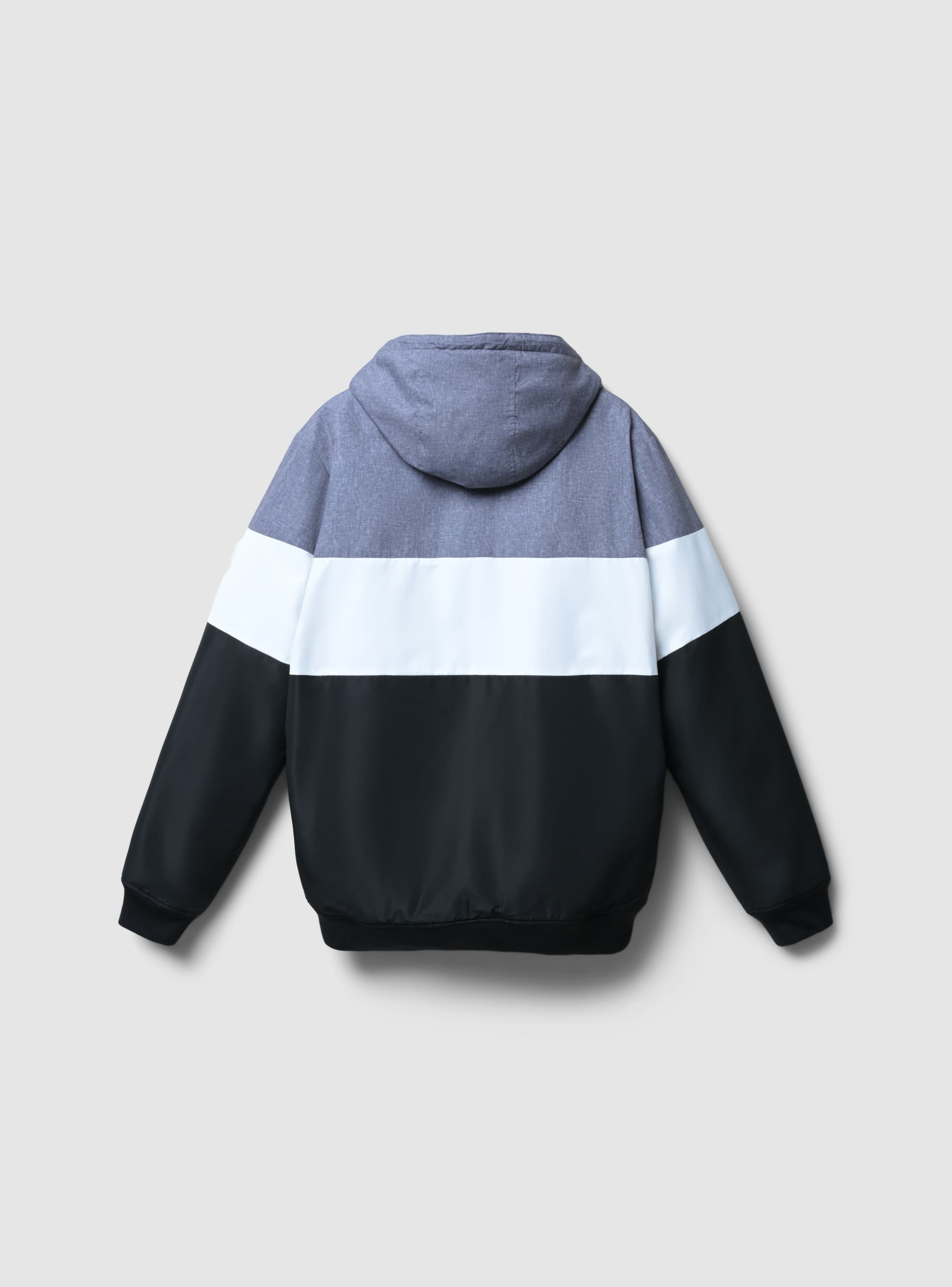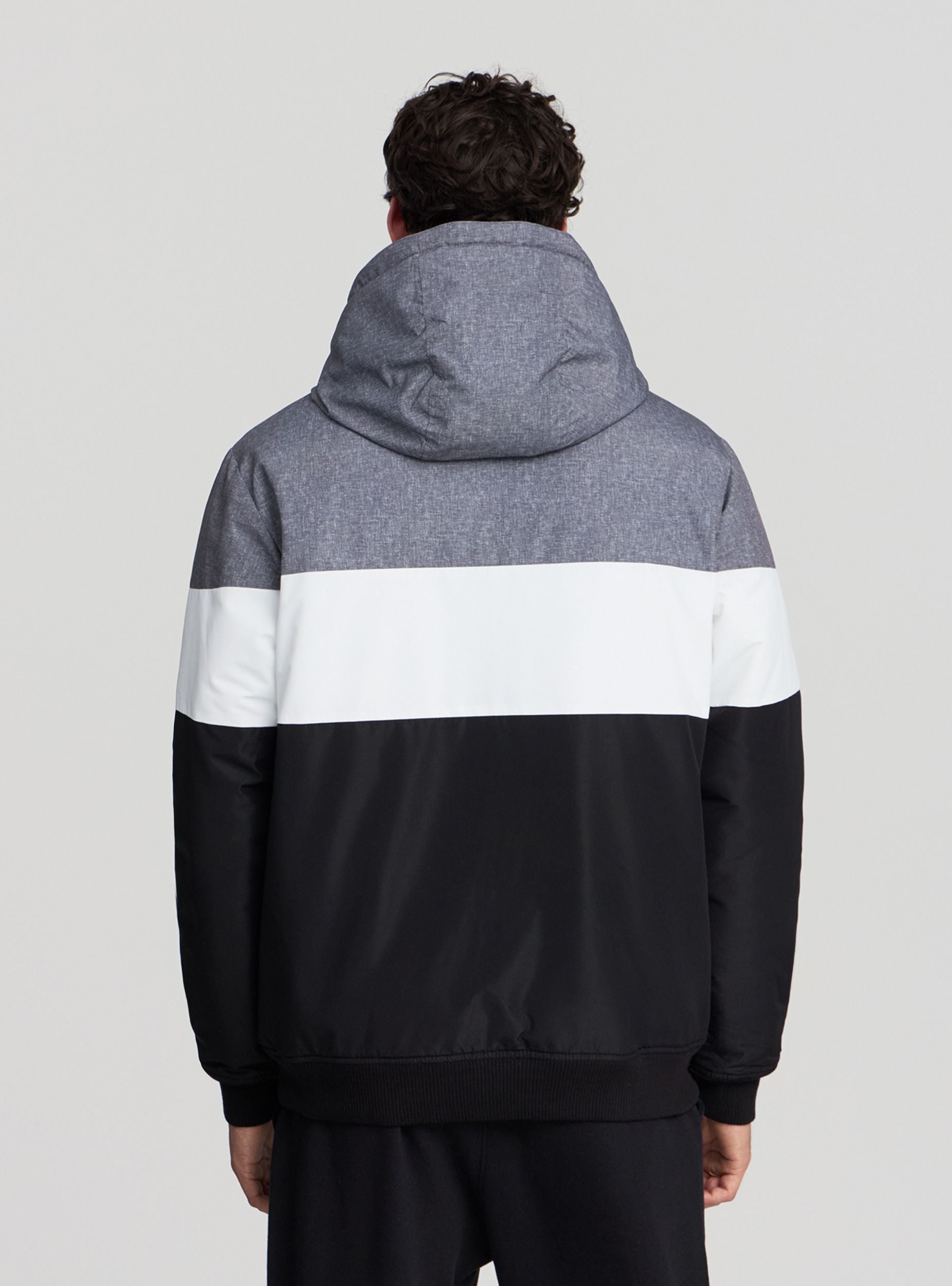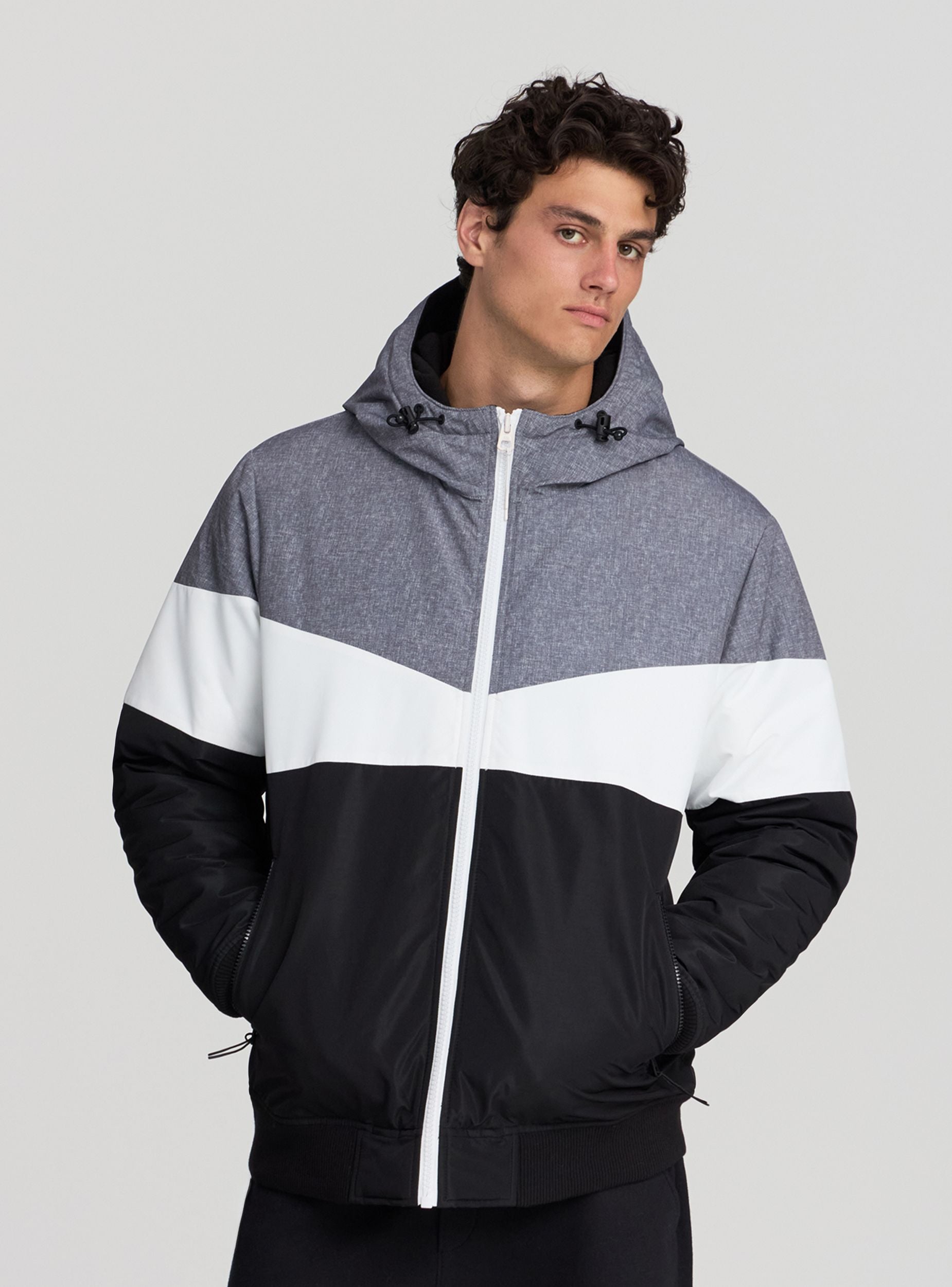 Pánska prešívaná bunda, ideálna pre ležérny a moderný vzhľad. Disponuje nastaviteľnou kapucňou a zapínaním na zips, čo poskytuje pohodlné a praktické nosenie. Má farebné bloky, ktoré pridávajú jedinečný štýlový prvok. Bočné vrecká na zips zaručujú funkčnosť a bezpečnosť pre osobné veci. Perfektná na chladnejšie dni, ľahko sa kombinuje s džínsami a teniskami pre univerzálny a módny outfit.Detaily
