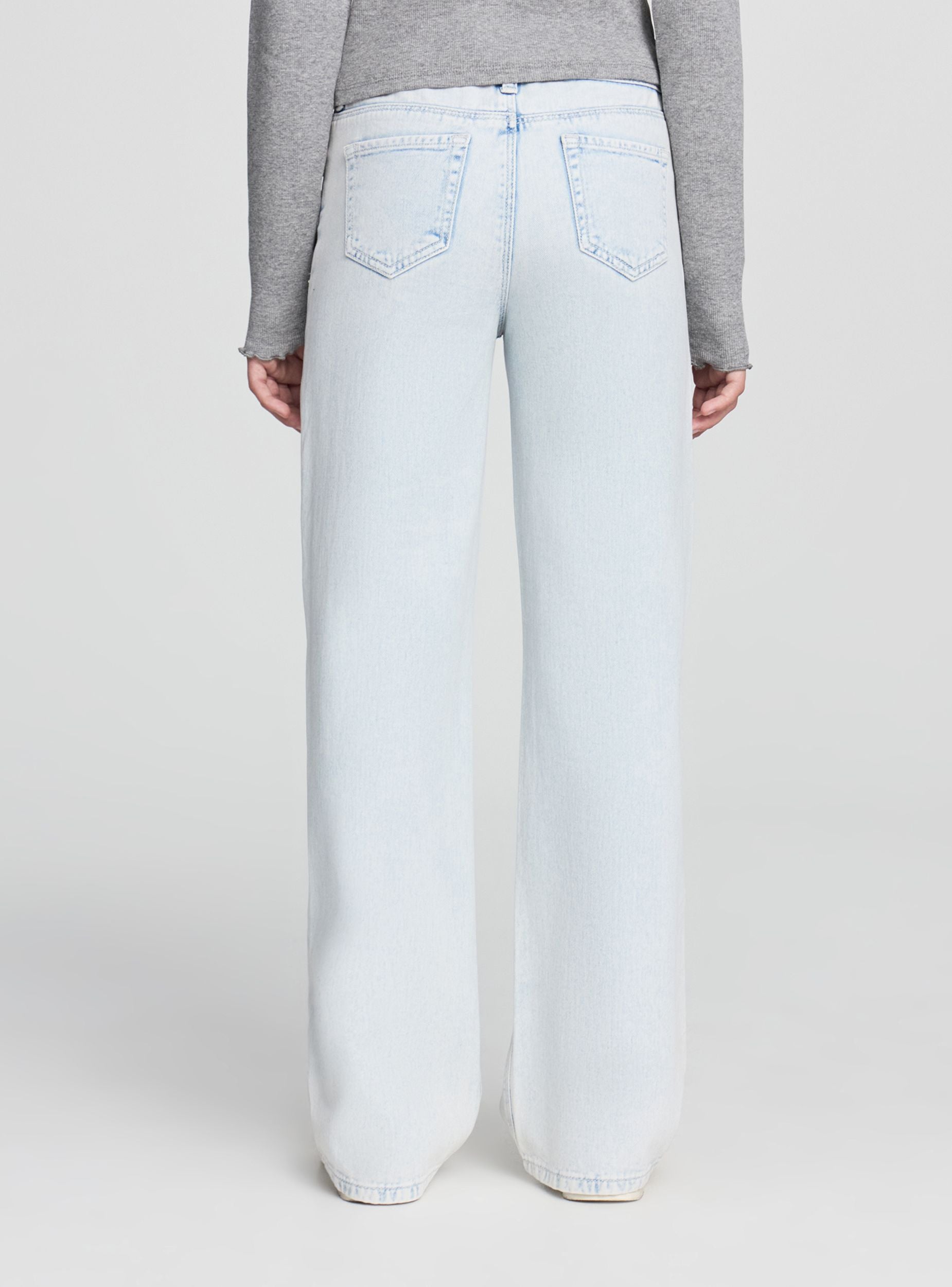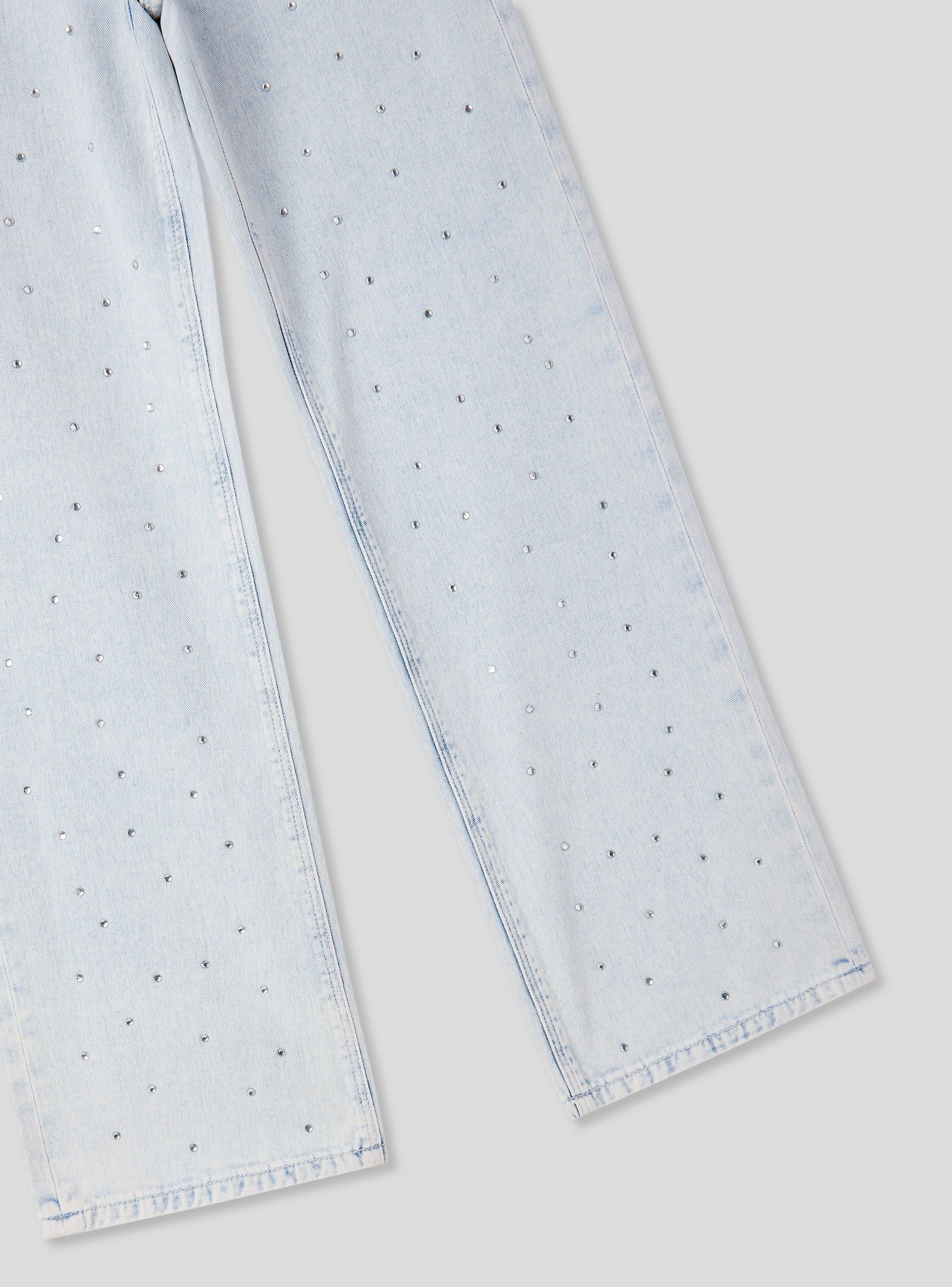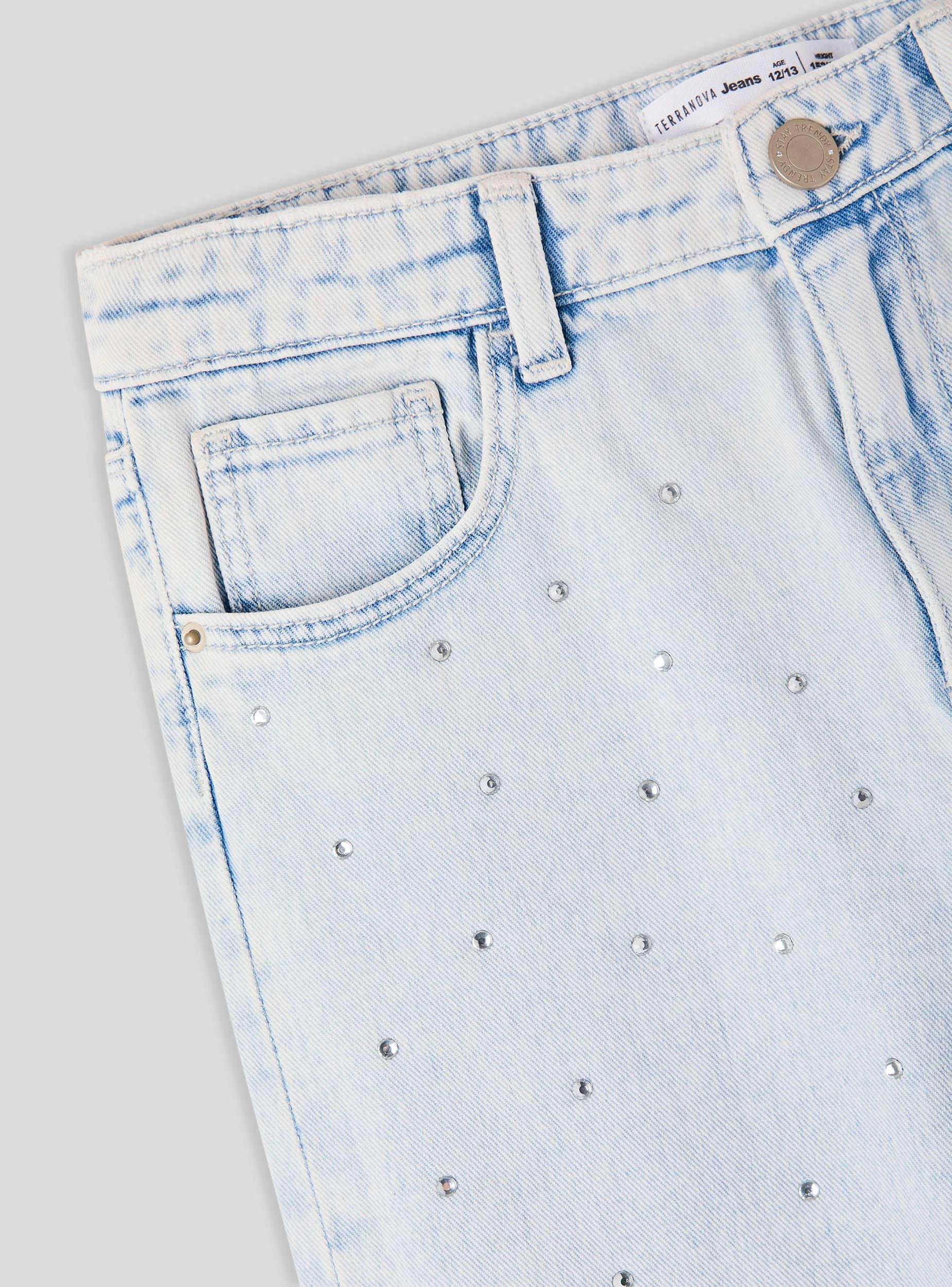 Detské džínsy s voľnými nohavicami, ideálne na ležérne a všestranné looky. Model má pohodlný strih a detaily s aplikovanými kamienkami, ktoré dodávajú žiarivý a originálny nádych. Sú vybavené zapínaním na gombík a zips a piatimi praktickými vreckami. Perfektné na kombinovanie s tričkami alebo mikinami pre každodenný outfit s charakterom.Detaily