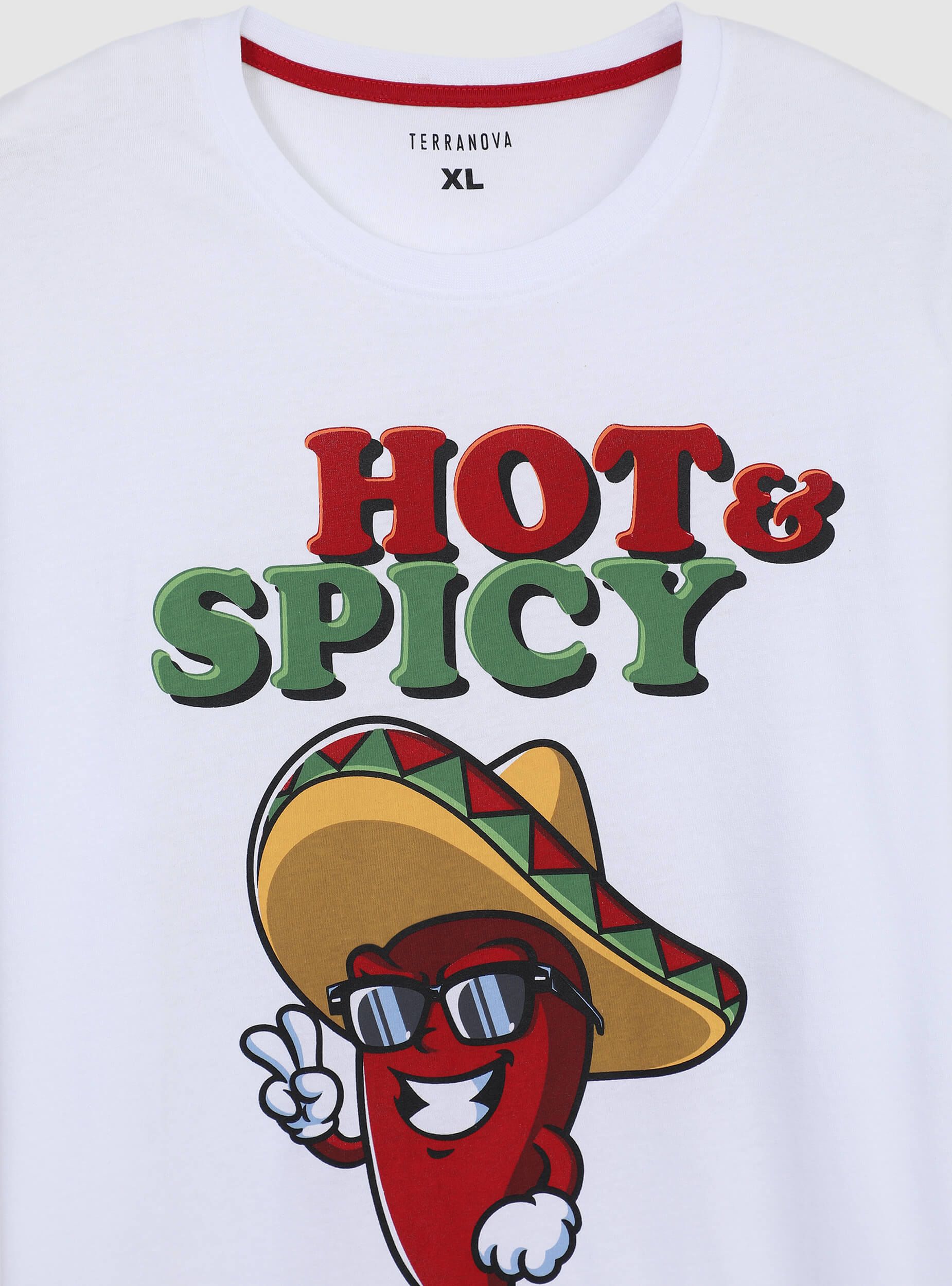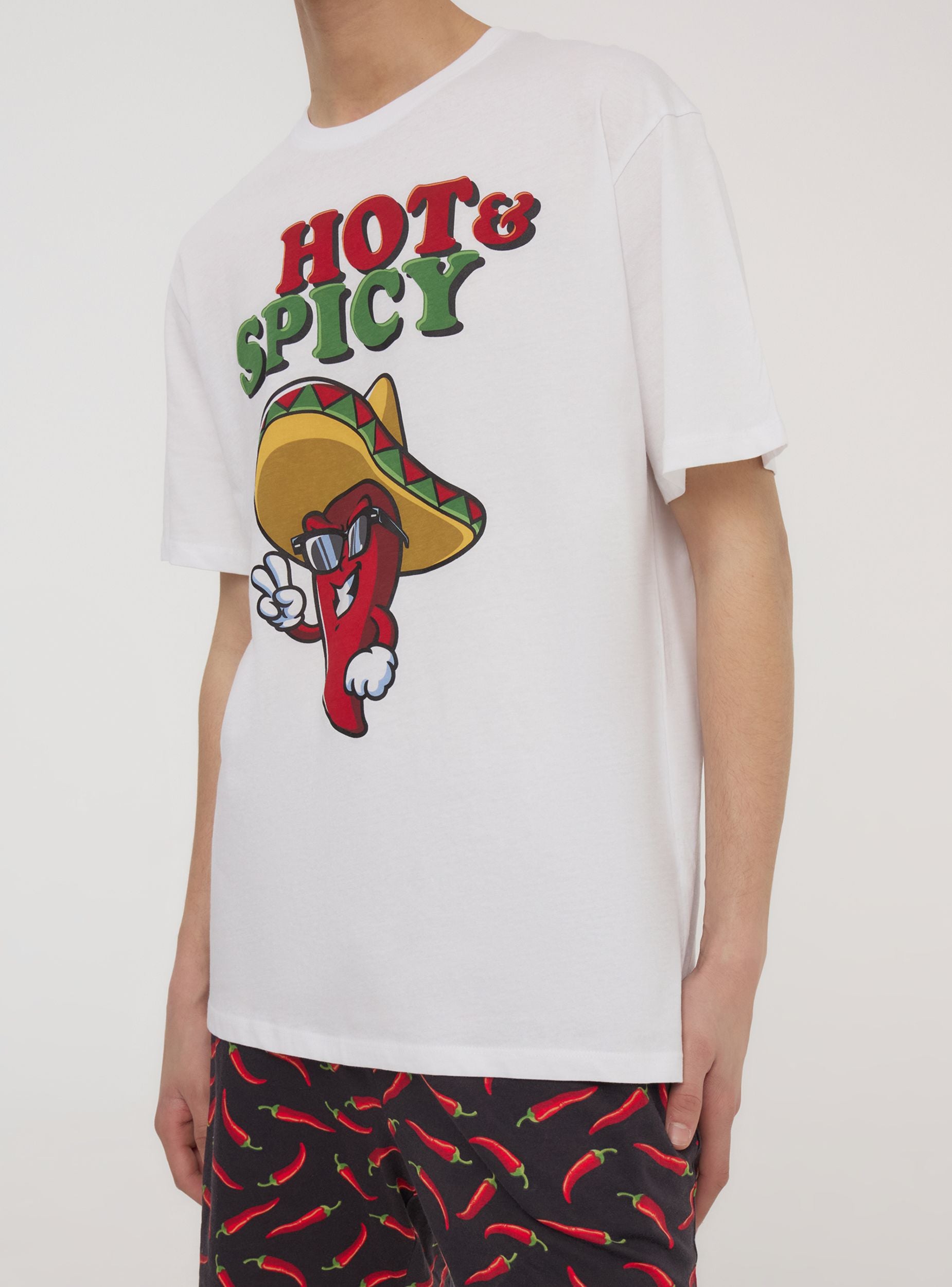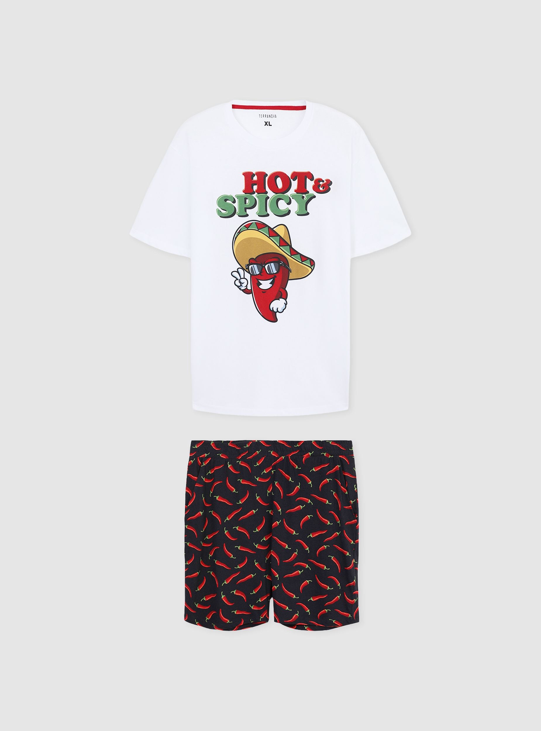 Pánsky pyžamo pozostávajúce z trička s krátkymi rukávmi a zladených krátkych nohavíc. Tričko sa vyznačuje roztomilou potlačou s papričkami a zábavnými detailmi, ktoré dodávajú nočnému vzhľadu nádych živosti. Krátke nohavice, pohodlné a praktické, majú celoplošný vzor s papričkami, ktorý vyjadruje energický a originálny štýl. Perfektné na relaxáciu s pohodlím a štipkou charakteru.
