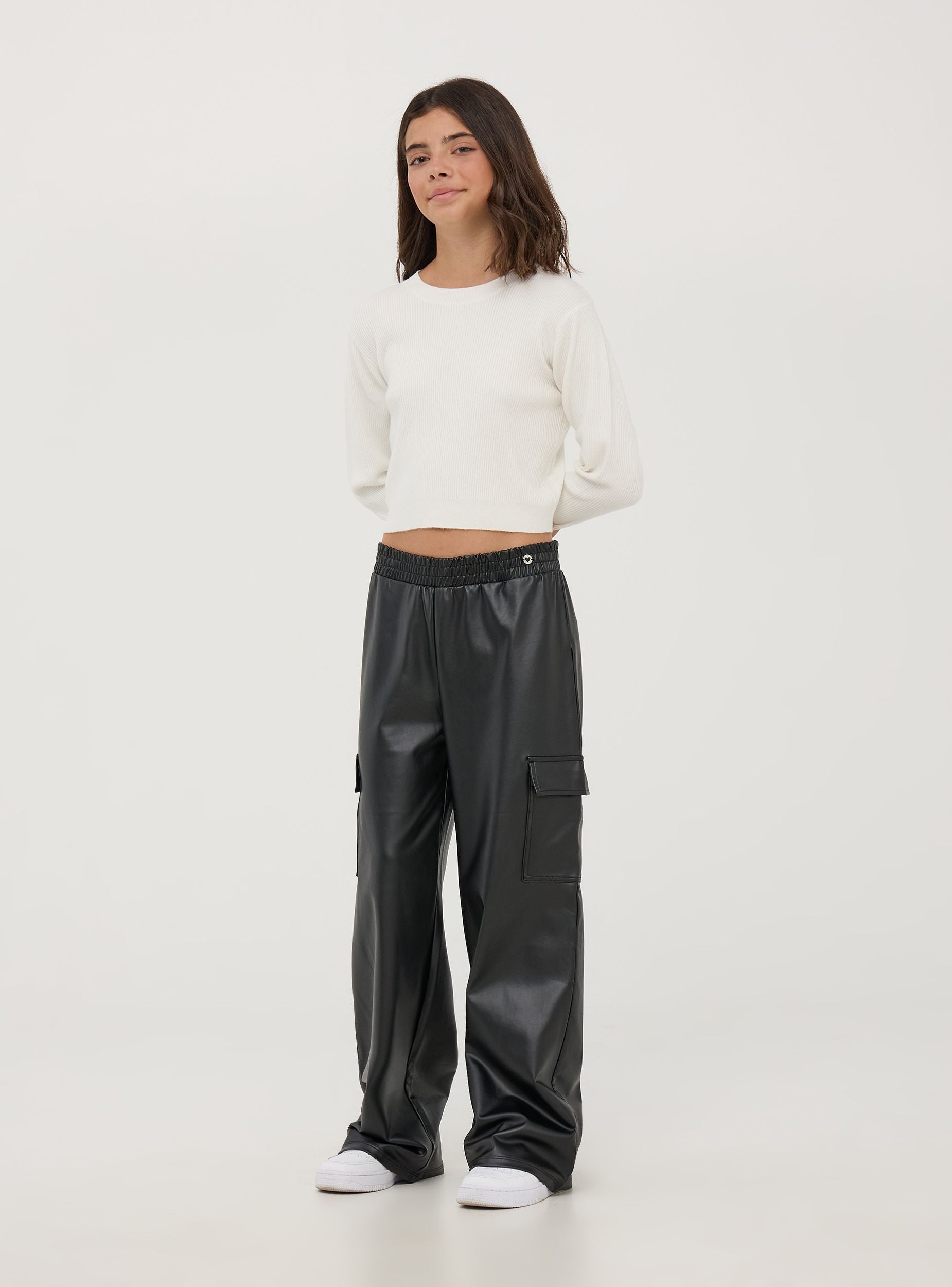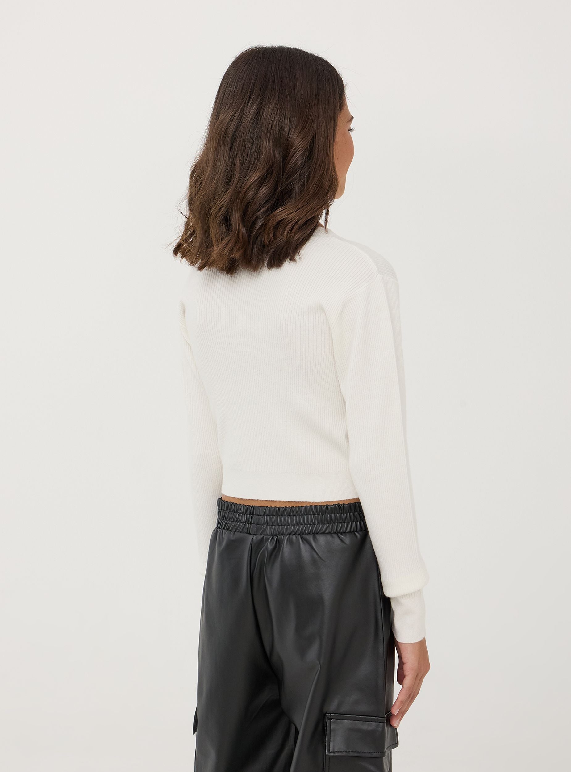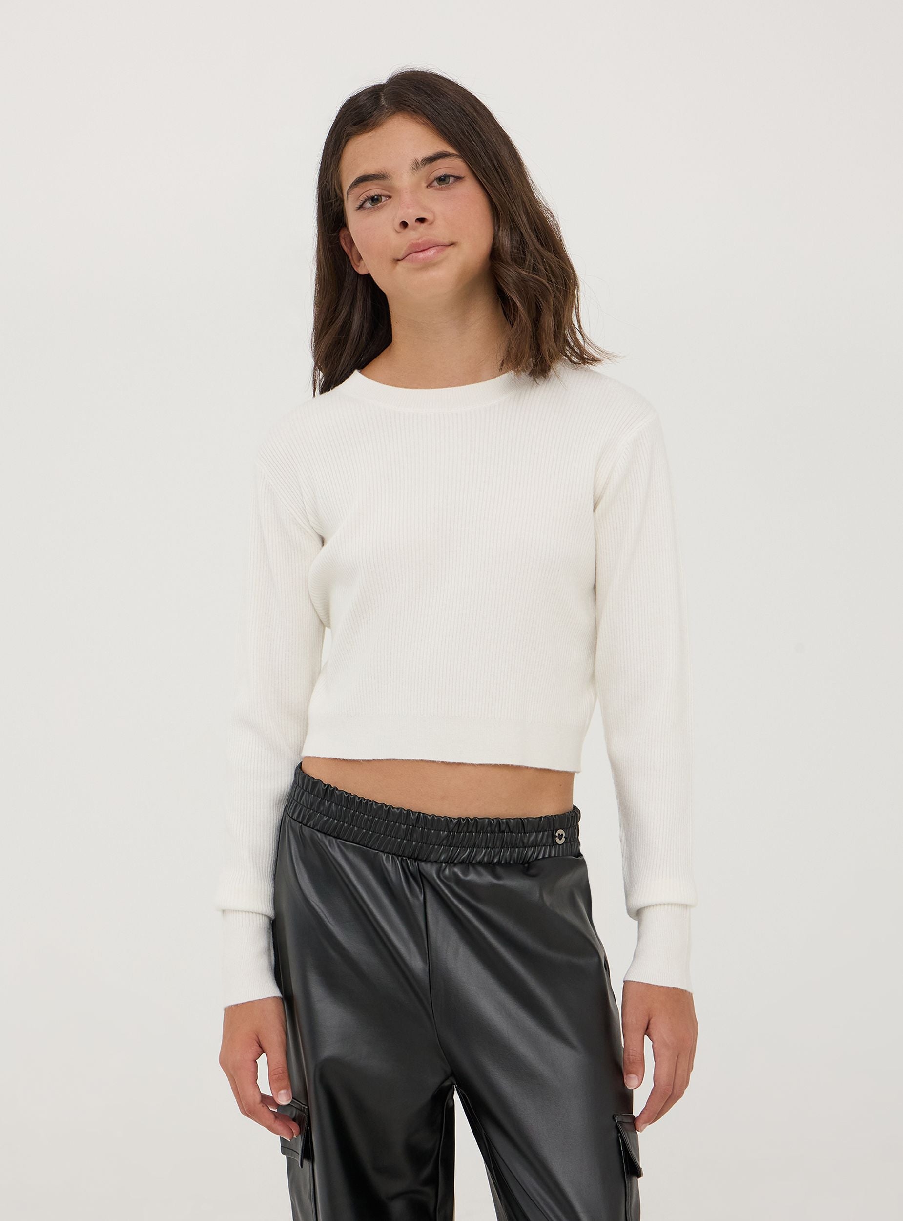Dievčenský sveter s dlhým rukávom a okrúhlym výstrihom, charakterizovaný crop strihom, ktorý pridáva moderný a módny dotyk. Vyrobený z jednofarebnej zmesi viskózy, mäkký a pohodlný. Ideálny na rôzne príležitosti, od školy po vychádzky s priateľmi alebo rodinou, tento sveter je univerzálny a ľahko sa kombinuje pre ležérny a trendy vzhľad. Nevyhnutná súčasť šatníka každej dievčiny, ktorá spája štýl a praktickosť.Detaily