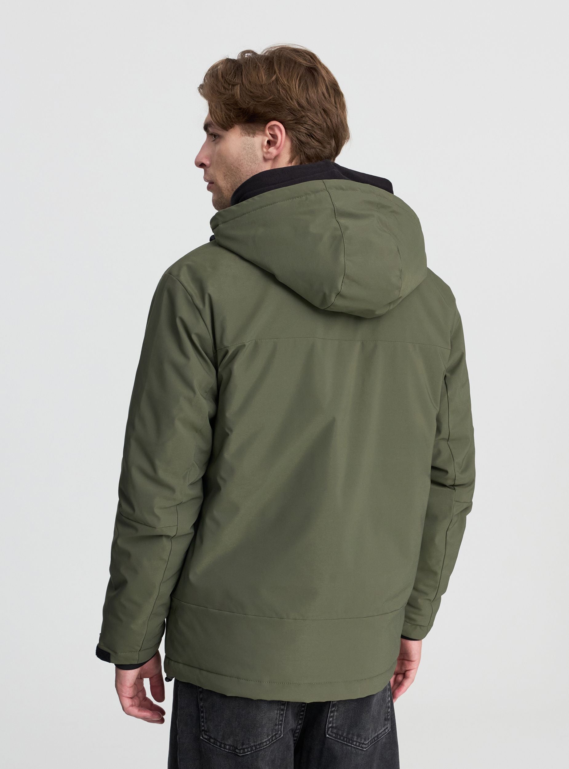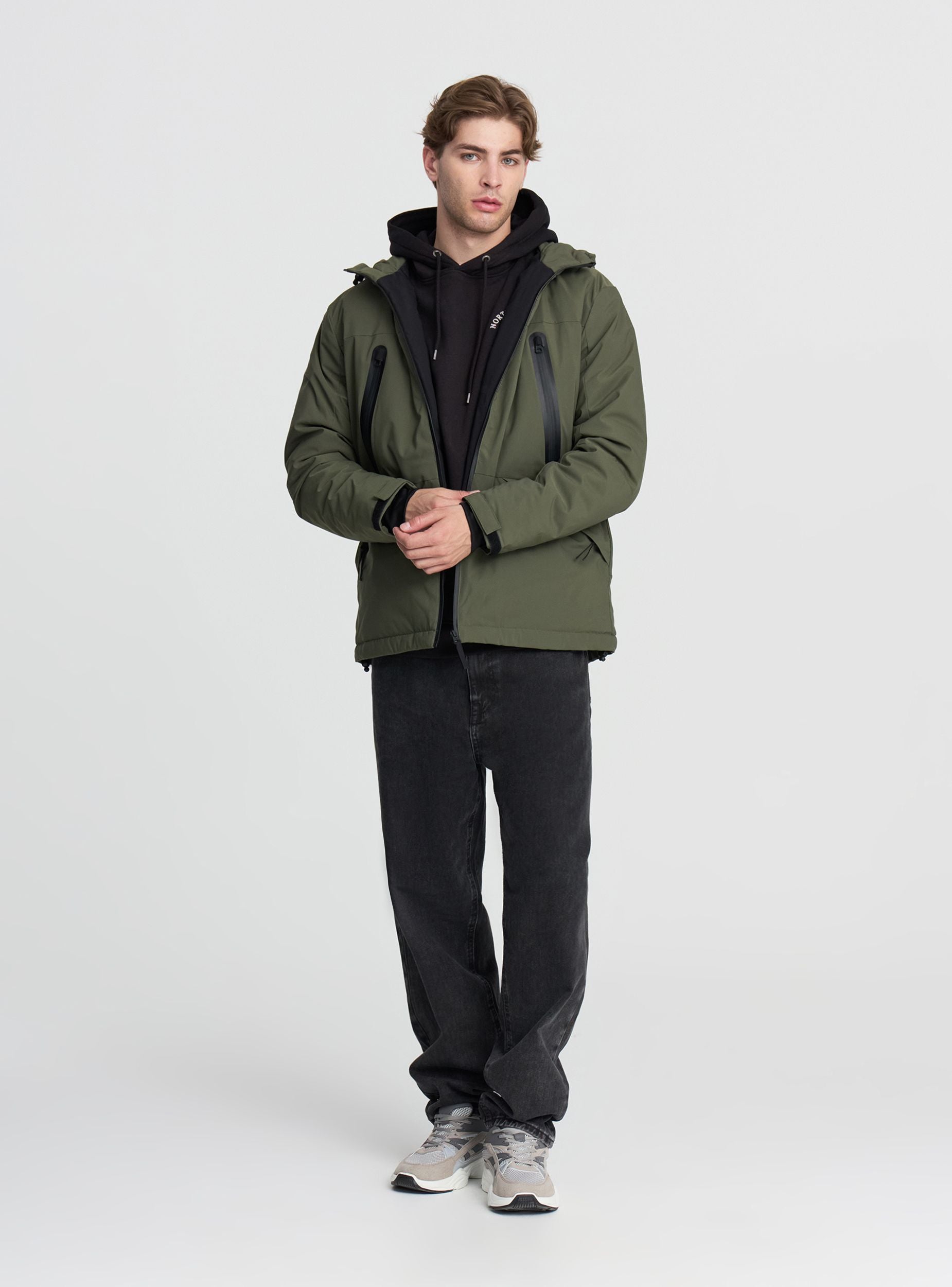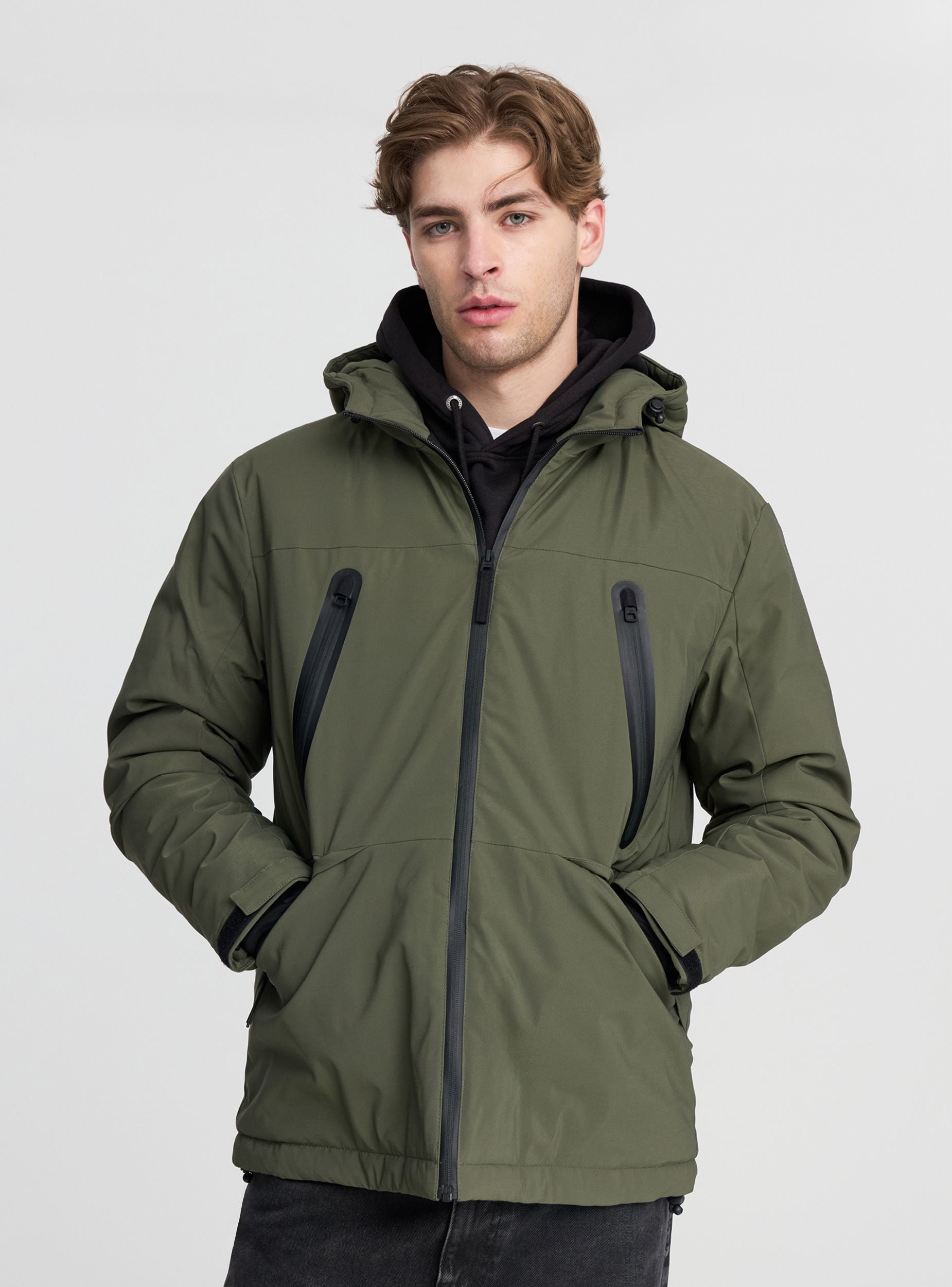 Pánska bunda s kapucňou, odolná voči vode, ideálna na daždivé alebo veterné dni. Vybavená zipsovou uzáverom a vreckami so zipsom, poskytuje praktickosť a ochranu. Technický a moderný dizajn ju robí ideálnou pre mestský a voľnočasový štýl. Rovný strih s nastaviteľnou spodnou časťou zaručuje pohodlie a voľnosť pohybu, zatiaľ čo nastaviteľná kapucňa pridáva funkčnosť. Vybavená vnútorným vreckom na suchý zips. Ideálna na kombinovanie s džínami alebo športovými nohavicami.Detaily