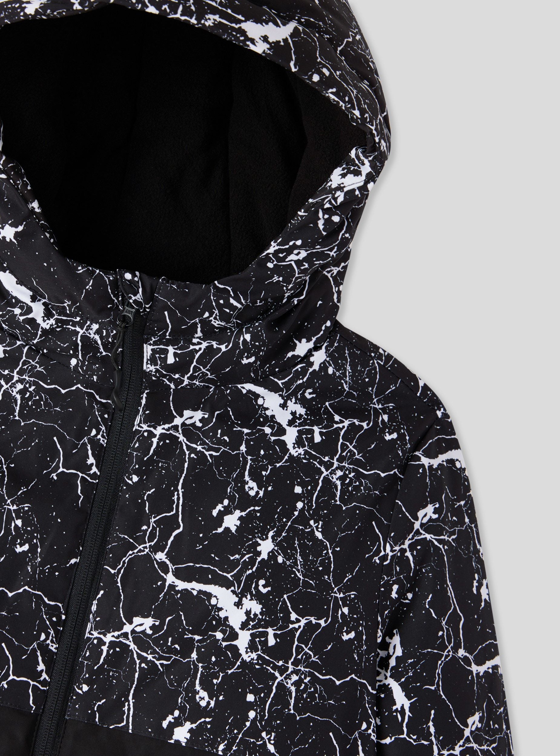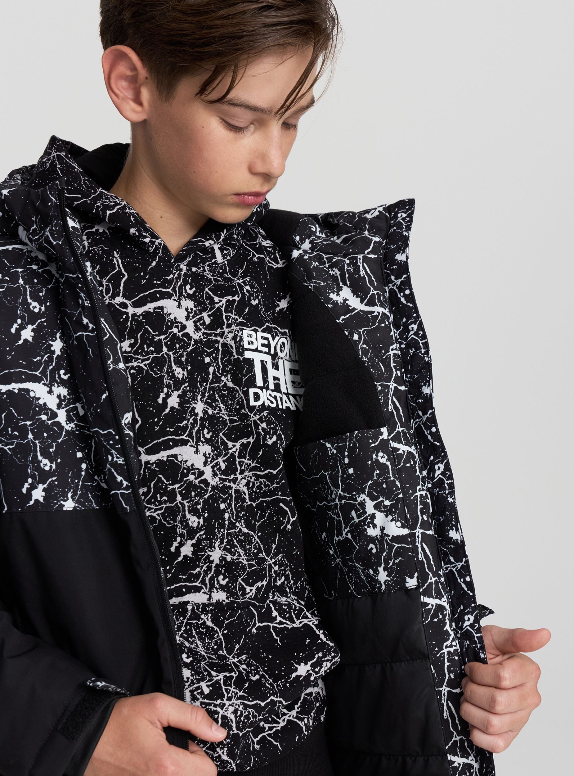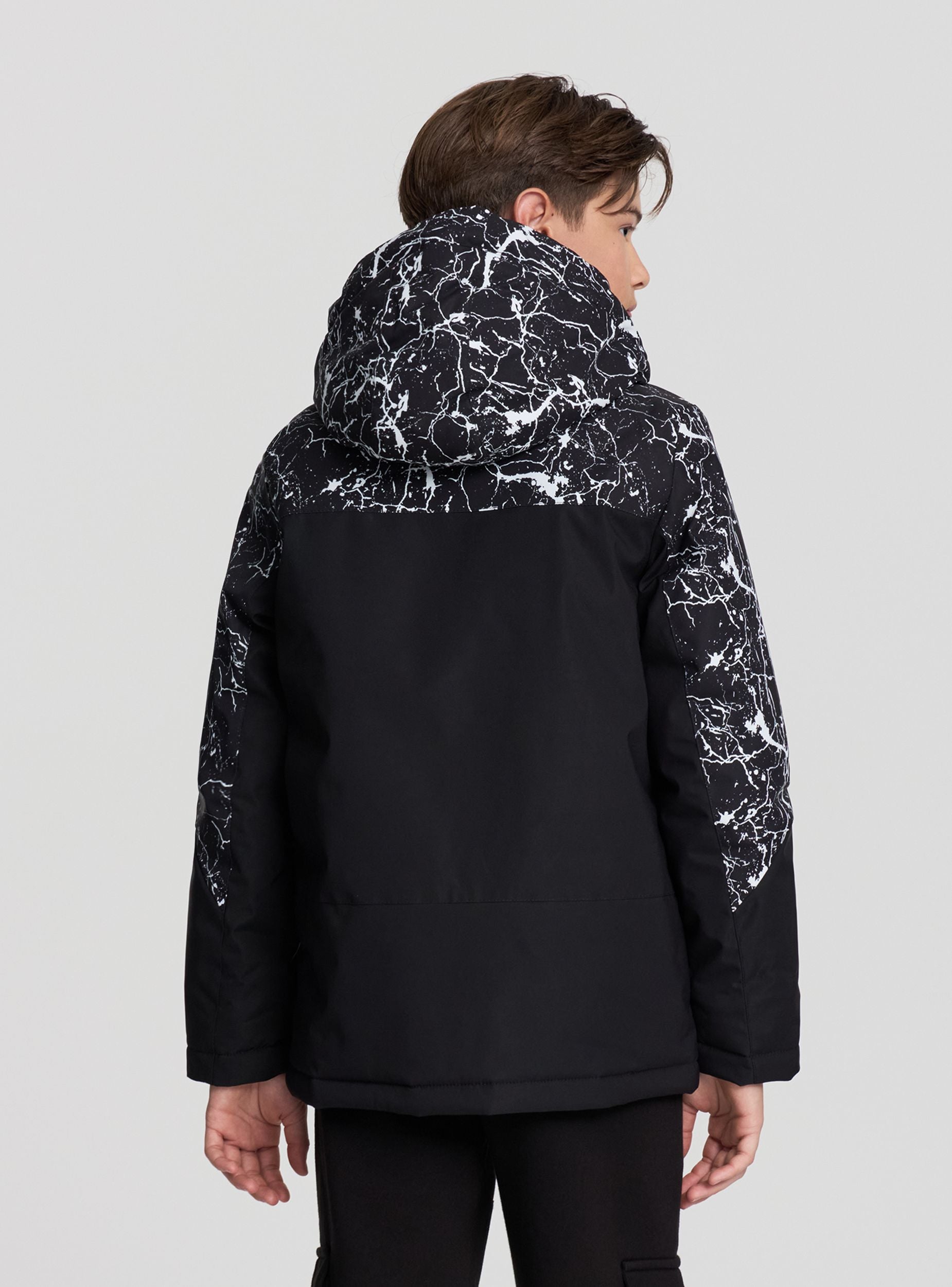 Detská bunda ideálna na chladné obdobie, charakterizovaná mramorovým vzorom v hornej časti a na kapucni. S pevným kapucňou, predným zipsom a bočnými vreckami so zipsom ponúka praktickosť a ochranu. Dlhé rukávy a regulárny strih ju robia dokonalou na každodenné nosenie a vonkajšie aktivity.