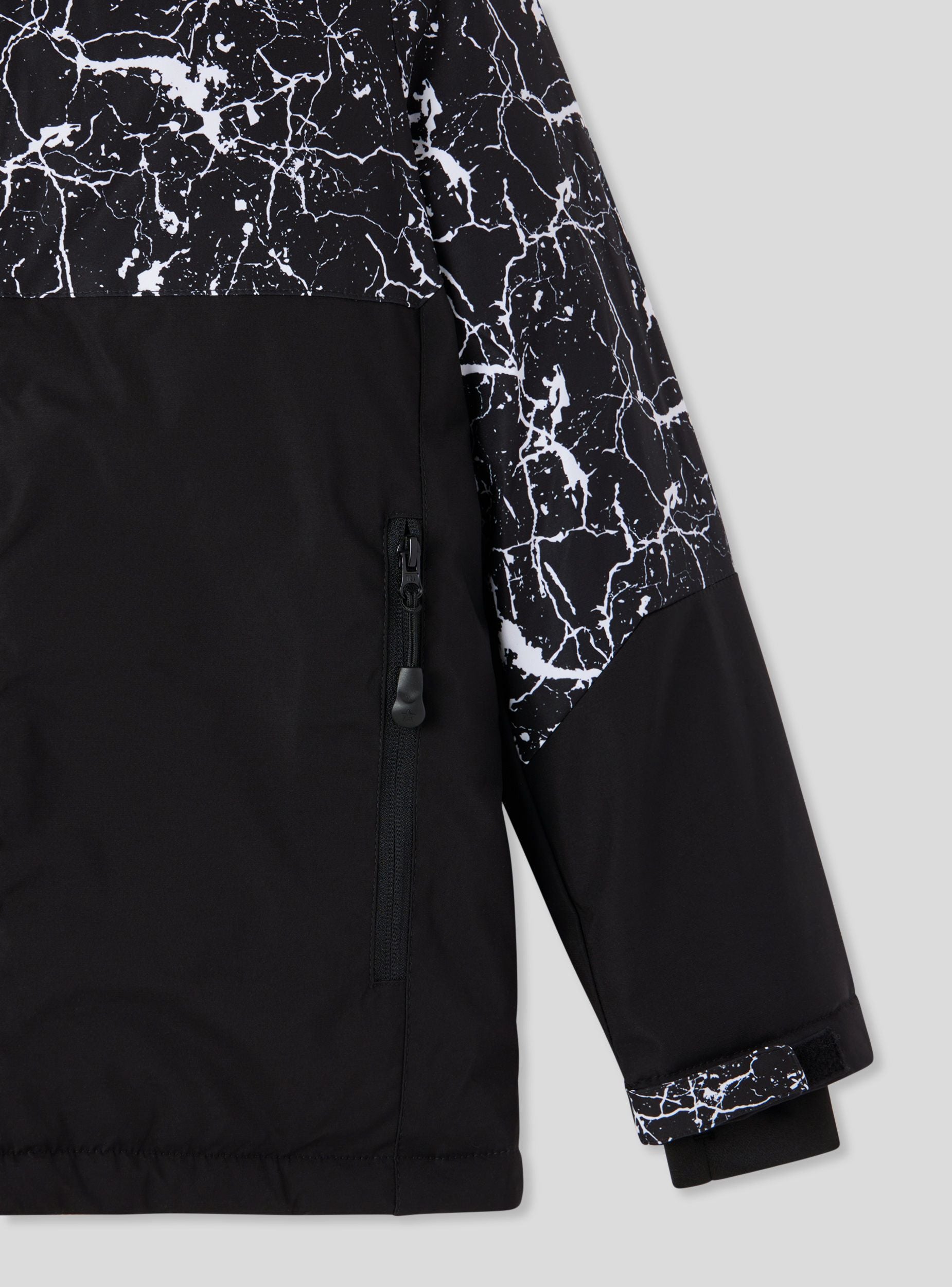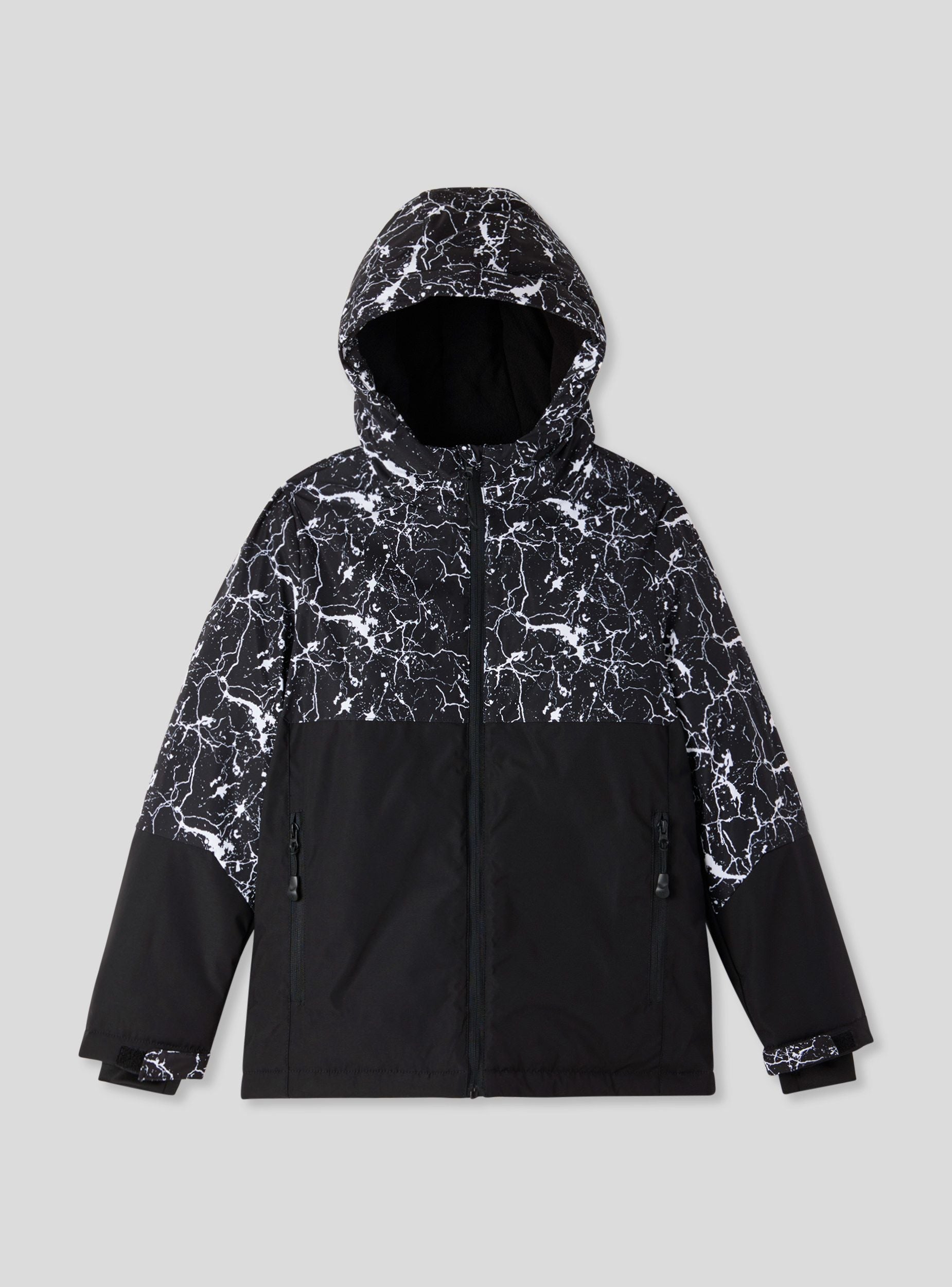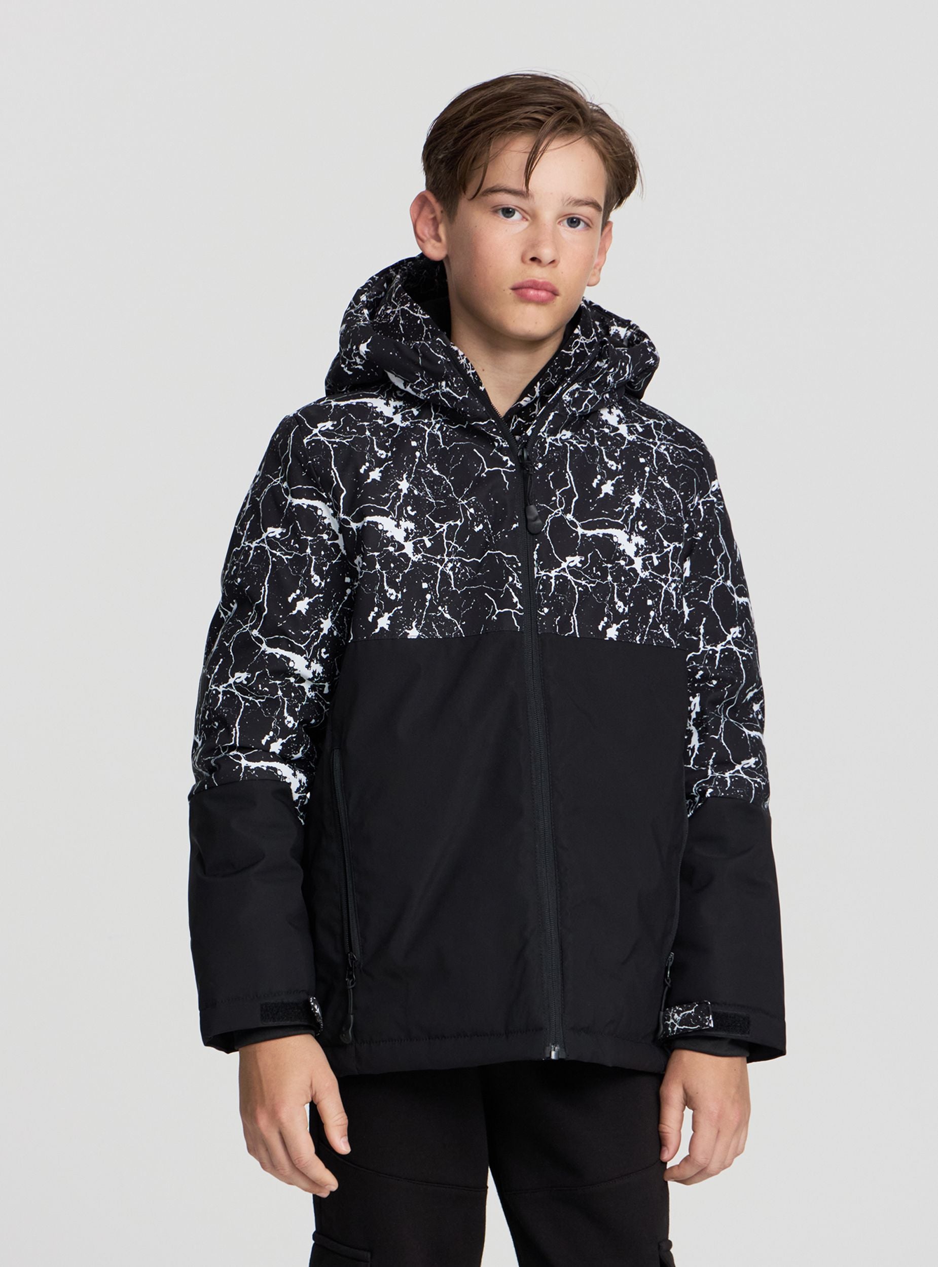 Detská bunda ideálna na chladné obdobie, charakterizovaná mramorovým vzorom v hornej časti a na kapucni. S pevným kapucňou, predným zipsom a bočnými vreckami so zipsom ponúka praktickosť a ochranu. Dlhé rukávy a regulárny strih ju robia dokonalou na každodenné nosenie a vonkajšie aktivity.