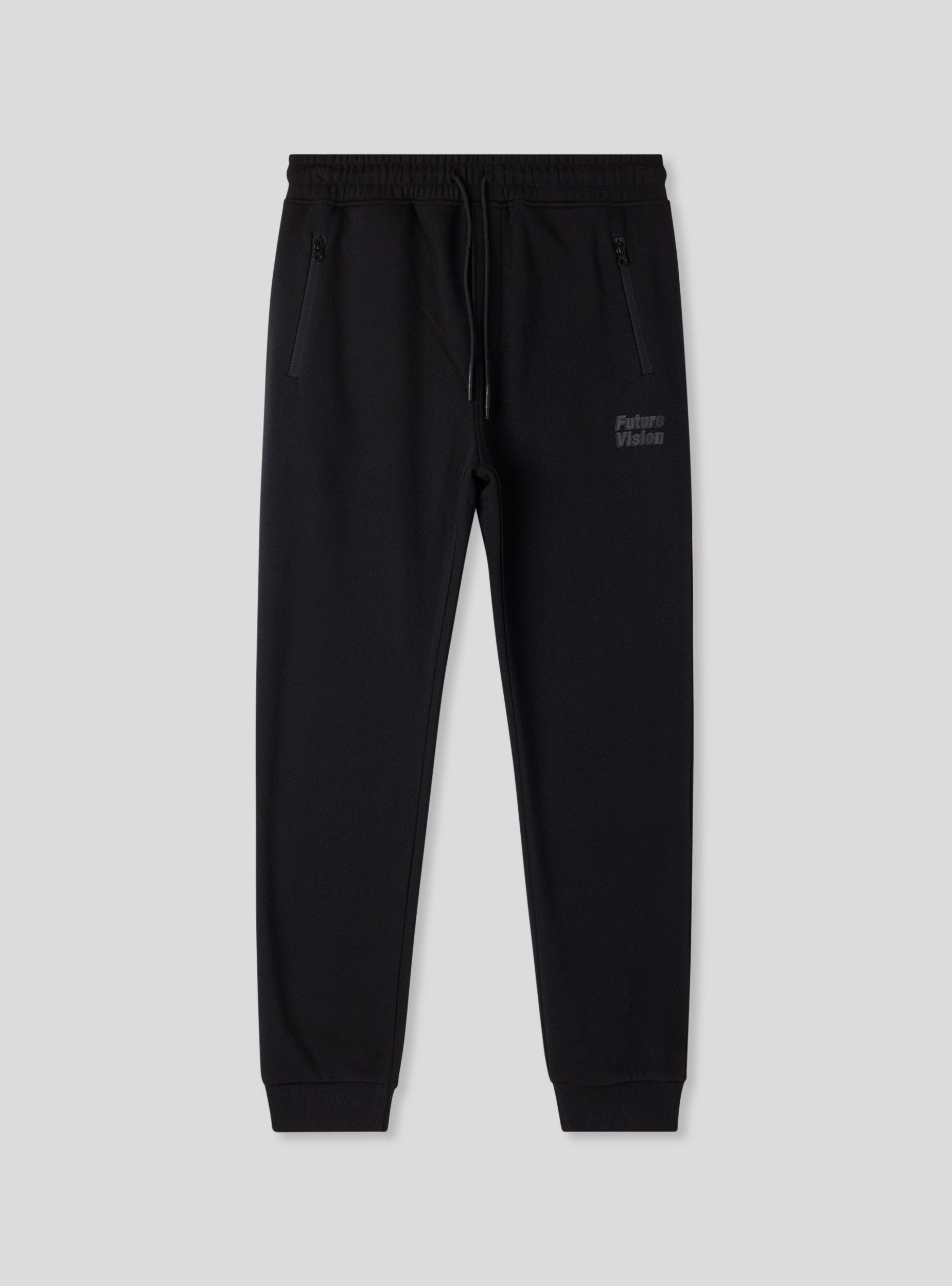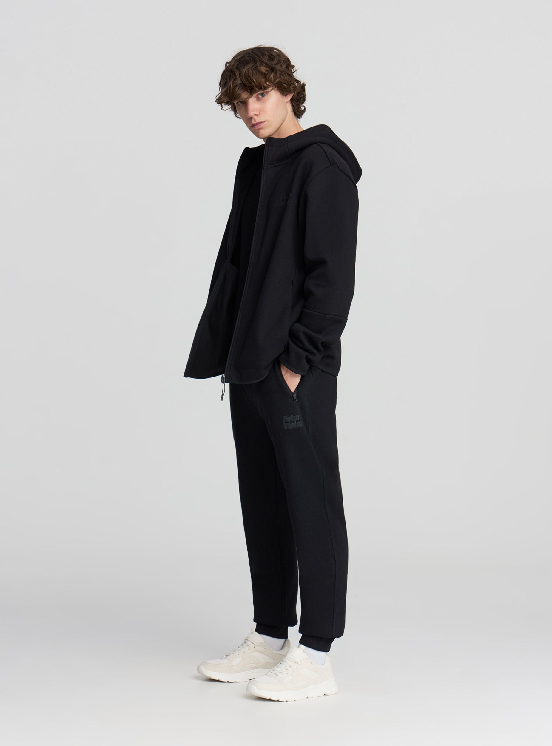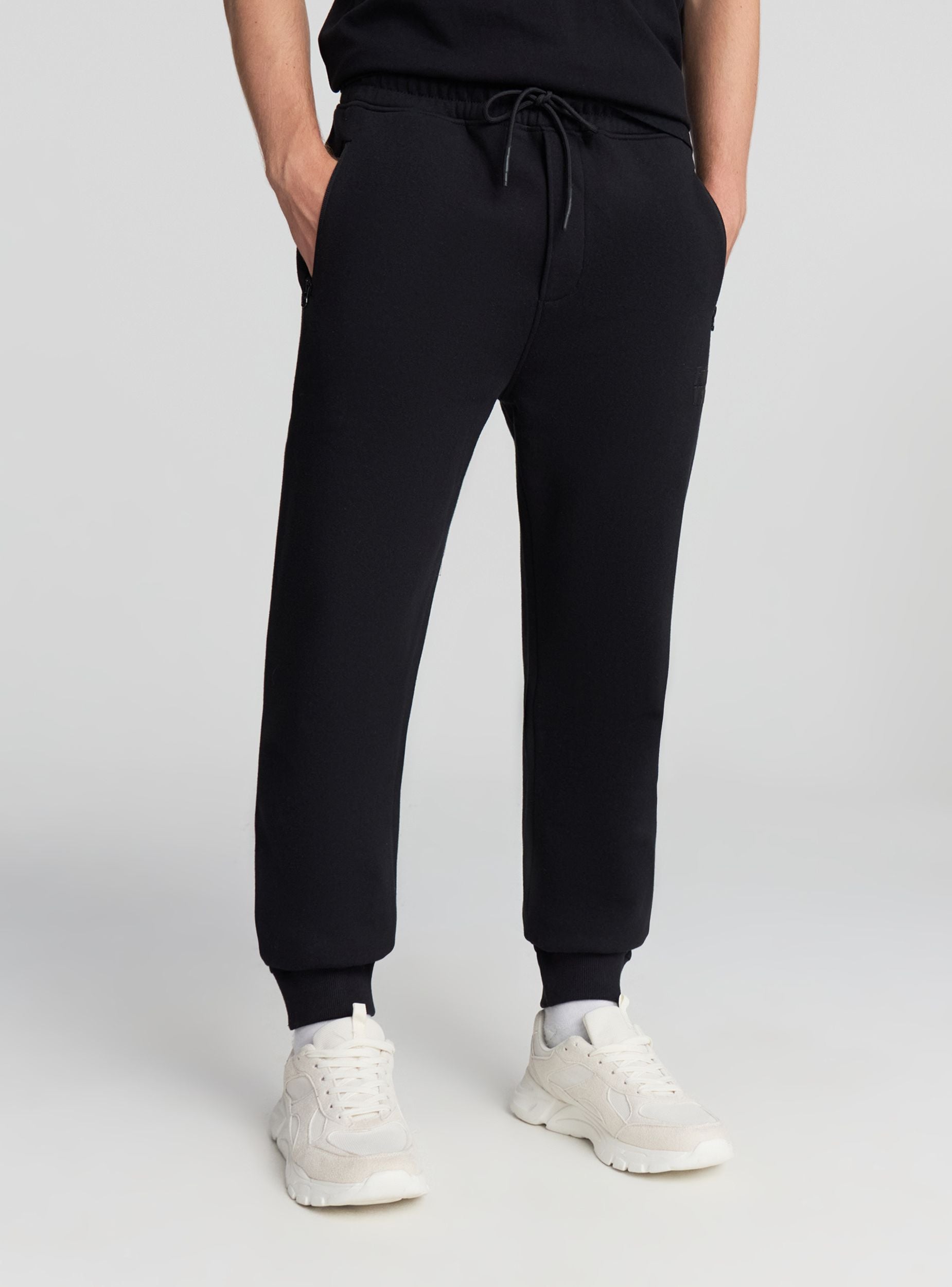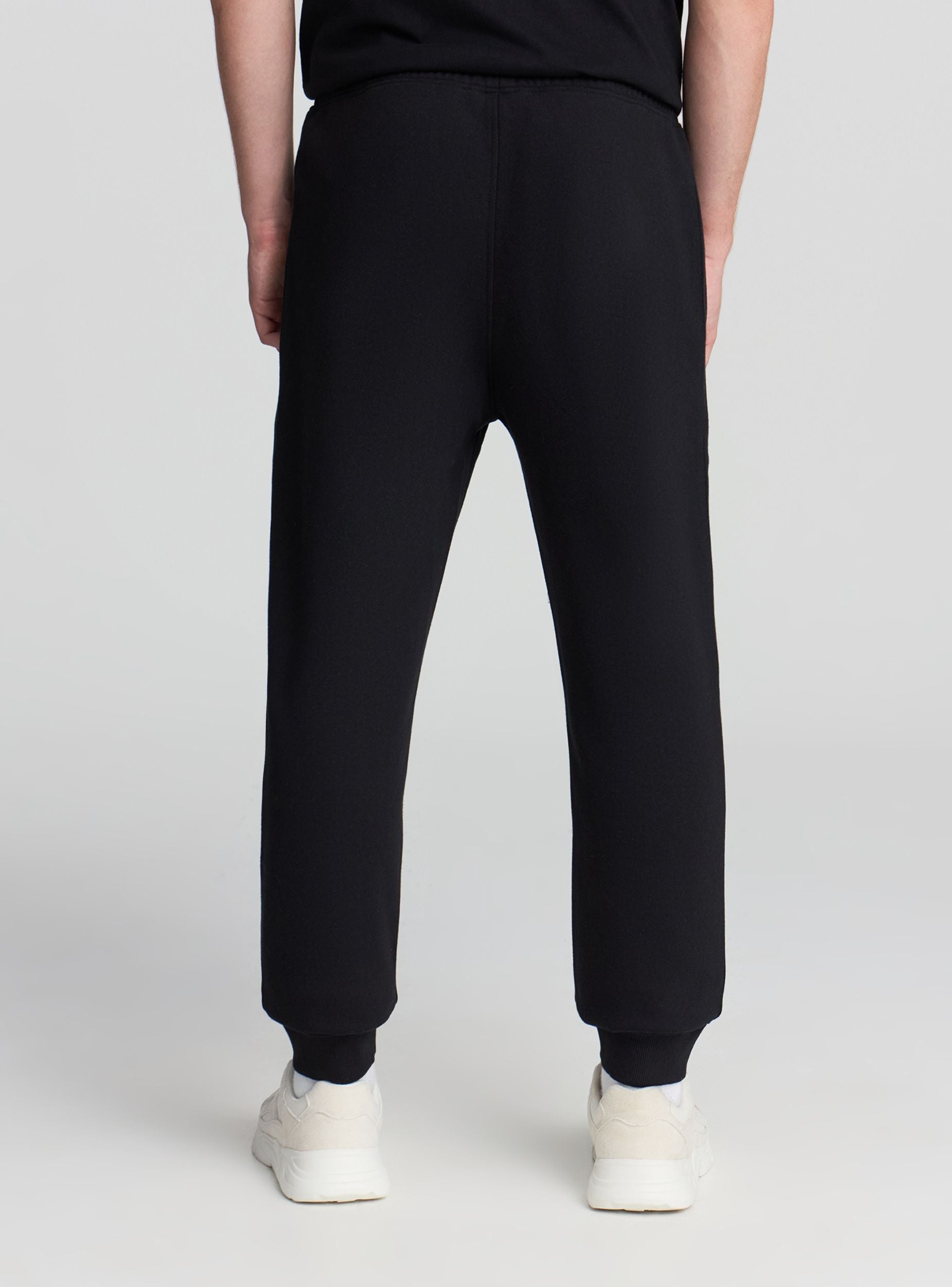 Pánske technické nohavice z ťažkej súpravy ideálne na voľný čas a športové aktivity. Majú regular strih, spodný okraj nohavíc s elastickým manžetom a praktickú nastaviteľnú šnúrku v páse. Sú vybavené bočnými vreckami na zips pre väčšiu bezpečnosť a detailom potlače s nápisom vpredu. Perfektné na kombinovanie s mikinami alebo tričkami pre športový a všestranný vzhľad.