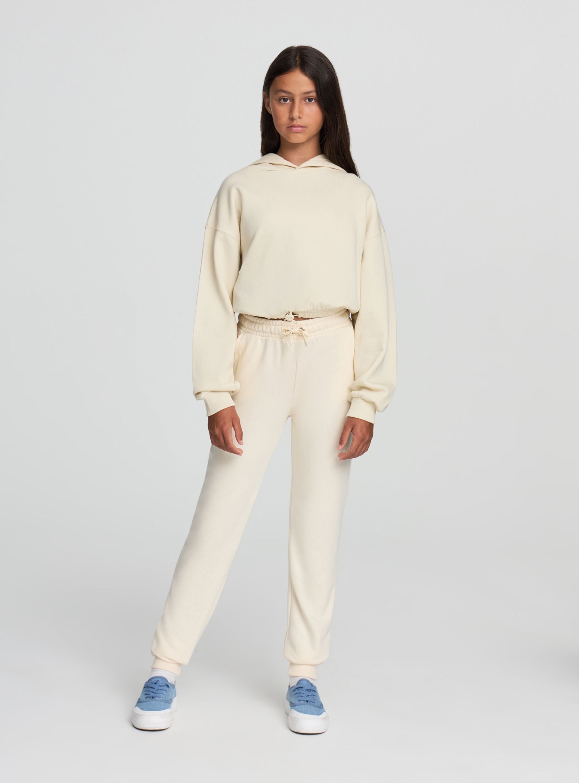 Ľahké nohavice dievčenskej teplákovej súpravy ideálne na voľný čas a každodenné aktivity. Majú pravidelný strih a jednofarebný dizajn, s elastickým pásom a nastaviteľným sťahovaním pre optimálne pohodlie. Sú vybavené praktickými bočnými vreckami a elastickými manžetami na členkoch, vďaka čomu sú perfektné na vytvorenie pohodlných a ležérnych outfitov.