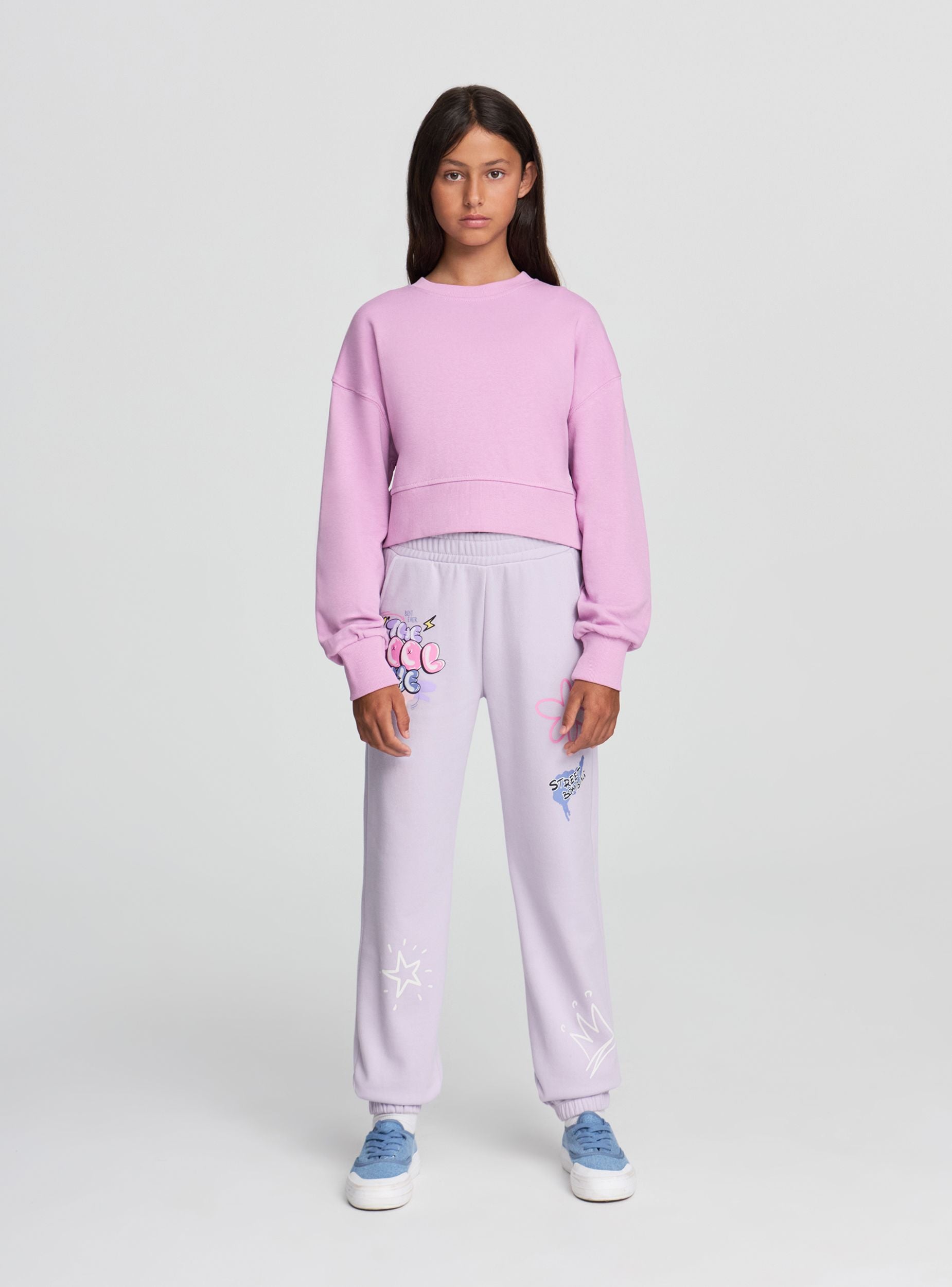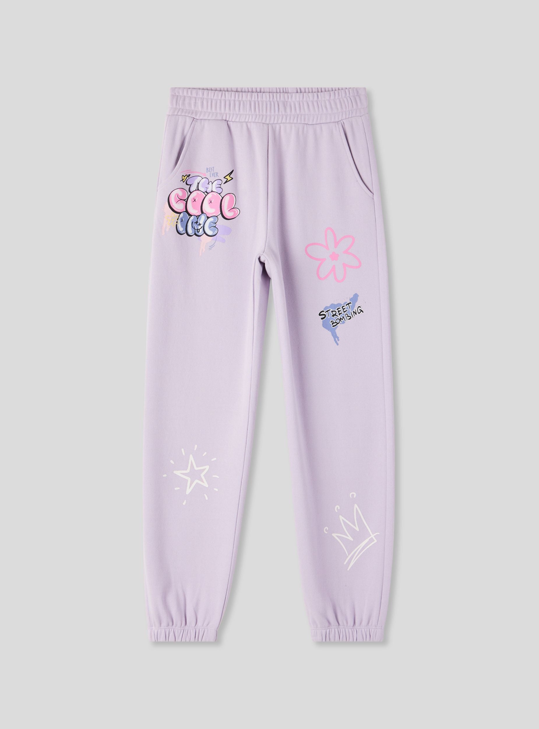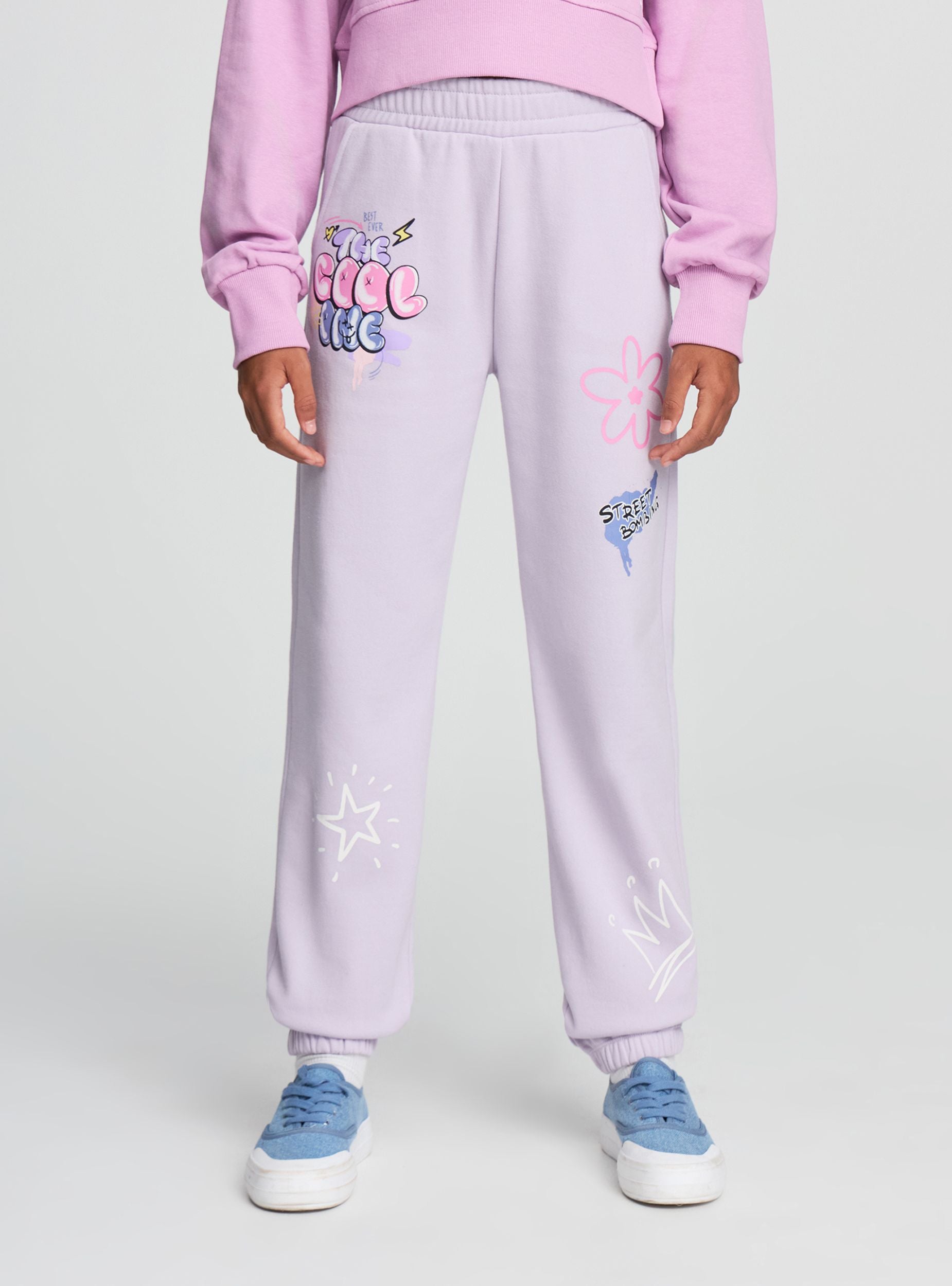 Detské teplákové nohavice sú ideálne na voľný čas a každodenné aktivity. Majú graffiti potlač a grafické detaily, ktoré dodávajú živý a moderný vzhľad. Model má elastický pás, šikmé bočné vrecká a elastický spodný okraj nohavíc pre pohodlné nosenie. Sú perfektné na kombinovanie s mikinami alebo tričkami pre športový a dynamický vzhľad, sú vhodné na každú časť dňa.