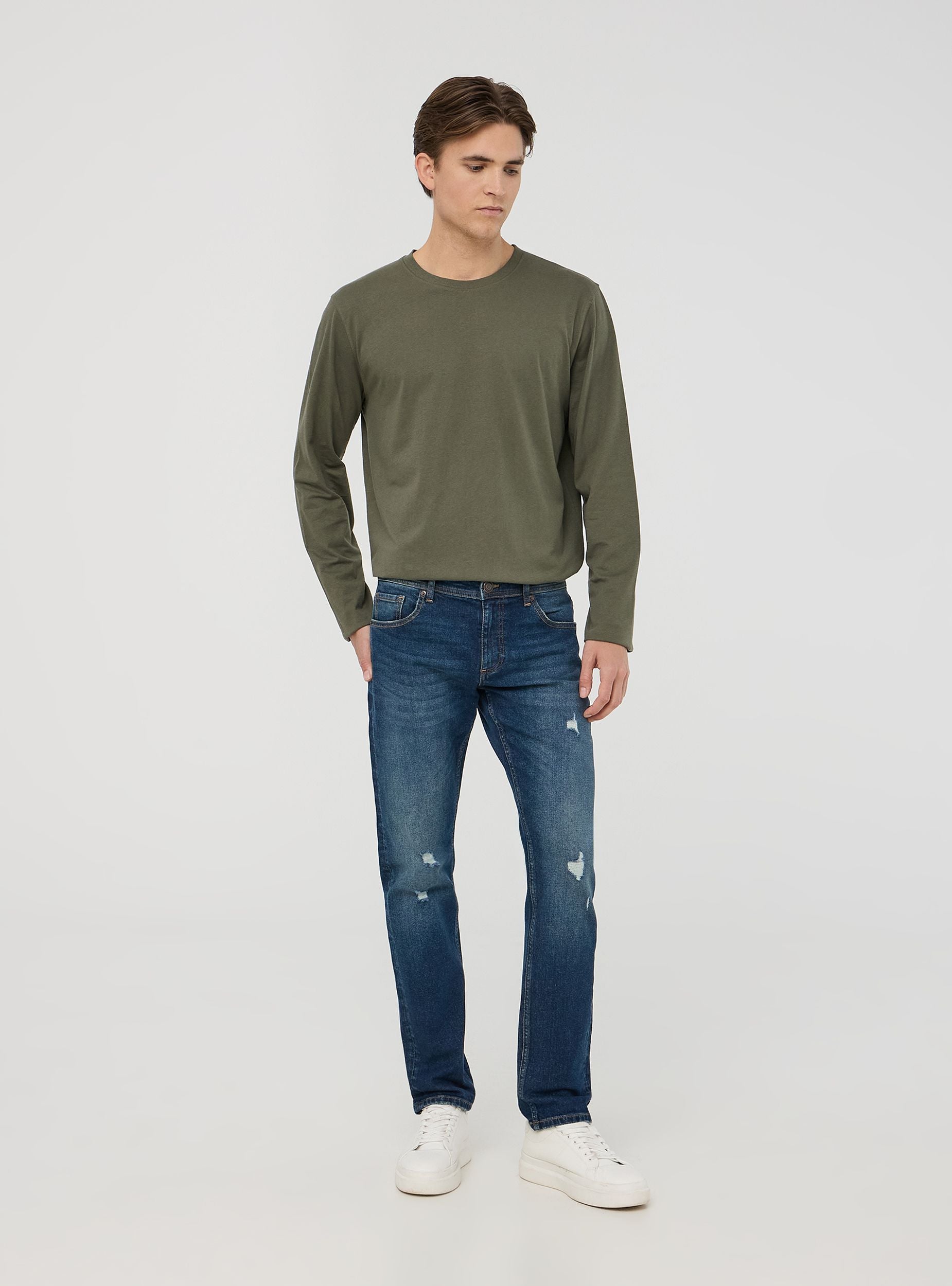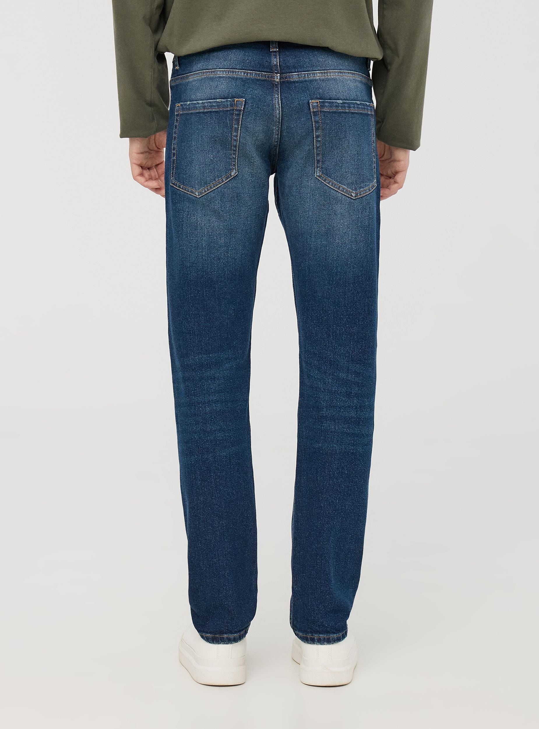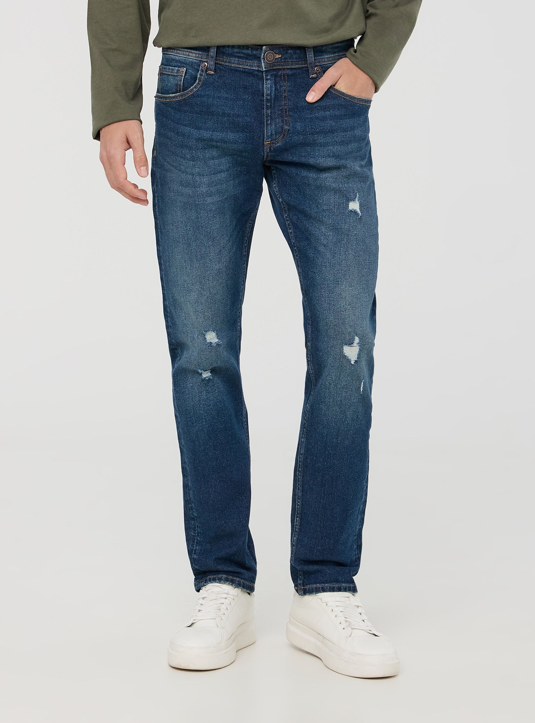 Pánske skinny džínsy, ideálne pre súčasný a trendový vzhľad. Tmavý denimový umývanie dodáva rozhodný dotyk, zatiaľ čo malé roztrhnutia pridávajú charakter bez preháňania. Zapínanie na gombík a zips zabezpečuje pohodlie a praktickosť, doplnené piatimi vreckami pre extra funkčnosť. Perfektné s tričkom a teniskami pre ležérny vzhľad, alebo s košeľou a sakom pre sofistikovanejší outfit.Detaily