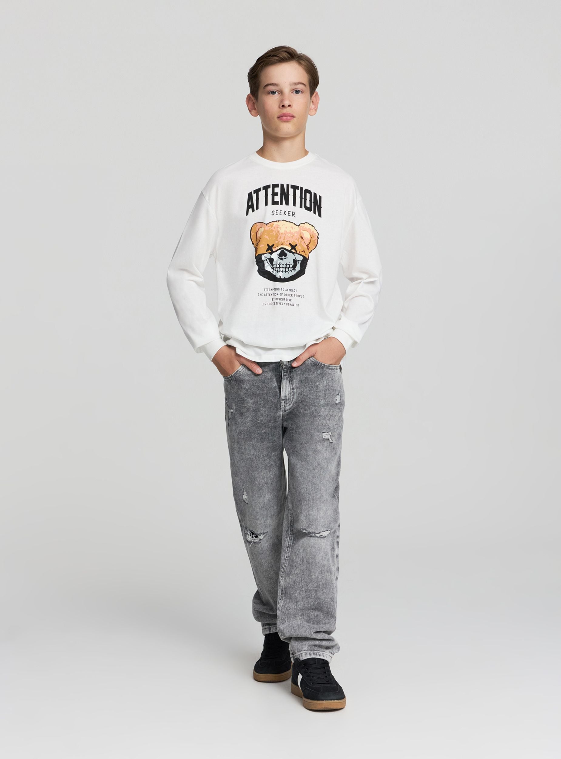 Detská mikina s dlhým rukávom ideálna pre neformálne a dynamické vzhľady. Dizajn obsahuje grafický potlač s nápisom, medveďom a lebkou, čo je dokonalé na pridanie originálneho dotyku k každodenným outfitom. Okrúhly výstrih a manžety zabezpečujú pohodlie a pravidelné nosenie. Ľahko sa kombinuje s džínsami alebo športovými nohavicami na školu alebo voľný čas.