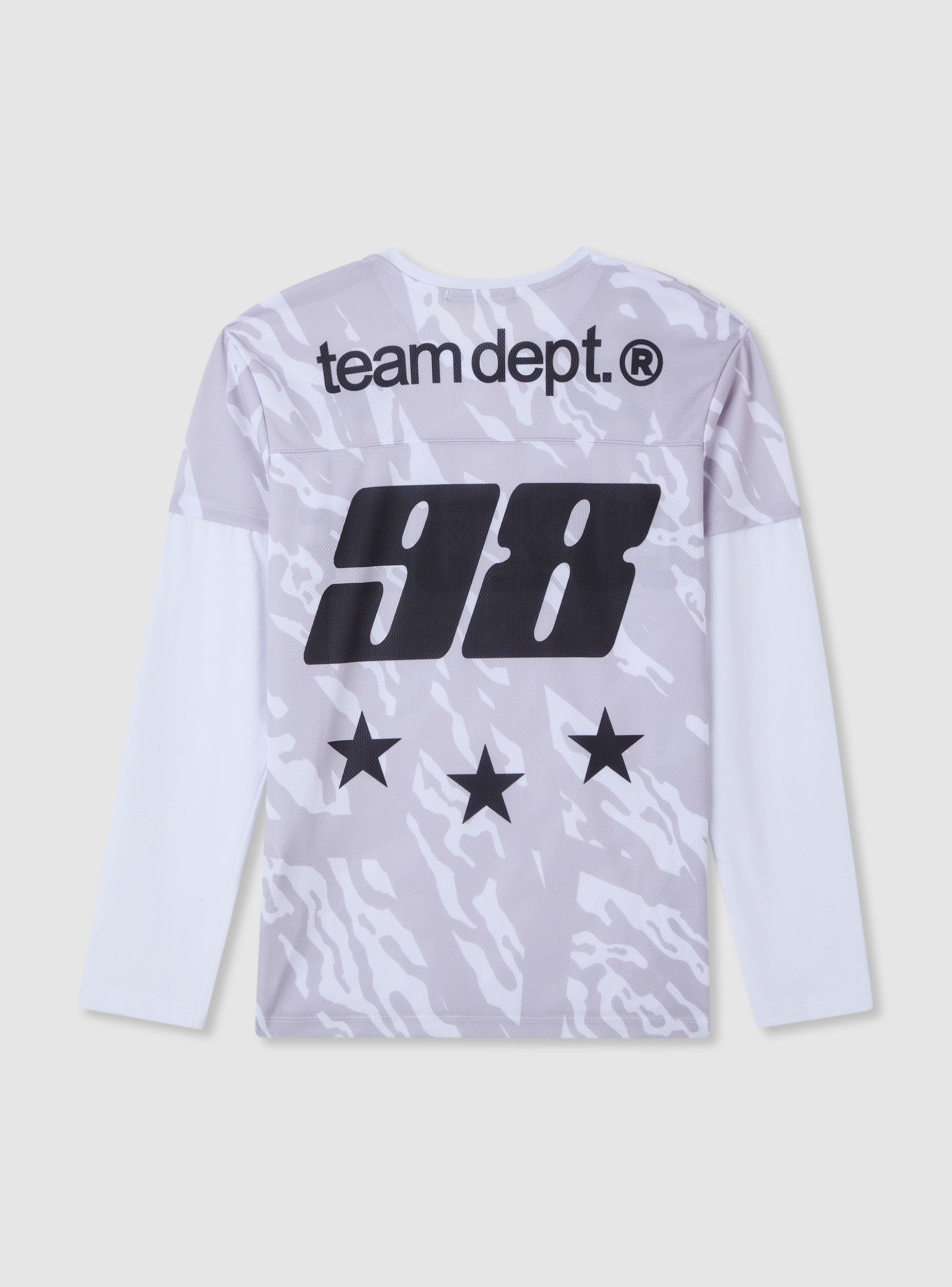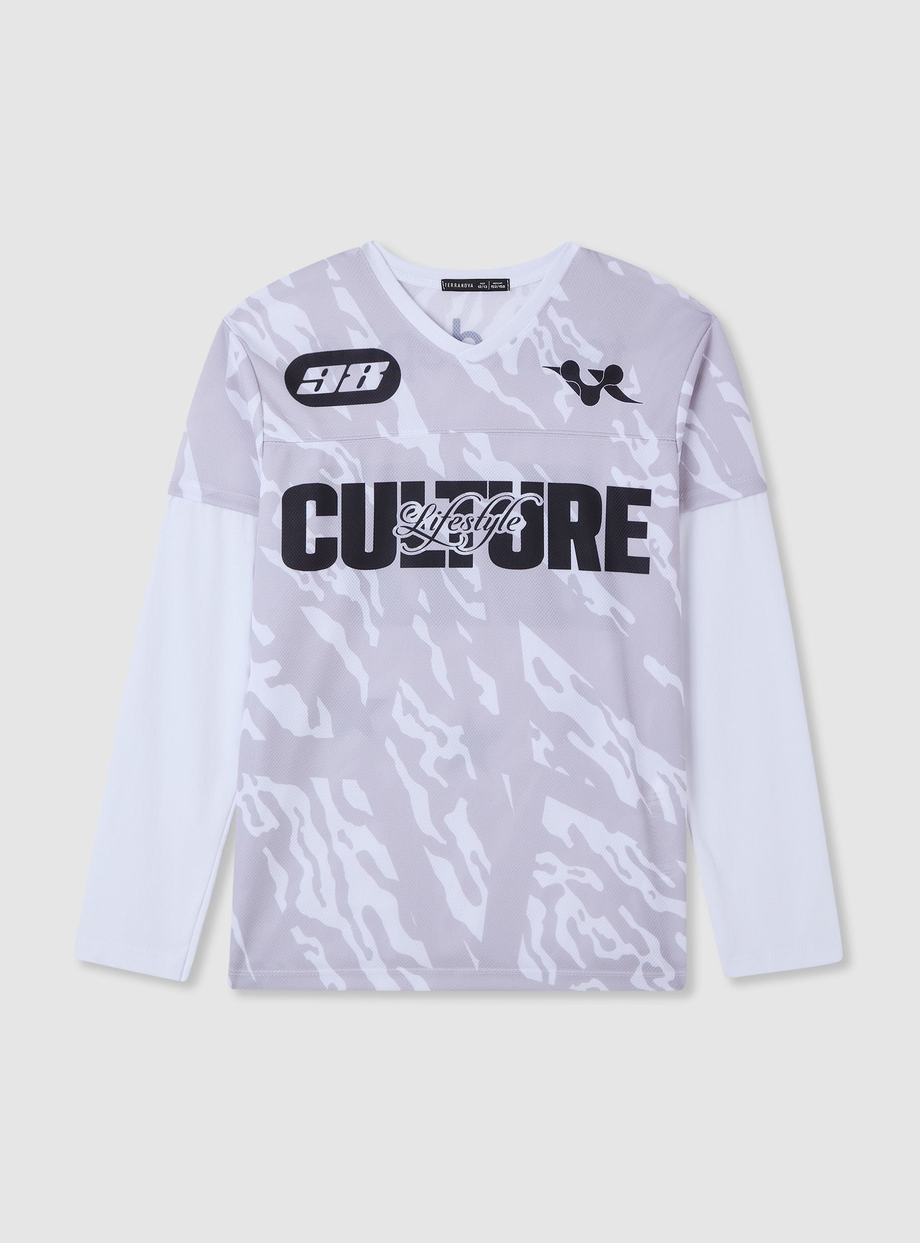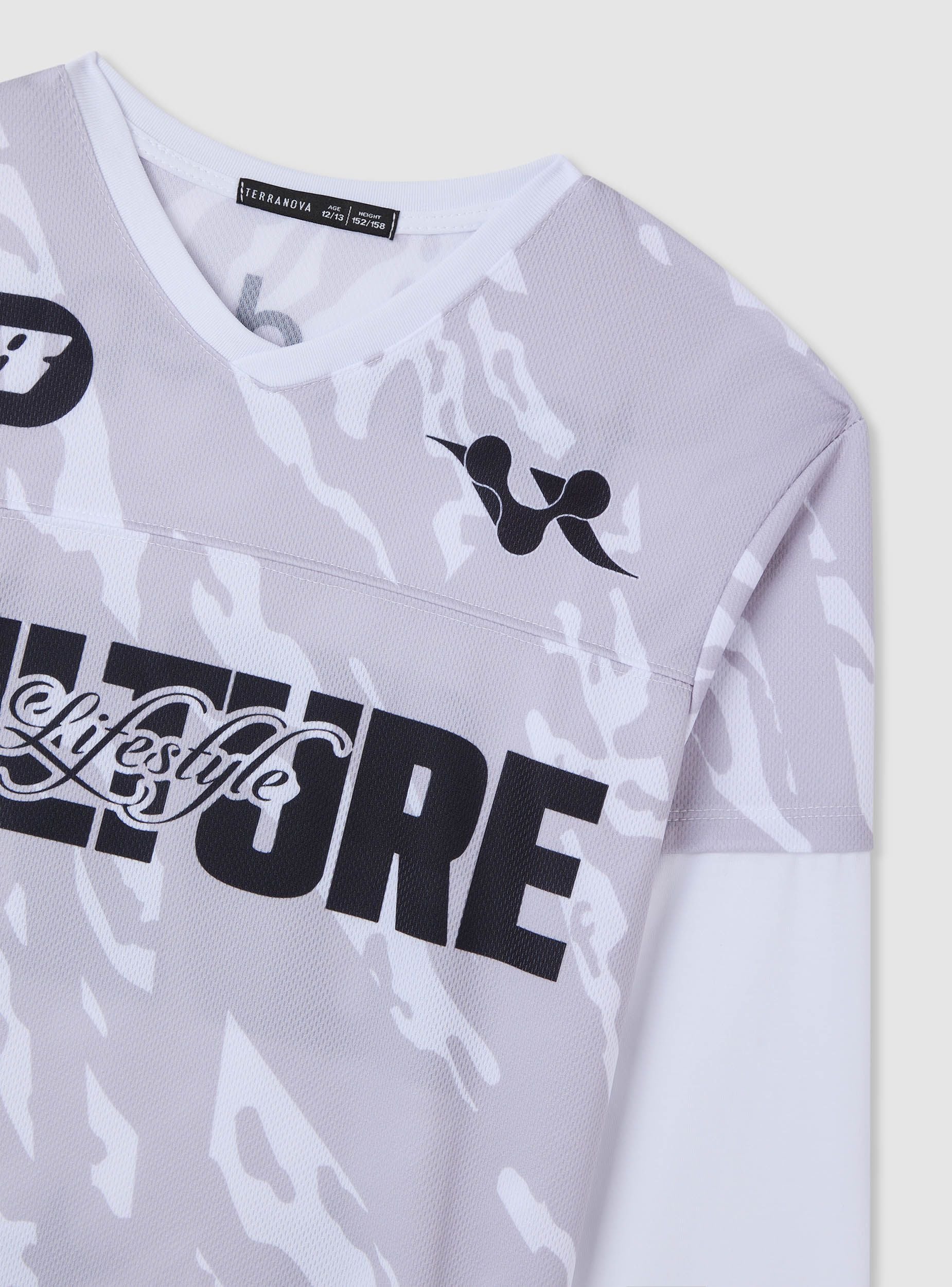 Chlapčenské tričko s dlhým rukávom, výstrihom do V a športovou potlačou na prednej a zadnej strane. Telo trička je s celoplošnou potlačou, zatiaľ čo rukávy sú jednofarebné, pre mestský vzhľad. Regular strih, ideálne do školy a na voľný čas, ľahko sa kombinuje s džínsami alebo cargo nohavicami.Detaily