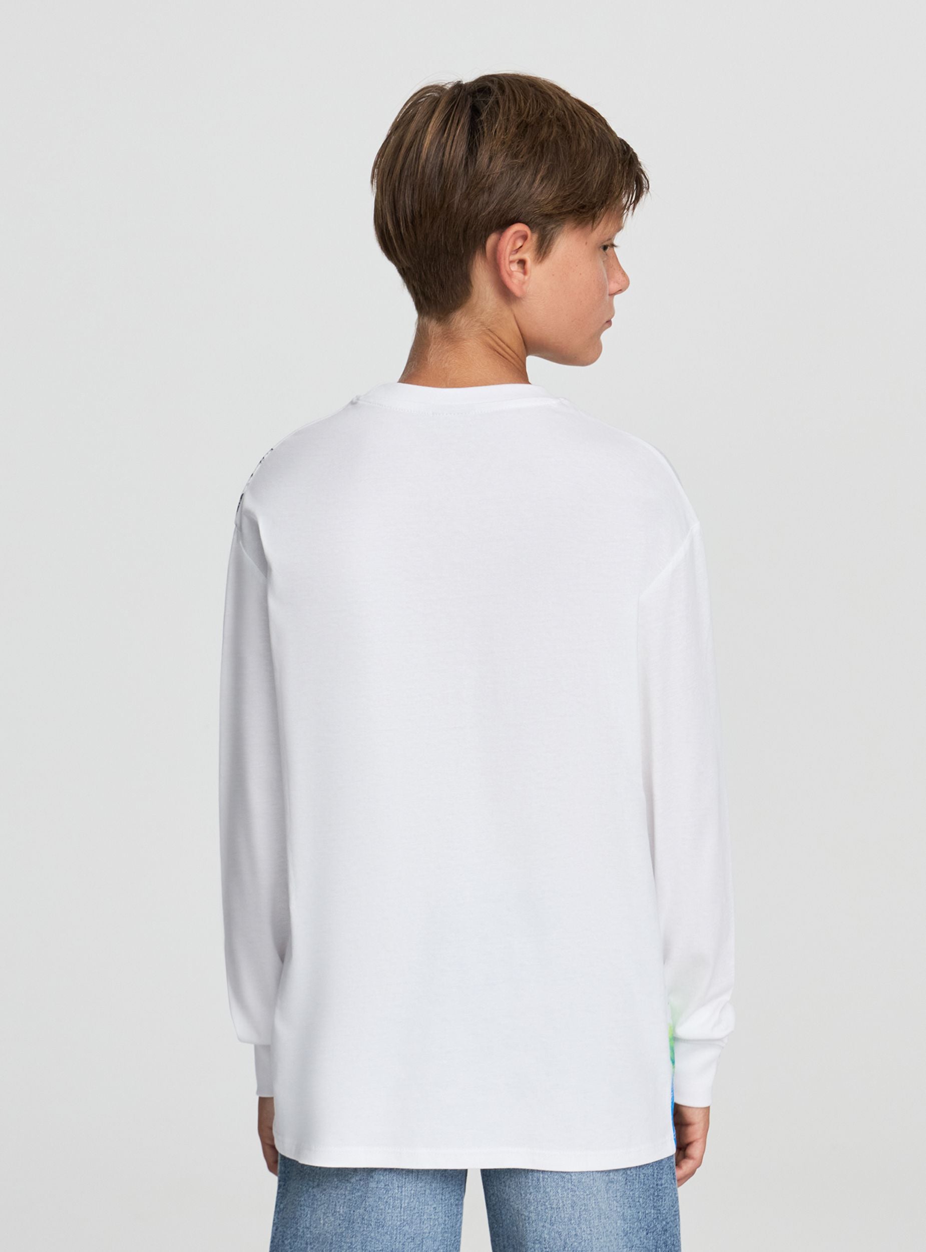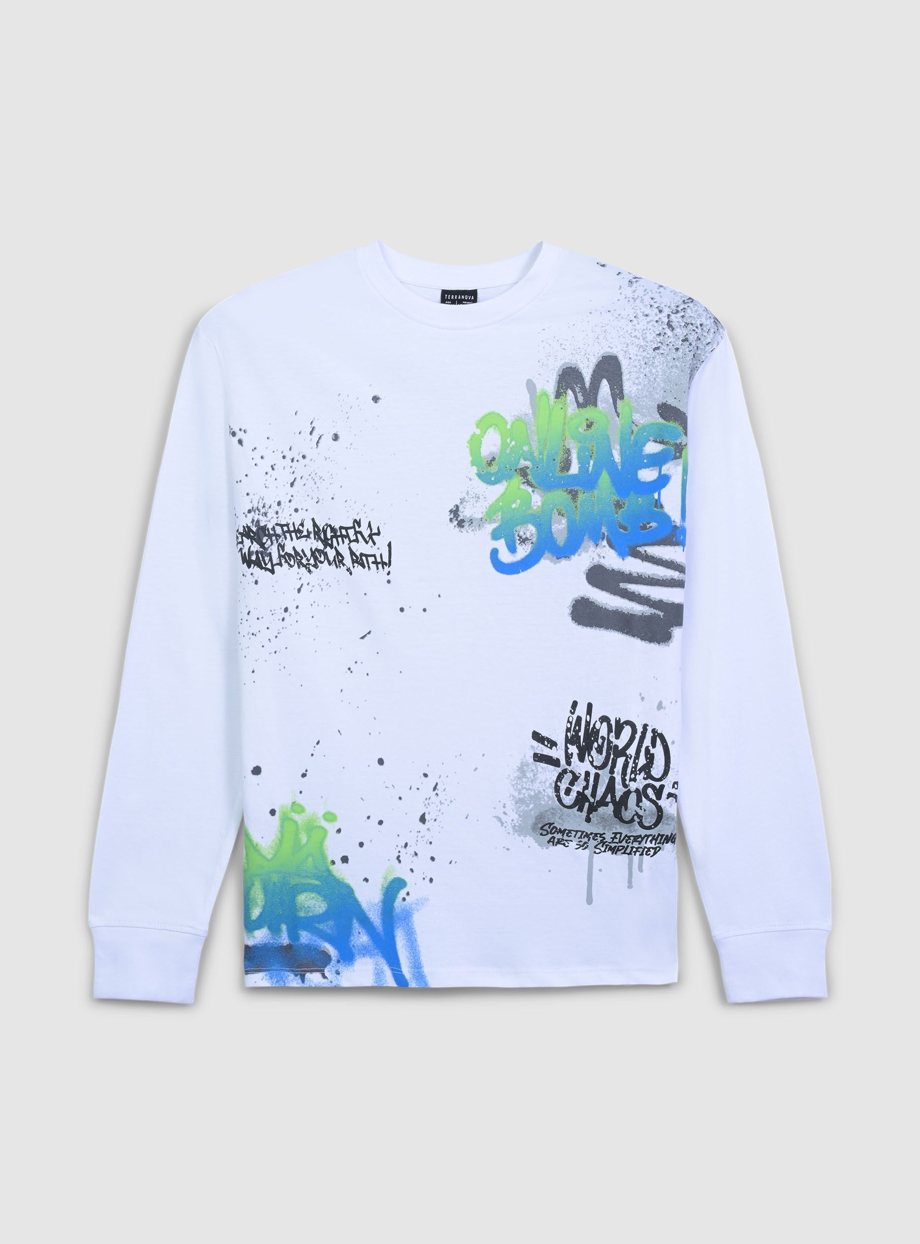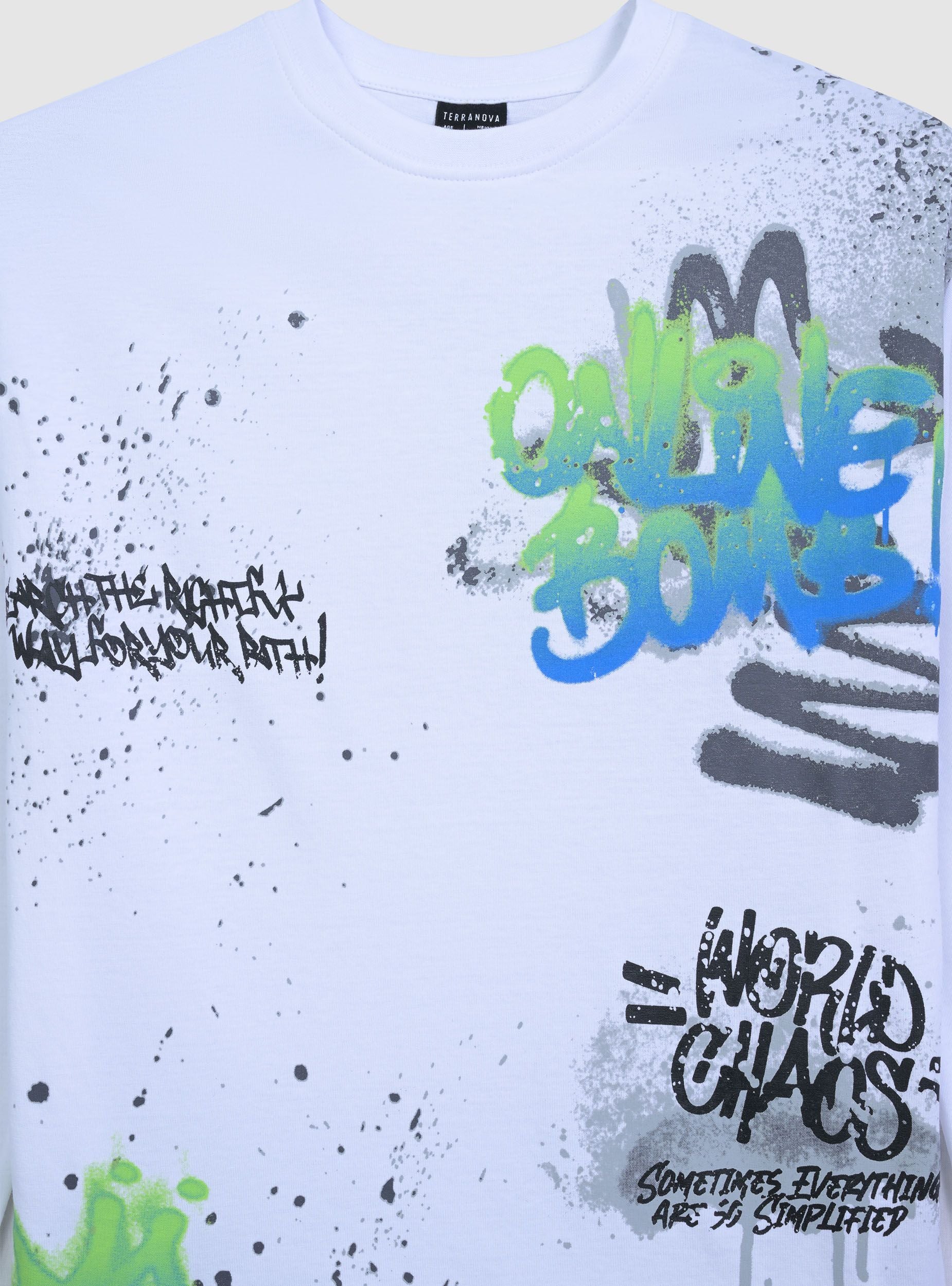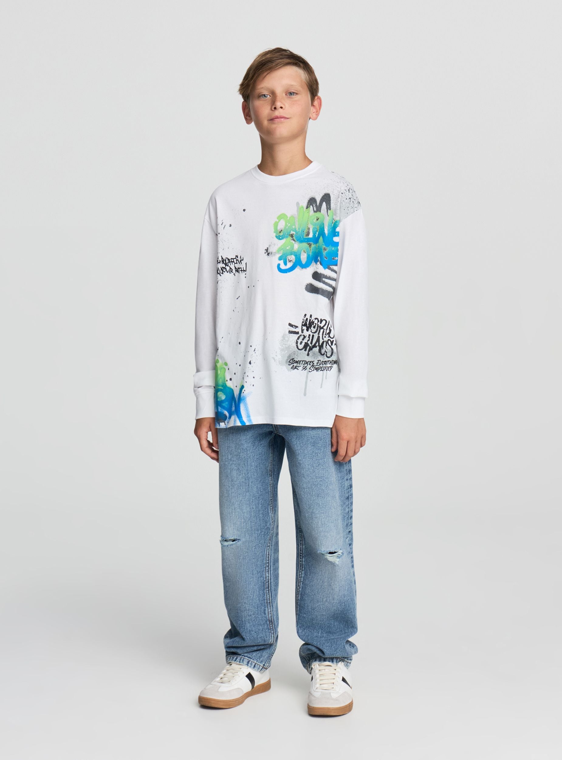 Detské tričko s dlhými rukávmi a graffiti potlačou. Ideálne pre ležérny a moderný vzhľad, toto tričko vyniká atraktívnym dizajnom a pohodlným strihom. Perfektné na kombinovanie s džínsami alebo športovými nohavicami, prináša jedinečný štýl na voľný čas. Dlhé rukávy a okrúhly výstrih ho robia vhodným na rôzne ročné obdobia a príležitosti.Detaily