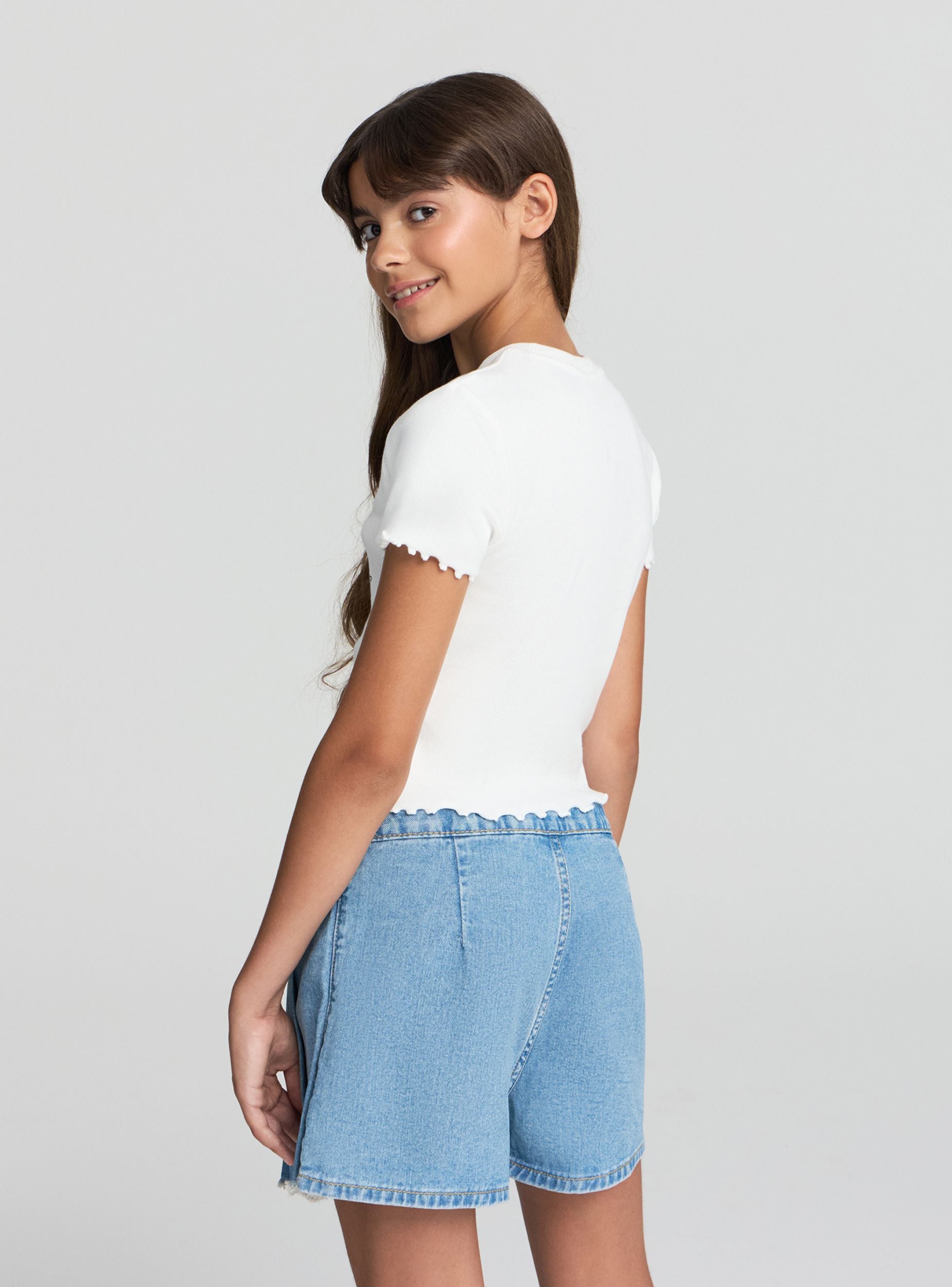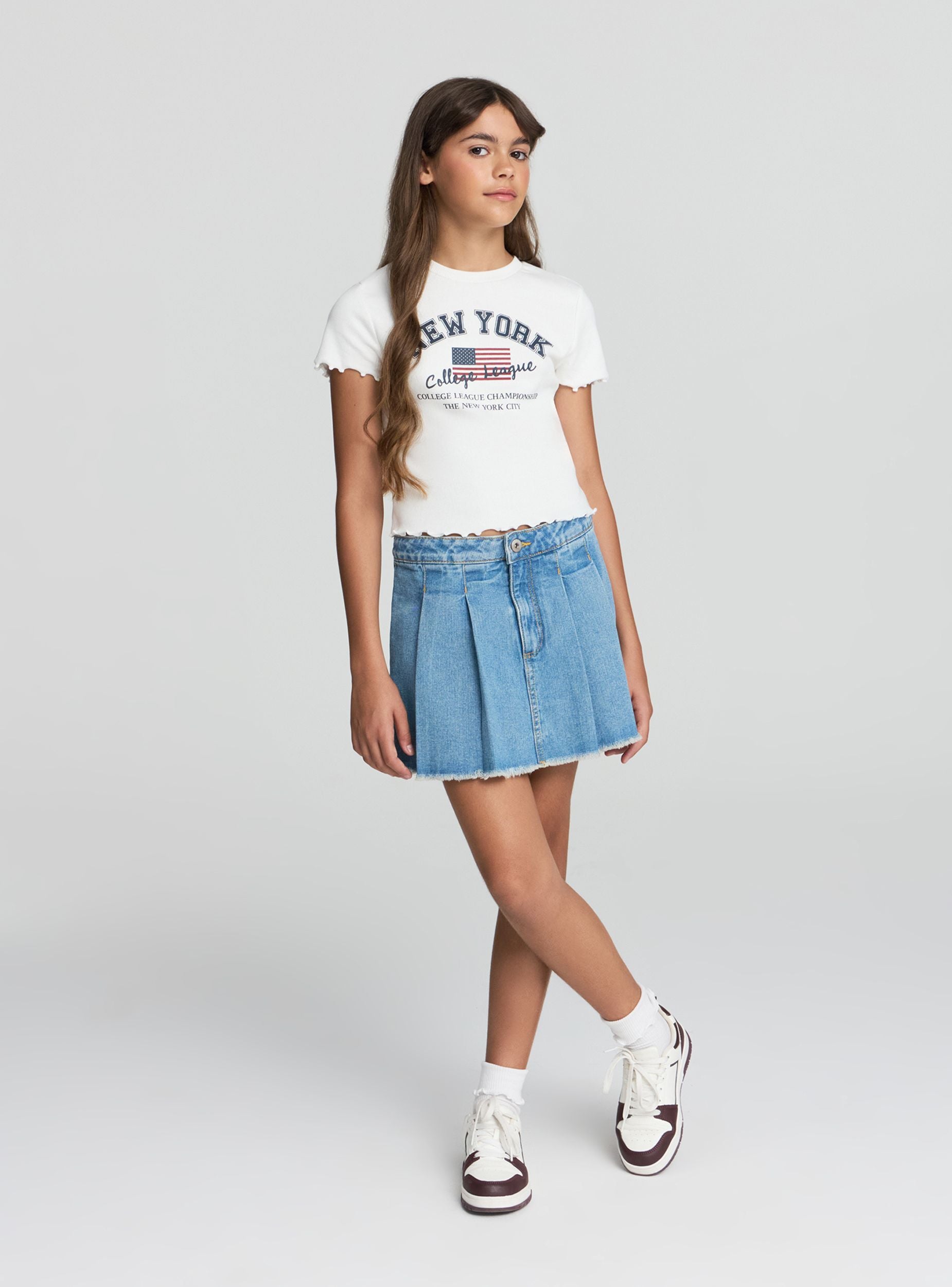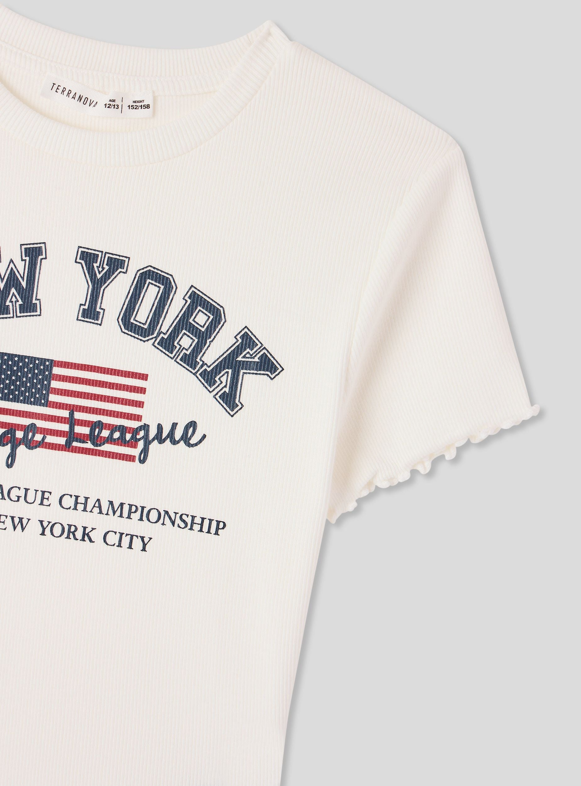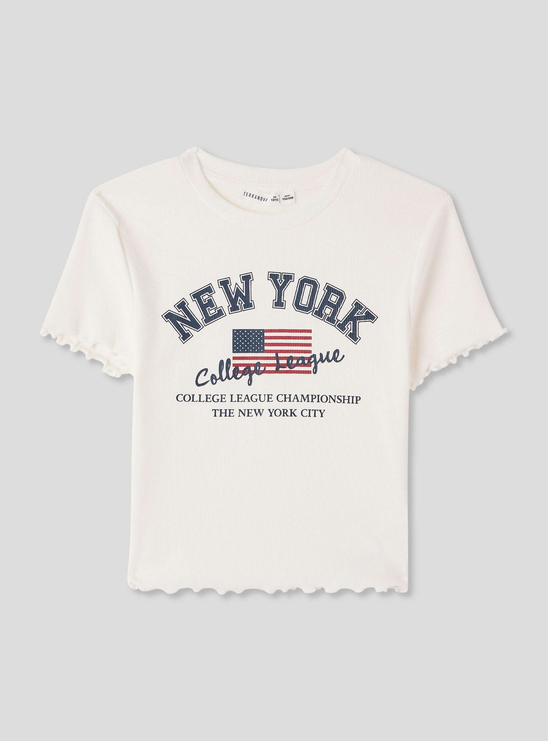Dievčenské tričko s crop strihom a prednou potlačou inšpirovanou New Yorkom. Okrúhly výstrih, krátke rukávy a vlnité lemy pre ženský nádych. Ideálne do školy alebo na voľný čas, ľahko sa kombinuje s džínsami, rifľovými sukňami alebo šortkami pre ležérny a mestský vzhľad. Mäkká rebrovaná tkanina.Detaily
