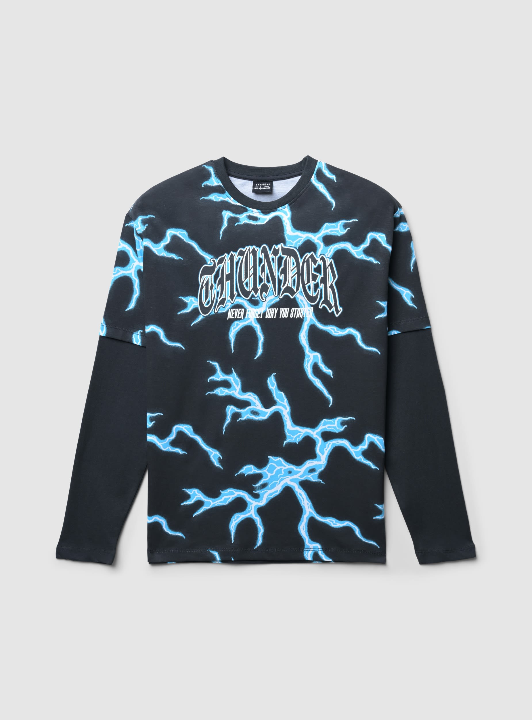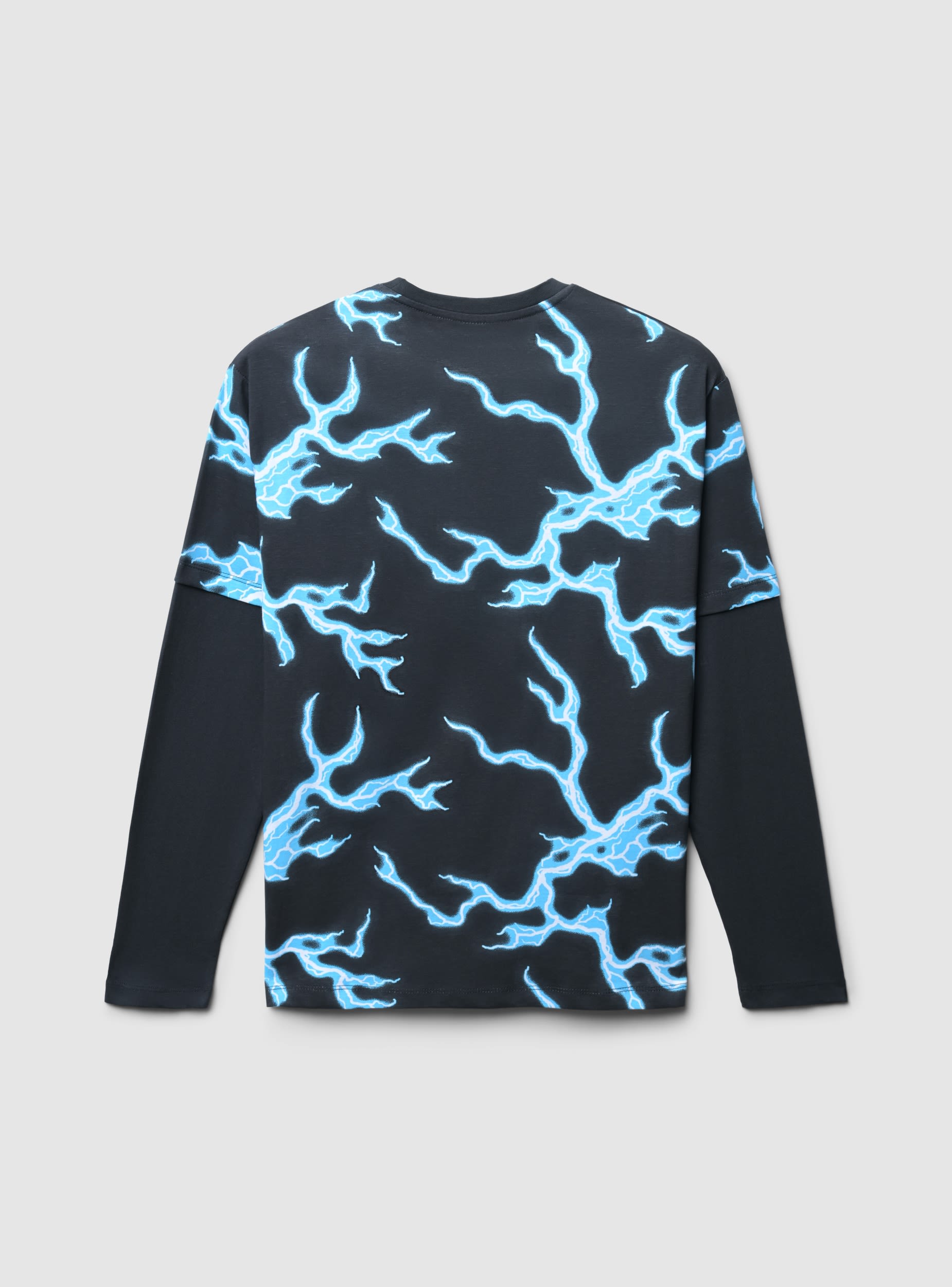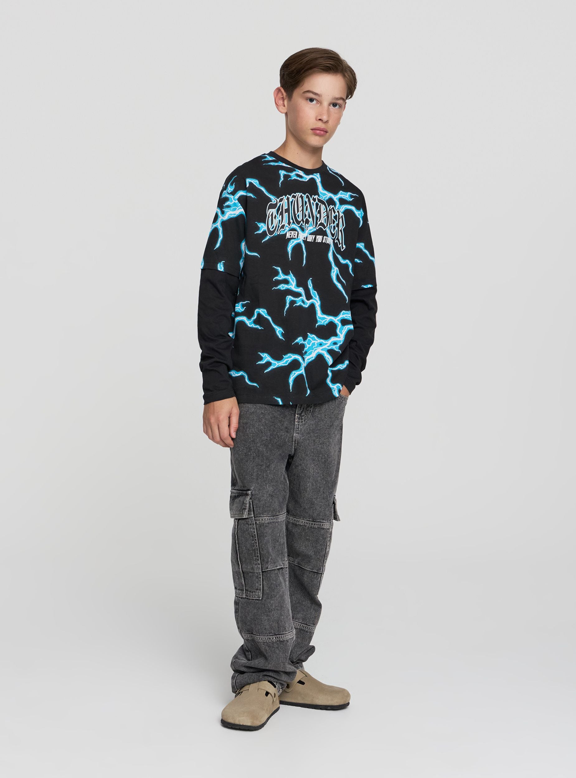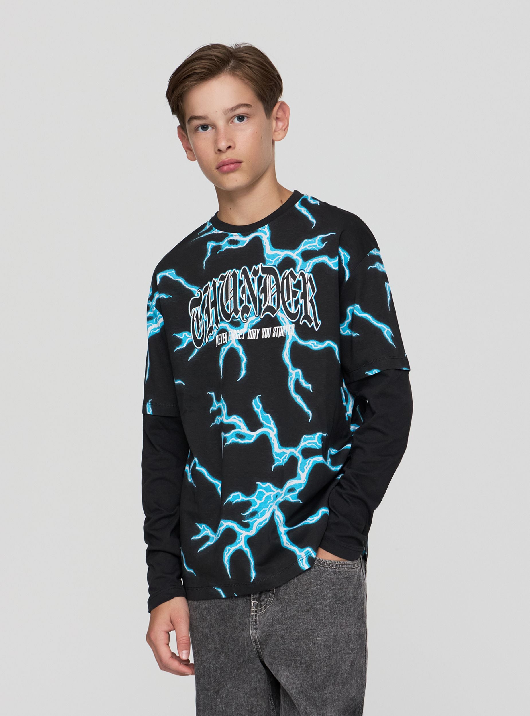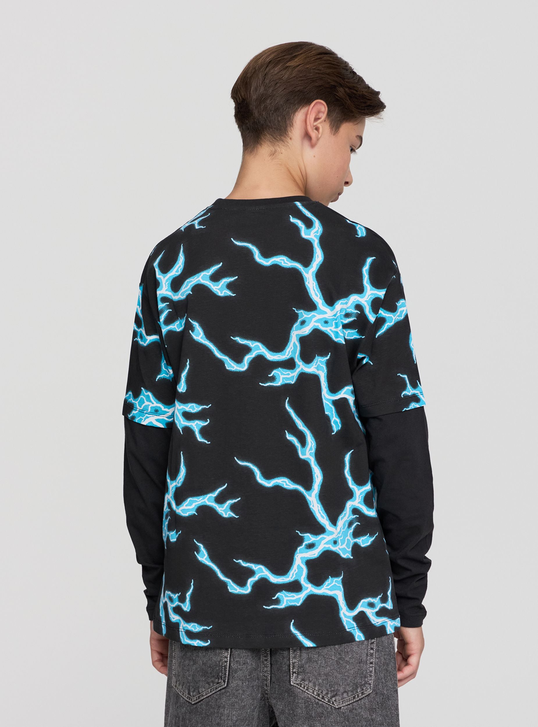 Detské tričko s dlhým rukávom s potlačou bleskov. Ideálne pre ležérny a moderný vzhľad, toto tričko vyniká pútavým dizajnom a pohodlným strihom. Perfektné na kombinovanie s džínsami alebo športovými nohavicami, vhodné na voľný čas a každodenné aktivity. Grafická potlač dodáva kúsku originálny nádych, vďaka čomu je jedinečné a štýlové.Detaily