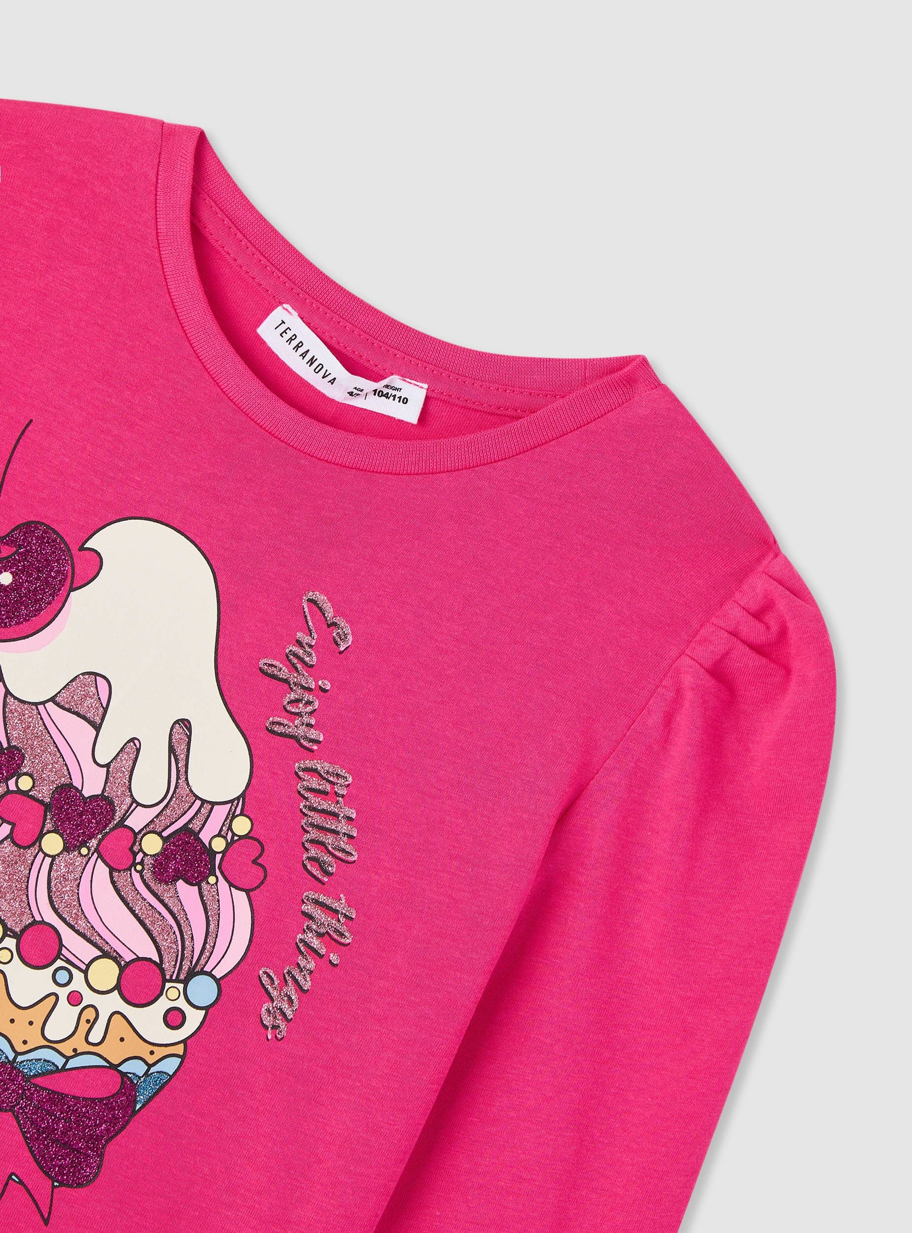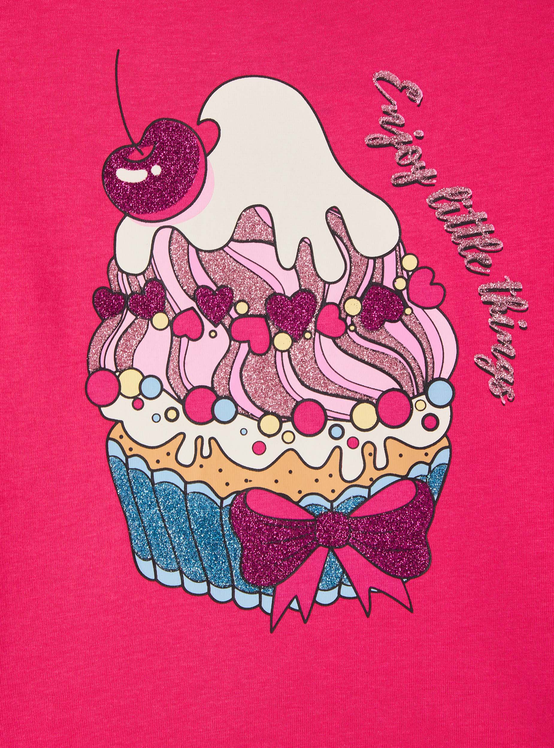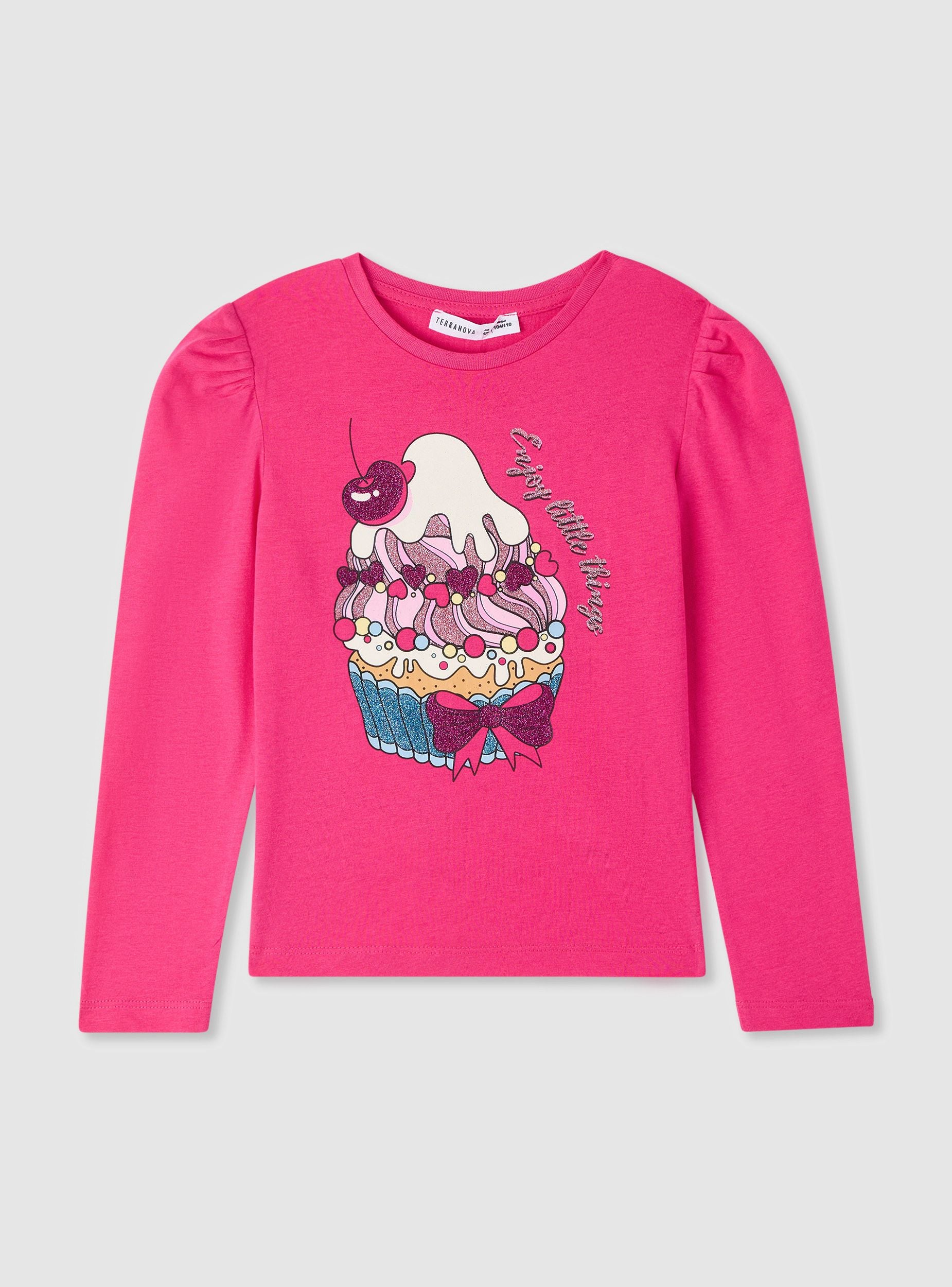 Dievčenské tričko s dlhým rukávom, s nariasením na ramenách a žiarivou potlačou cupcaku zdobeného trblietavými detailmi a nápisom „Enjoy little things“. Ideálne na ležérny, zábavný a farebný vzhľad, dokonale sa hodí k džínsom alebo športovým nohaviciam pre pohodlný a veselý outfit. Regular fit a atraktívny dizajn ho robia ideálnym na voľný čas a herné dni.Detaily