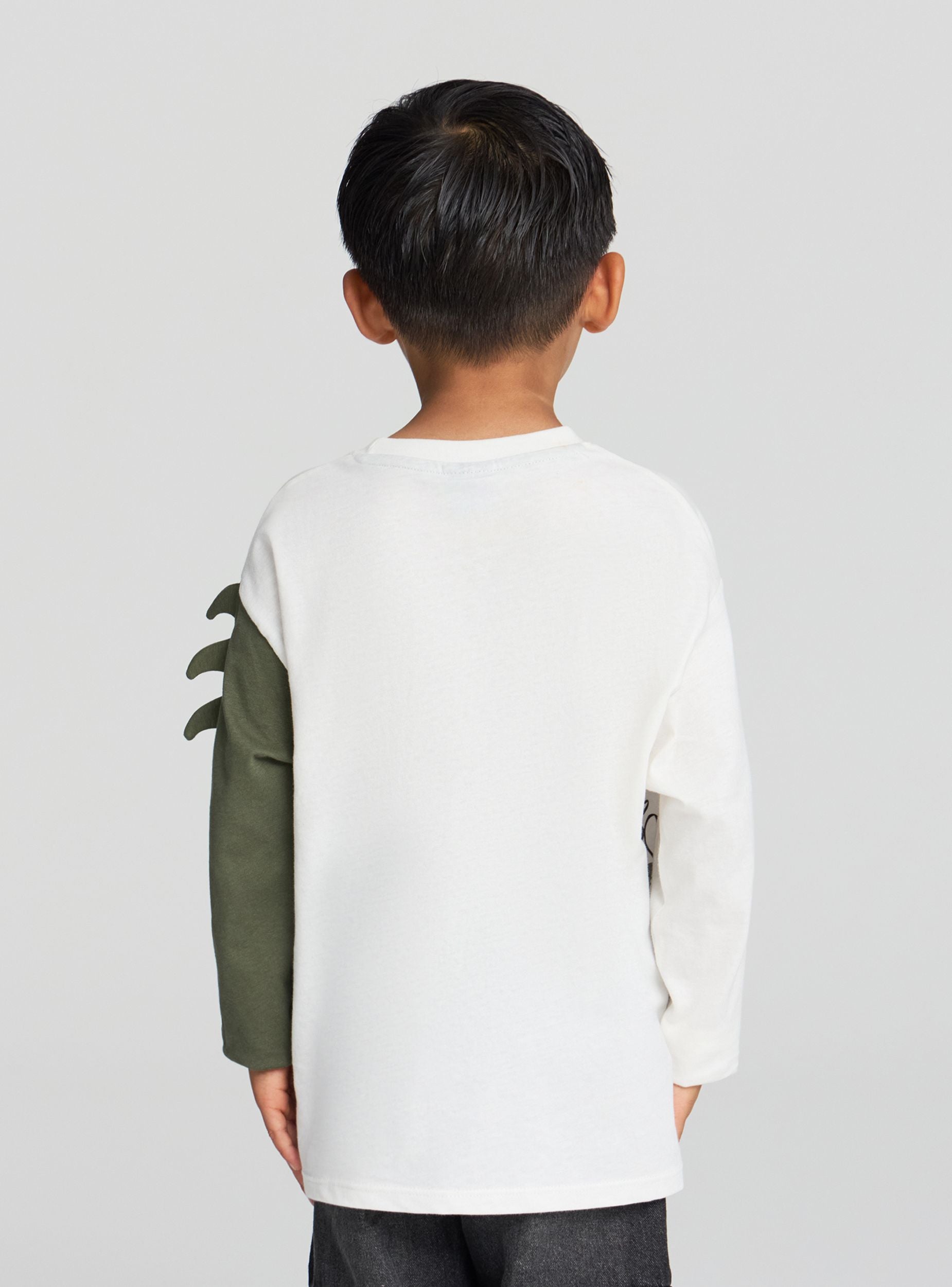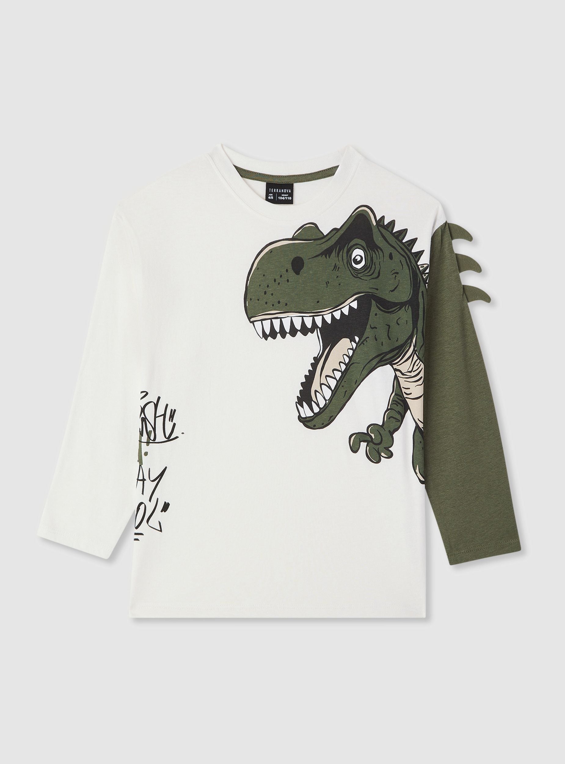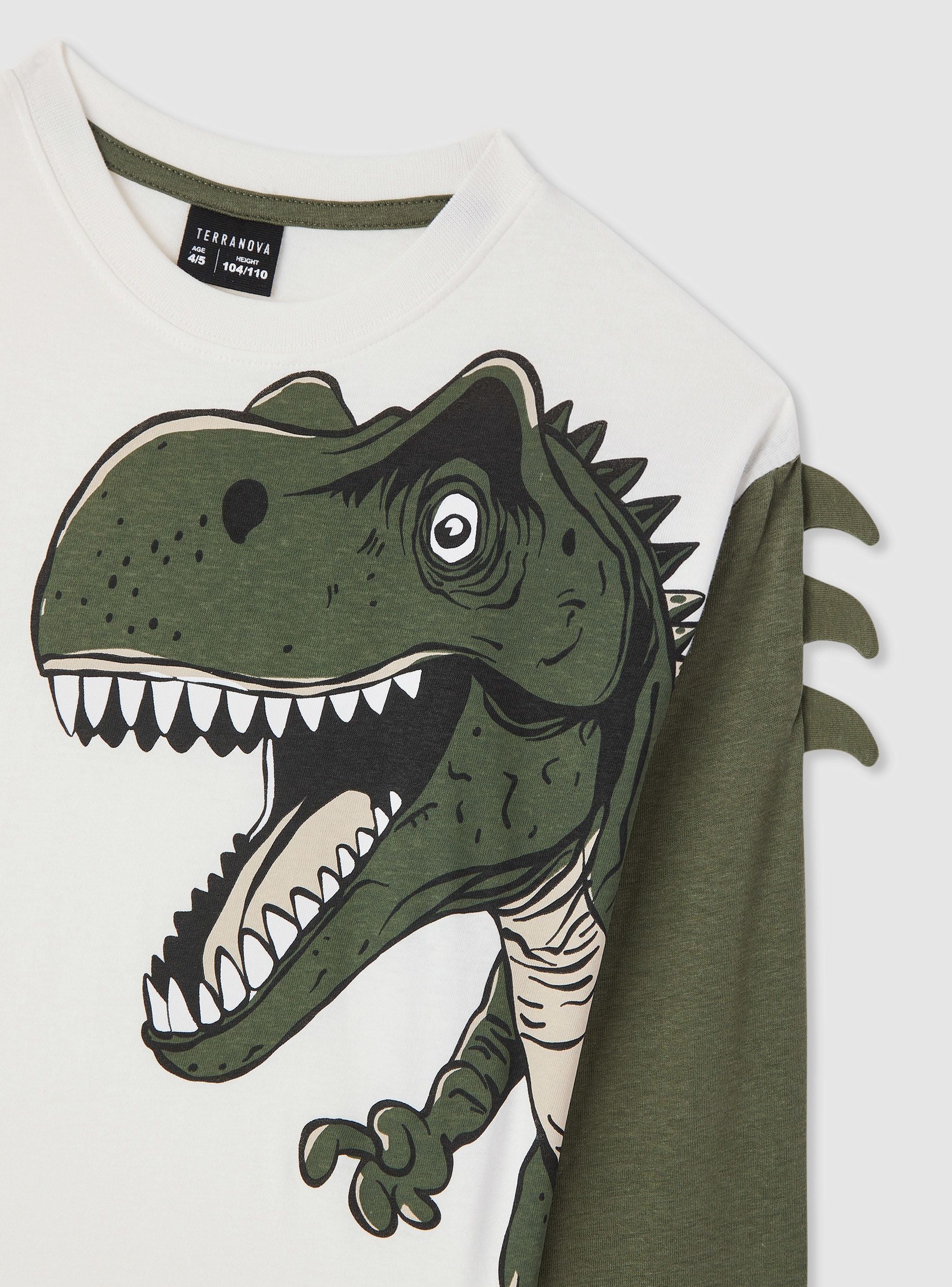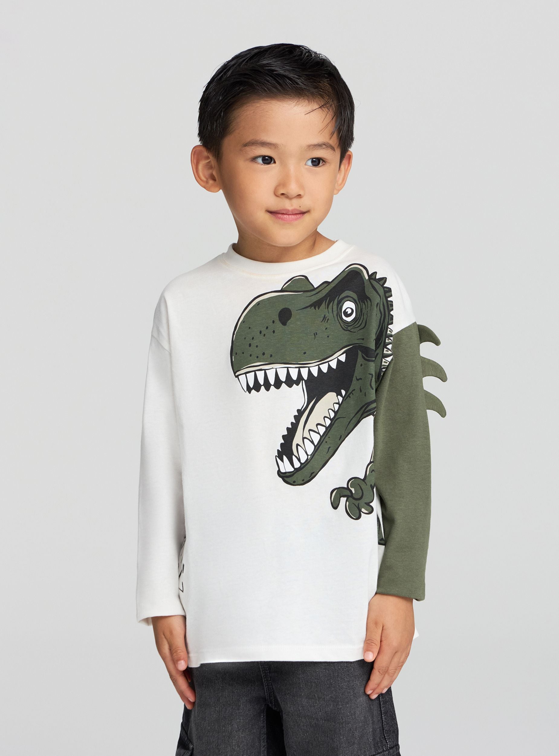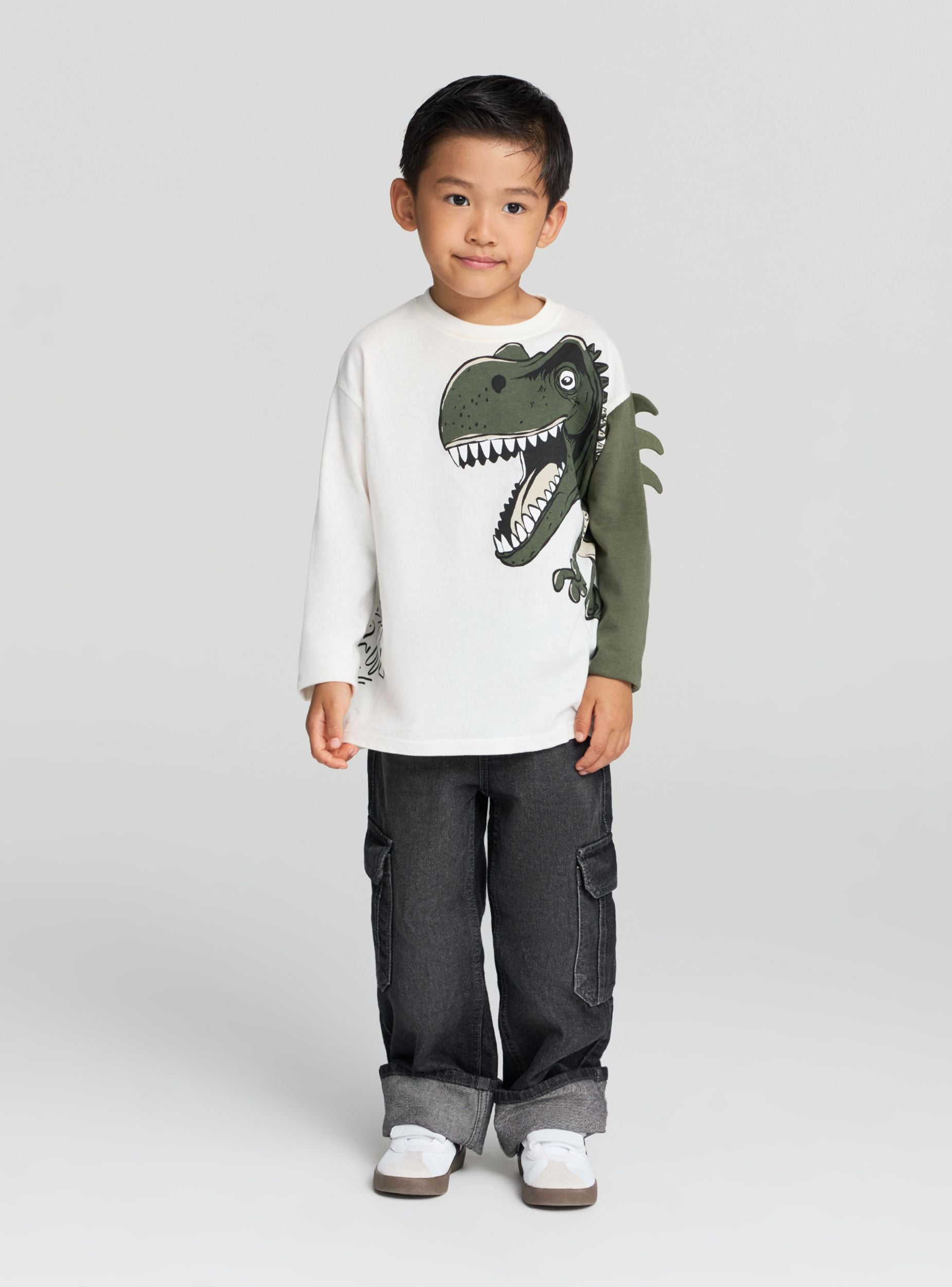 Detská dlhá rukávová tričko s výraznou grafikou, ideálna pre malých objaviteľov. Hlavným prvkom dizajnu je veľký dinosaurom vytlačený na prednej strane, ktorý sa rozširuje až na rukáv a vytvára hravý a originálny trojrozmerný efekt. Detaily s hrebeňmi na ramene pridávajú prekvapivý dotyk, ktorý stimuluje predstavivosť. Komfortný strih a okrúhly výstrih robia z nej ideálnu voľbu na každodenné nosenie, od školy po voľný čas. Perfektne sa kombinuje s džínami, teplákmi alebo cargo nohavicami pre dynamický a zábavný vzhľad.Detaily