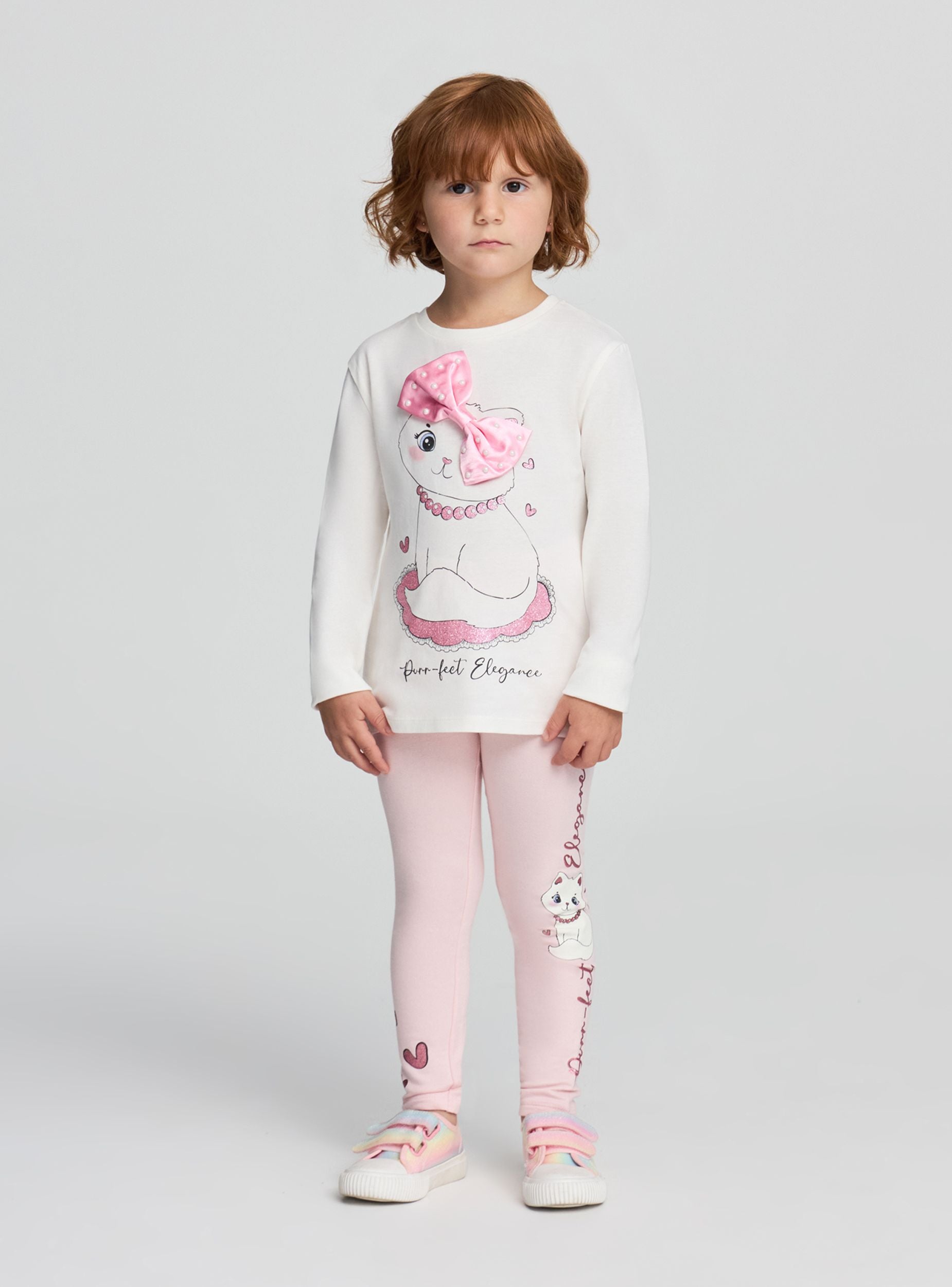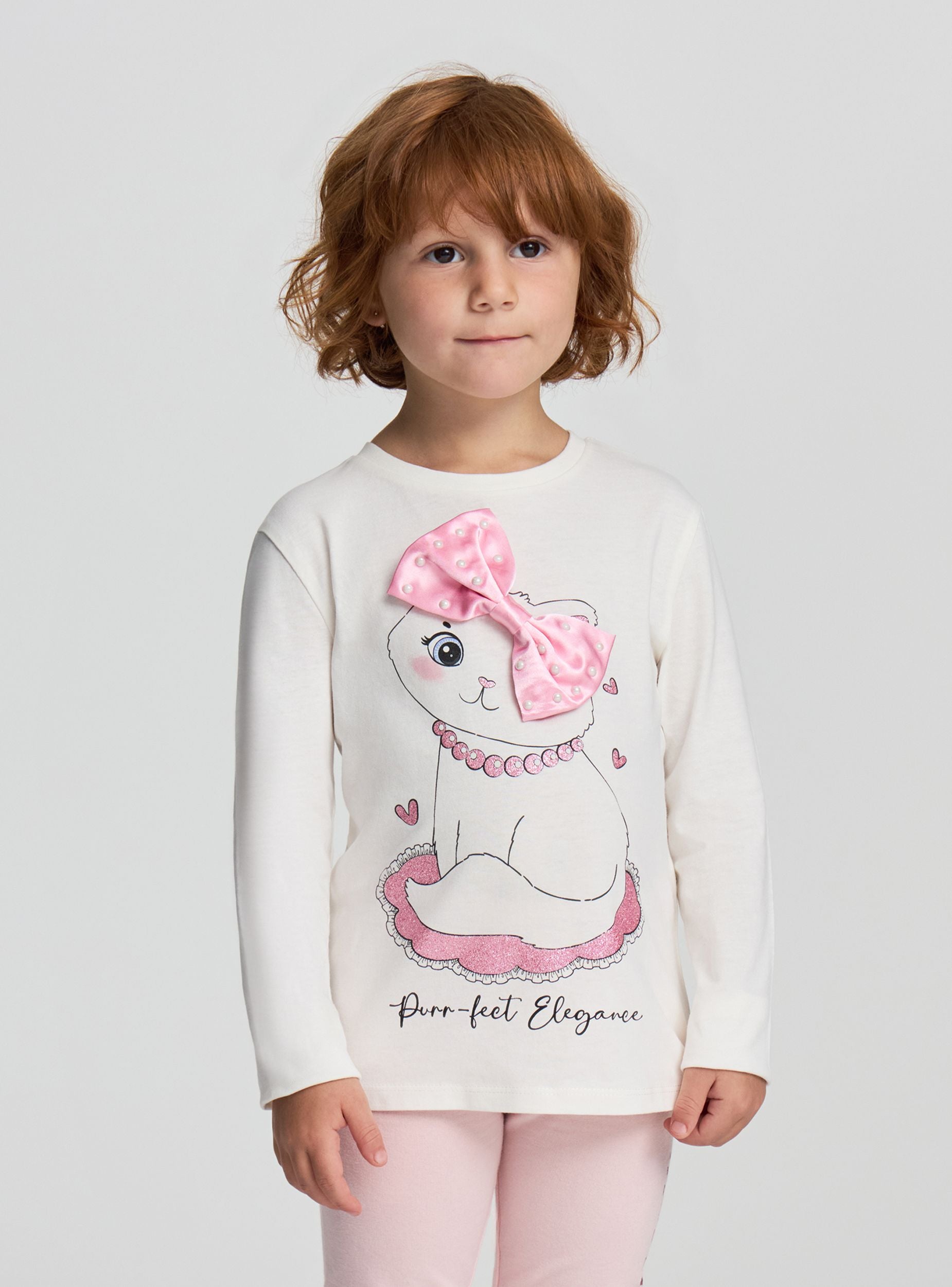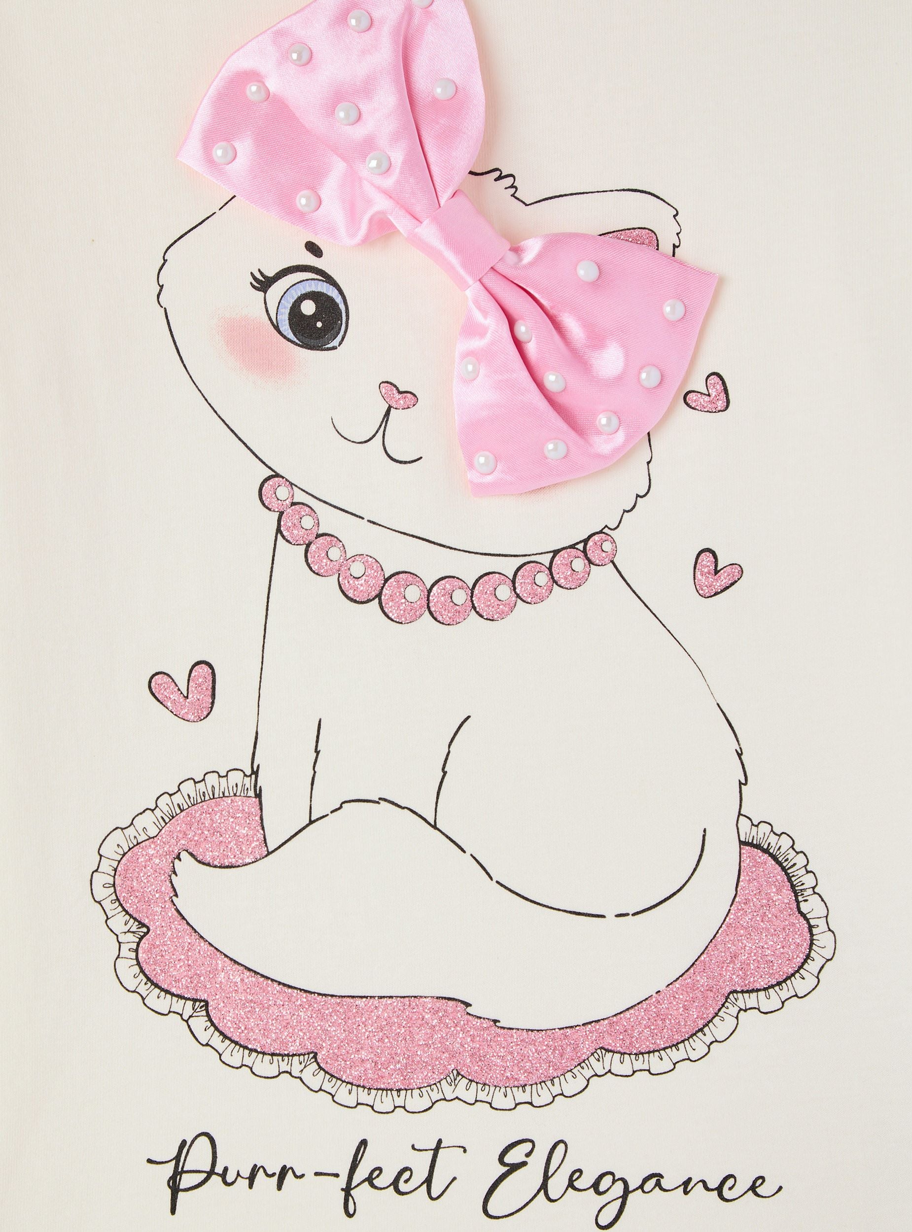 Dievčenské tričko s dlhými rukávmi, ideálne na ležérny a pohodlný vzhľad. Má dizajn s potlačou mačičky a dekoratívnymi aplikáciami s mašličkou a perličkami, ktoré pridávajú hravý a originálny dotyk. Perfektné na kombinovanie s džínsami alebo športovými nohavicami na každodenný outfit. Strih je pohodlný, vhodný na školské aktivity alebo voľnočasové chvíle.Detaily