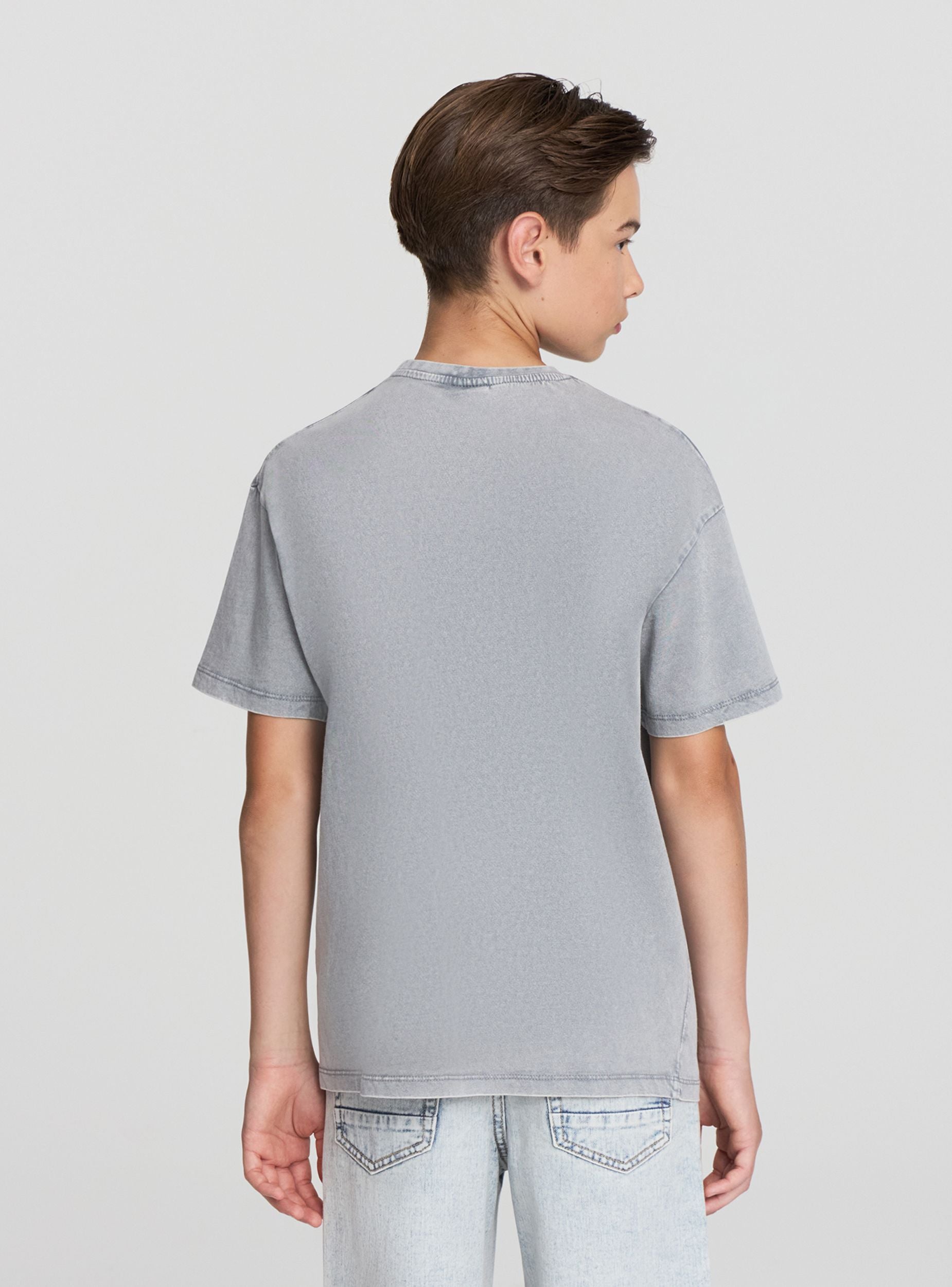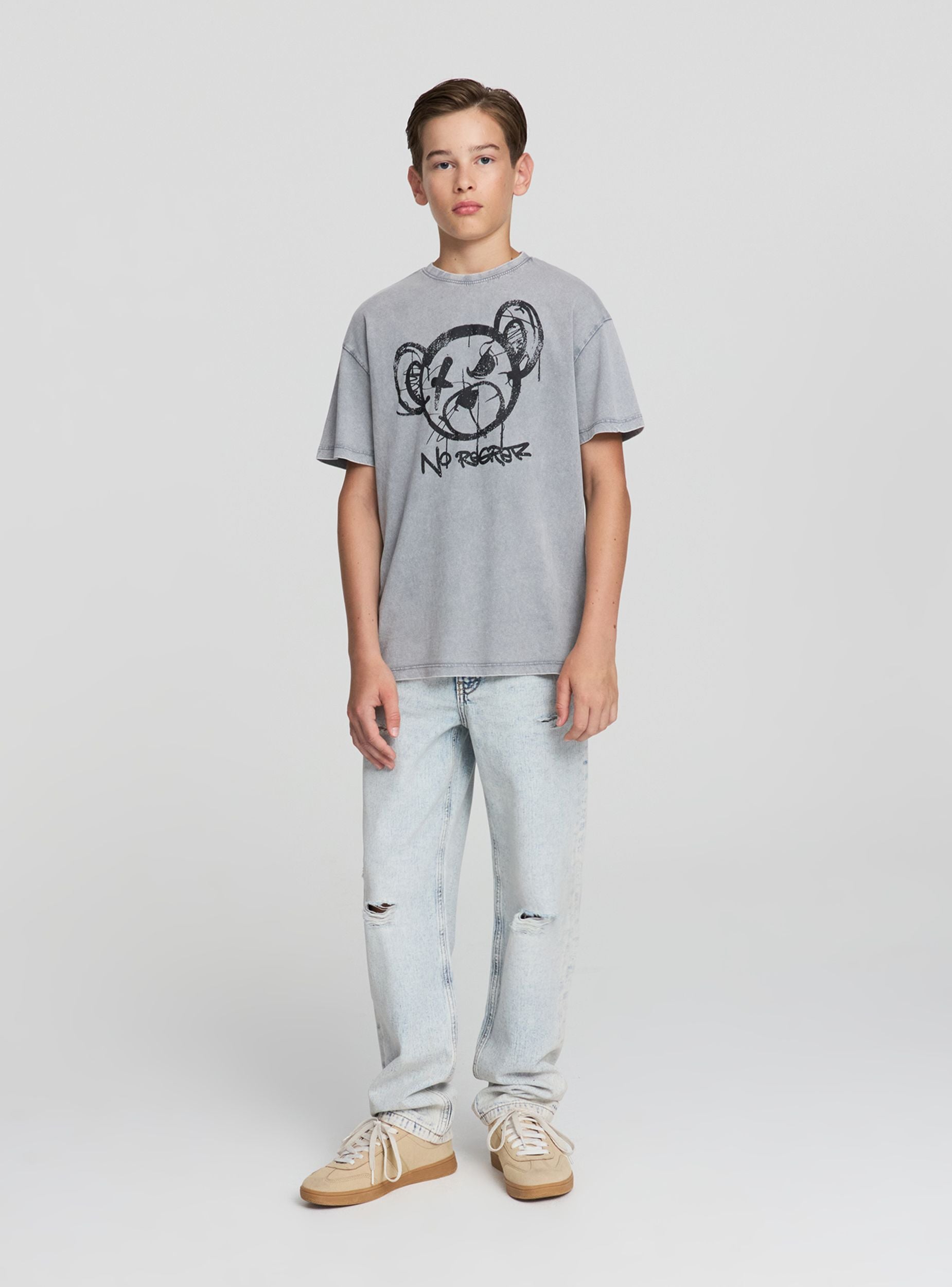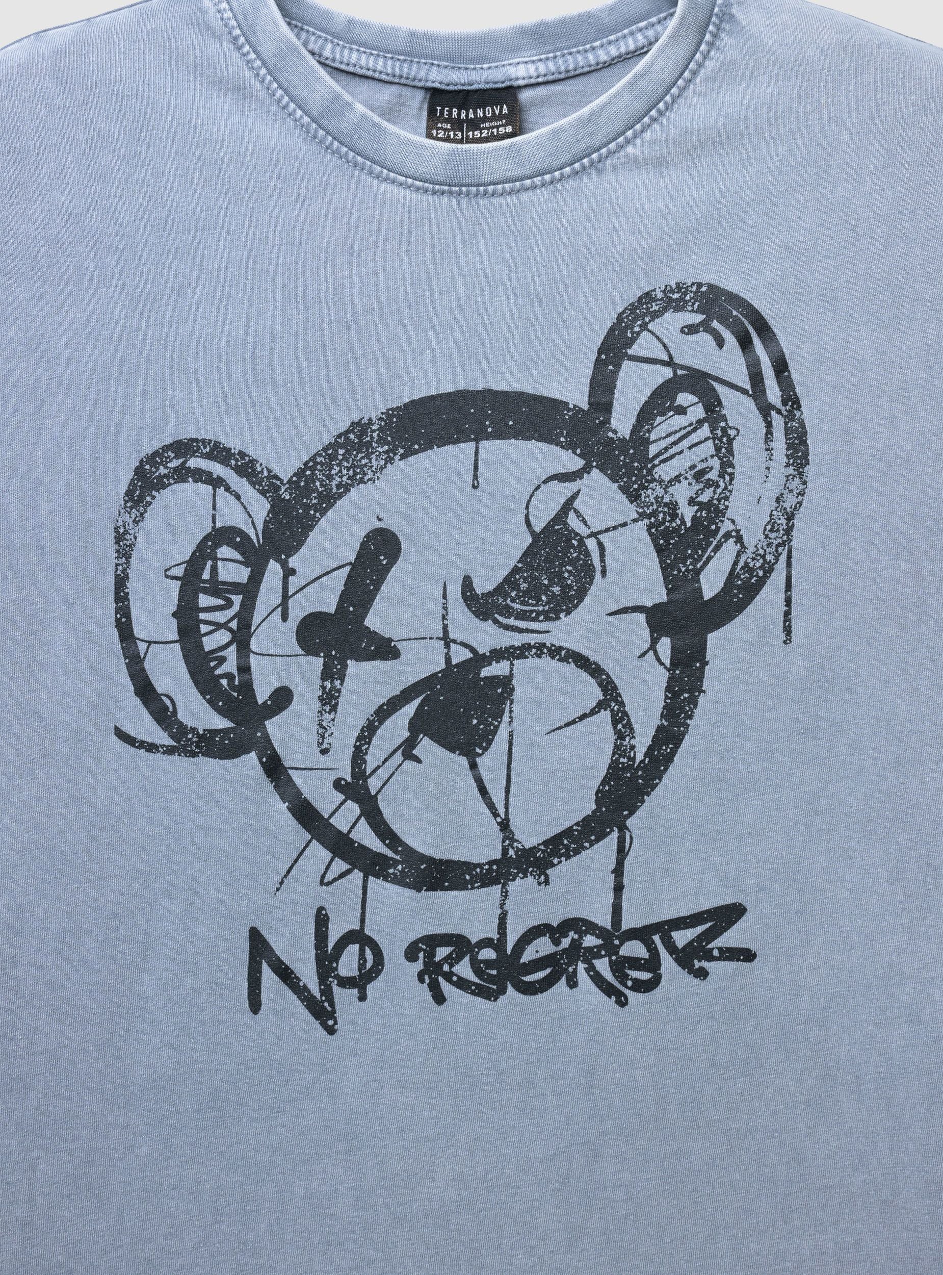 Chlapčenské tričko acid wash s grafickou potlačou štýlizovaného medveďa a nápisom „No Regrets“. Má pohodlný strih a krátke rukávy, ideálne pre ležérny a moderný vzhľad. Perfektné na kombinovanie s džínsami alebo šortkami pre neformálny outfit. Potlač pridáva dotyk originality a štýlu, vďaka čomu je vhodné na rôzne príležitosti.Detaily