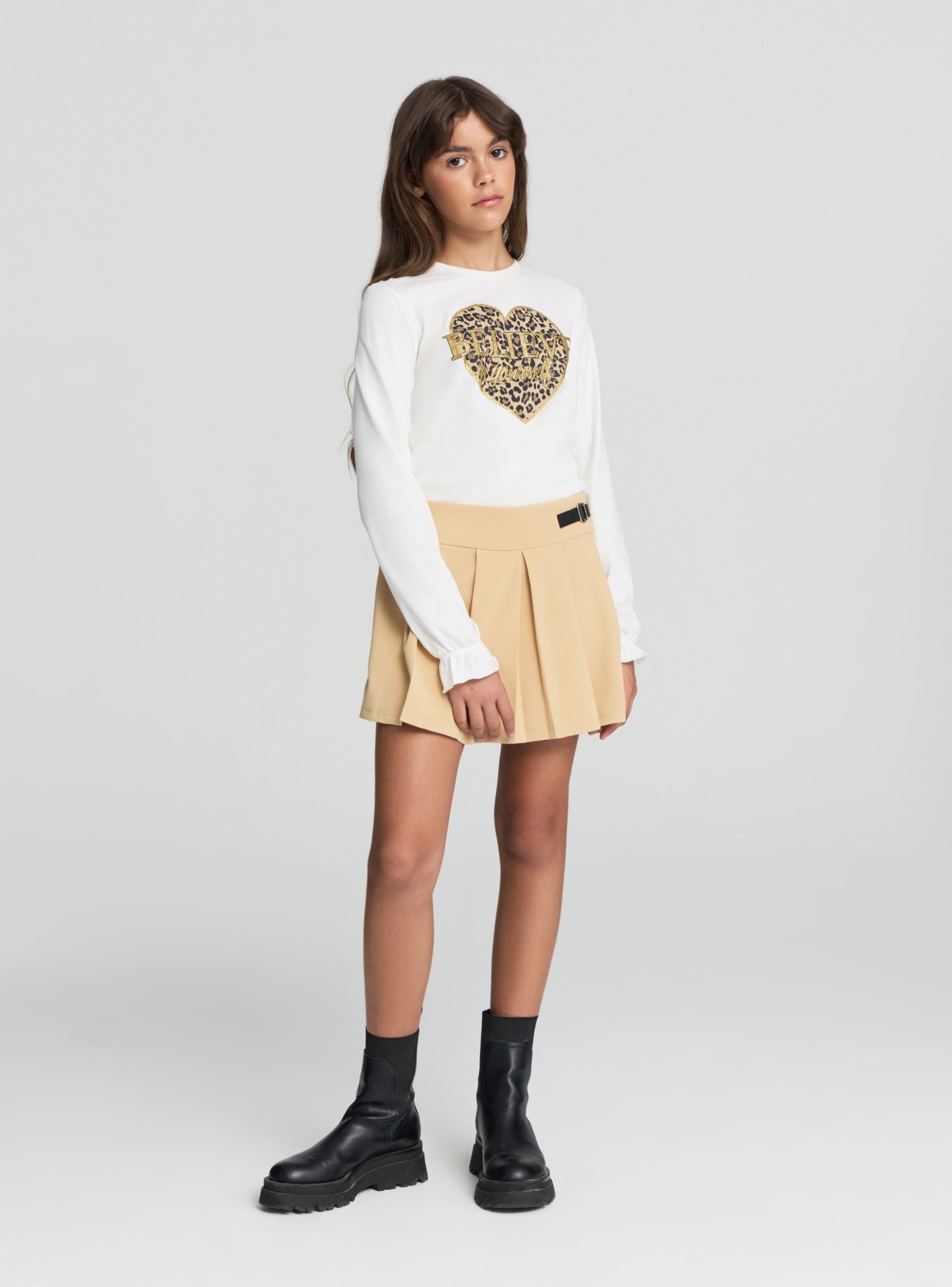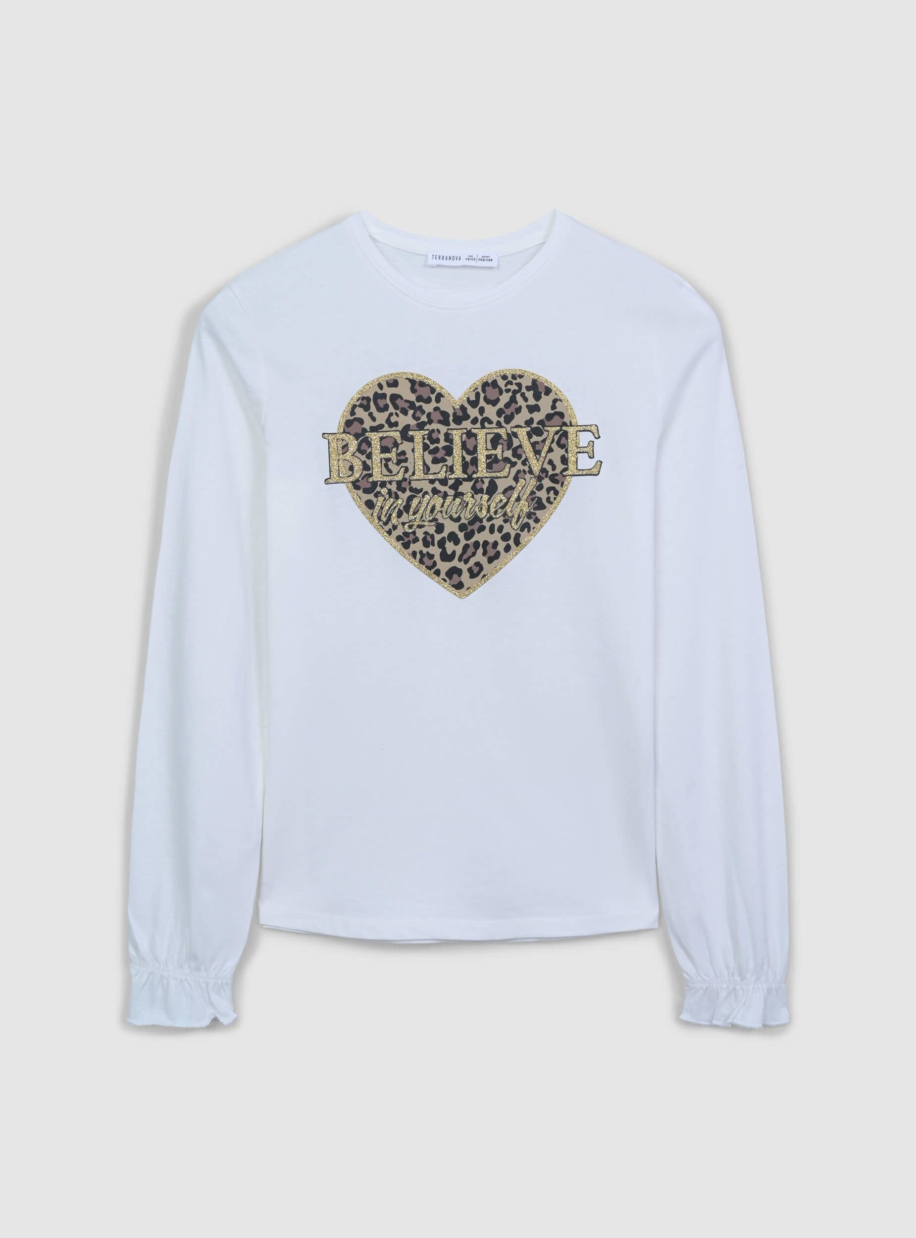 Dievčenská dlhá tričko ideálne pre ležérny a módny vzhľad. Perfektné na voľný čas, ľahko sa kombinuje s džínsami alebo športovými nohavicami pre pohodlný a univerzálny outfit. Dizajn s potlačou srdca v zvieracom vzore s trblietkami a nápismi pridáva nádych originality, zatiaľ čo pravidelný strih zaručuje pohodlie počas celého dňa. Nevyhnutný kúsok na obohatenie šatníka so štýlom.