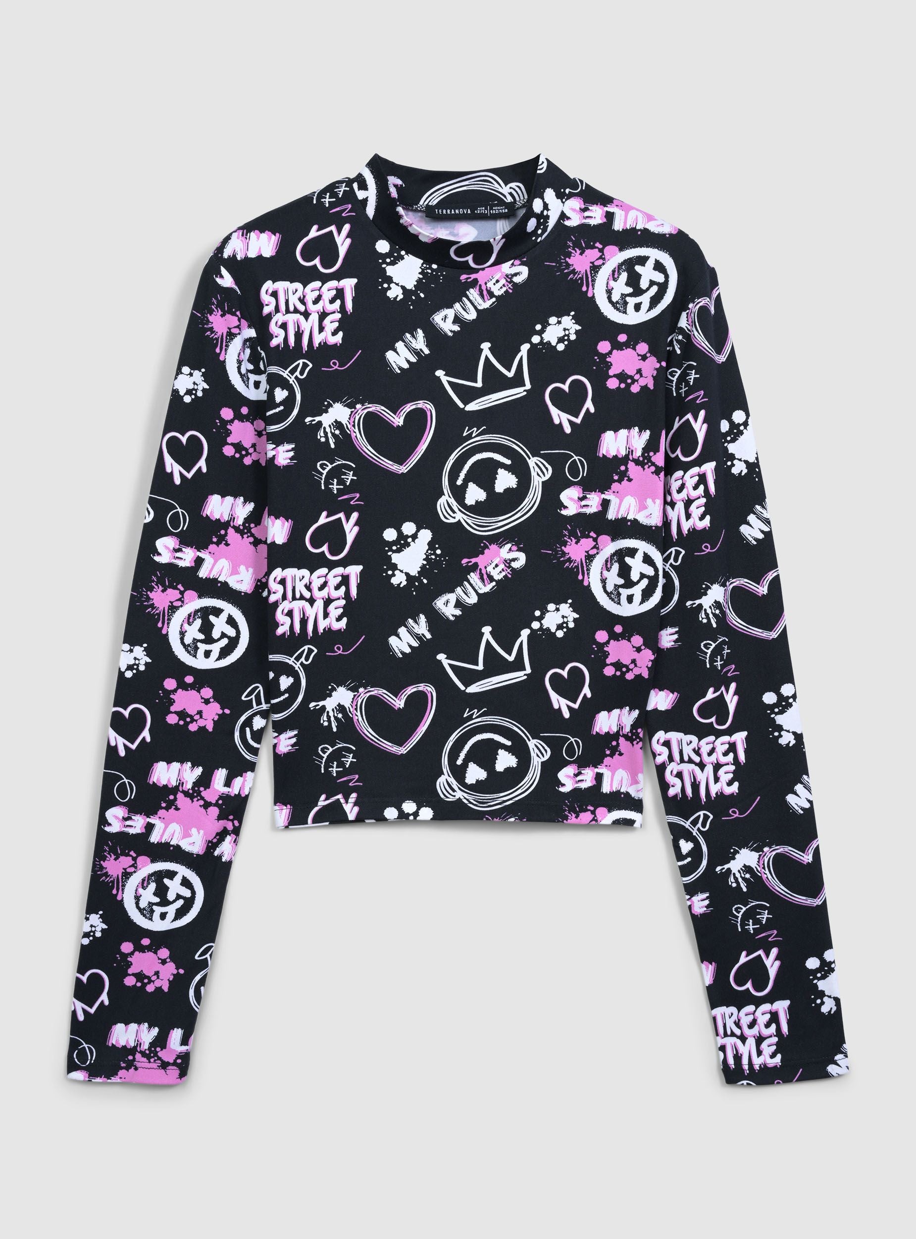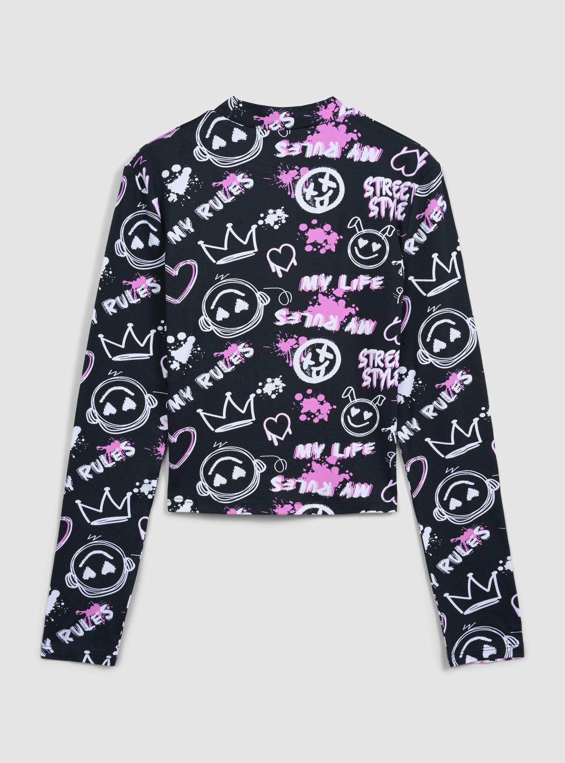 Dievčenské tričko s dlhými rukávmi a graffiti potlačou. Ideálne pre ležérny a moderný vzhľad, toto tričko vyniká pútavým dizajnom a pohodlným strihom vďaka elastickému materiálu. Perfektné na kombinovanie s džínsami alebo športovými nohavicami, hodí sa na rôzne neformálne príležitosti. Vysoký golier pridáva jedinečný štýlový prvok, zatiaľ čo živá potlač robí z tohto kúsku originálny a módny odev.