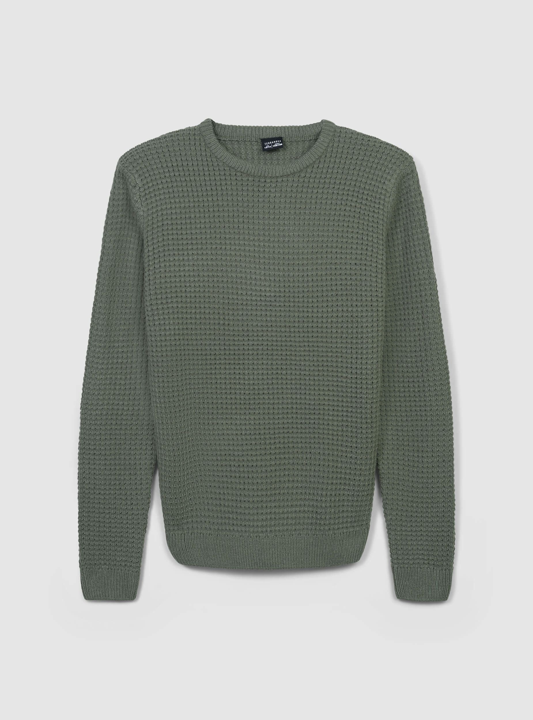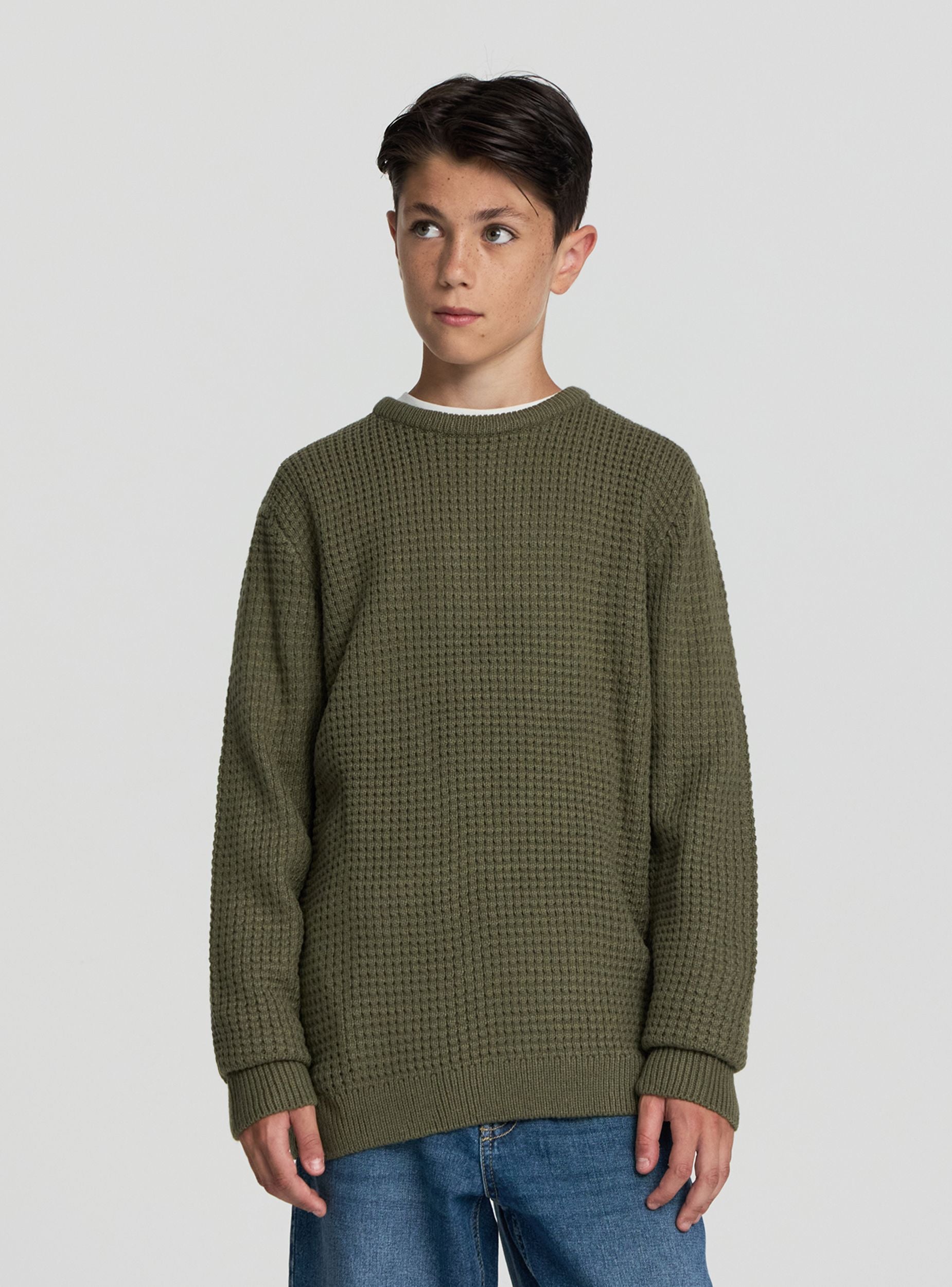 Detský sveter ideálny na chladnejšie obdobie, charakterizovaný textúrou ryžovej zrnitosti, ktorá mu dodáva moderný a všestranný vzhľad. Model má okrúhly výstrih, dlhé rukávy a rebrované manžety, čím ponúka pohodlie a praktickosť na každodenné nosenie. Perfektný na kombinovanie s džínsami alebo chino nohavicami pre ležérny vzhľad vhodný do školy alebo na voľný čas. Jednofarebný dizajn.