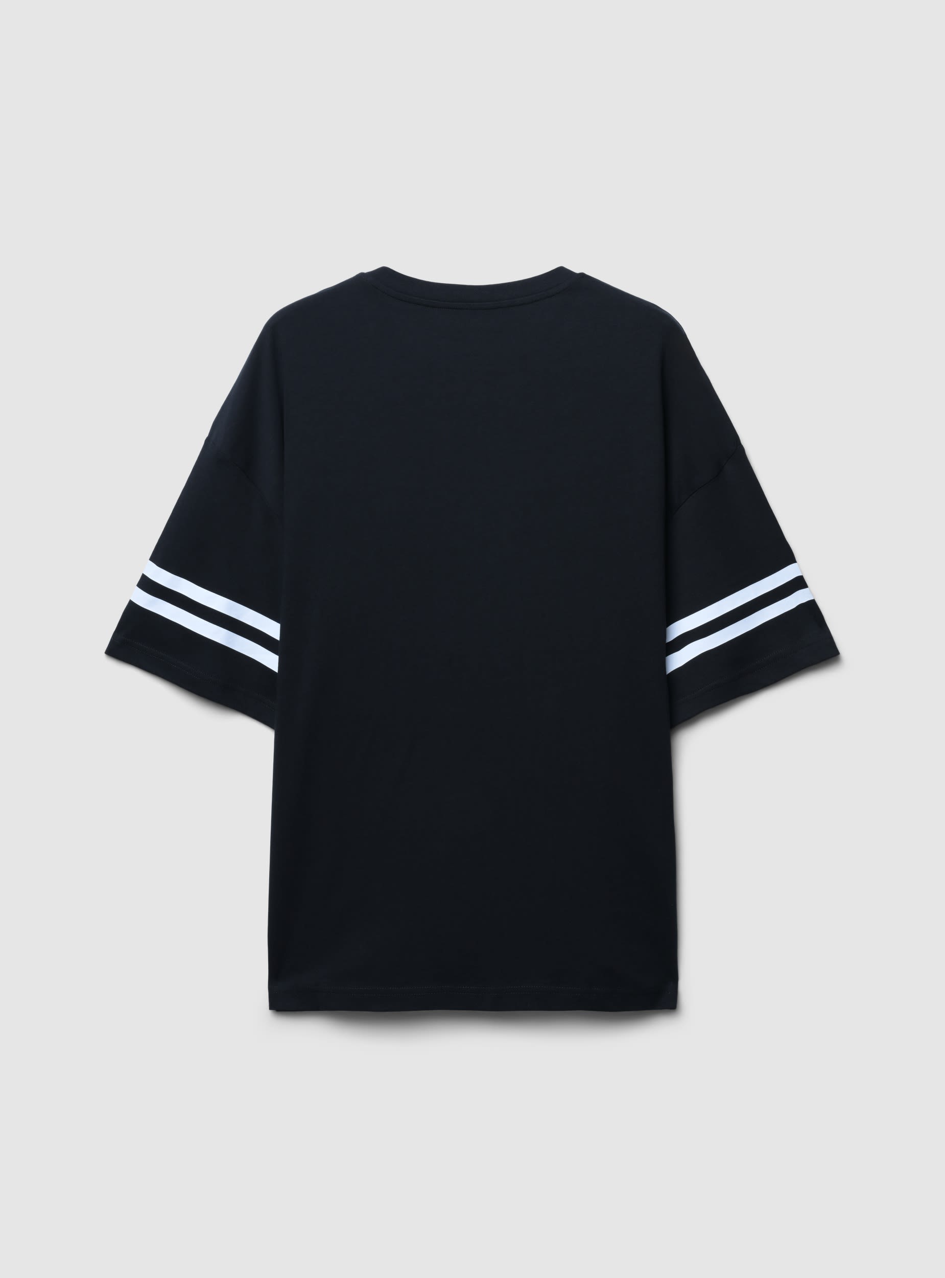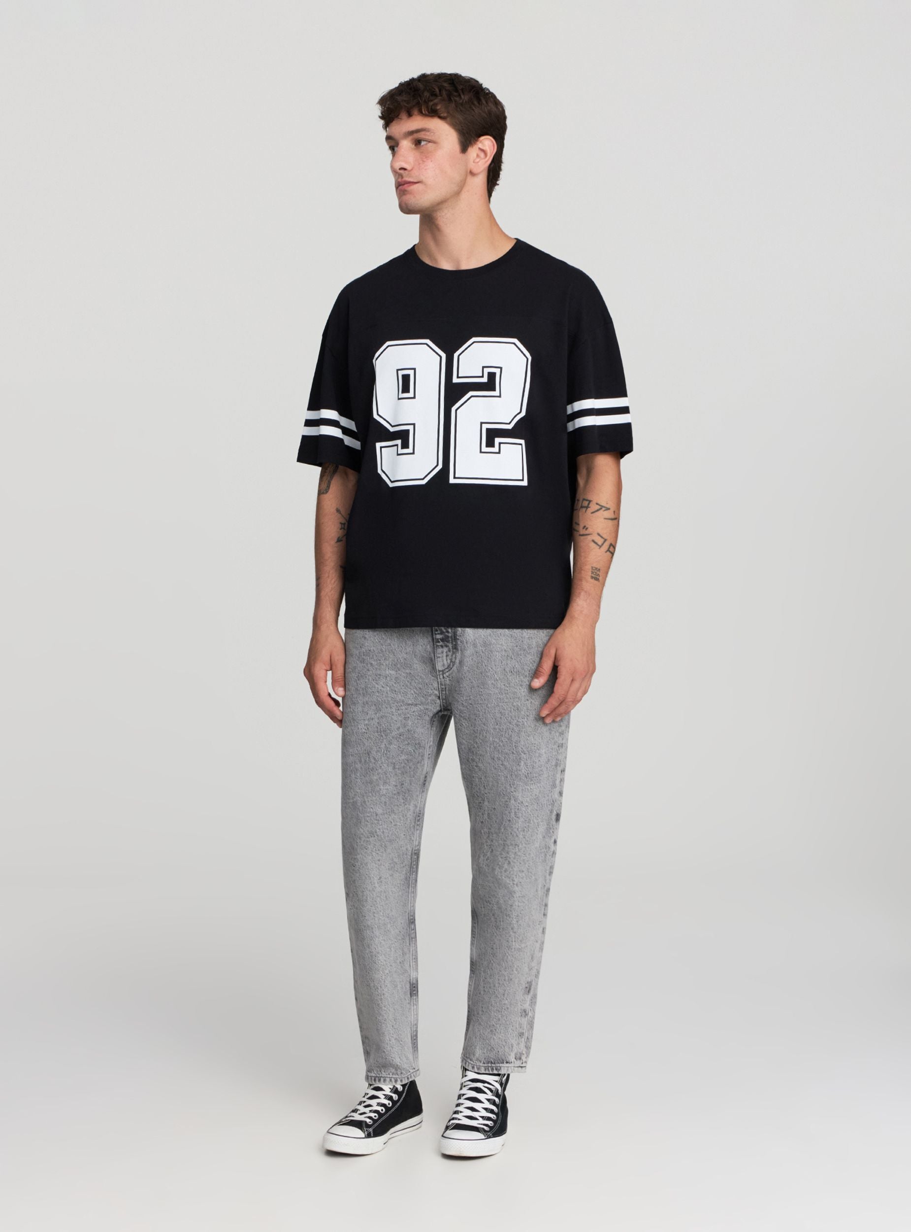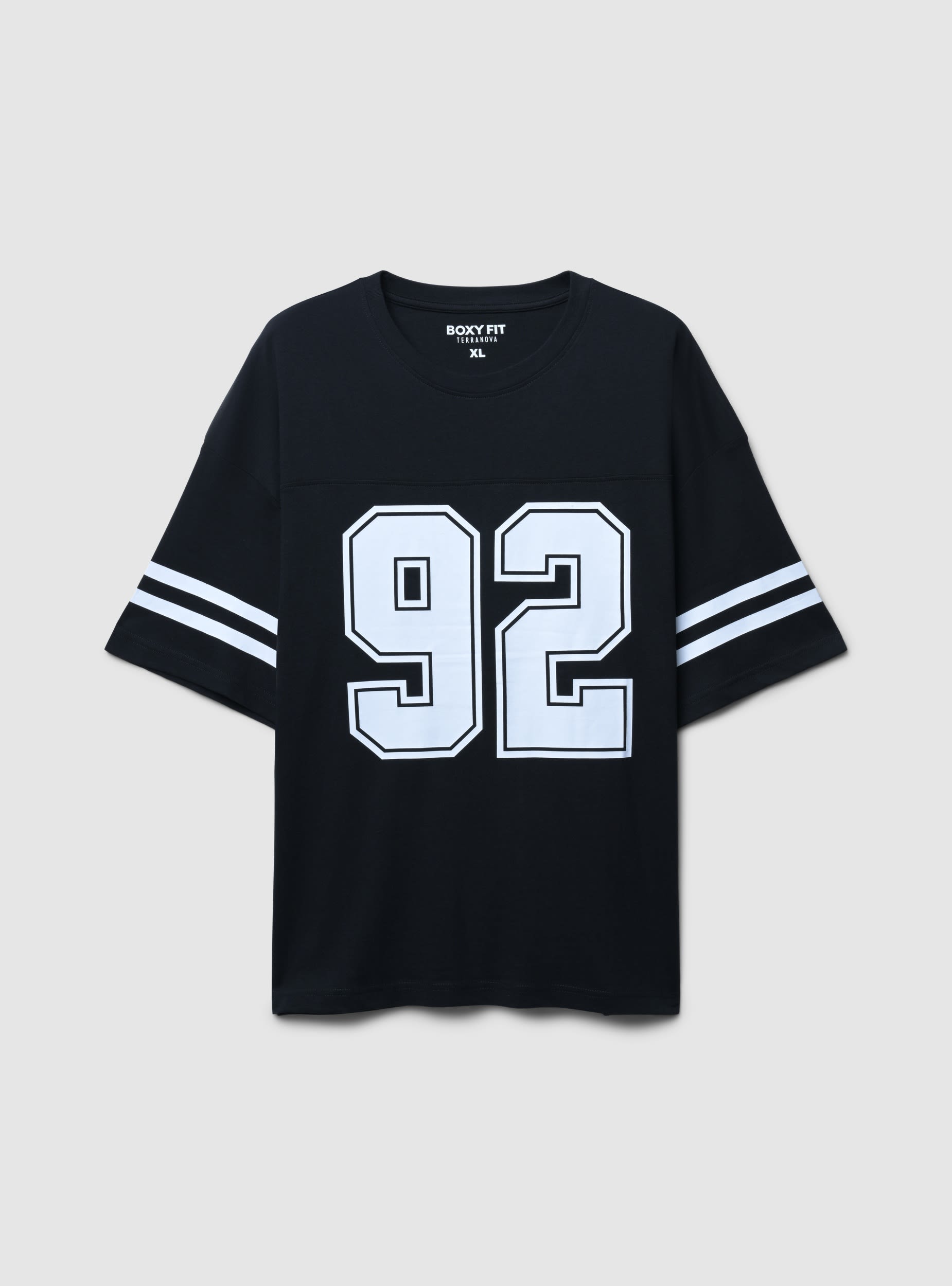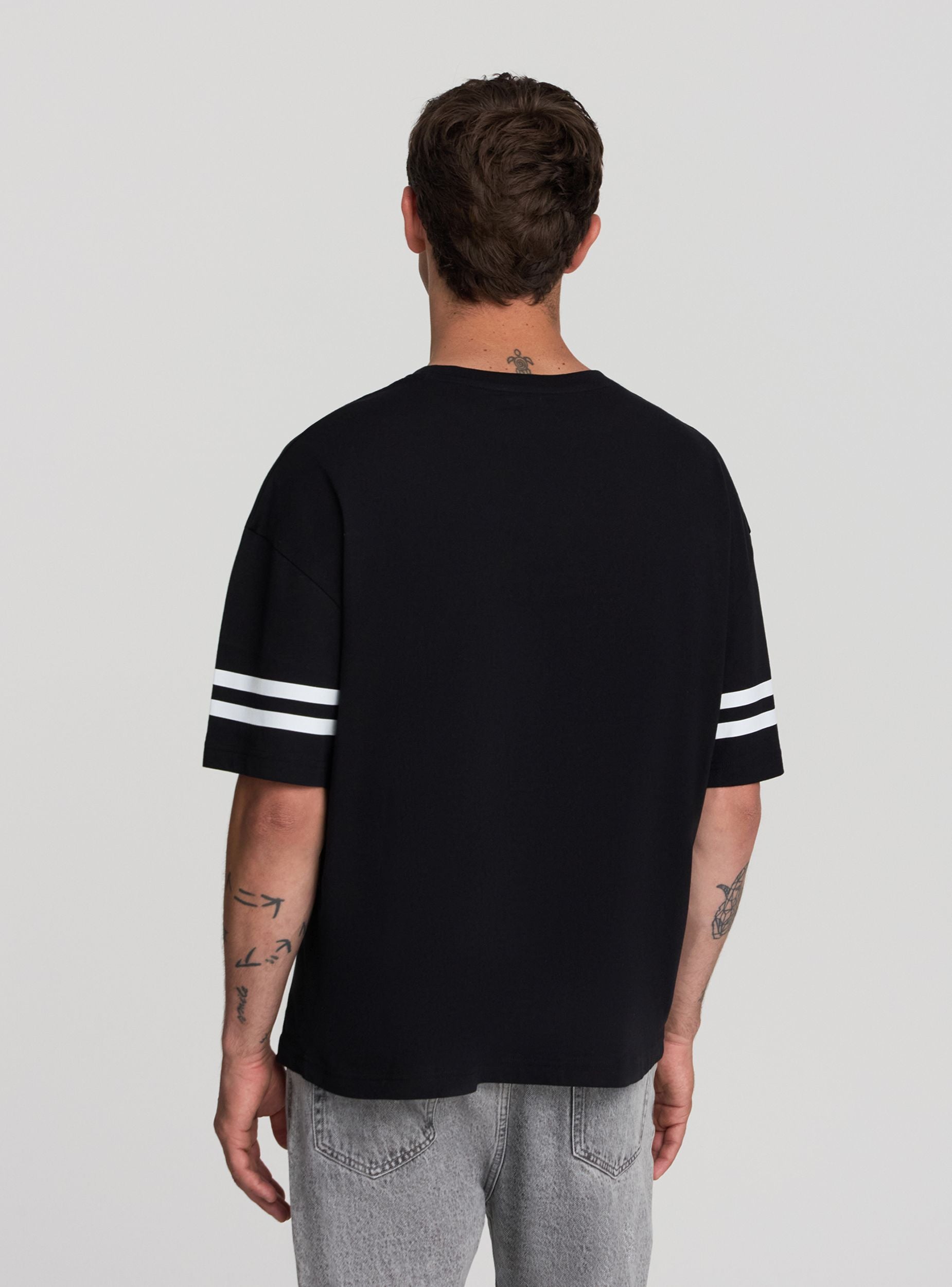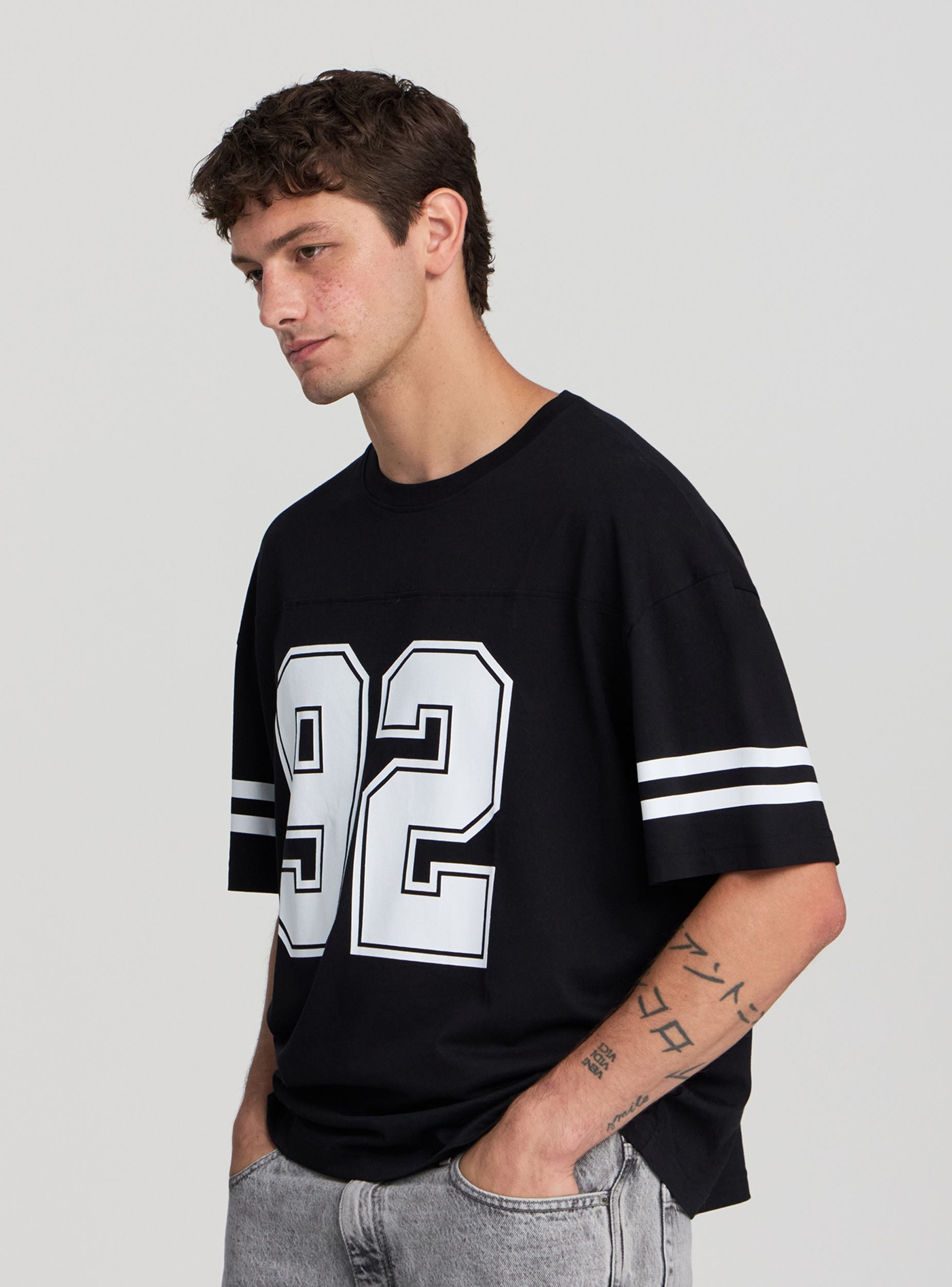 Pánske tričko s voľným strihom a športovým dizajnom. Na prednej strane má číselnú potlač a pruhované detaily na krátkych rukávoch. Ideálne pre ležérny a dynamický vzhľad, perfektné na kombinovanie s džínsami alebo športovými nohavicami pre pohodlný a štýlový outfit.