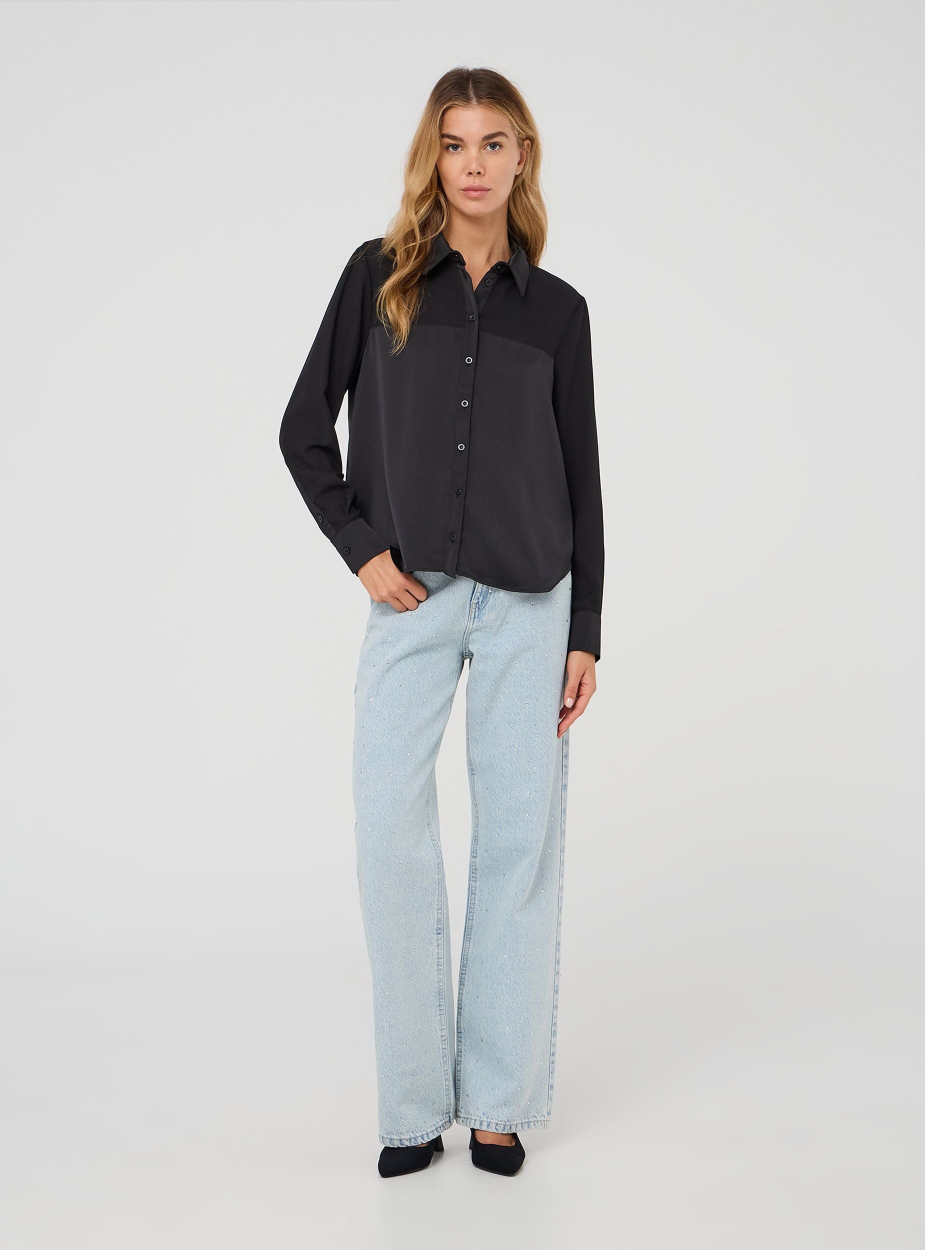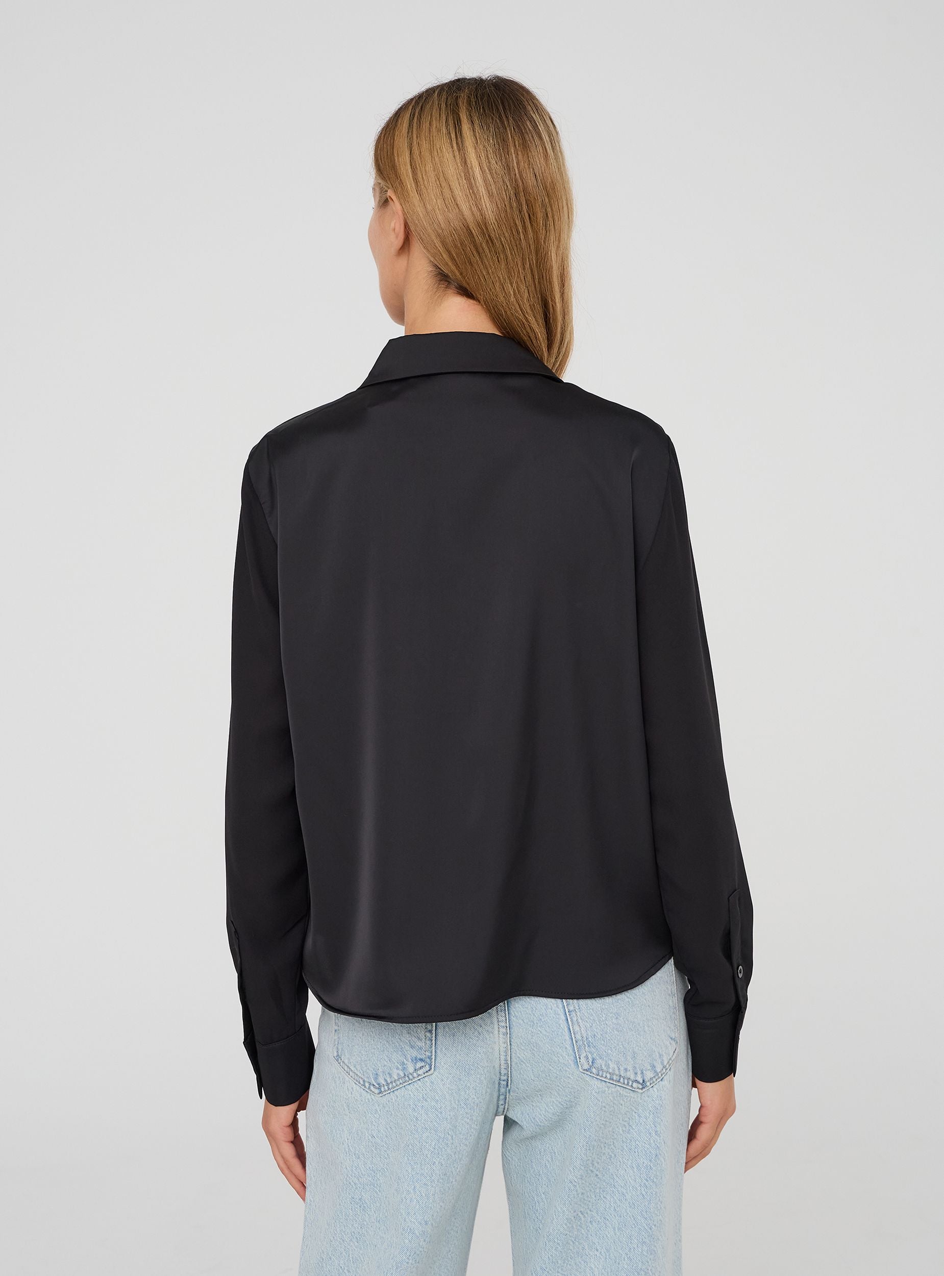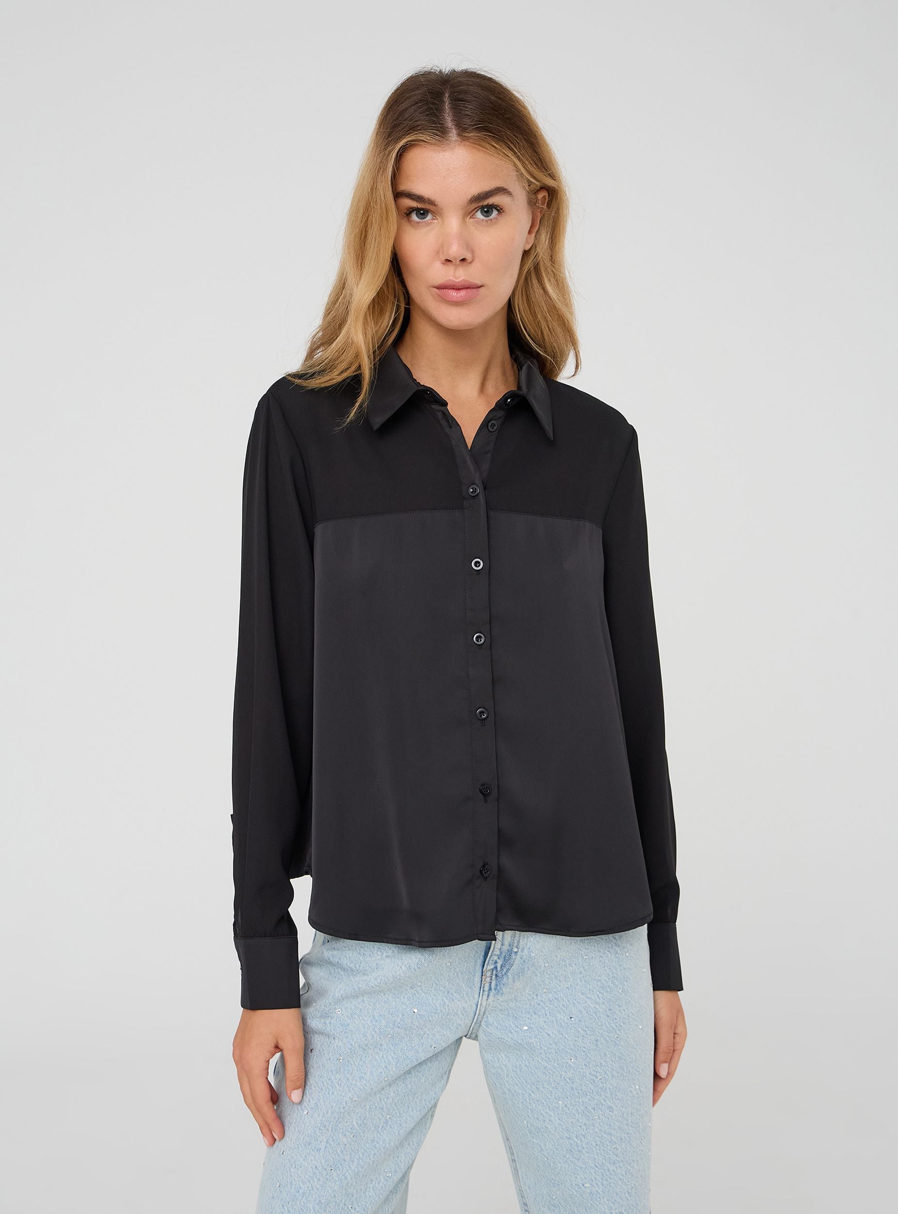 Camicia da donna in bitessuto a tinta unita con trasparenze. Coletto classico a camicia, chiusura frontale con bottoni. Perfetta per outfit chic e ricercati.Podrobnosti