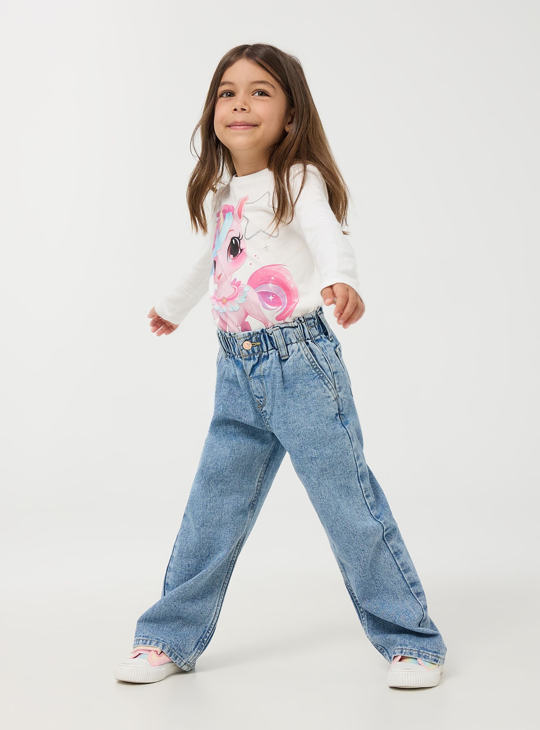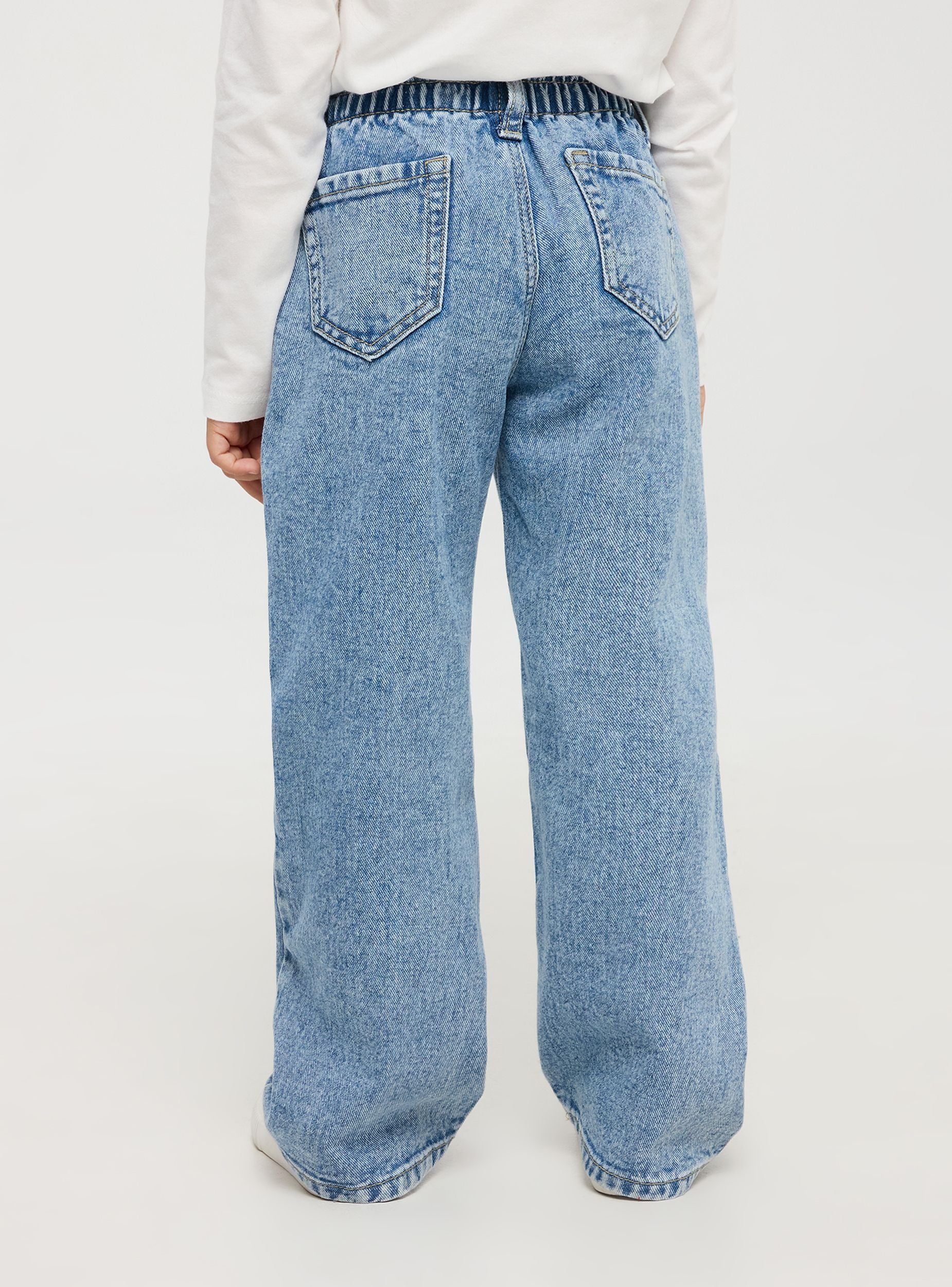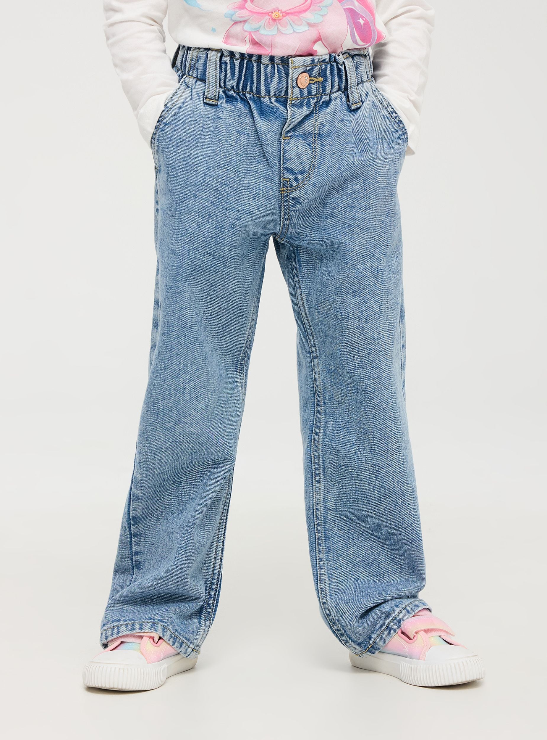 Jeans da bimba realizzati in denim di cotone, lavaggio medio, ideali per un look casual e confortevole. Di colore blu con effetto washed, presentano una vita elasticizzata arricchita da un bottone in metallo con cuoriccino per una calzata perfetta. Dotati di pratiche tasche laterali alla francese e finiture robuste con cuciture durevoli, questi jeans dal taglio ampio sono perfetti per gli outfit delle più piccole.Podrobnosti