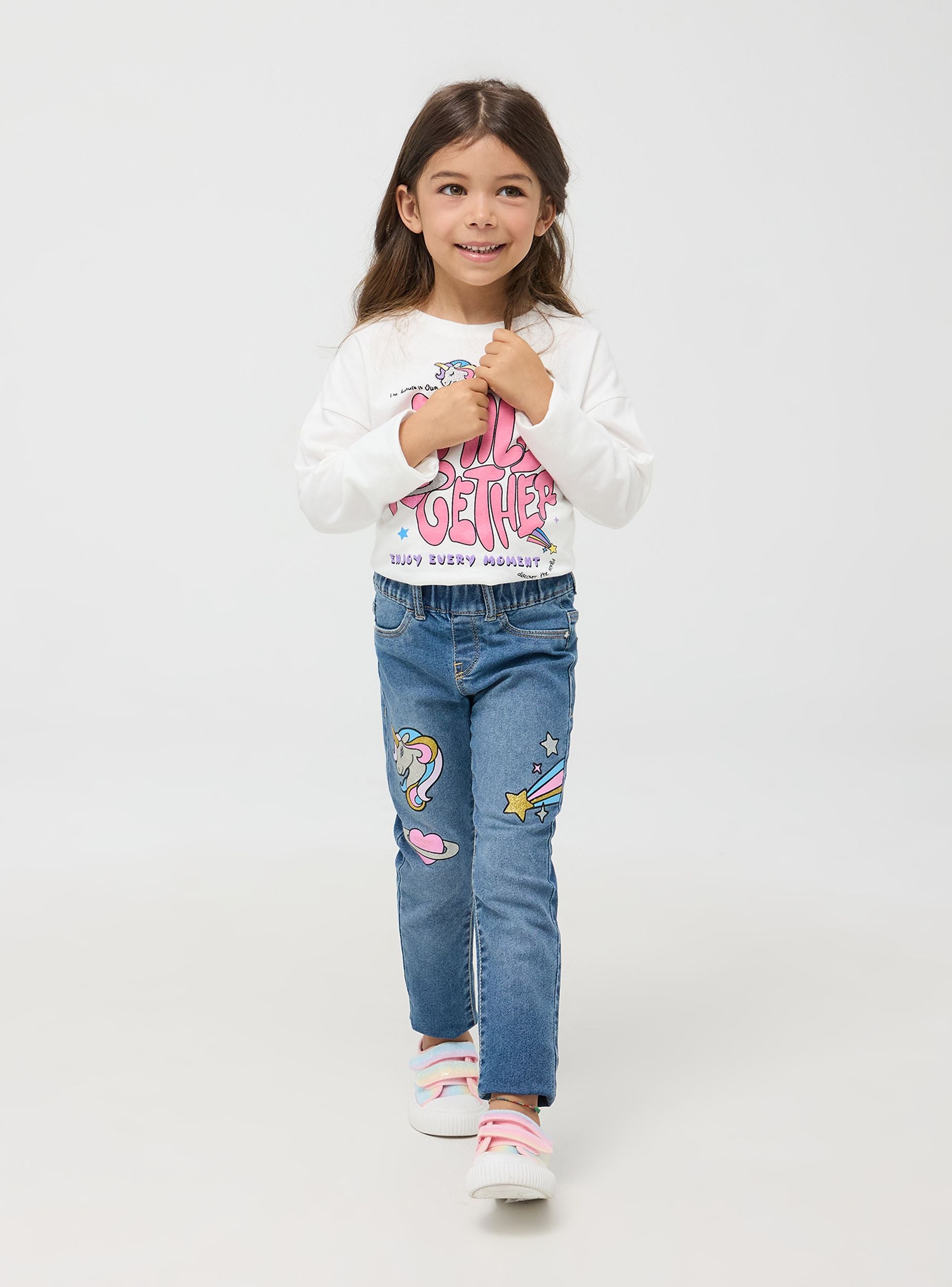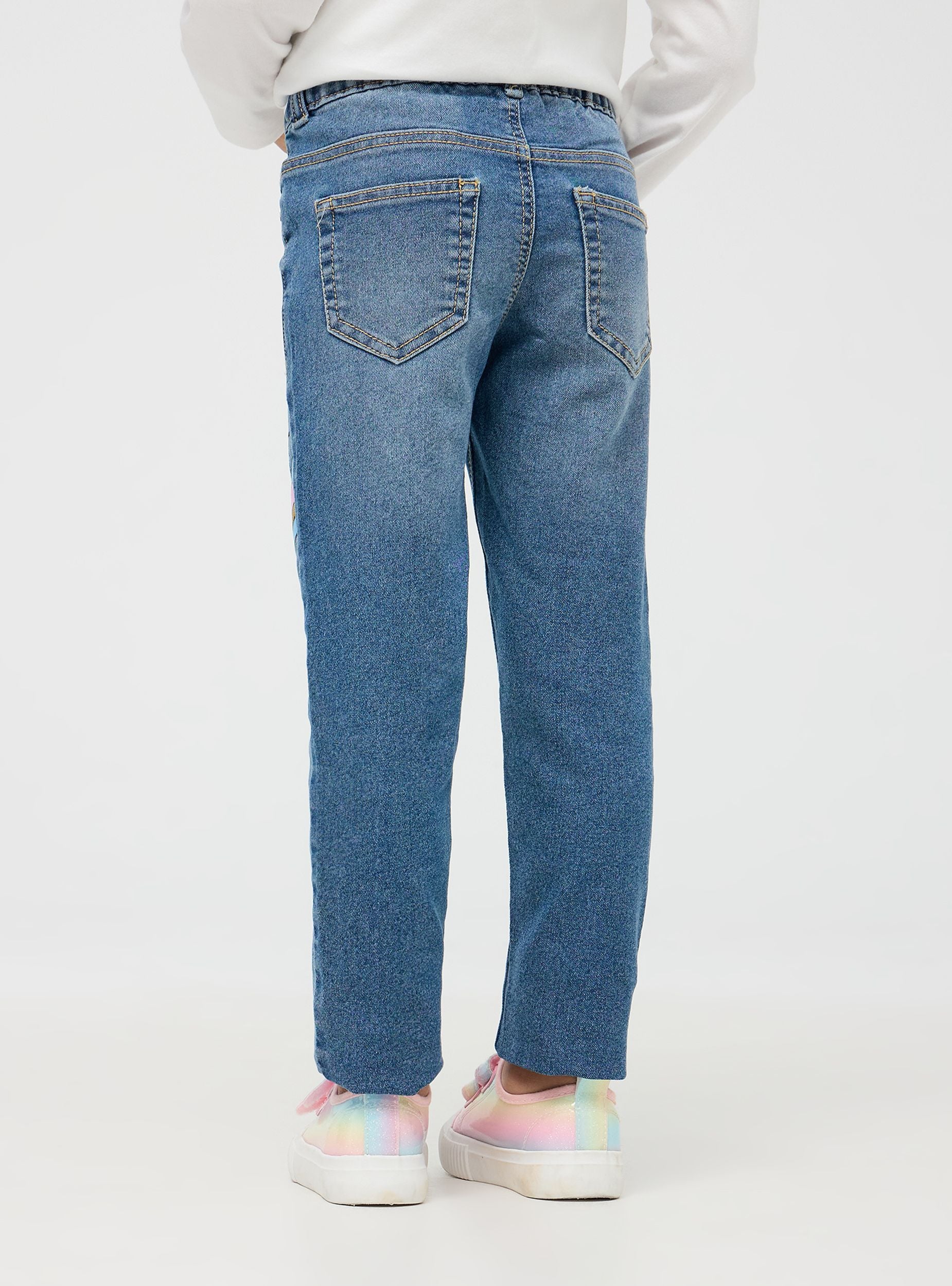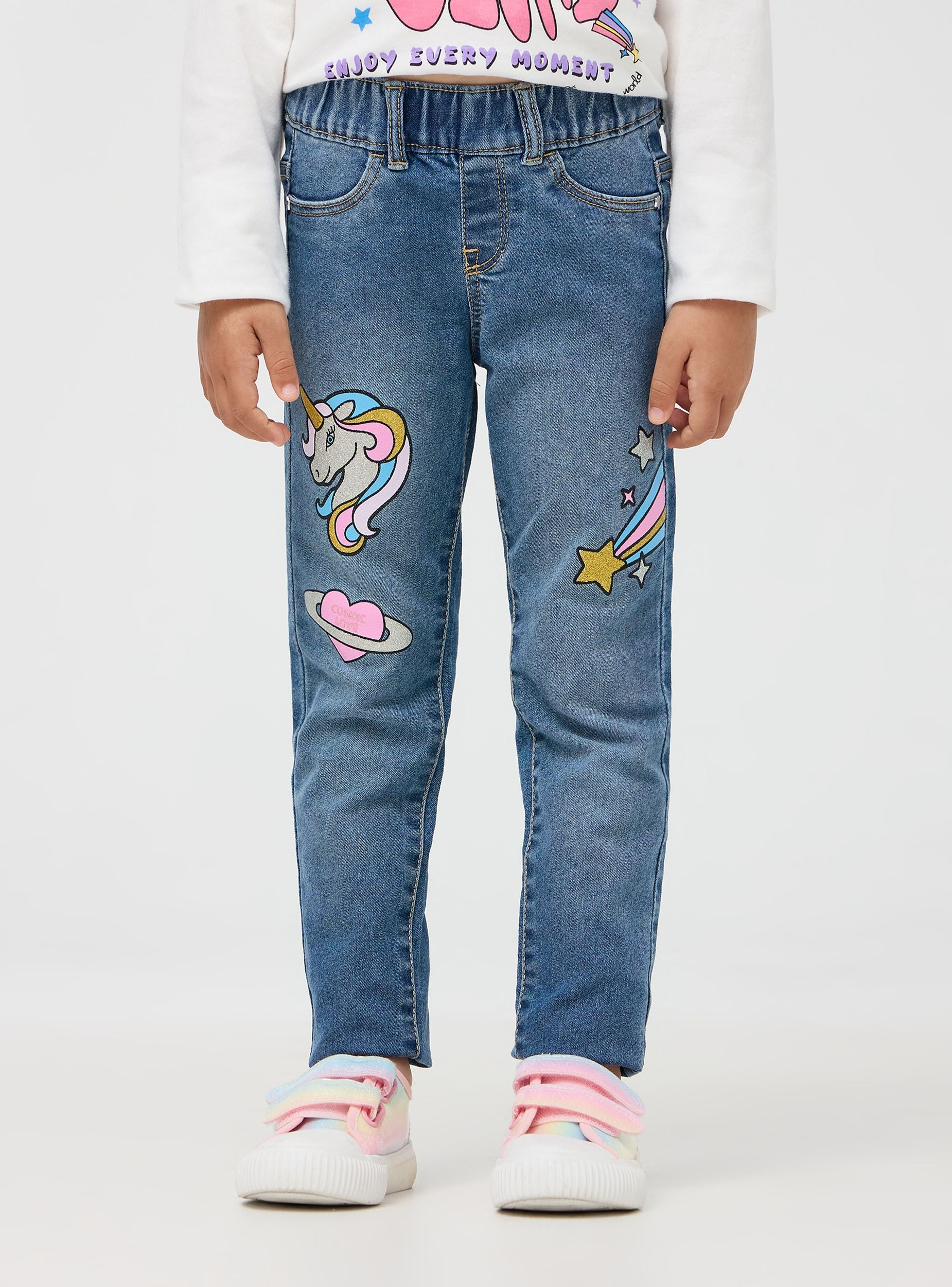 Jeggings da bimba con stampe colorate e glitterate su entrambe le gambe. Le decorazioni includono un unicorno, stelle, cuori e altri motivi fantasiosi, aggiungendo un tocco divertente e giocoso al capo. La vita elastica garantisce una vestibilità comoda e pratica, perfetta per le bimbe attive. Dotati di tasche finte sul davanti con rivetti a forma di stelline e tasche sul retro conferiscono l'aspetto di un paio di jeans tradizionali, mantenendo al contempo la comodità dei leggings. Questo capo è ideale per essere indossato quotidianamente, offrendo stile e comfort in un unico prodotto.Podrobnosti