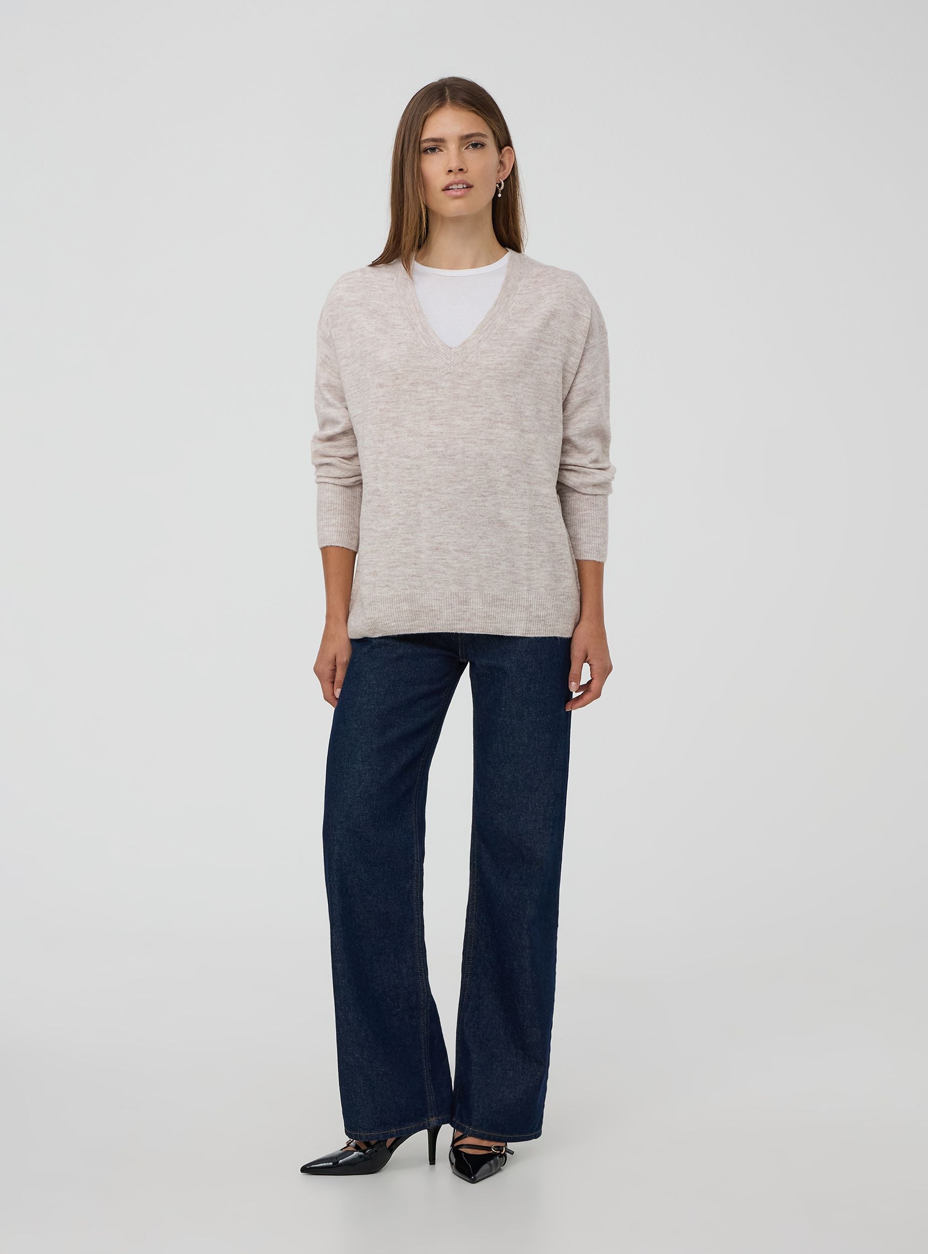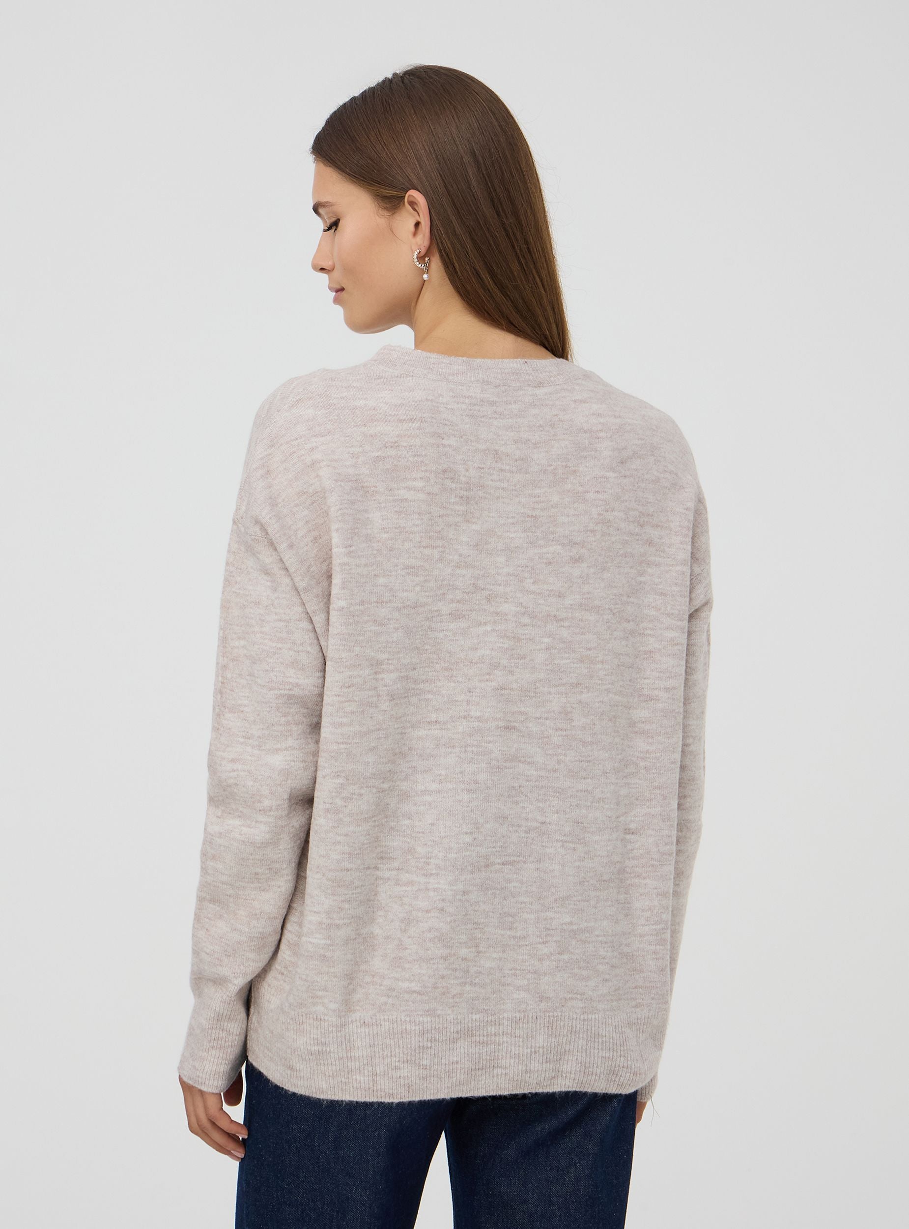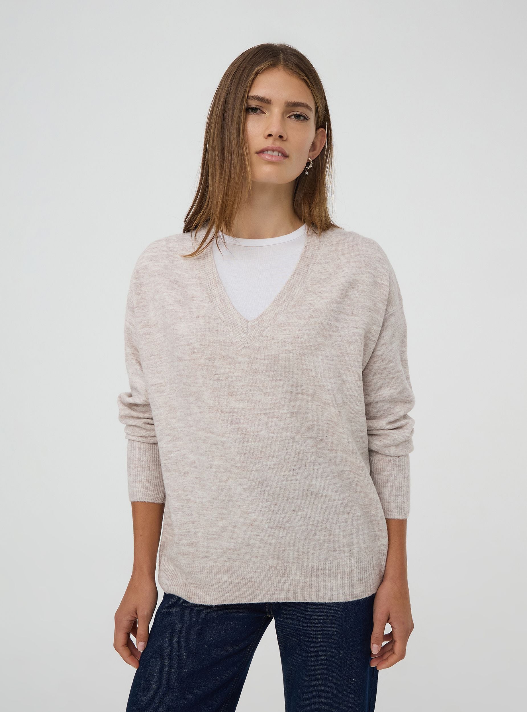 Maglia da donna con scollo a V ampio. Il design è semplice e lineare, caratterizzato da una vestibilità comoda. Il bordo inferiore e i polsini sono rifiniti con un motivo a coste, che aggiunge un tocco di struttura al capo. Il tessuto a tinta unita appare morbido e confortevole, ideale per la stagione invernale, offrendo sia calore che stile.Podrobnosti