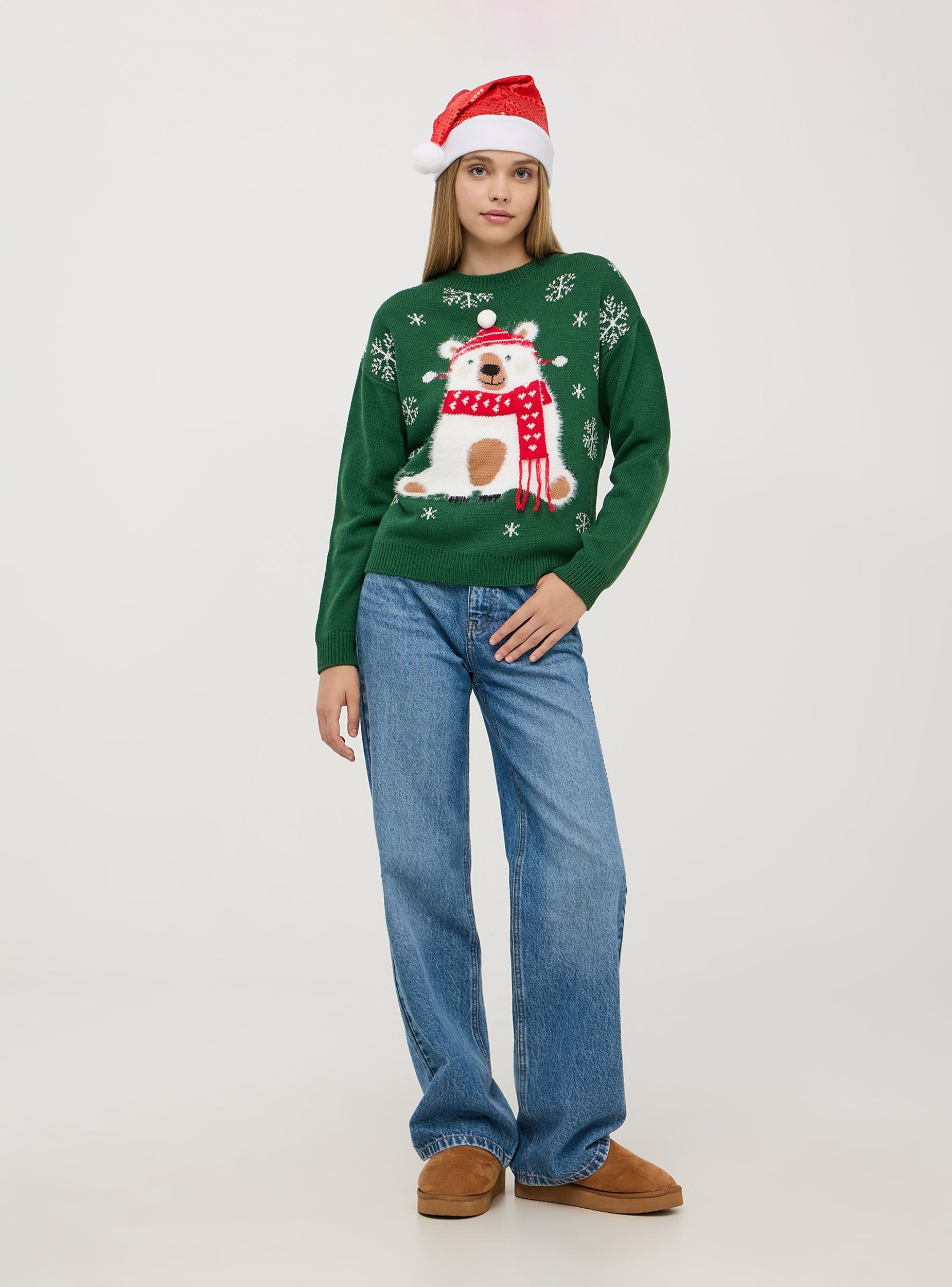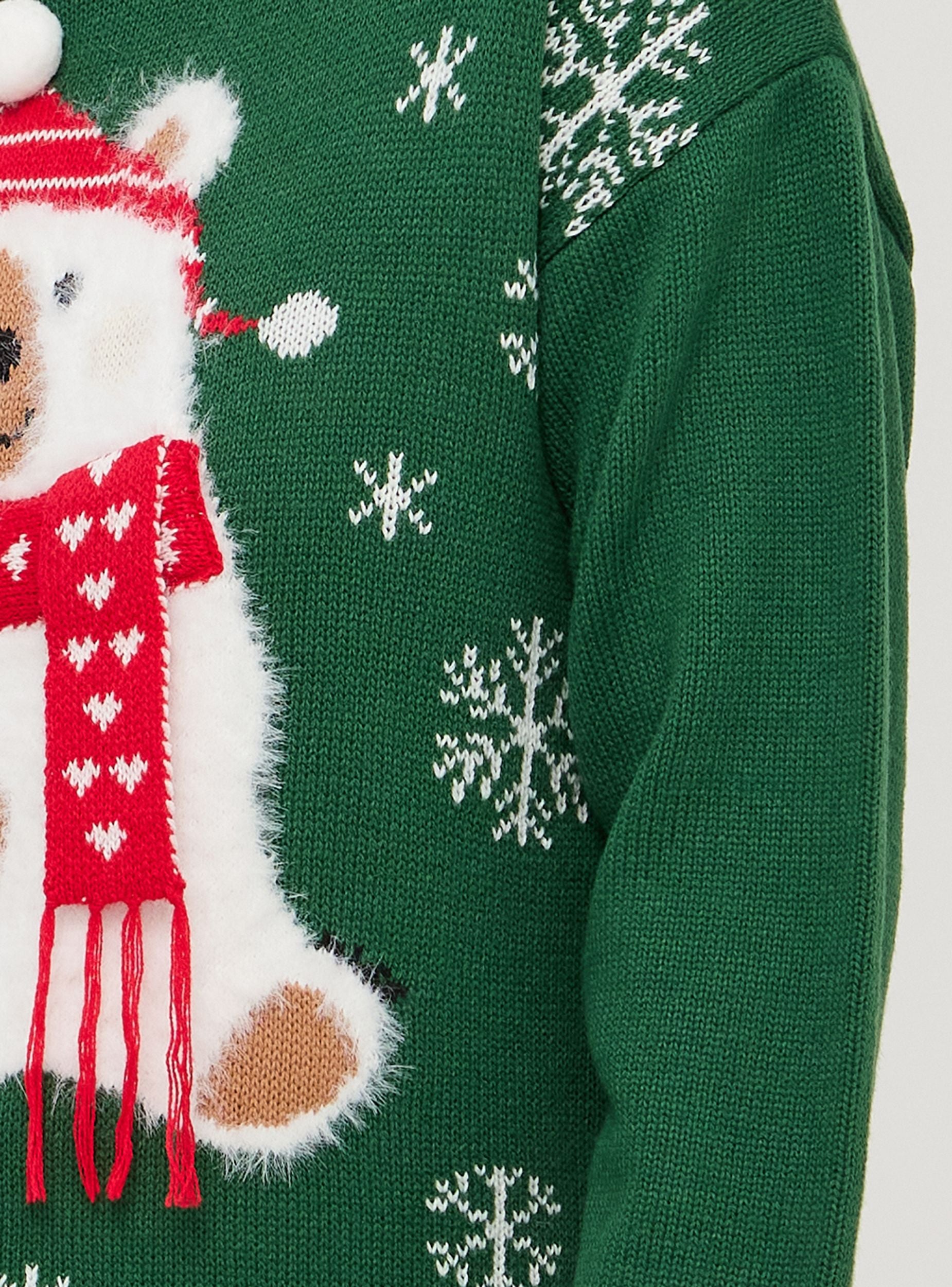 Maglione da donna con design natalizio adorabile e divertente. Realizzato in un vivace colore verde, il maglione è decorato con un simpatico orso bianco con un cappello e una sciarpa rossi. Sul cappello dell'orso sono presenti due pompon soffici, aggiungendo un tocco tridimensionale al design. Il maglione è ulteriormente arricchito da fiocchi di neve bianchi sparsi su tutta la parte anteriore e le spalle. Modello con girocollo, polsini e orlo a coste per una vestibilità confortevole e aderente. Sul retro, il maglione è completamente verde, senza decorazioni, mantenendo un aspetto semplice e pulito. Perfetto per aggiungere un tocco di allegria e calore al tuo guardaroba invernale e per le festività natalizie.Podrobnosti