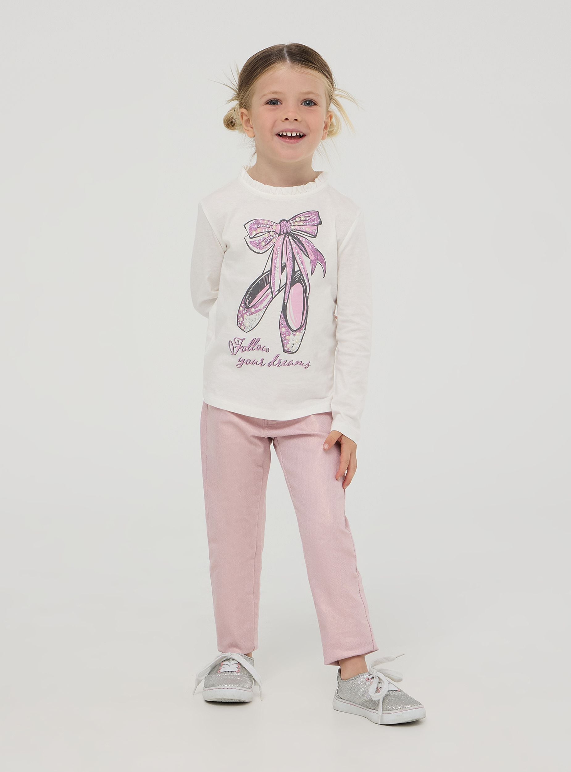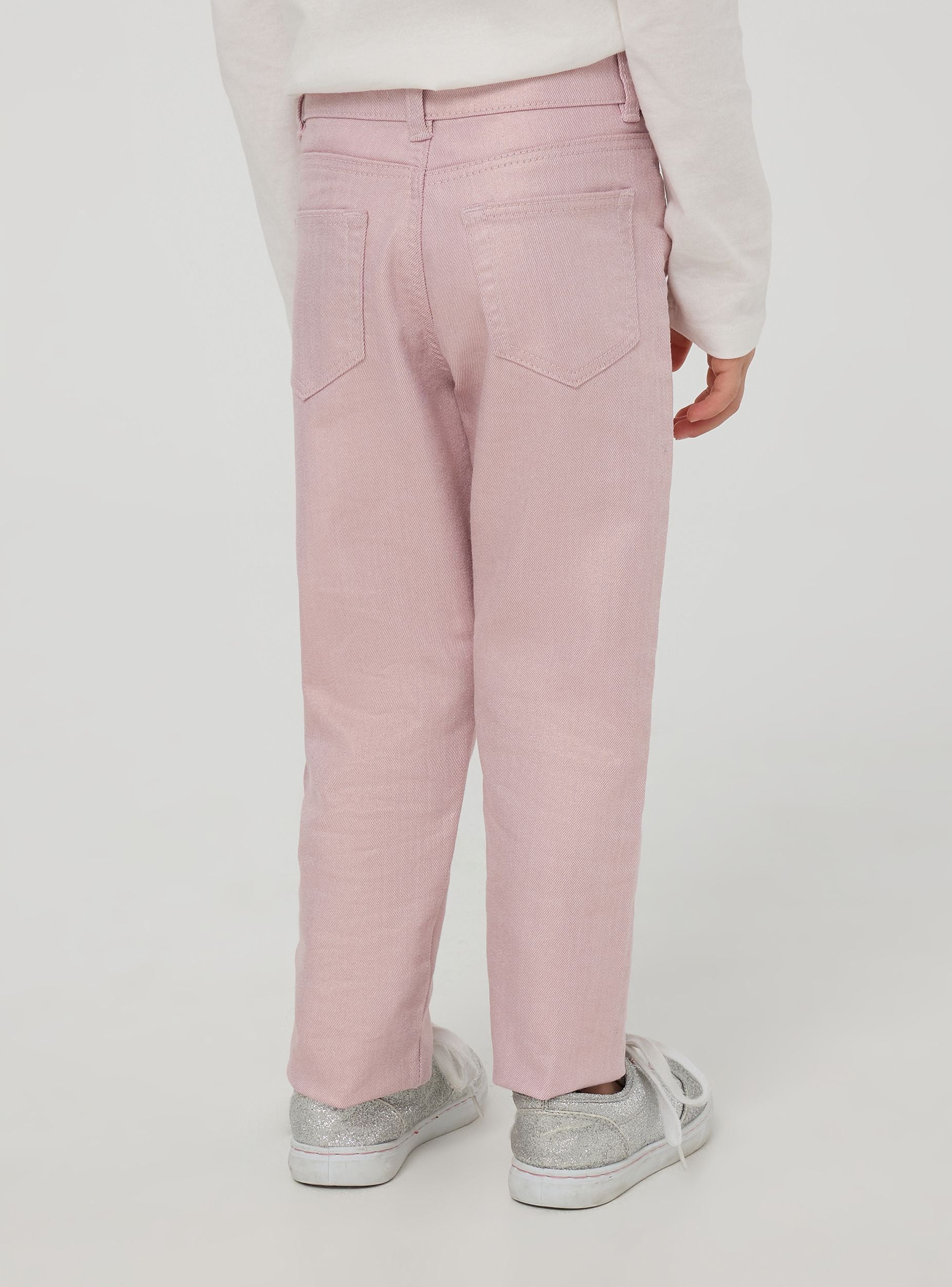 Pantaloni da bimba con design a 5 tasche, caratterizzati da una finitura spalmata che conferisce un aspetto brillante. Presentano una chiusura con bottone con cuoricino e un elastico interno in vita per una migliore vestibilità. Questi pantaloni sono ideali per un look moderno e confortevole, adatti per l'uso quotidiano o per occasioni speciali.Podrobnosti