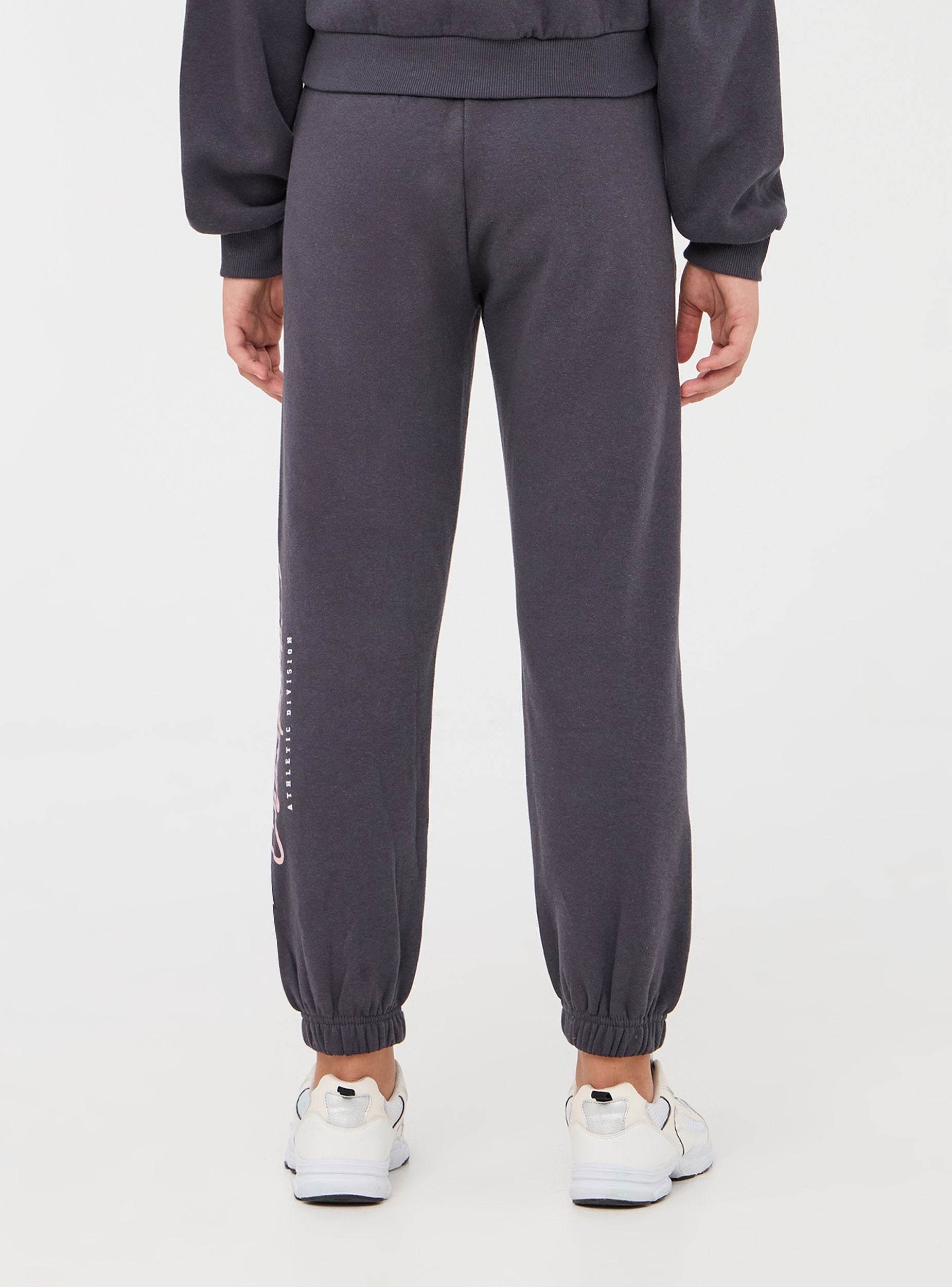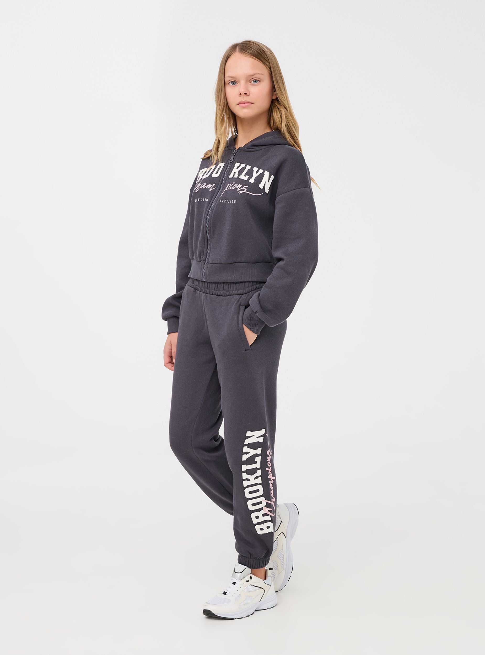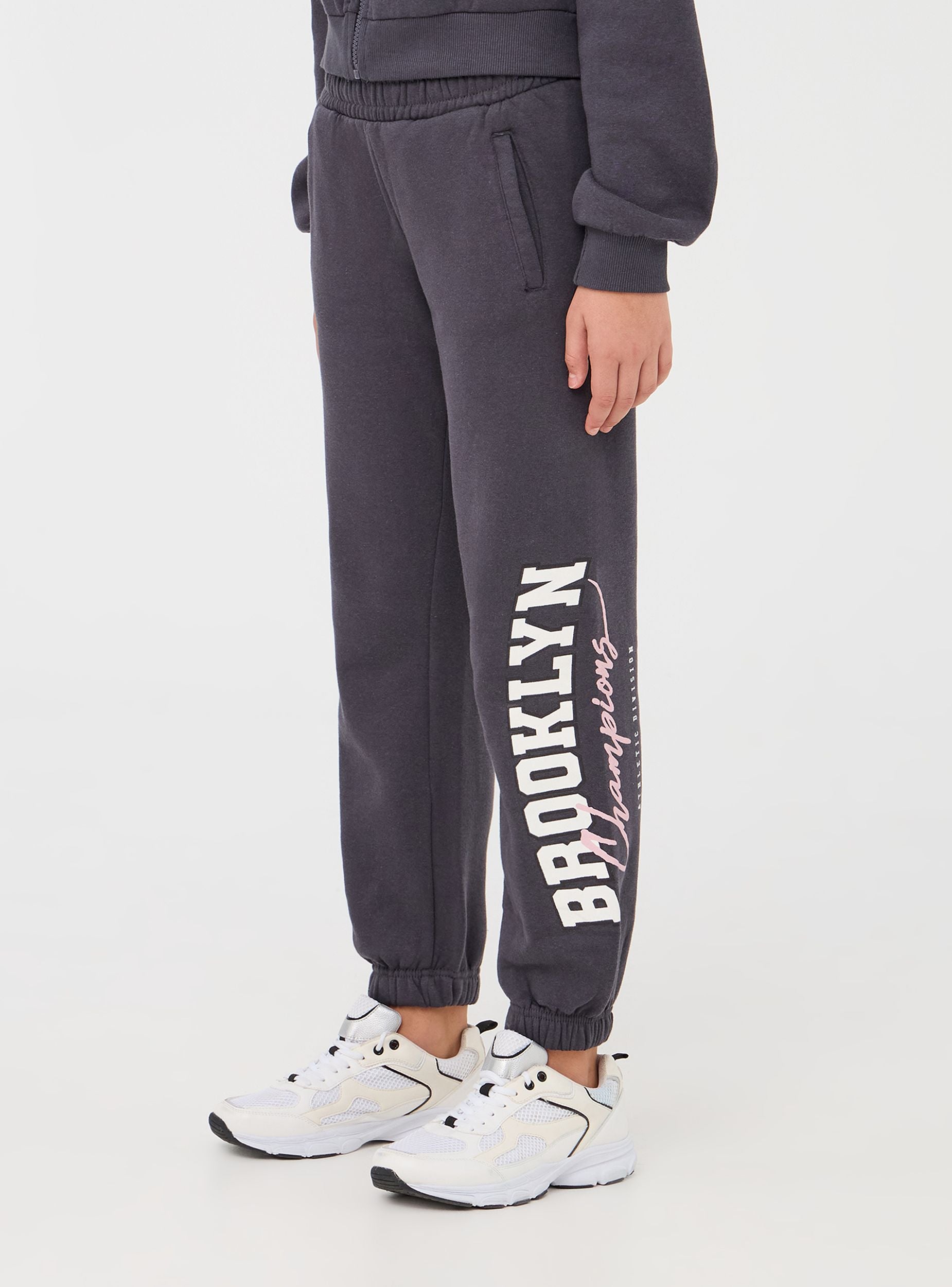 Pantaloni della tuta pesanti da bambina con stampa in stile college americano sulla gamba. Il design presenta una vita elasticizzata e polsini elasticizzati alla caviglia per una vestibilità comoda. Questi pantaloni sono ideali per il periodo invernale, offrendo comfort e calore.Podrobnosti
