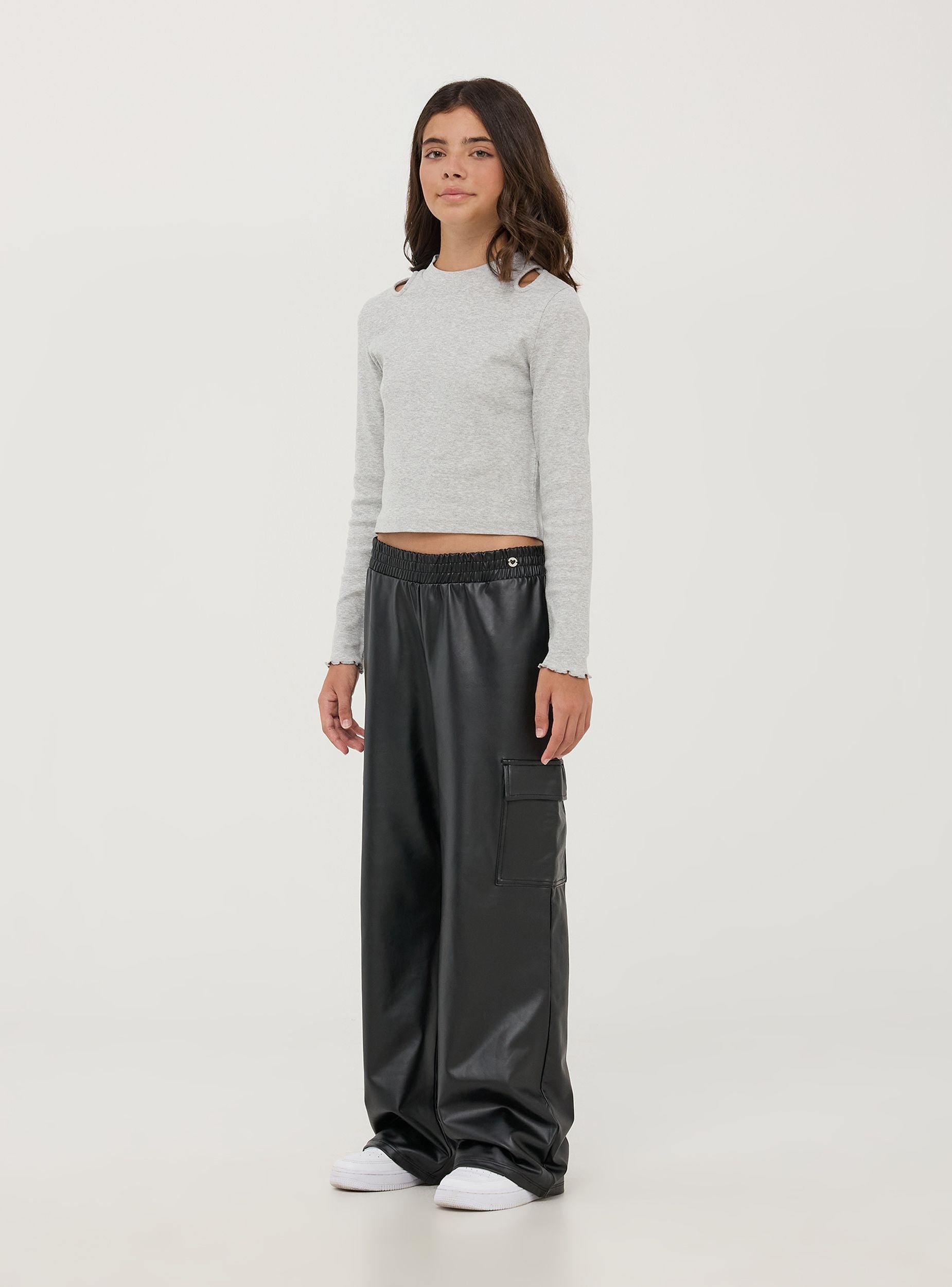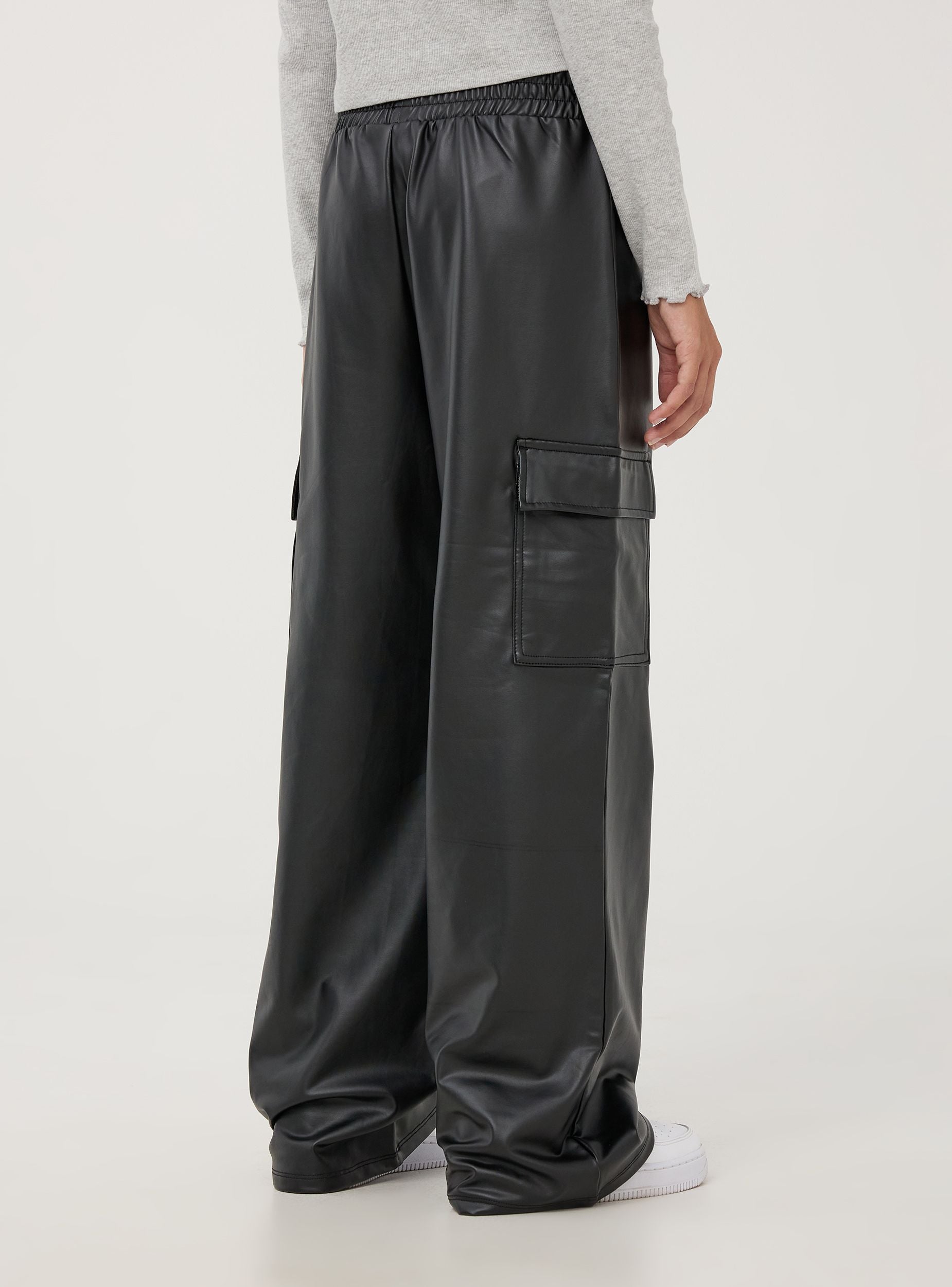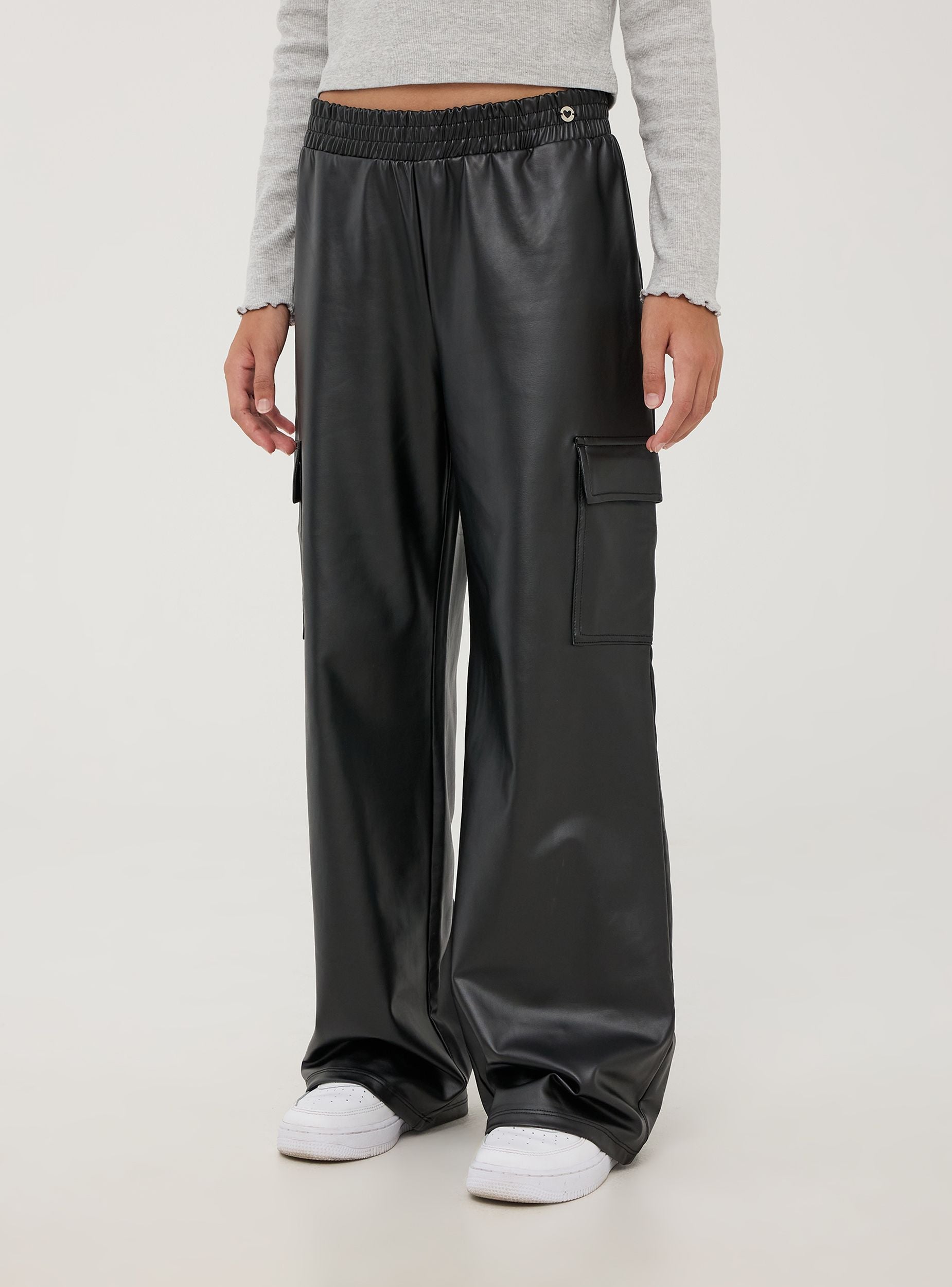 Pantaloni wide leg cargo da bambina in similpelle caratterizzati da un design ampio e comodo. Presentano tasche cargo su entrambi i lati, elastico interno in vita per una vestibilità confortevole e badge con cuoricino decorativo sulla parte anteriore della vita. Il tessuto presenta una texture liscia e una finitura lucida. Questi pantaloni sono ideali per un look moderno e pratico.Podrobnosti