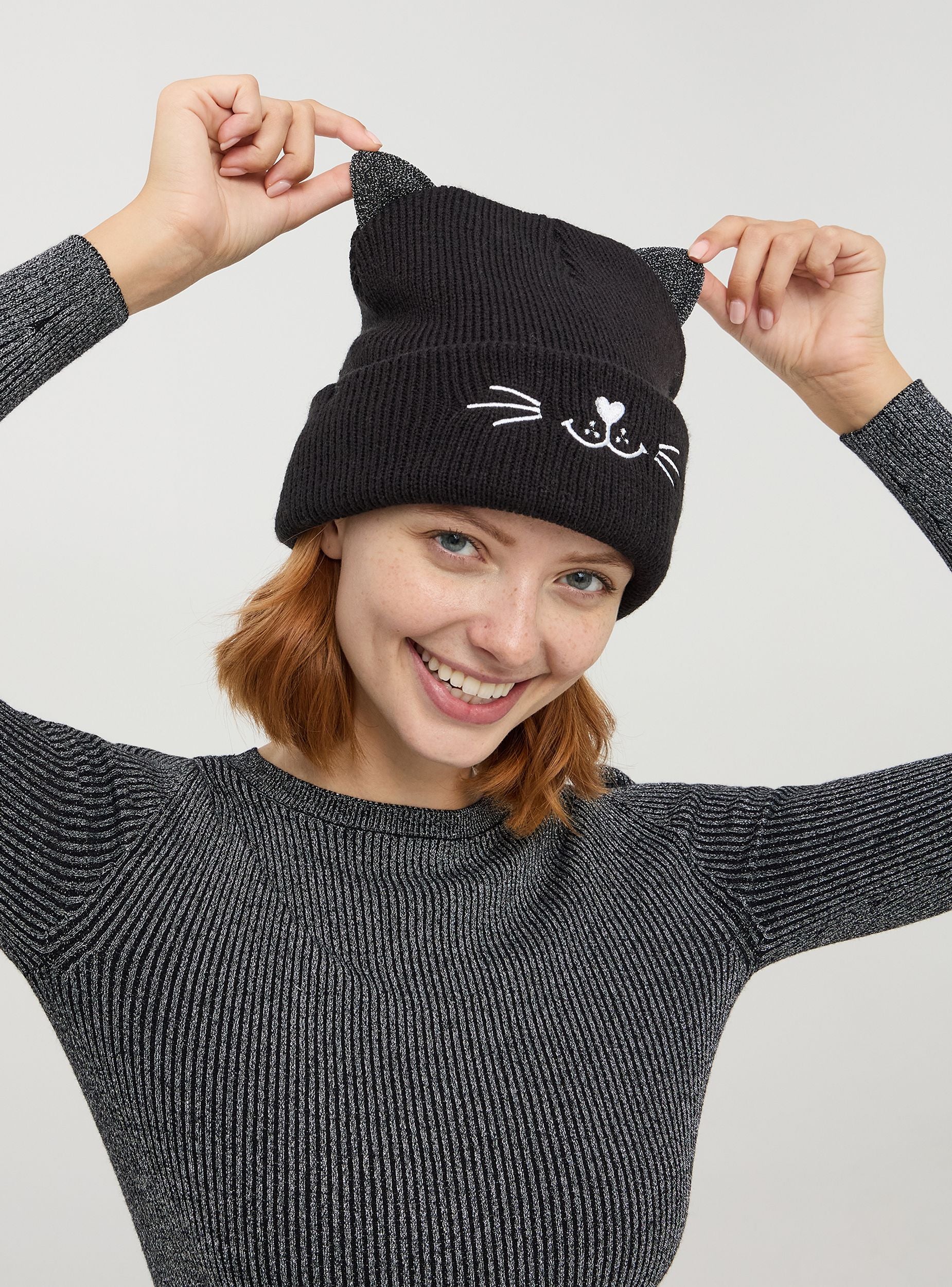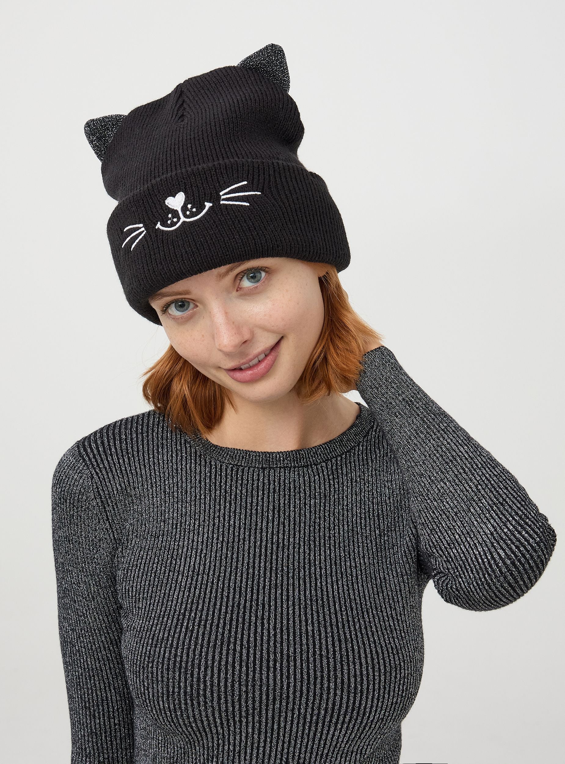 Berretto da donna dal design unico con delle adorabili orecchie da gatto applicate che conferiscono un tocco giocoso e distintivo. La parte frontale è impreziosita da un simpatico ricamo che ricorda il musetto di un gatto, aggiungendo un elemento di dolcezza al tuo look.