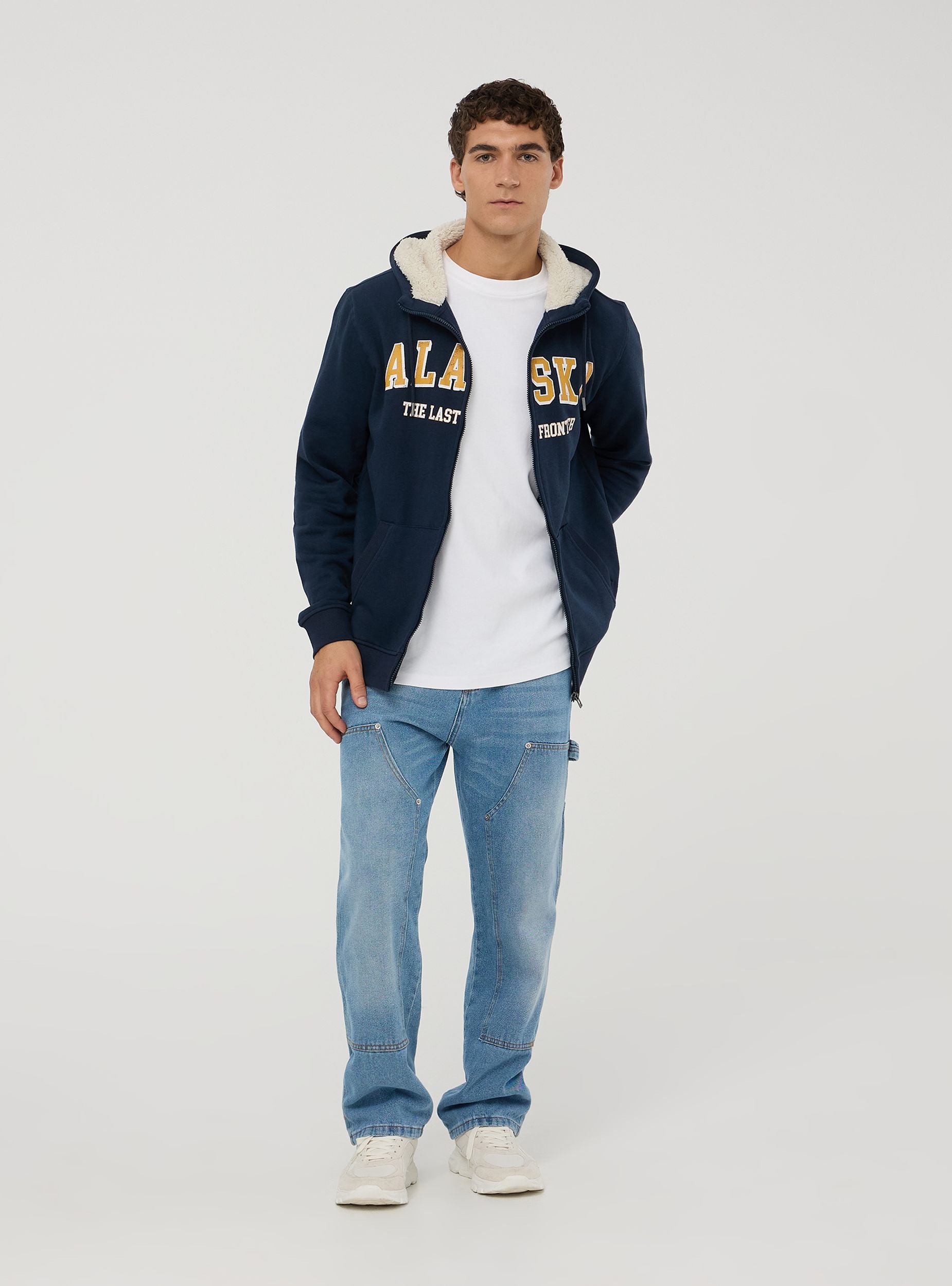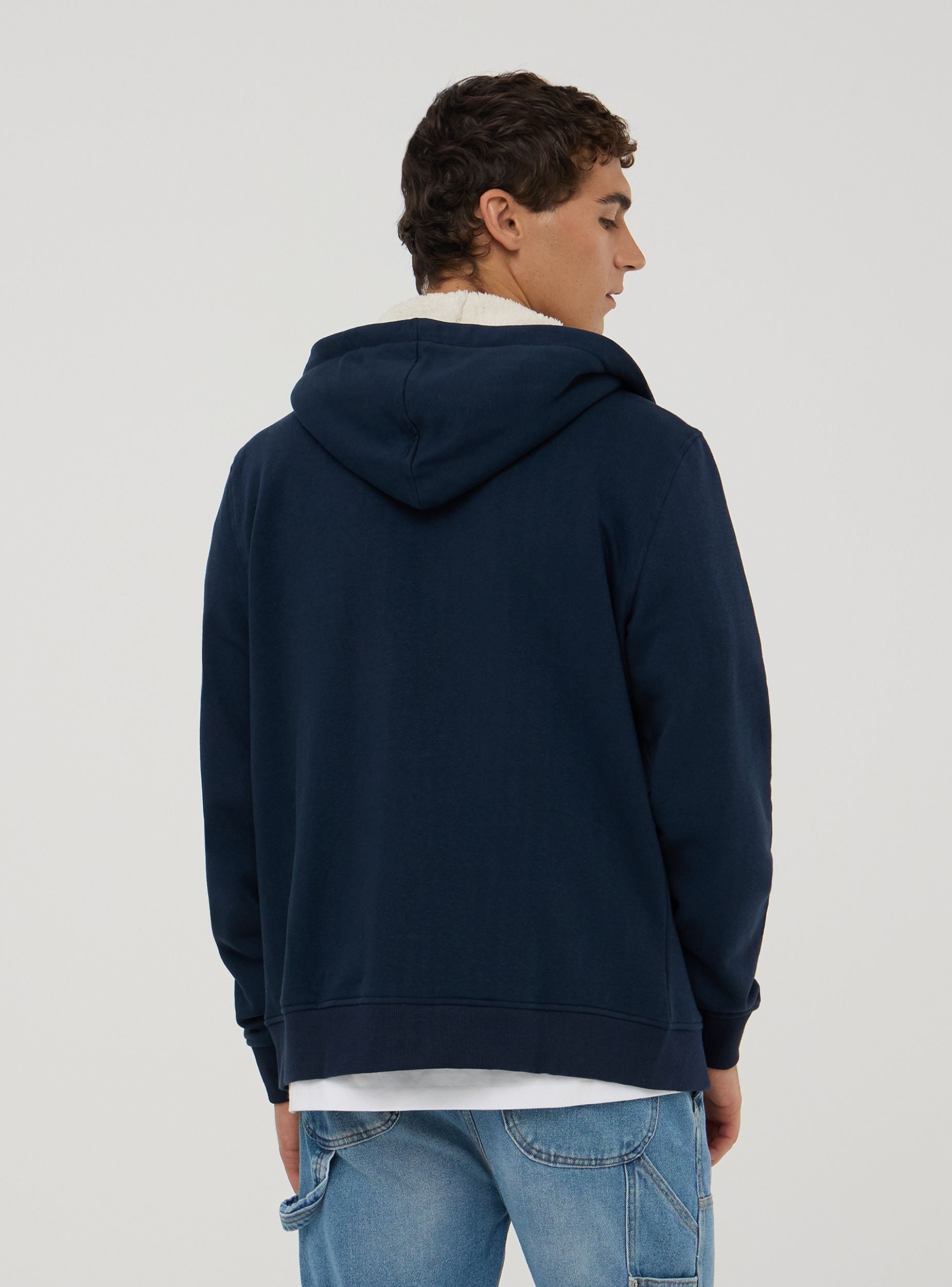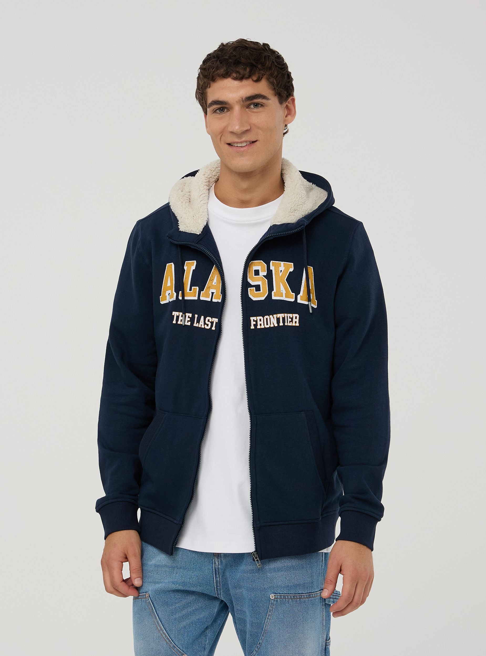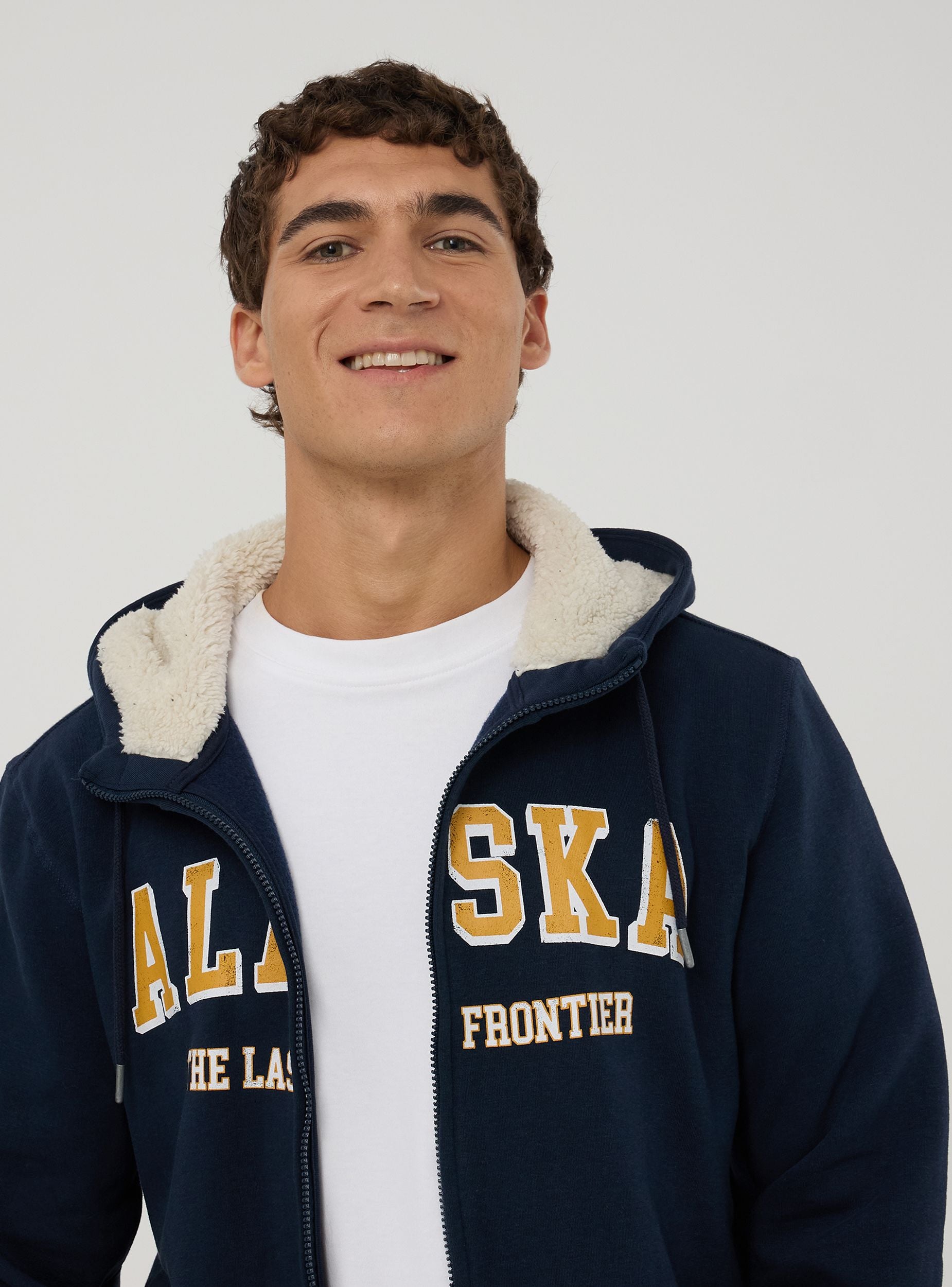 Felpa da uomo con cappuccio e coulisse, dotata di chiusura frontale con zip. Il cappuccio è foderato internamente con morbido tessuto sherpa per un maggiore calore e comfort. Presenta una stampa in stile sport sul petto e una tasca a marsupio frontale. I polsini e l'orlo a costine elasticizzati assicurano una vestibilità confortevole. Questa felpa è perfetta per affrontare le giornate fredde con stile e comfort. Versatile e funzionale, può essere facilmente abbinata a jeans o pantaloni sportivi e sneakers per un look casual e comodo. Vestibilità regular.Podrobnosti