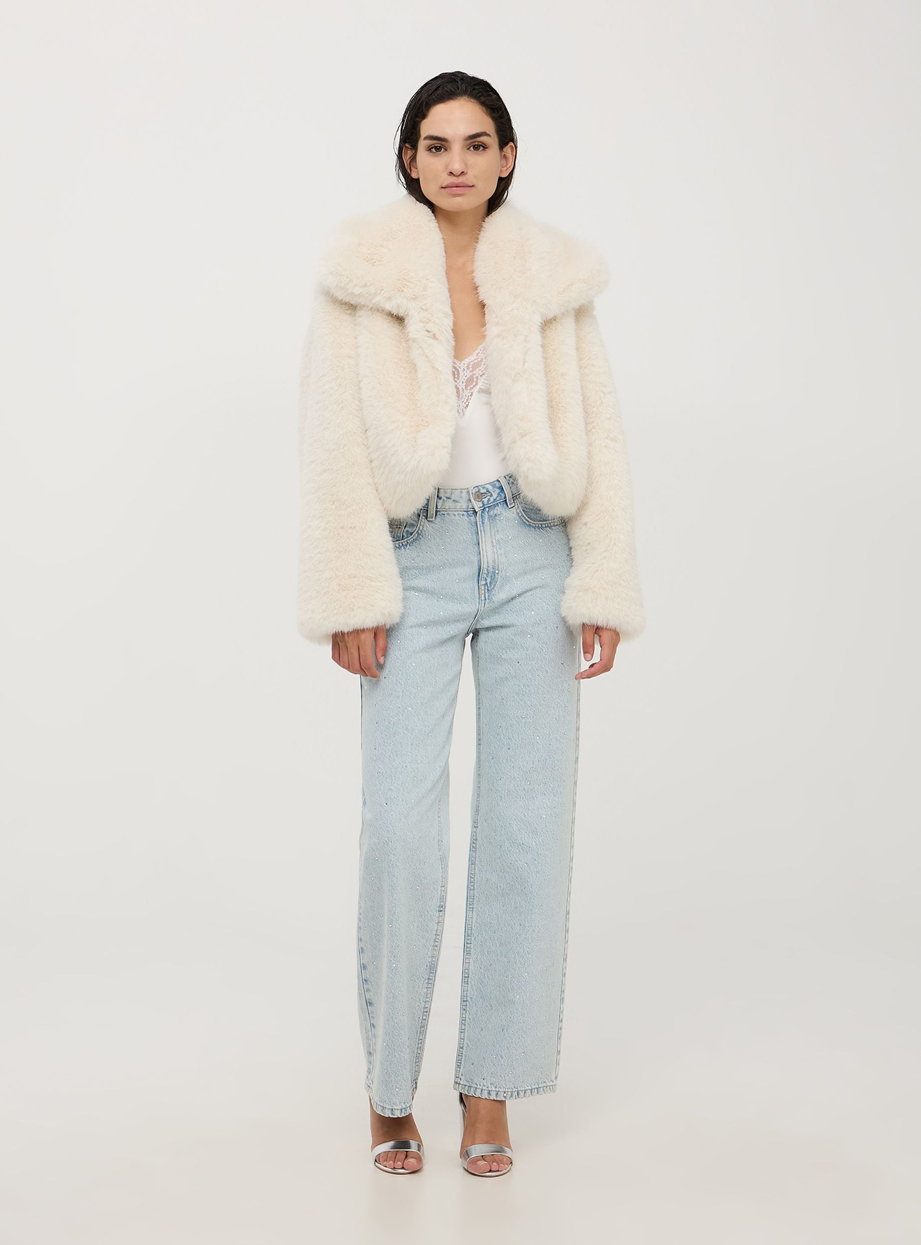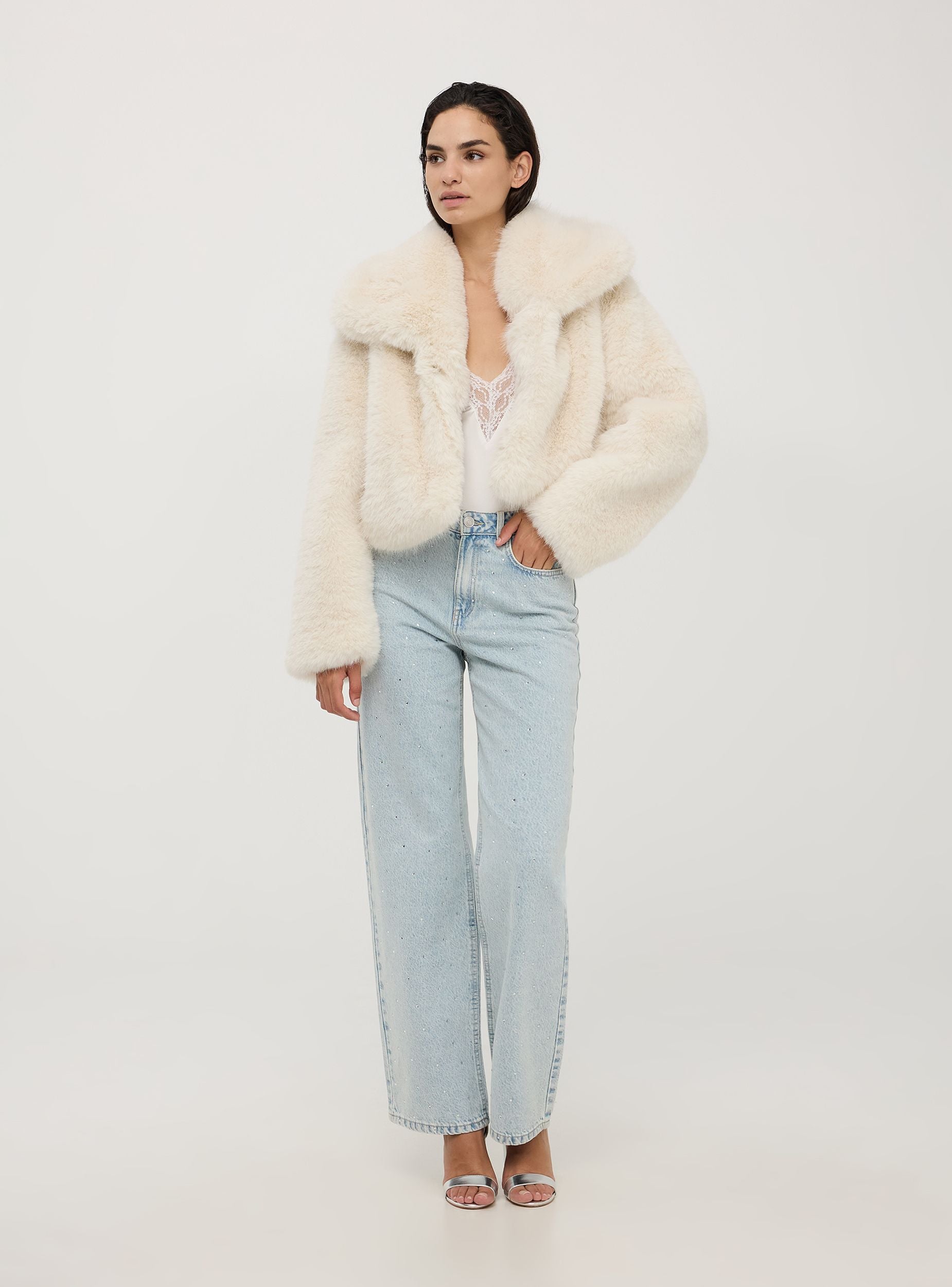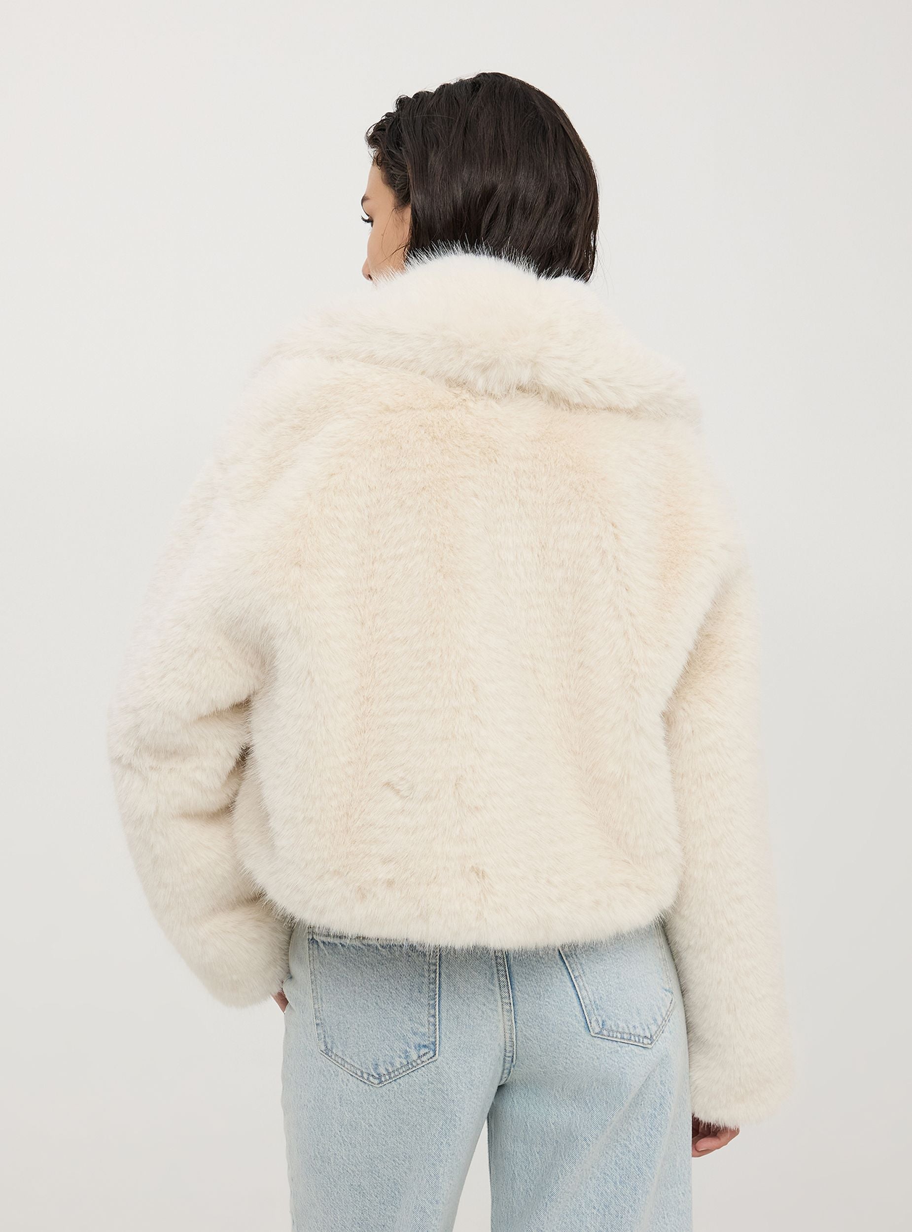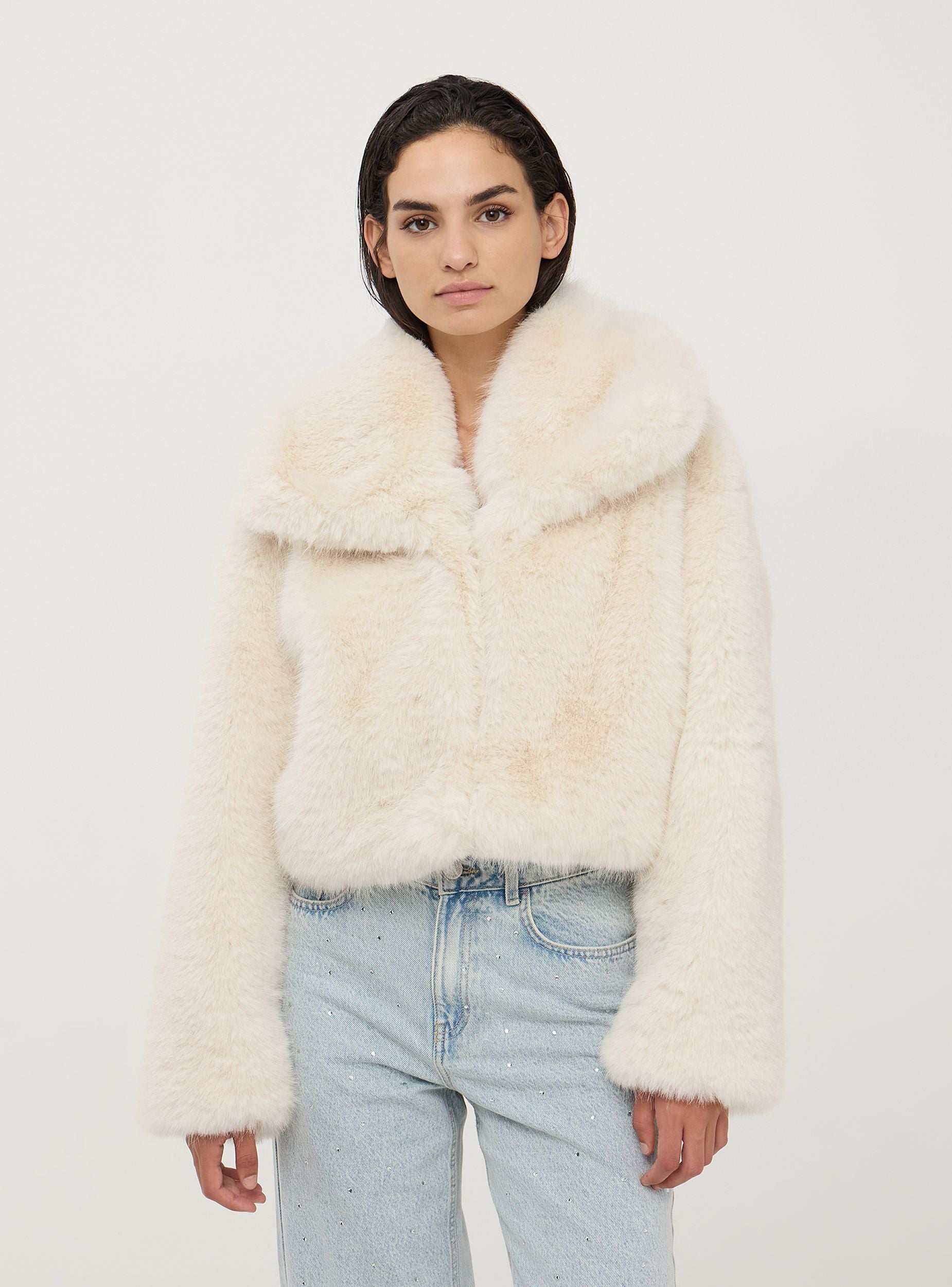 Giubbotto corto da donna, realizzato in pelliccia sintetica. Perfetto per un look sofisticato e alla moda. Il design minimalista con chiusura frontale con due ganci offre un aspetto pulito ed elegante. Perfetta per serate eleganti e occasioni speciali, questa giacca aggiunge un tocco di stile e calore a ogni outfit. Modello senza cappuccio, dotato di ampio colletto.