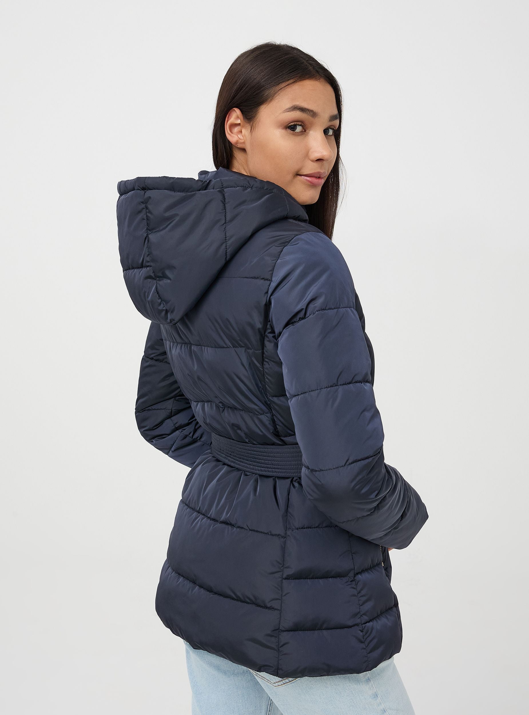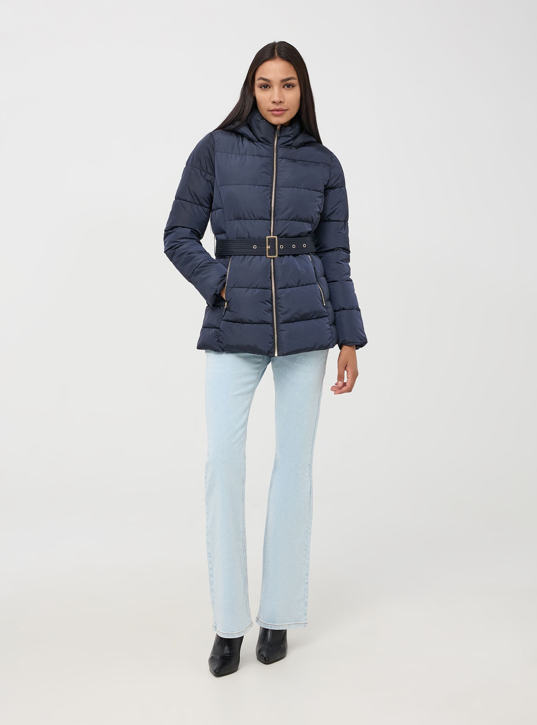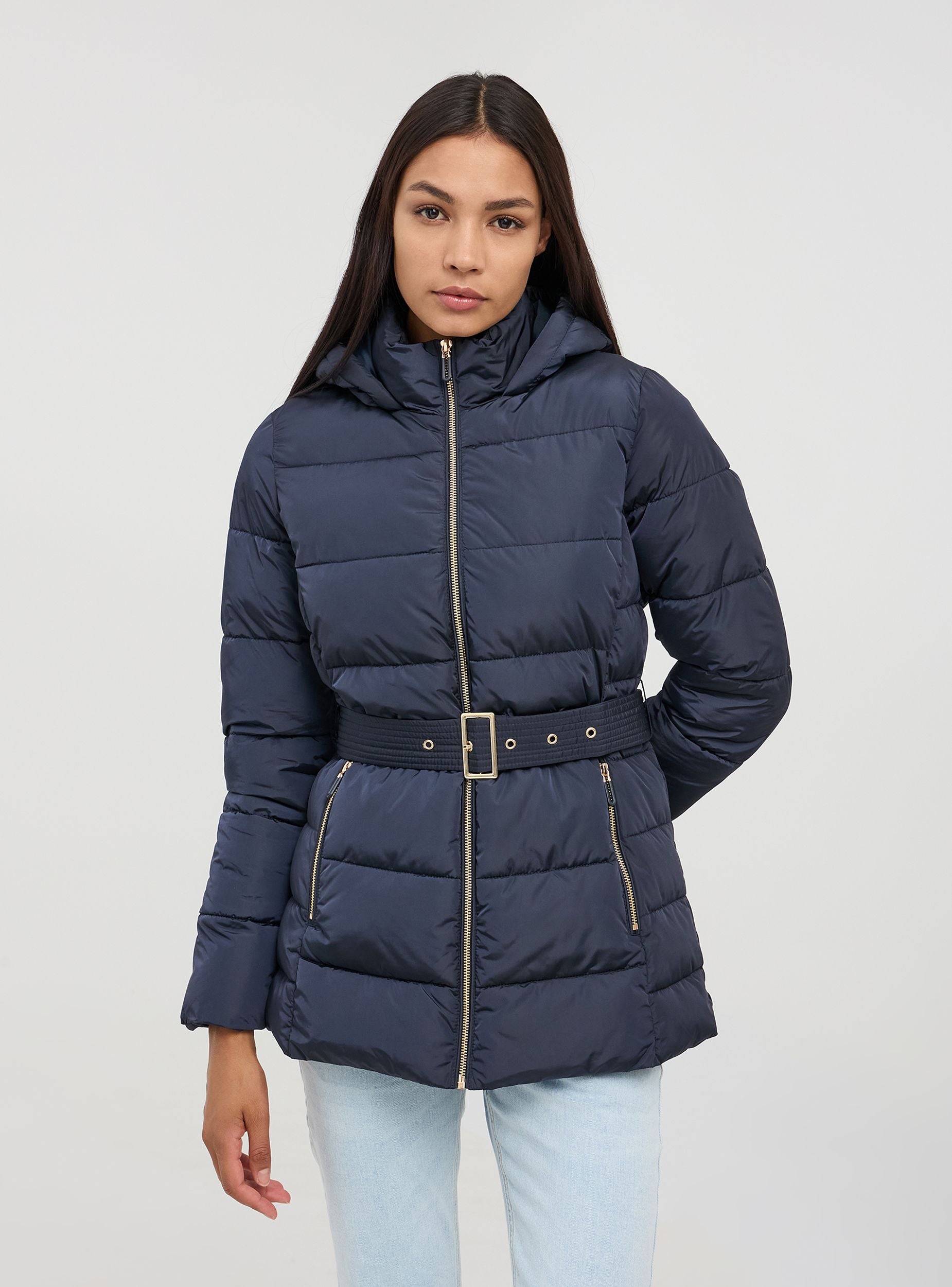 Giubbotto lungo imbottito da donna con cappuccio, caratterizzato da una cintura in vita con fibbia. Il giubbotto presenta una chiusura frontale con cerniera e tasche laterali con zip. Il design include cuciture orizzontali per creare un effetto trapuntato. Le maniche hanno polsini interni per una maggiore protezione dal freddo. La parte anteriore e posteriore del giubbotto presentano dettagli di cucitura che definiscono la silhouette, conferendo al capo un aspetto elegante e funzionale.