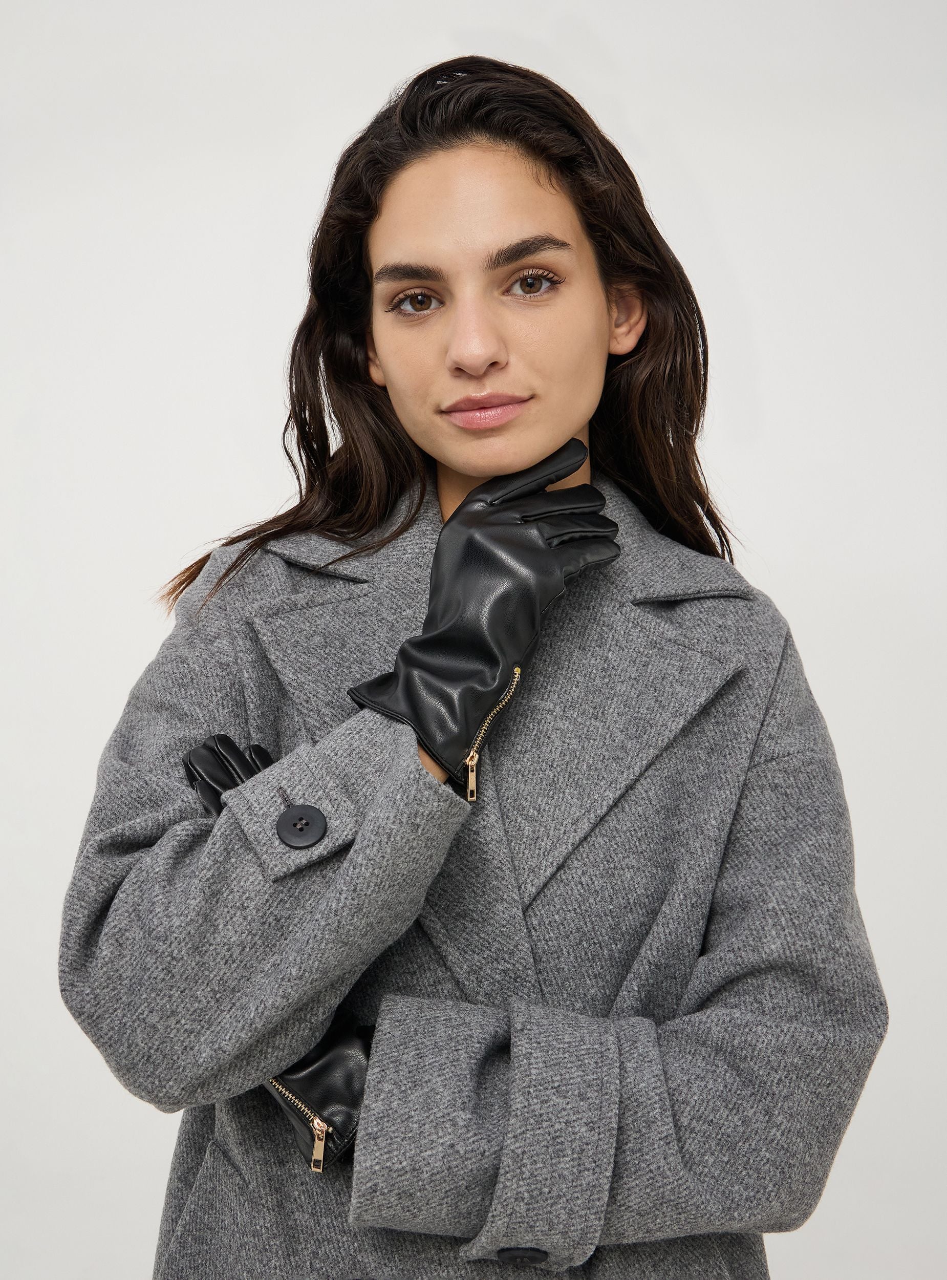 Eleganti guanti da donna realizzati in effetto pelle, perfetti per tenere le mani al caldo durante le giornate fredde. Il design presenta una zip dorata decorativa su un lato, aggiungendo un tocco sofisticato e di originalità. La vestibilità è aderente, garantendo comfort e facilità di movimento. Ideali per un look casual chic.