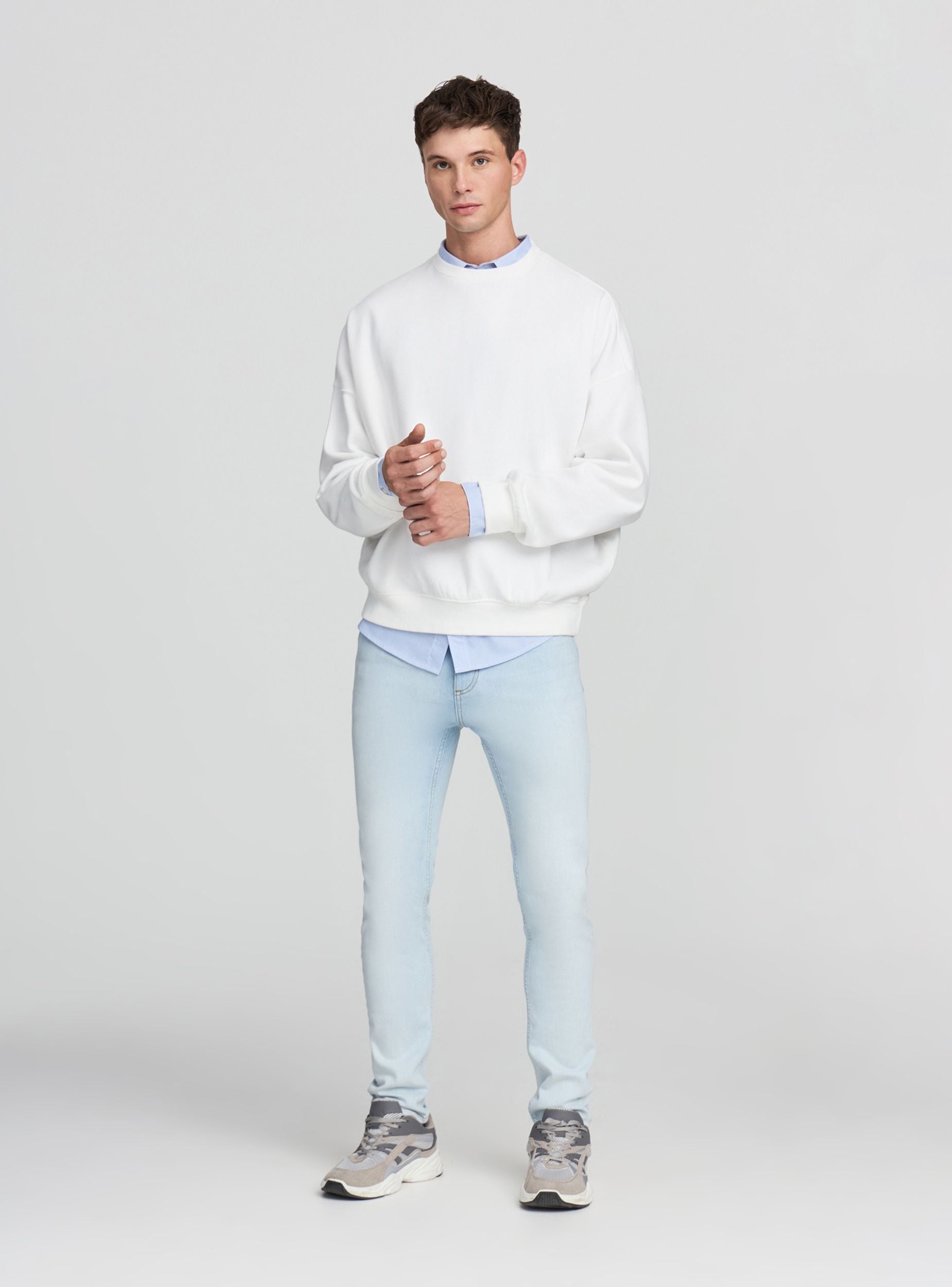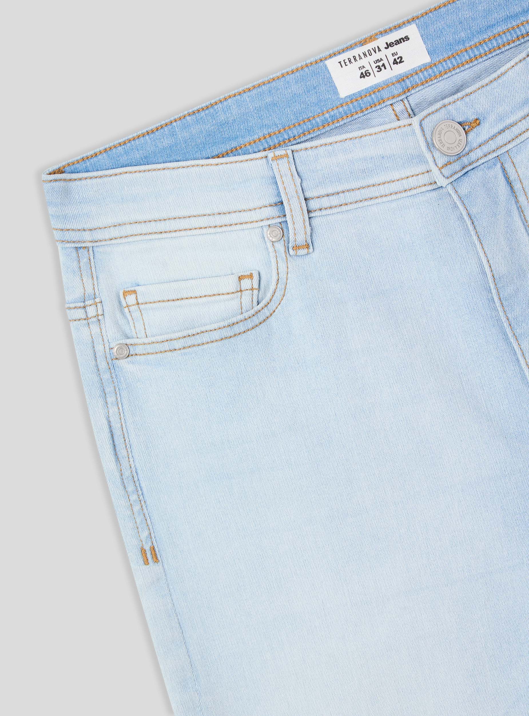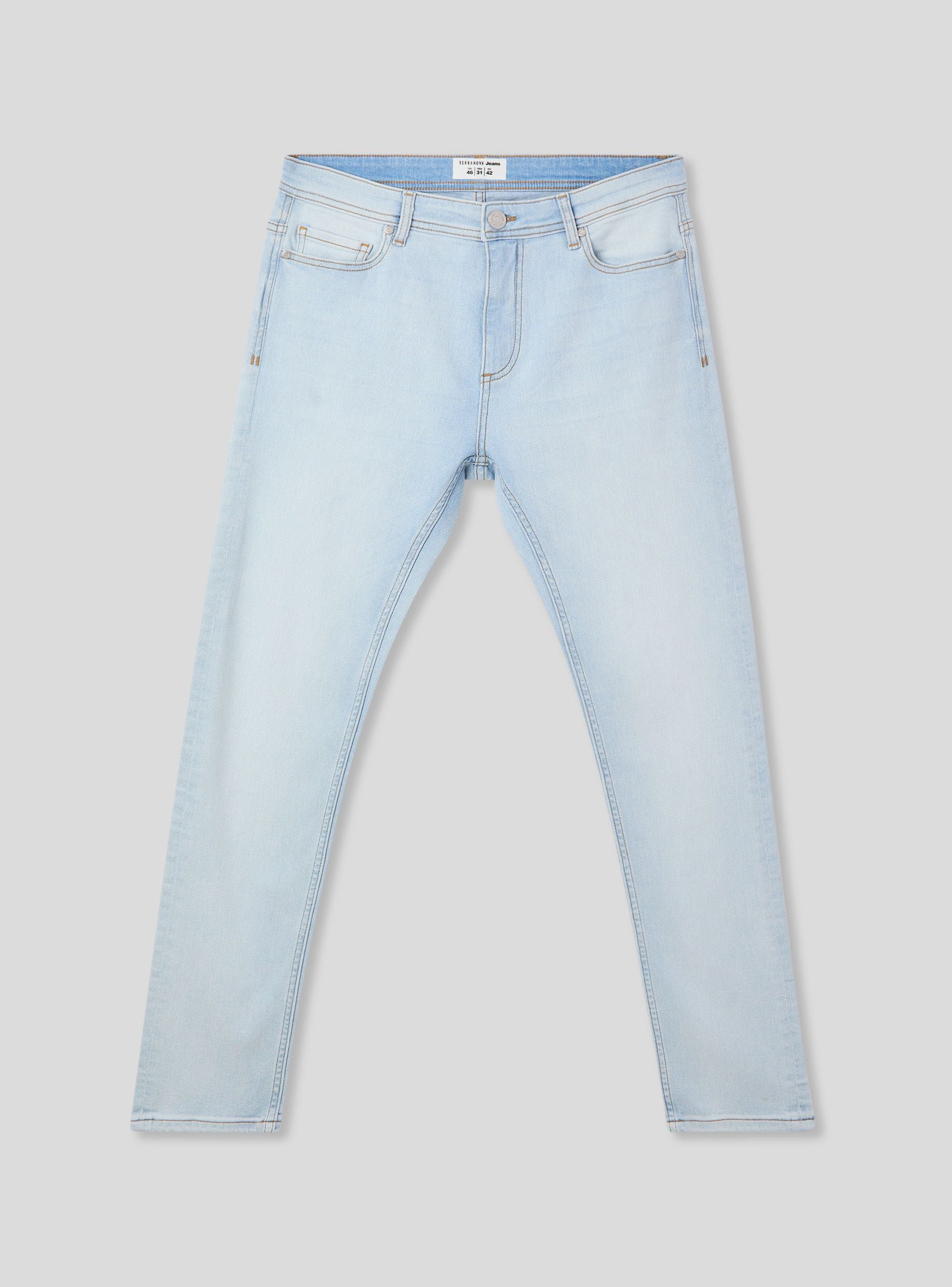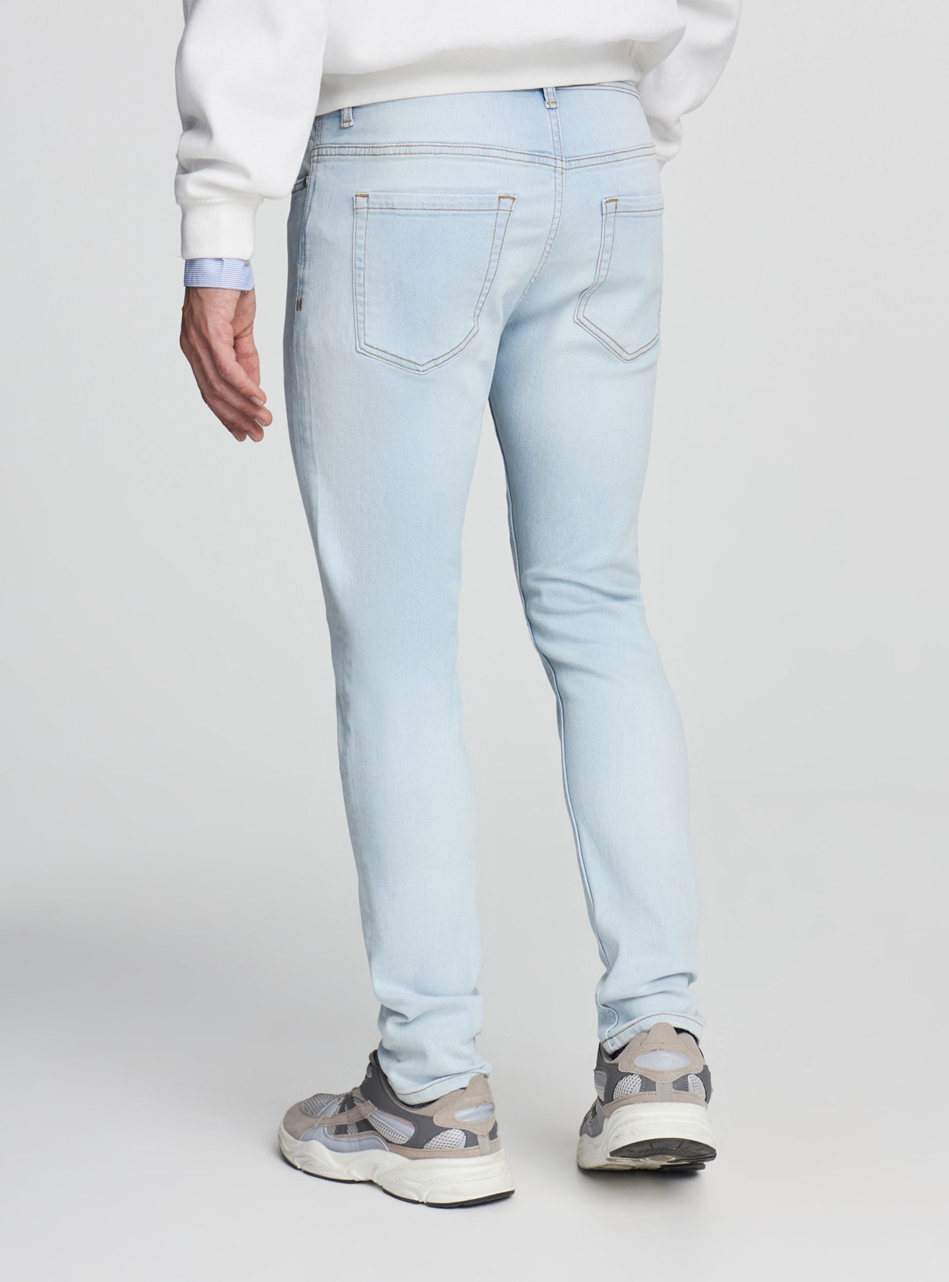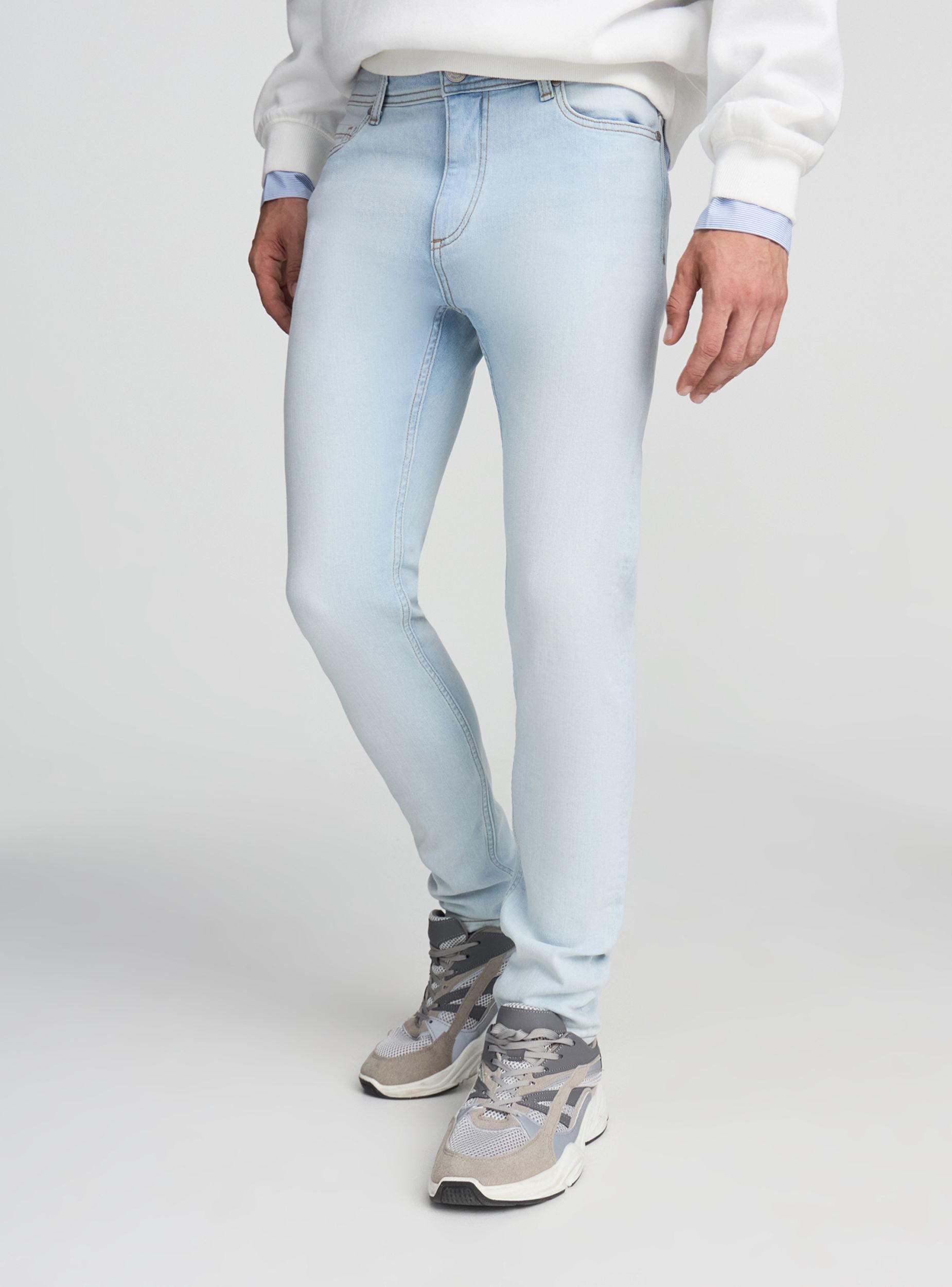 Jeans da uomo dal taglio skinny, perfetti per un look moderno e versatile. Dotati di cinque tasche, chiusura con bottone e zip e passanti in vita per l'uso con cinture, si distinguono per il lavaggio chiaro che dona freschezza e stile. Ideali per il tempo libero, si abbinano a t-shirt o camicie per outfit casual e contemporanei.