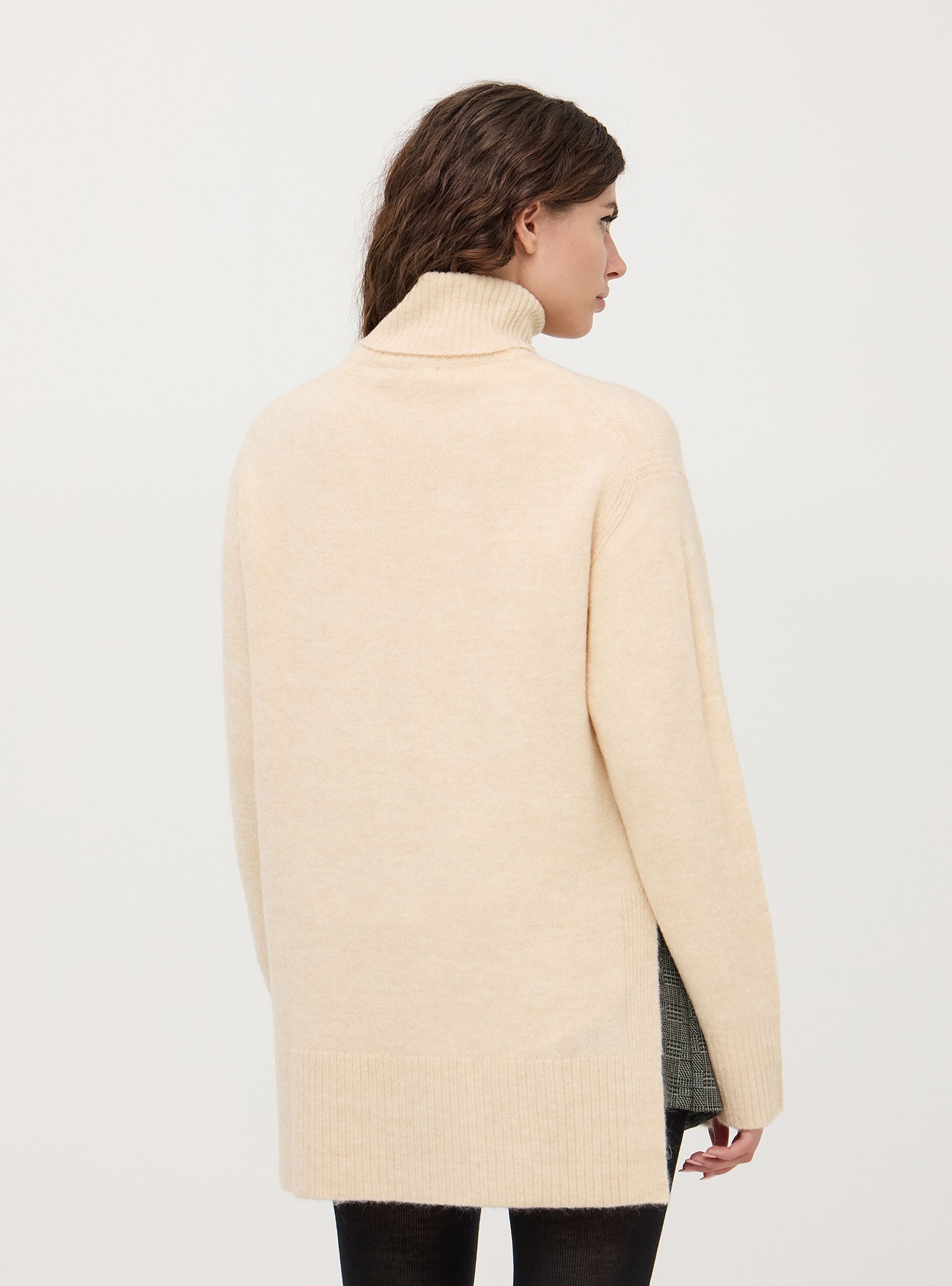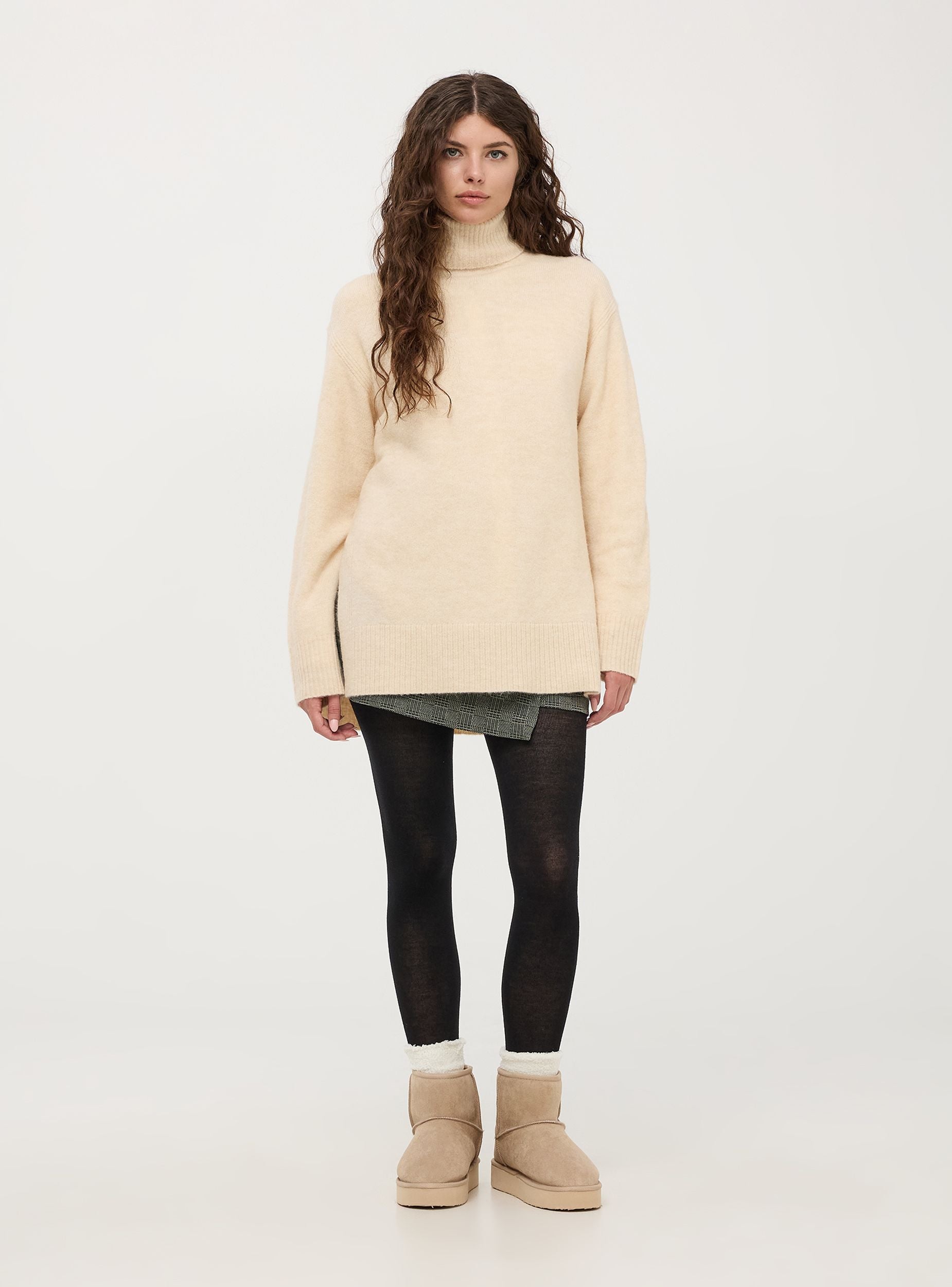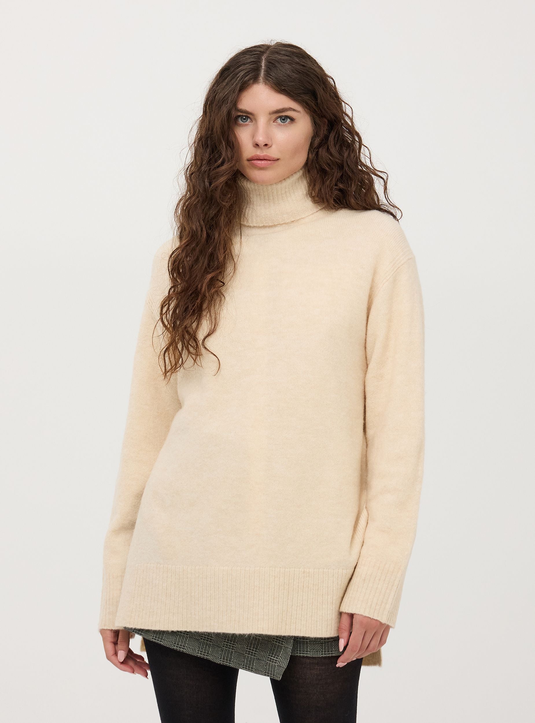 Maglia da donna con collo alto, modello dolcevita, con spacchi laterali. Tessuto a tinta unita. Vestibilità maxi.Podrobnosti