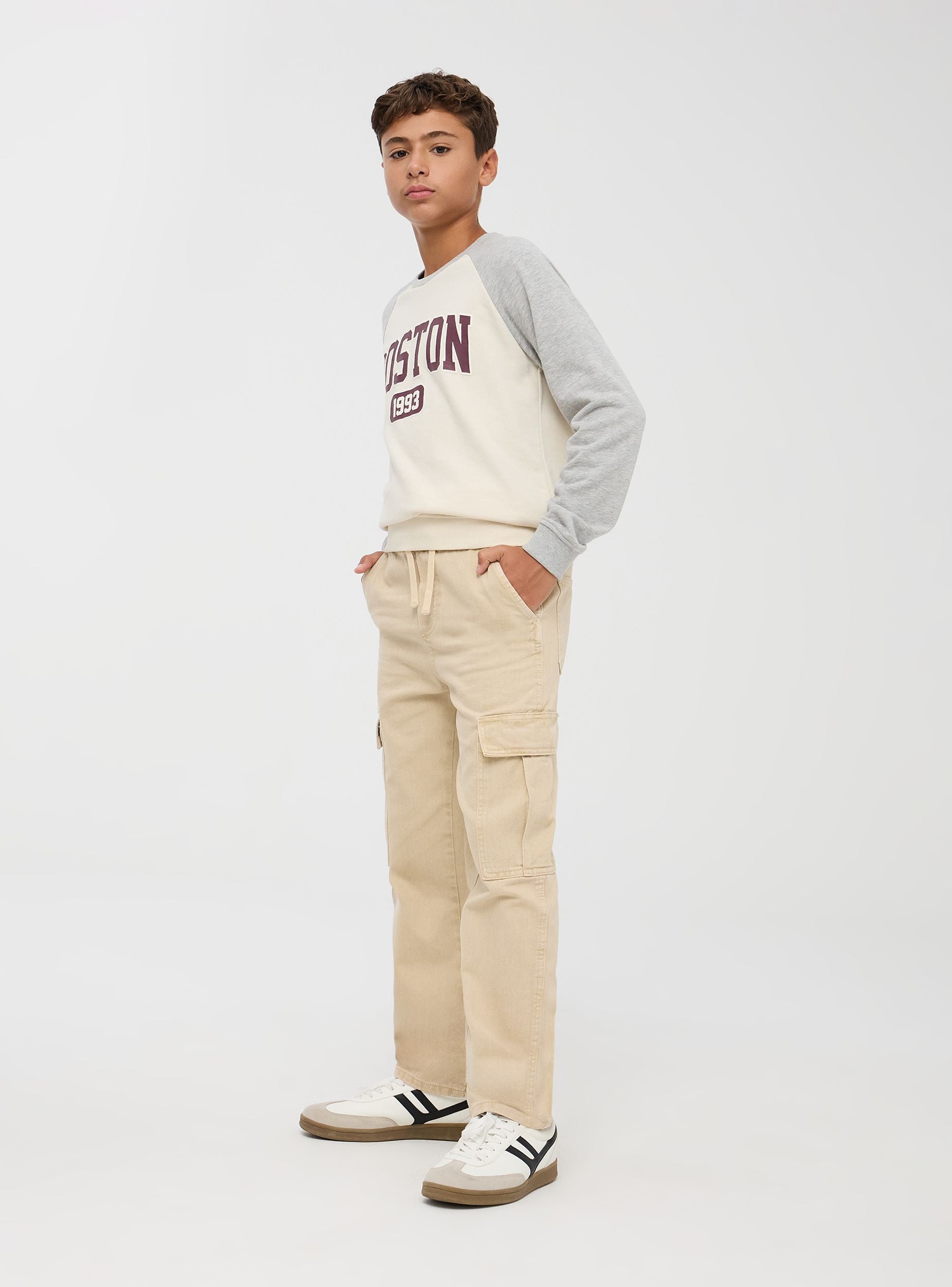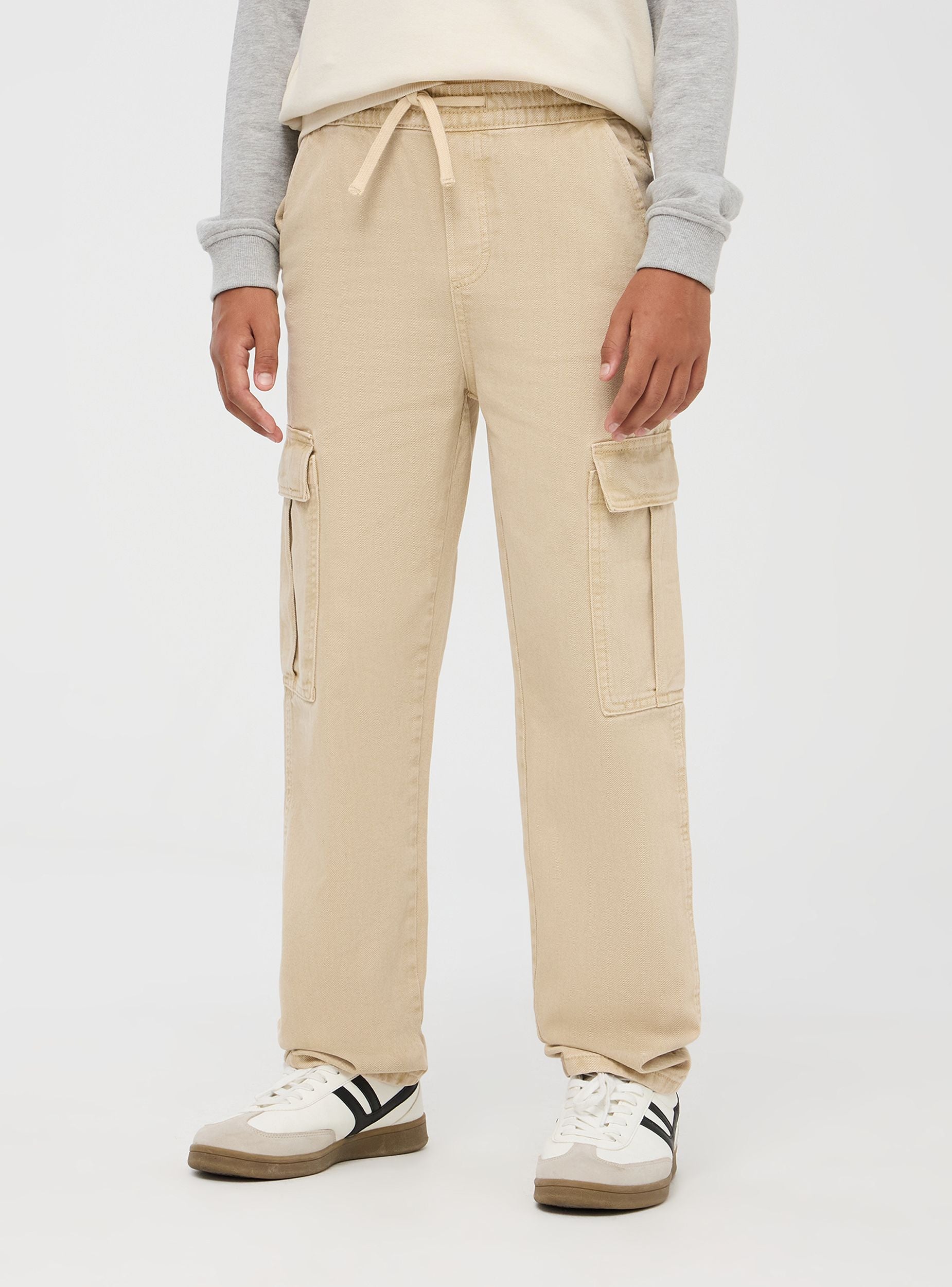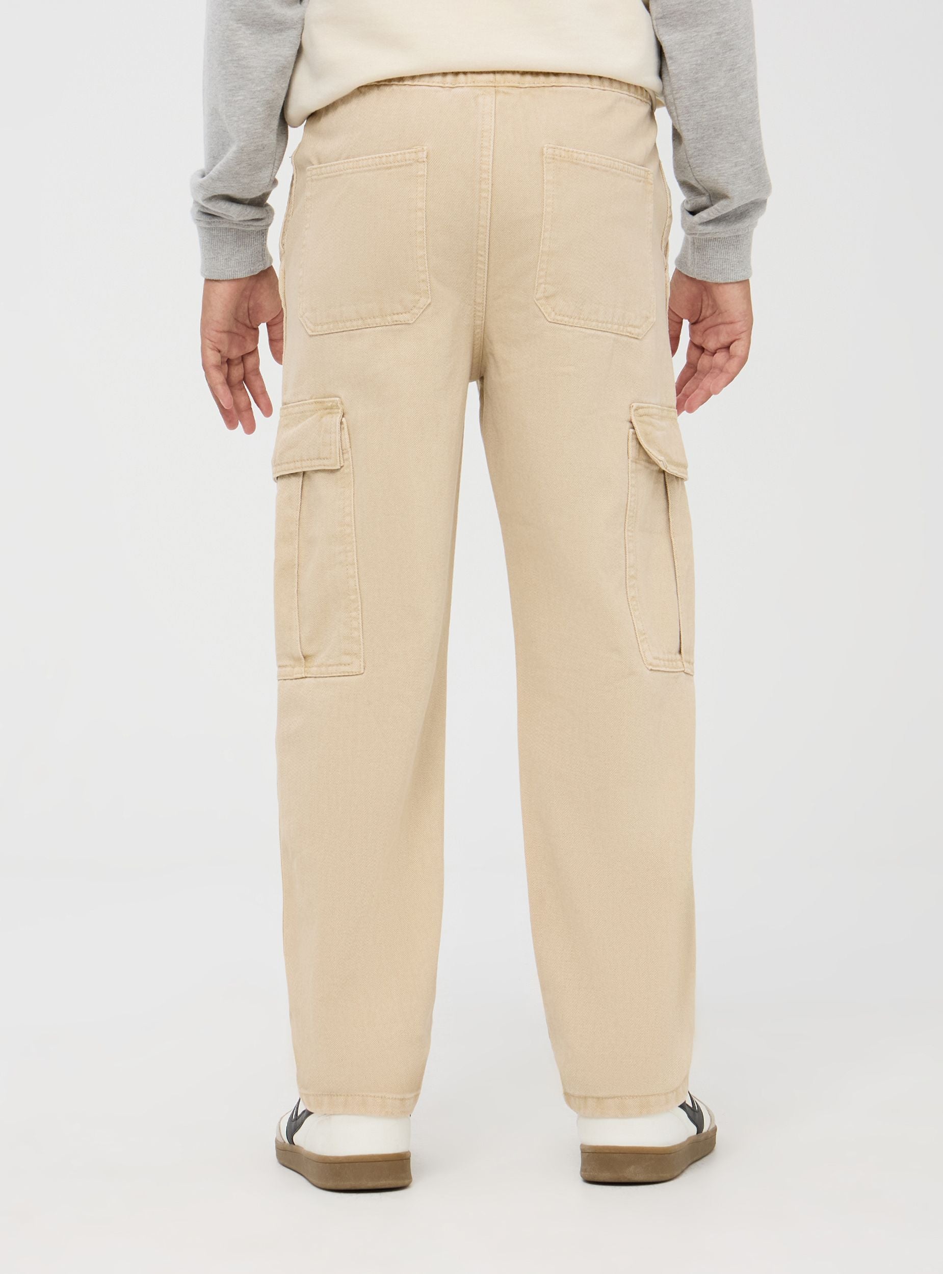 Pantaloni cargo da bambino realizzati in cotone a tinta unita, perfetti per un look casual e pratico. Dotati di due tasche frontali, due tasche posteriori e due ampie tasche laterali con patta, sono ideali per un uso quotidiano. La vita elasticizzata con coulisse garantisce una vestibilità comoda e personalizzata. Vestibilità ampia.Podrobnosti
