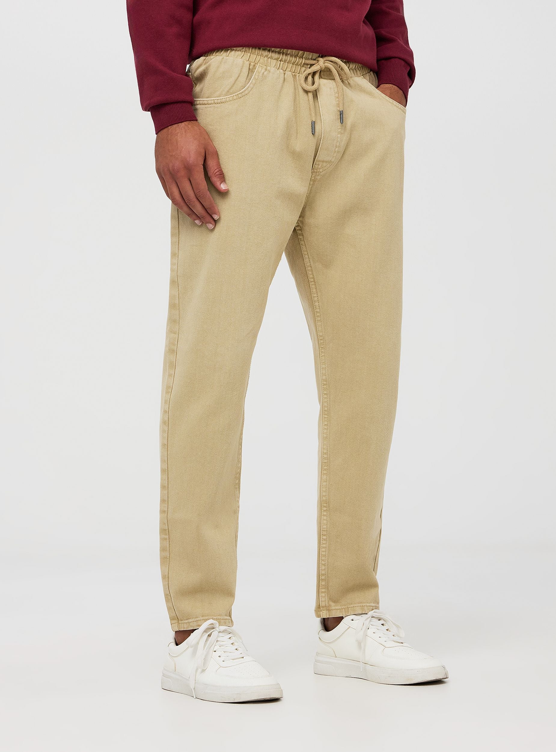 Pantaloni da uomo realizzati in drill di cotone a tinta unita. Il design presenta una vita elasticizzata con coulisse per una regolazione perfetta e un look casual e rilassato. Dotati di due tasche anteriori e due posteriori applicate. Questi pantaloni si adattano perfettamente a diverse occasioni informali. Possono essere abbinati a una t-shirt e a delle sneakers per un look casual e alla moda, oppure a un maglione per un outfit più adatto alle giornate fredde. La loro versatilità li rende un'aggiunta indispensabile al guardaroba maschile.