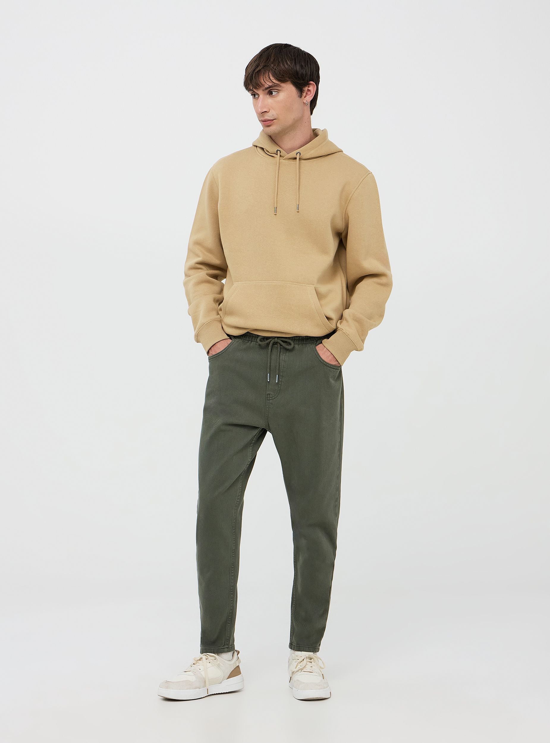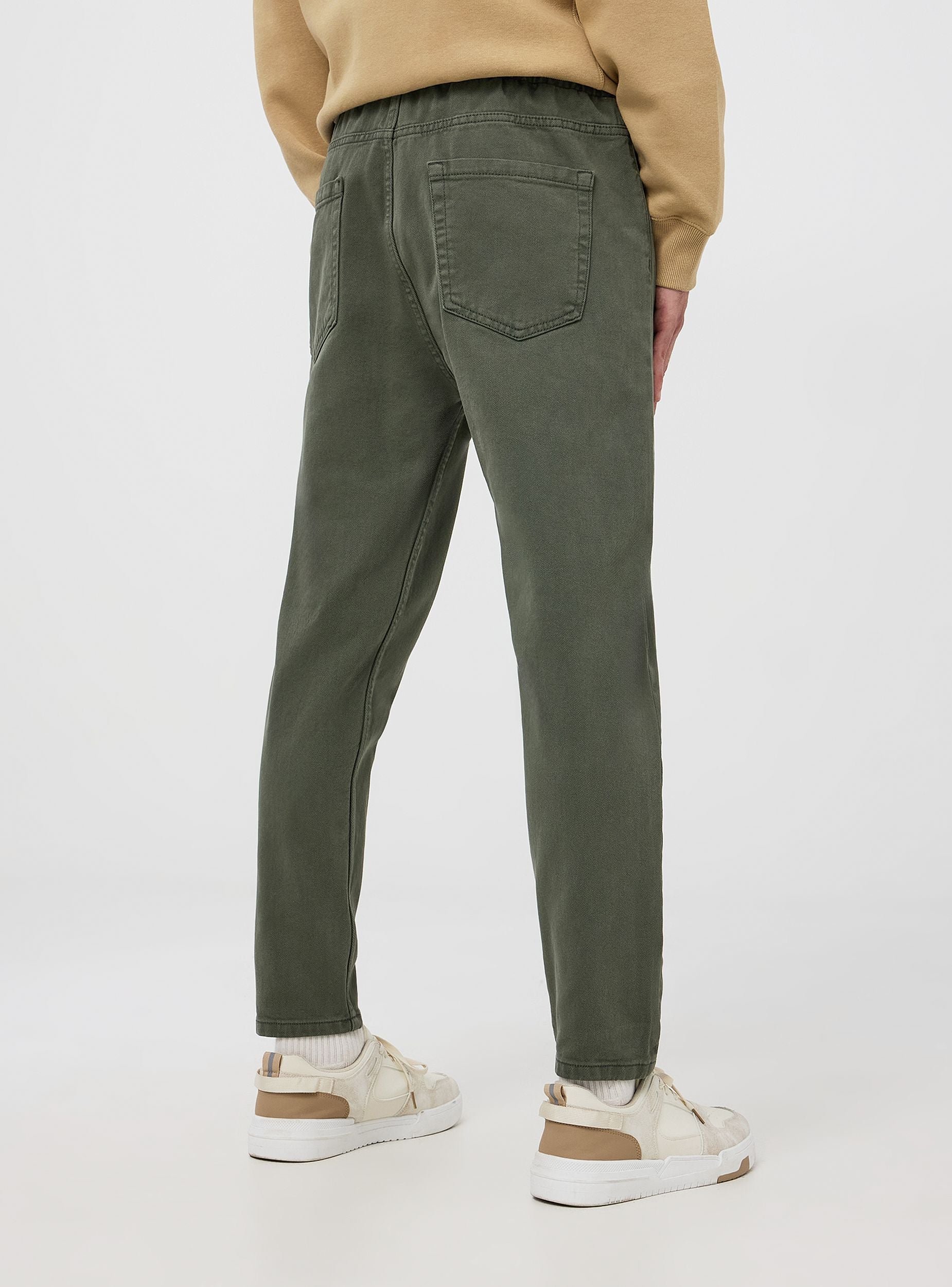 Pantaloni da uomo realizzati in drill di cotone a tinta unita. Il design presenta una vita elasticizzata con coulisse per una regolazione perfetta e un look casual e rilassato. Dotati di due tasche anteriori e due posteriori applicate. Questi pantaloni si adattano perfettamente a diverse occasioni informali. Possono essere abbinati a una t-shirt e a delle sneakers per un look casual e alla moda, oppure a un maglione per un outfit più adatto alle giornate fredde. La loro versatilità li rende un'aggiunta indispensabile al guardaroba maschile.Podrobnosti