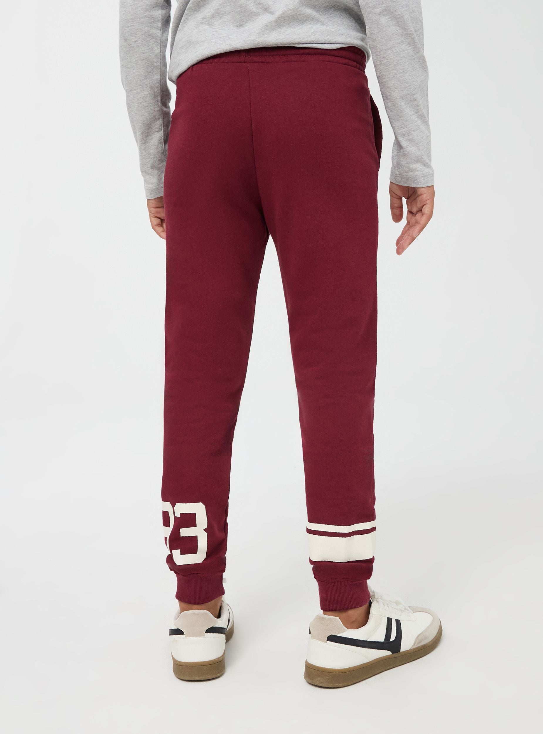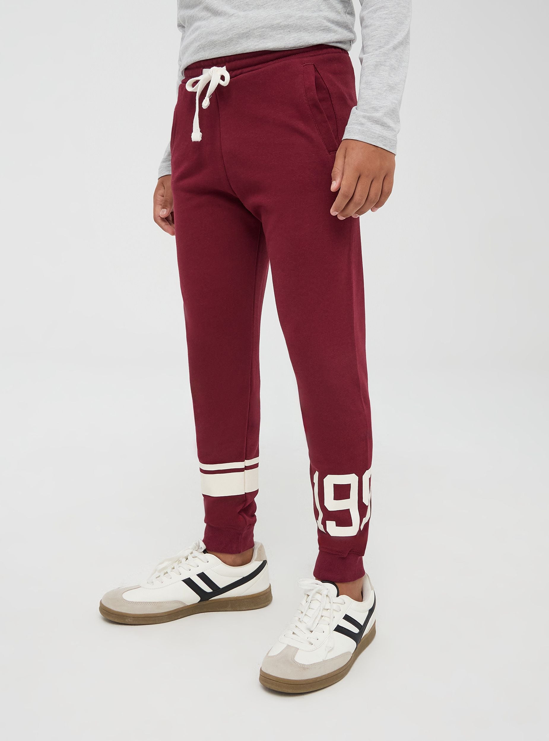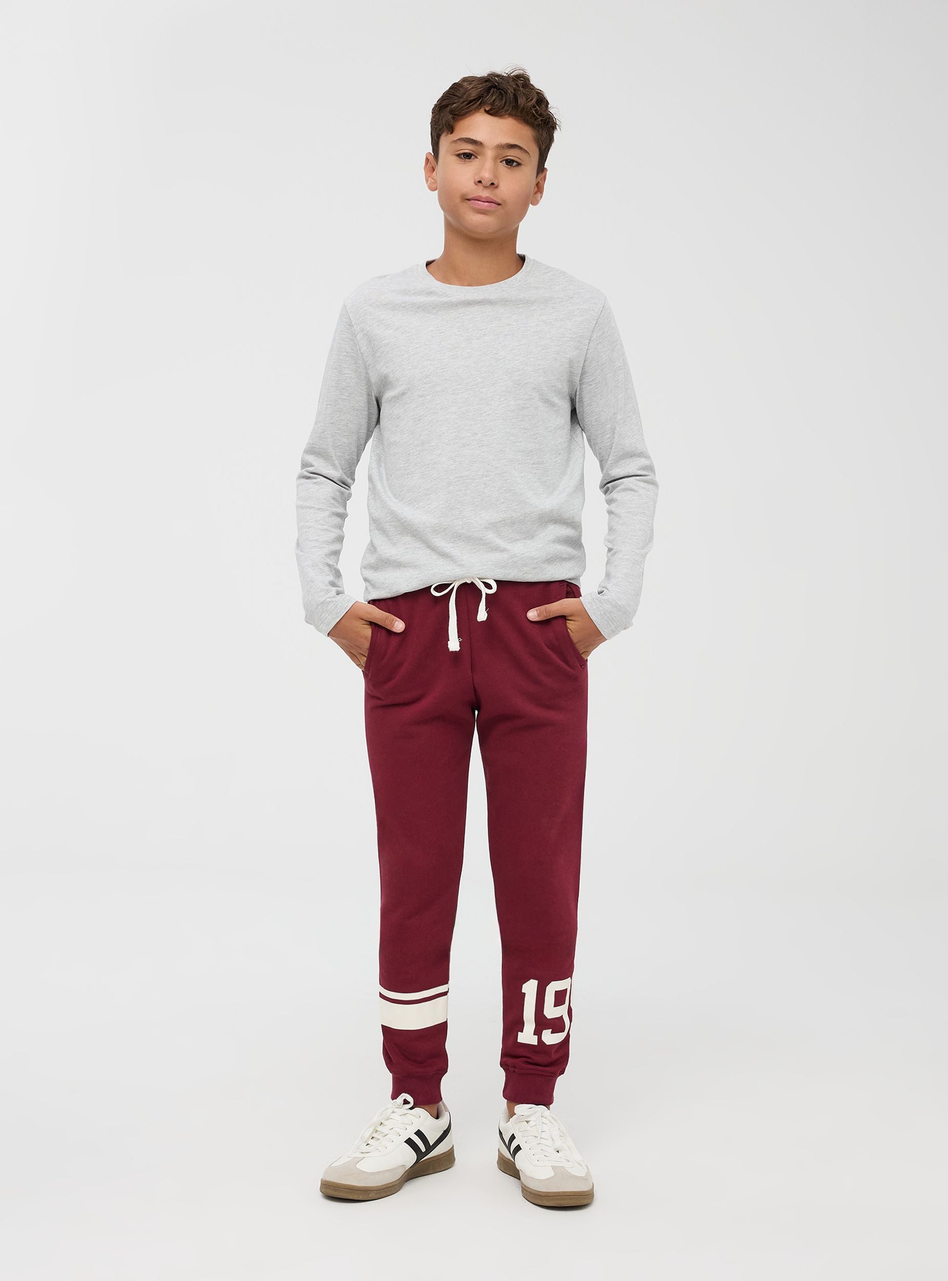 Pantaloni della tuta da bambino in tessuto leggero, perfetti per un look casual e confortevole. Questi pantaloni presentano una stampa numerica su una gamba e bande sull'altra. La vestibilità rilassata si combina con dettagli funzionali, come le tasche laterali, l'elastico in vita con coulisse e le caviglie a coste. Ideali per il tempo libero e attività sportive leggere.
