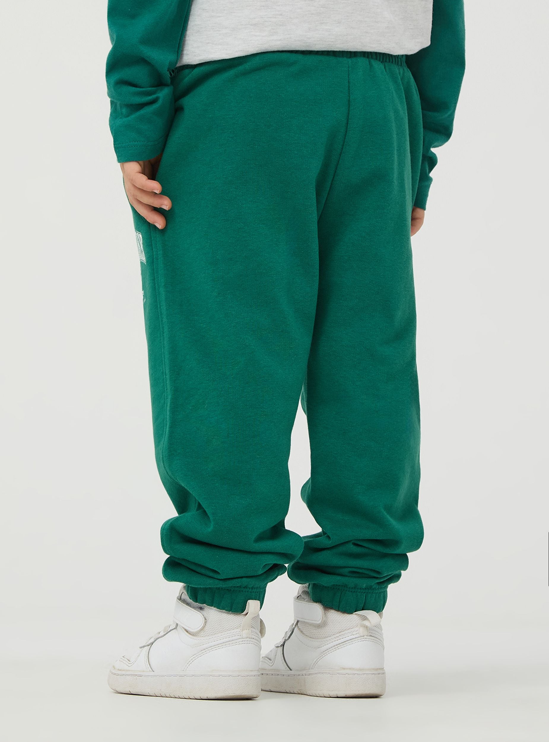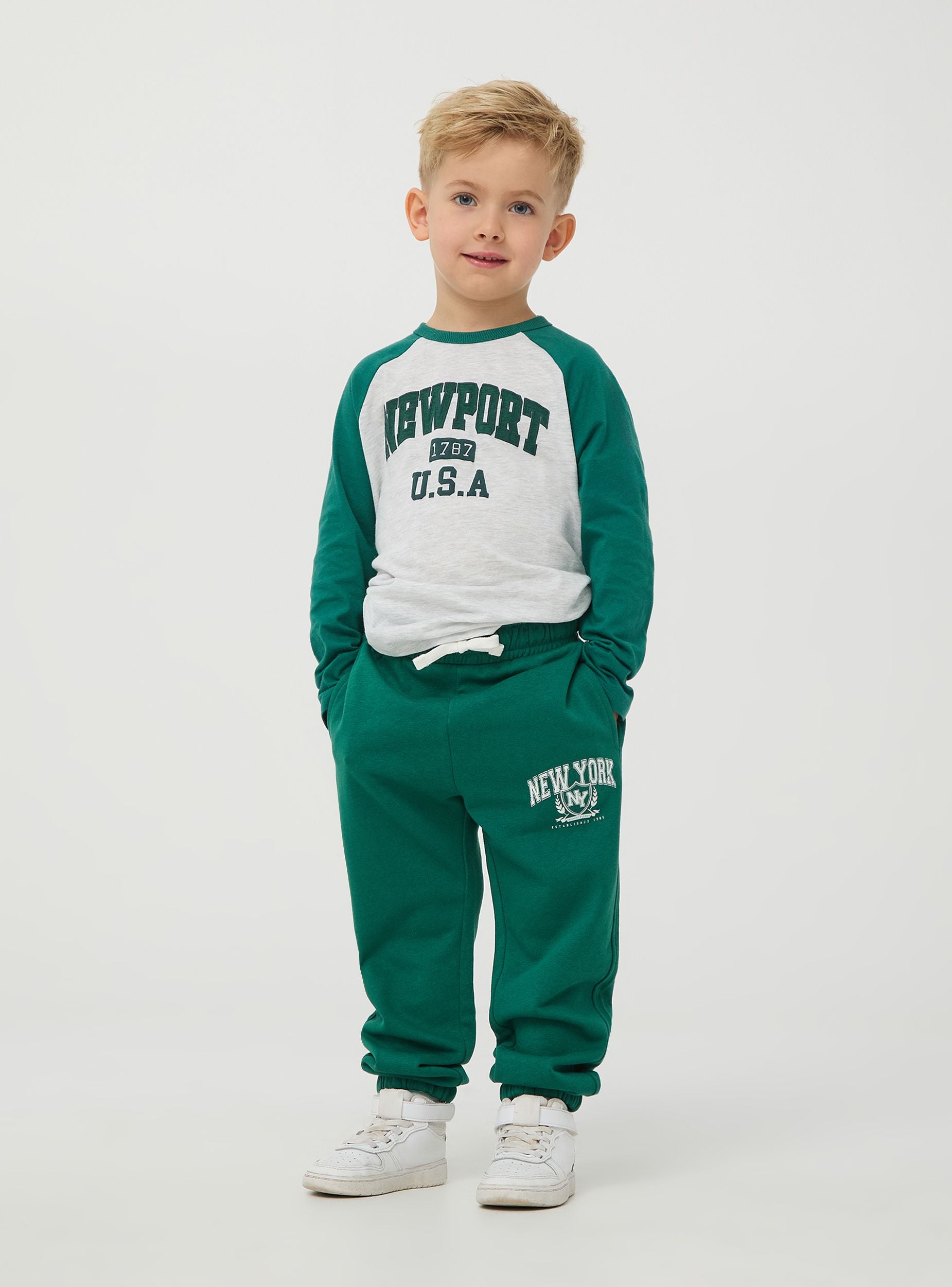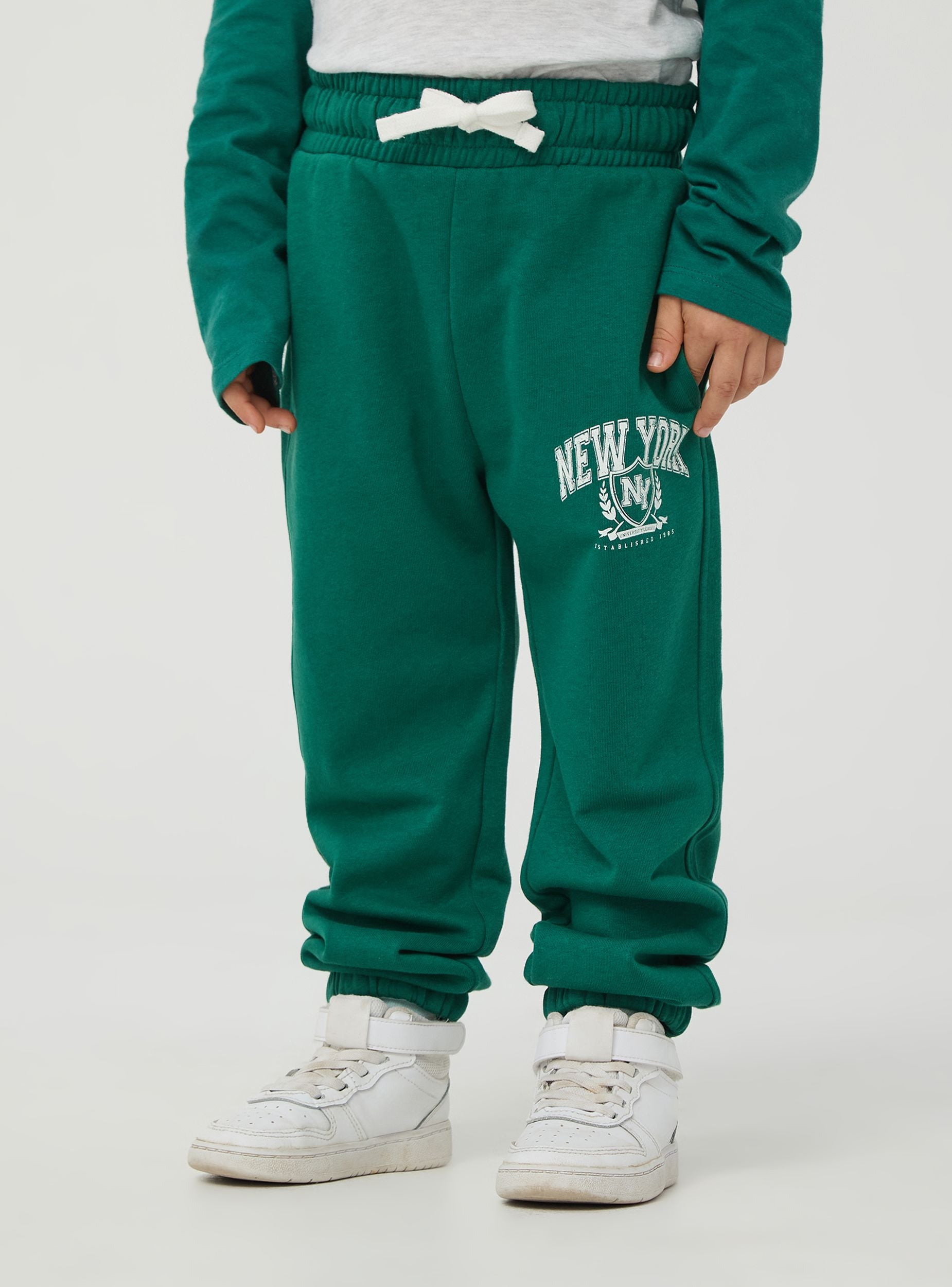 Pantaloni della tuta da bimbo realizzati in tessuto leggero a tinta unita con stampa, a contrasto, ispirata allo sport dei campus americani. Modello con pratiche tasche laterali, coulisse in vita a contrasto che consente una regolazione perfetta, ed elastico in vita e nei polsini per un comfort e una vestibilità ottimale. Ideali per il tempo libero e le attività quotidiane, questi pantaloni sono perfetti per i bimbi attivi che cercano comodità e stile.
